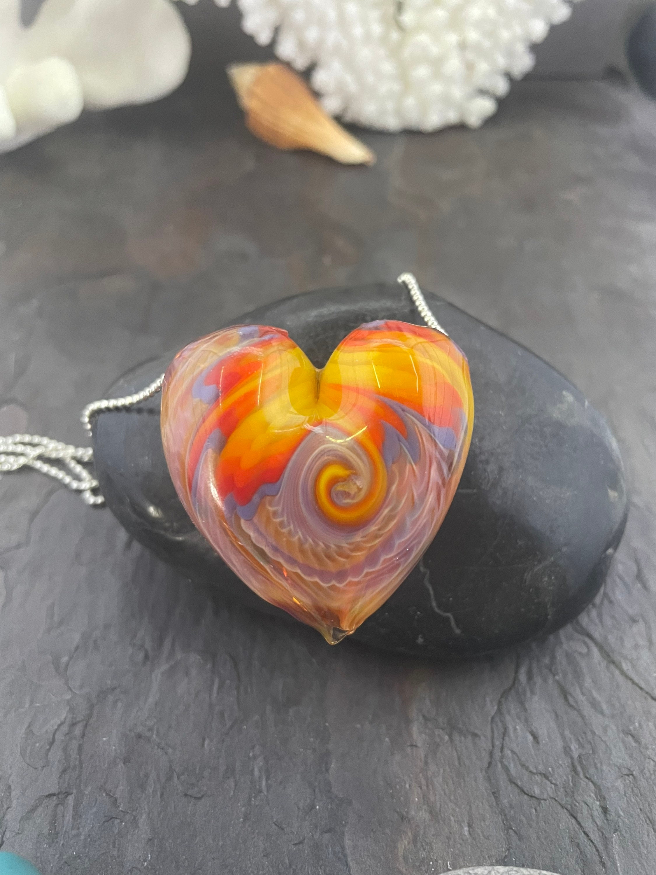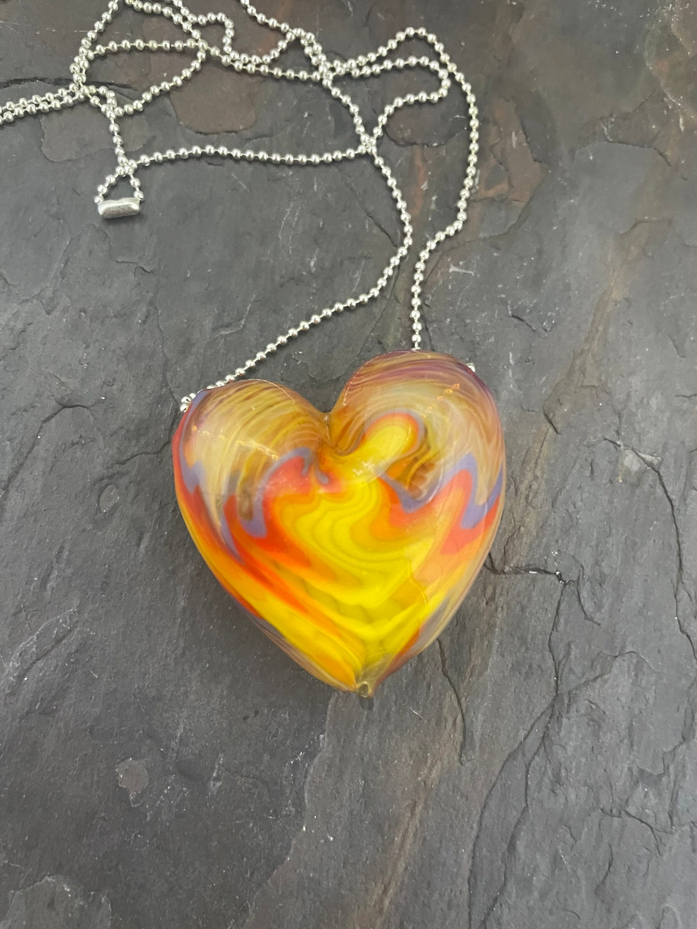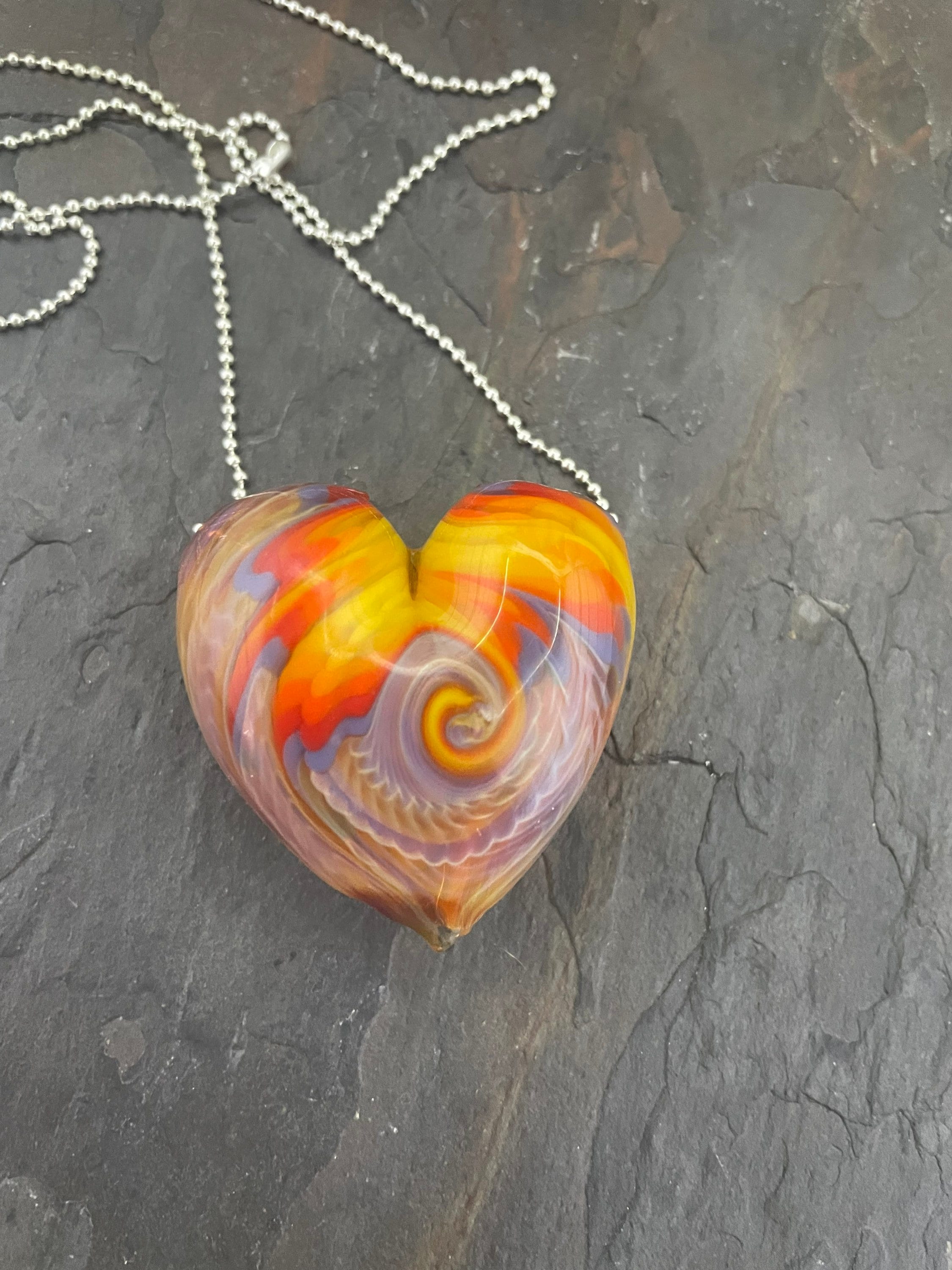 All the colors of the sunset in a hollow hand blown boro heart pendant, approximately 1.5” long on an 18” silver filled mini ball chain necklace. Arrives in a nice metal gift box for giving or keeping
