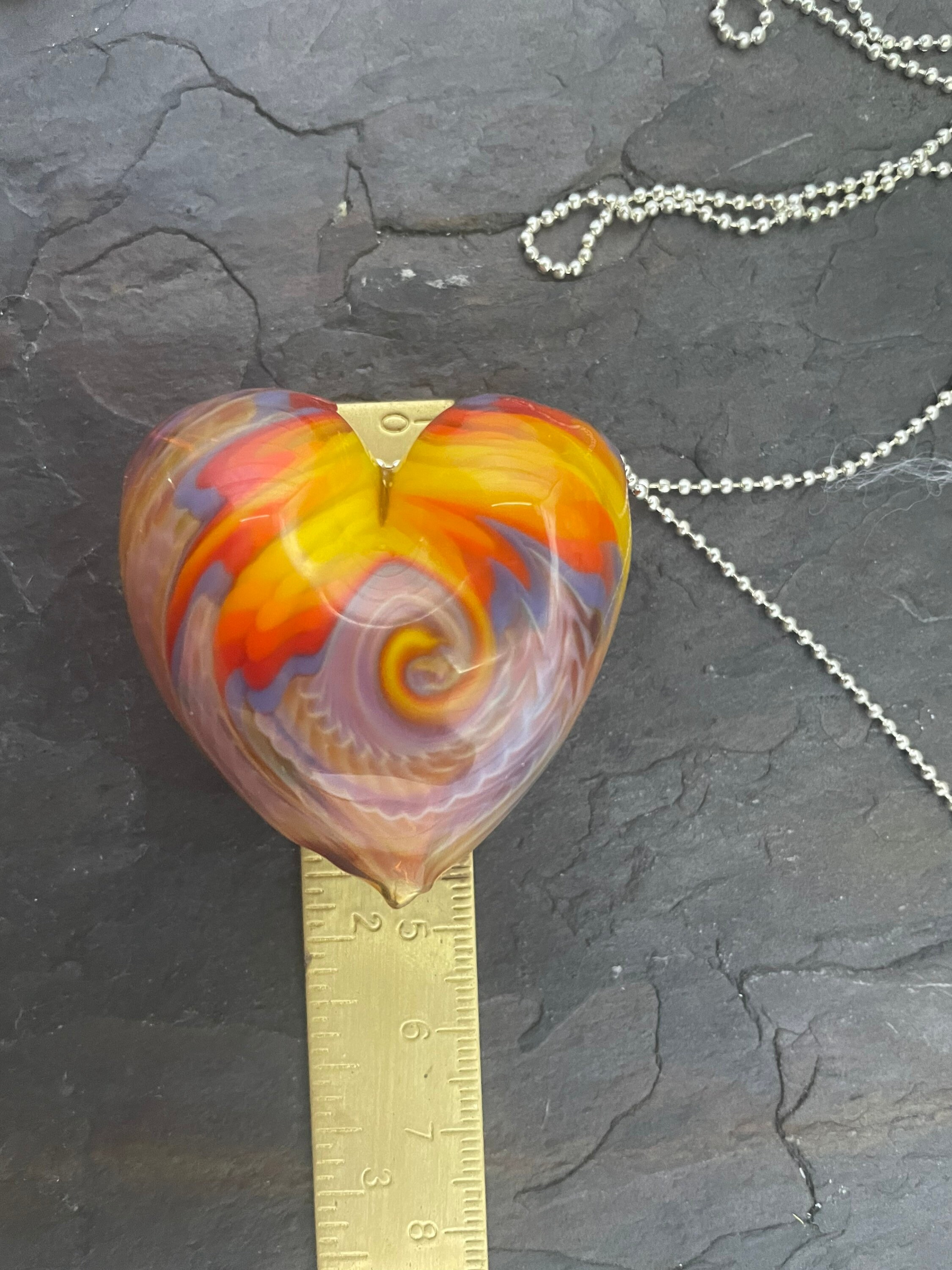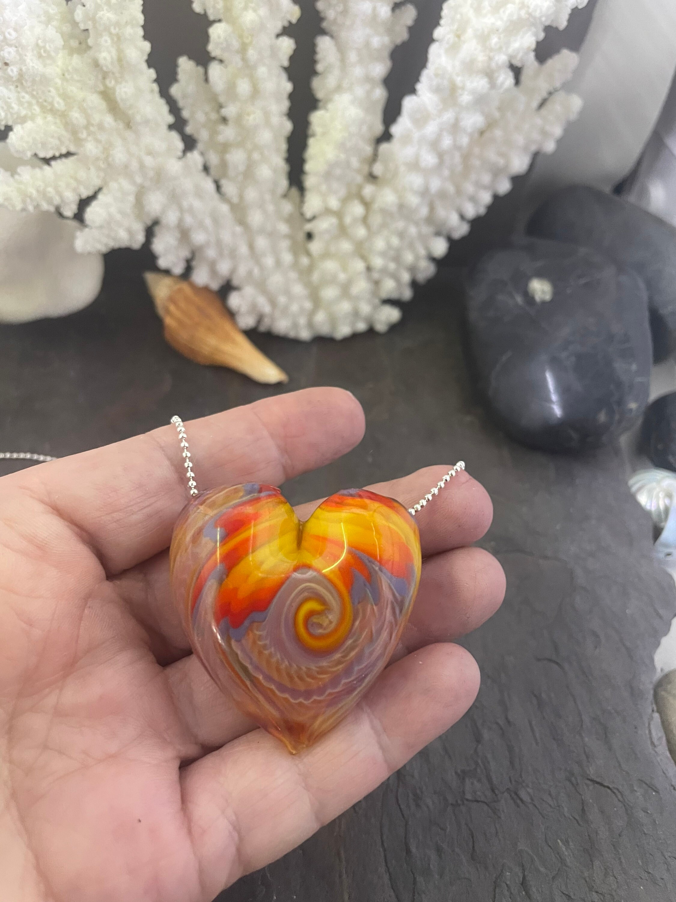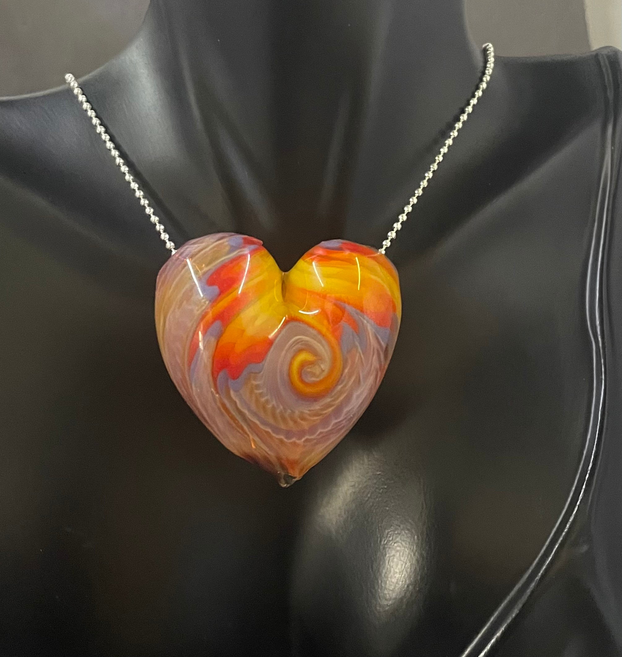 All the colors of the sunset in a hollow hand blown boro heart pendant, approximately 1.5” long on an 18” silver filled mini ball chain necklace. Arrives in a nice metal gift box for giving or keeping