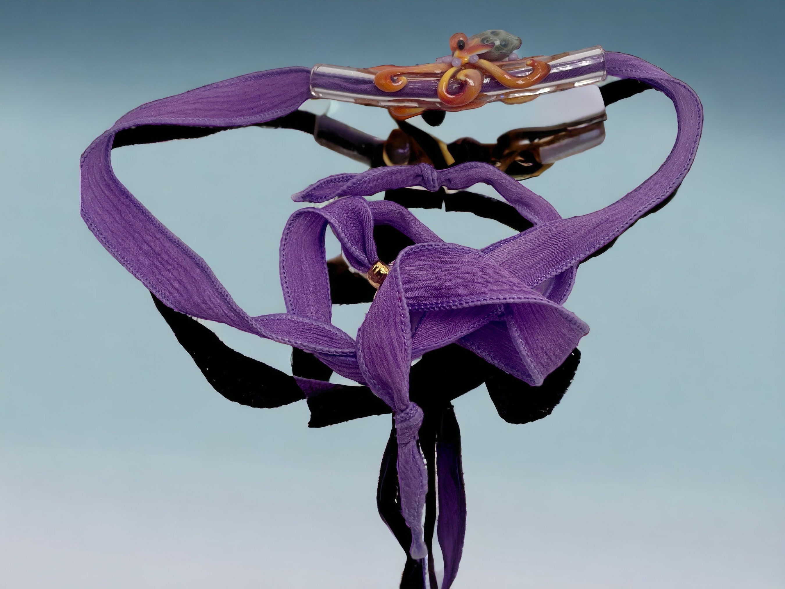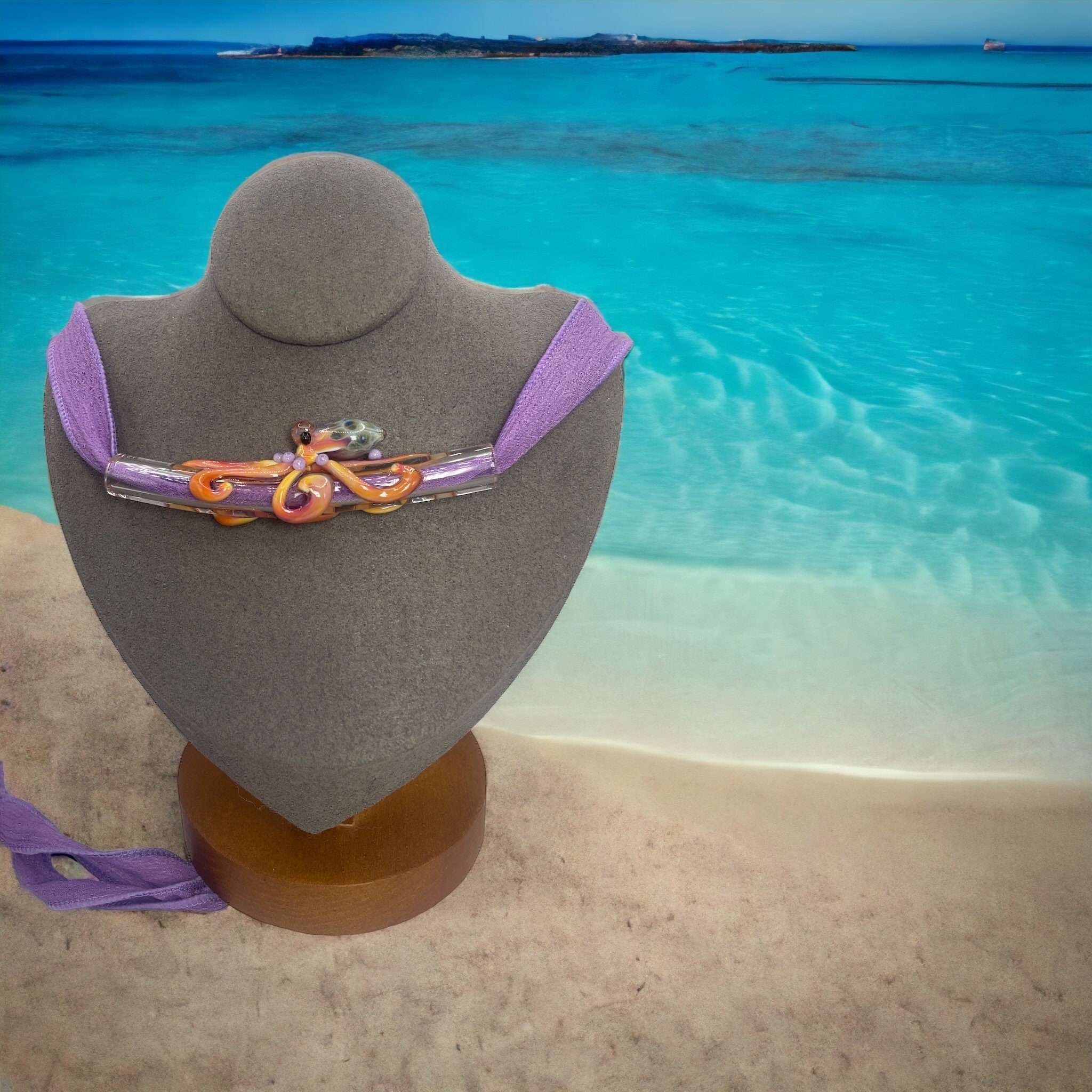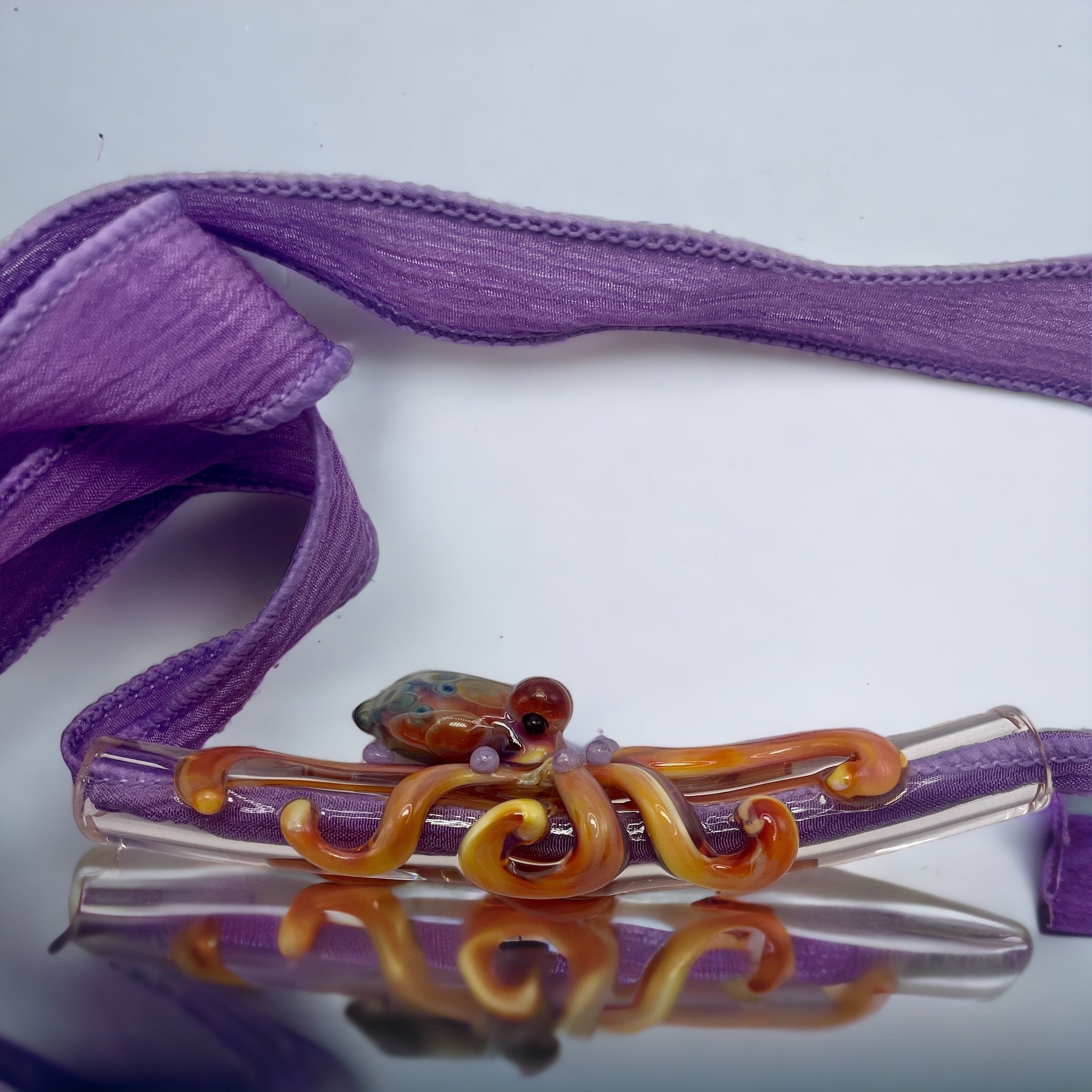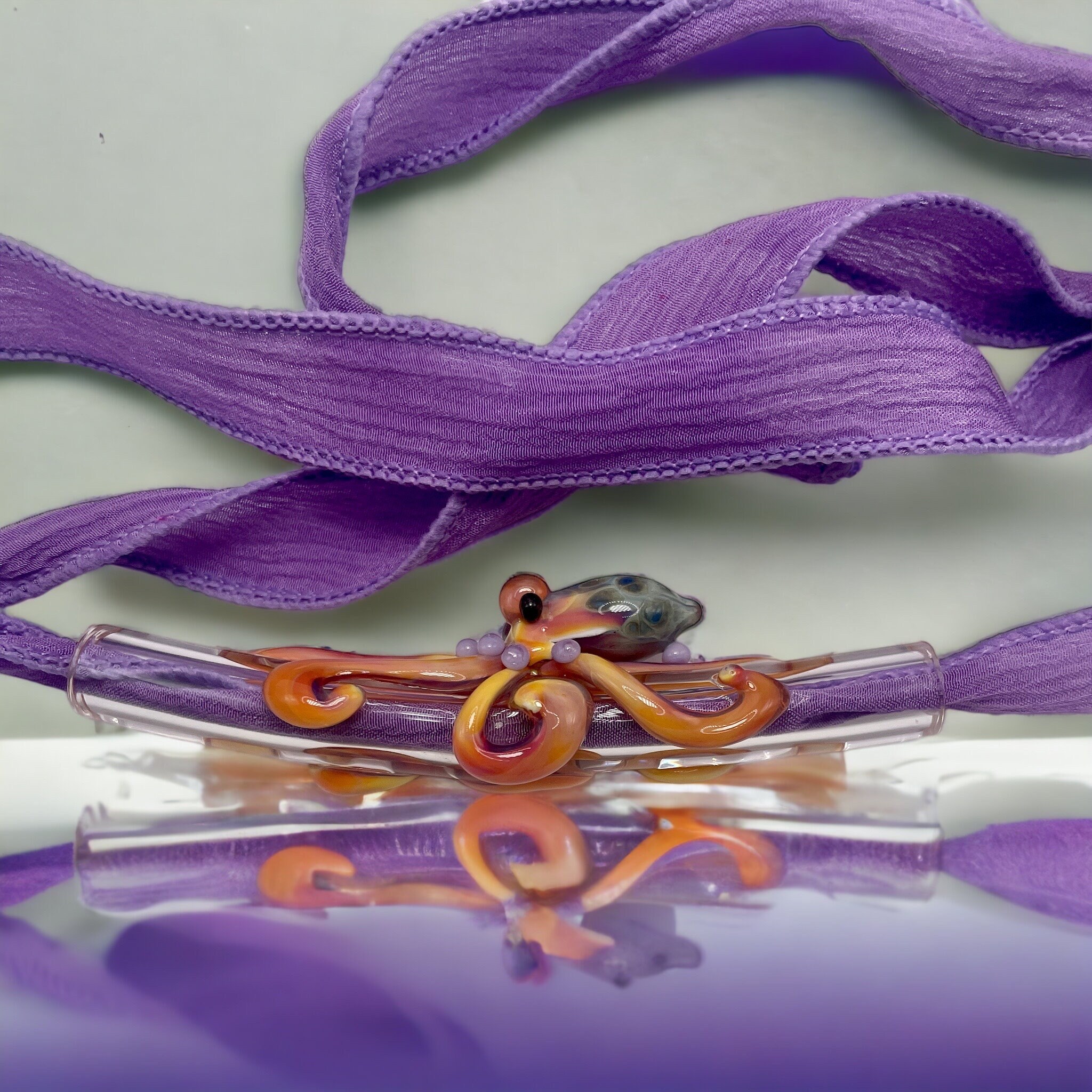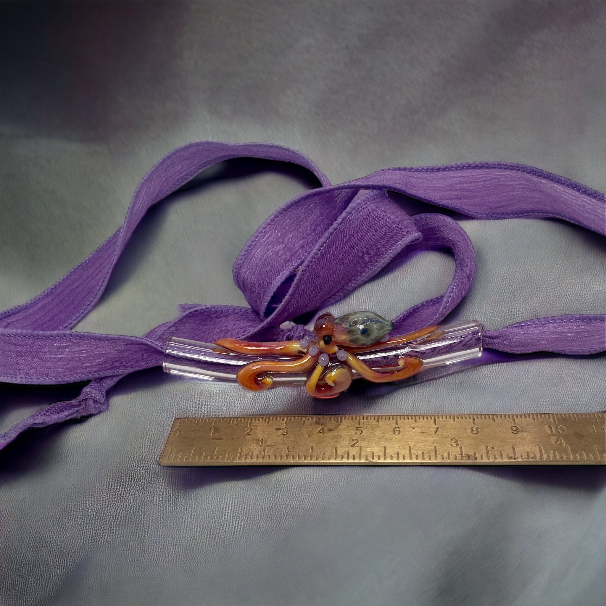 Here’s a fun new look… an Octo Tube necklace with an APurple 2” octo sitting on top to watch over everything. Approx 3.25” long tube bead on a hand dyed silk ribbon adjustable necklace
