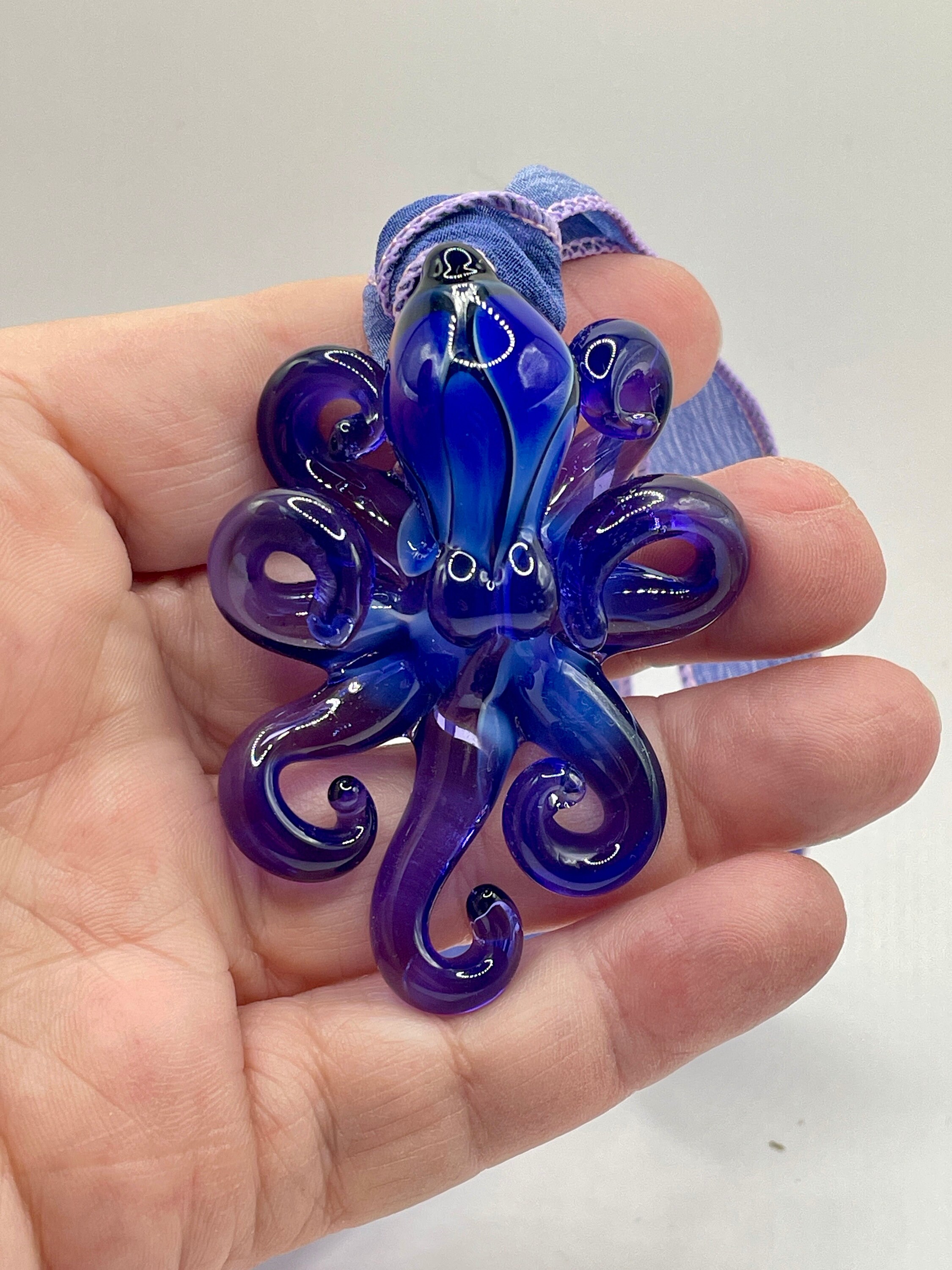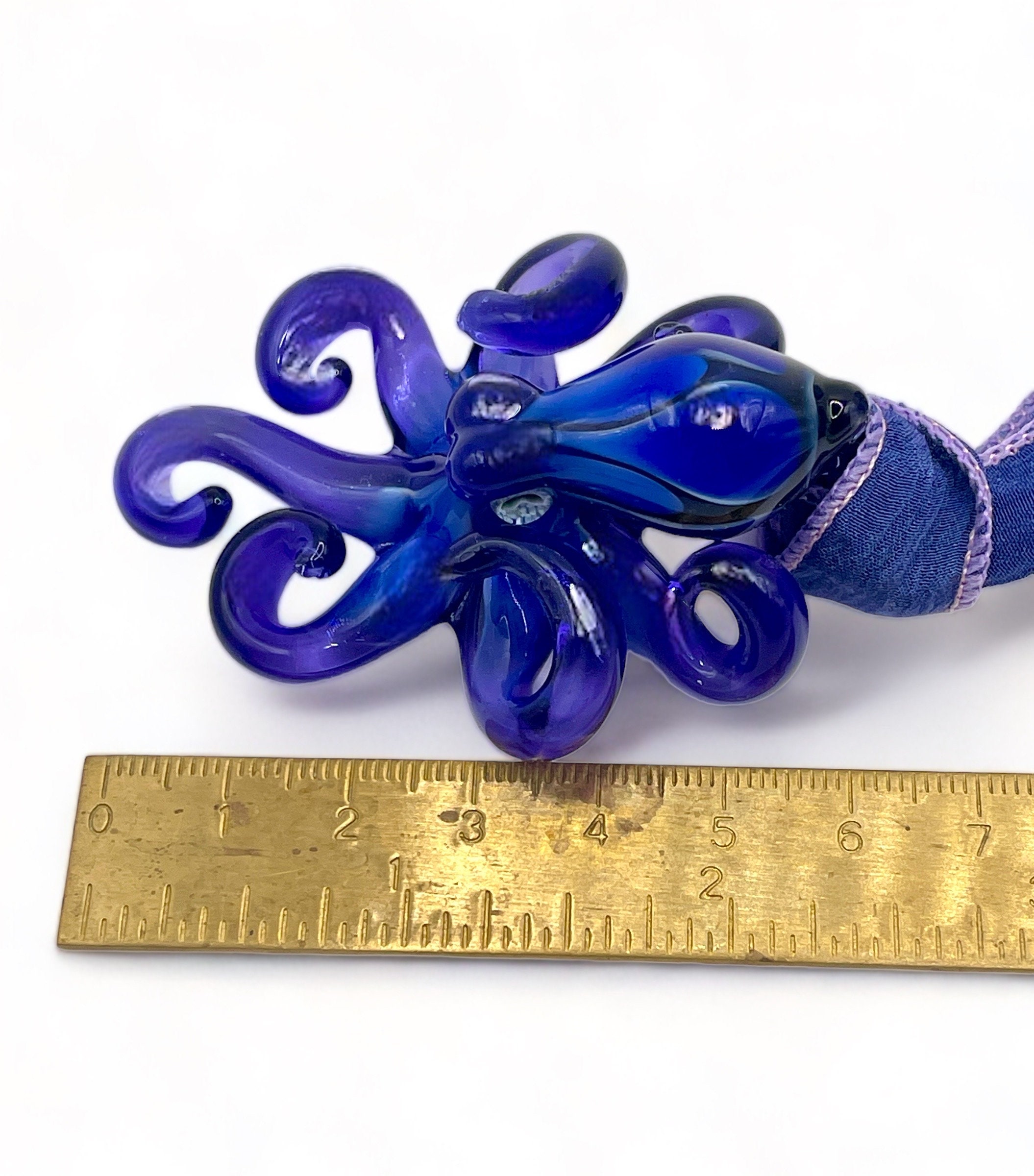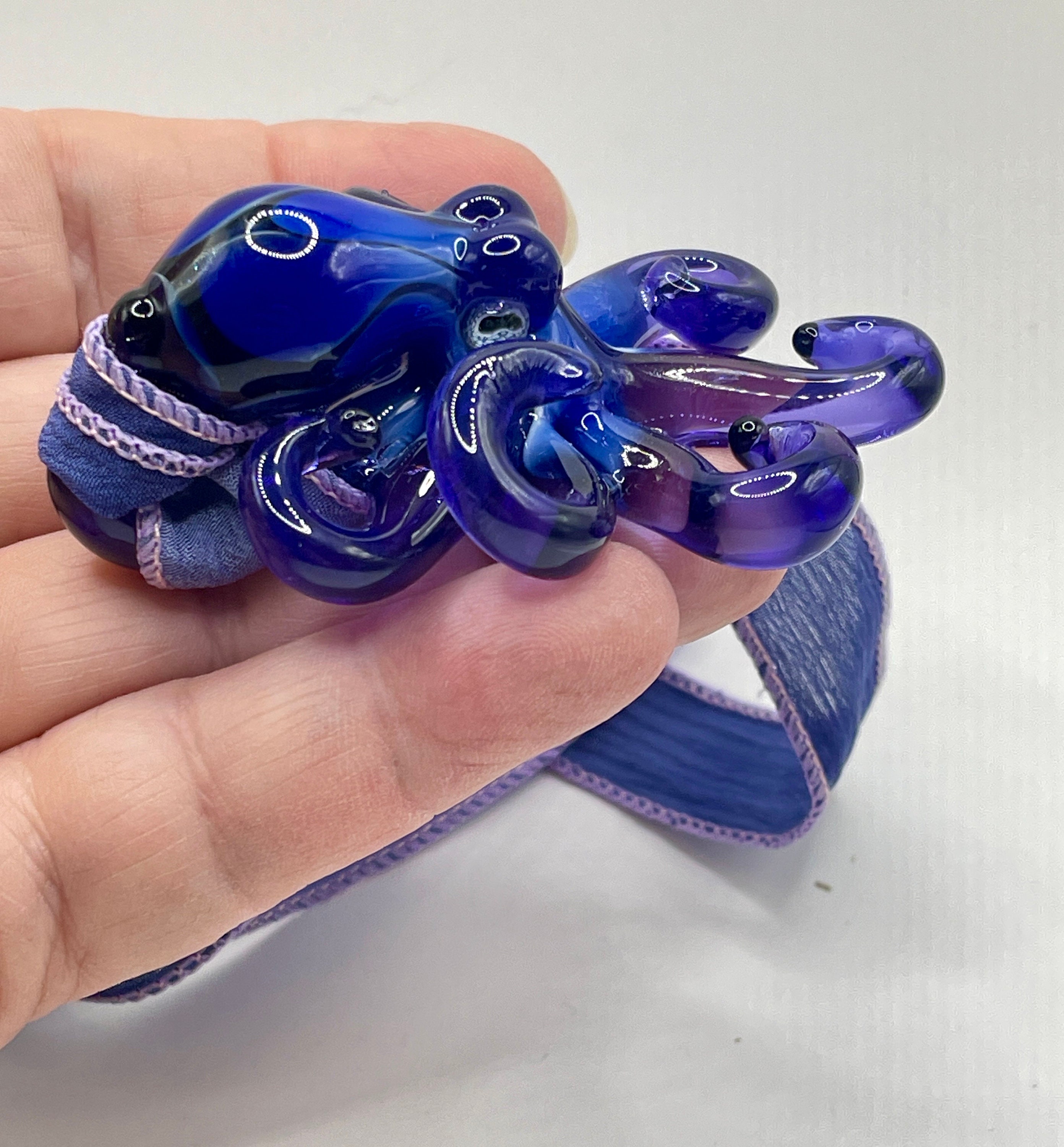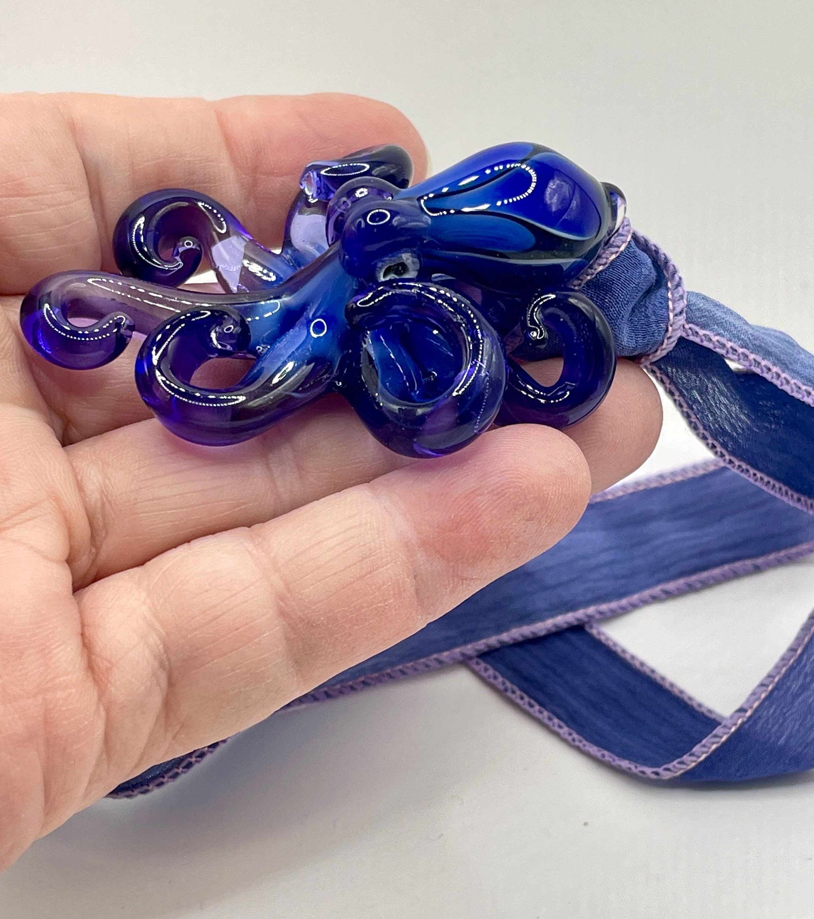 Another boro octopus glass necklace, this is the Royal Cobalt Kraken. This is a beautiful one using Molten Aura Amethyst Gold with a touch of the sparkly cobalt for hood markings. Approx 2.5" long, formed in the torch using no molds and properly annealed in a digital kiln for durability, this one arrives safely wrapped and with a removable adjustable hand dyed silk ribbon necklace threaded thru the back leg, ready to give or keep. Handmade glass eye chip gives her such realistic blue eyes, you might want to keep her on her leash, just in case! Really fun and safe to wear, for a truly dramatic look!