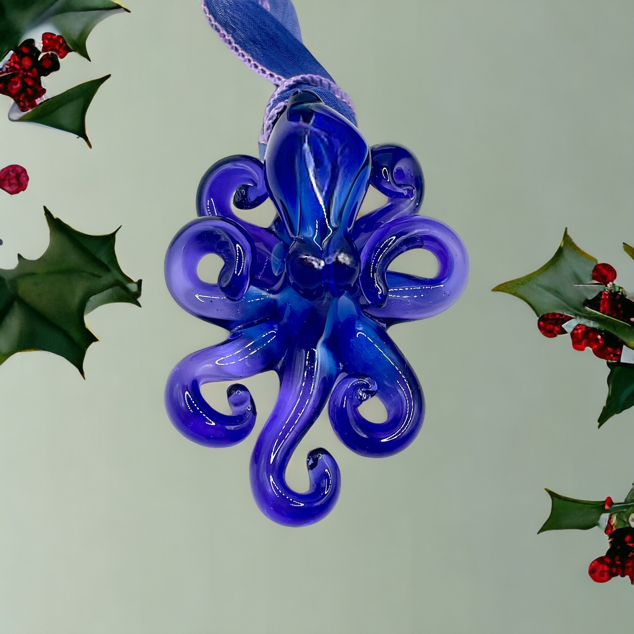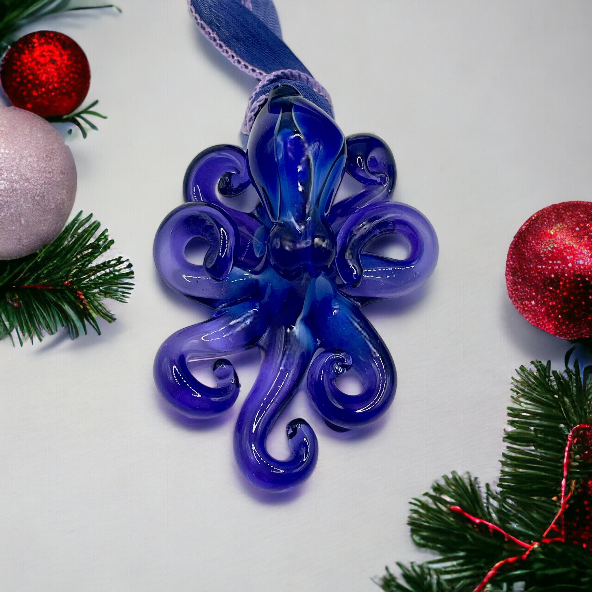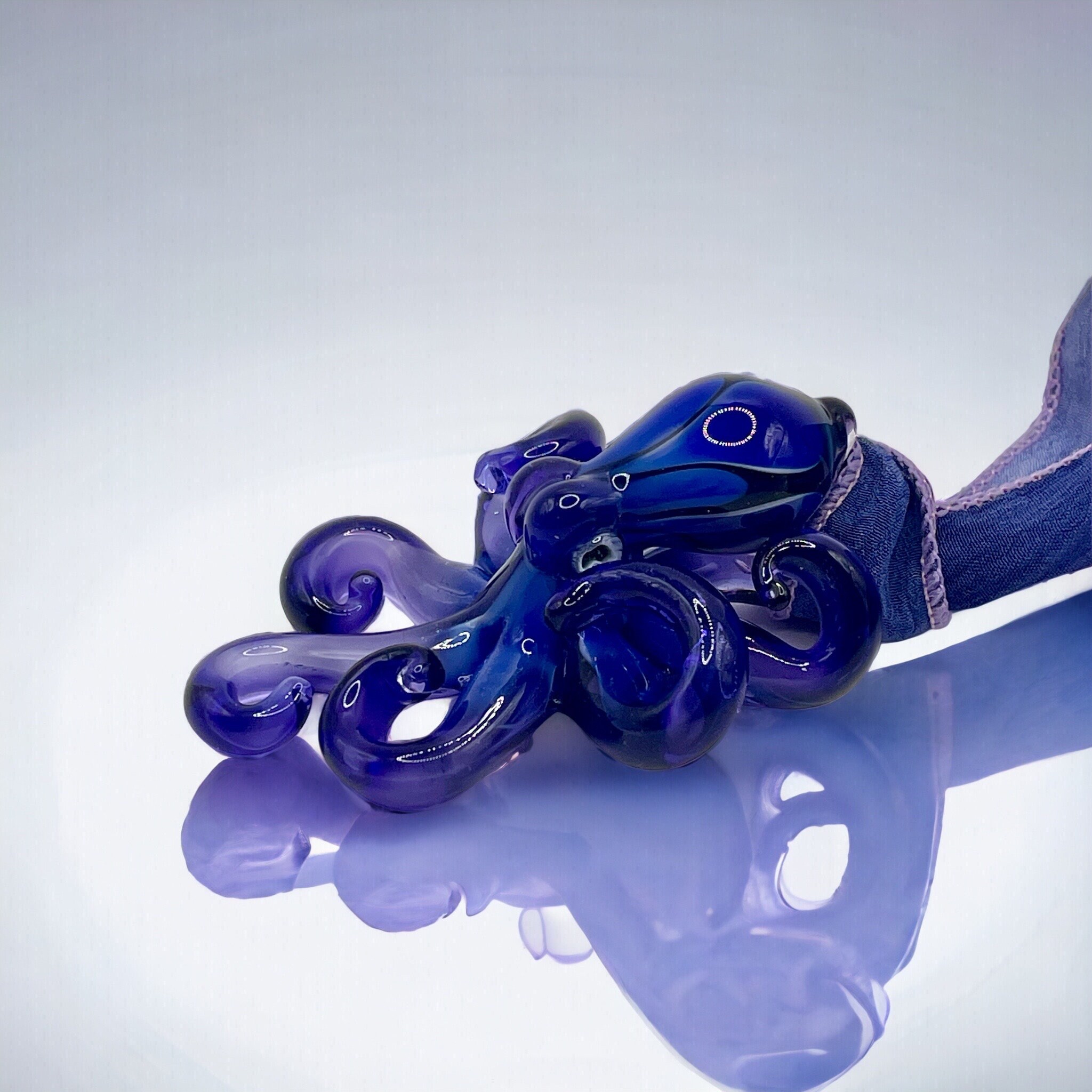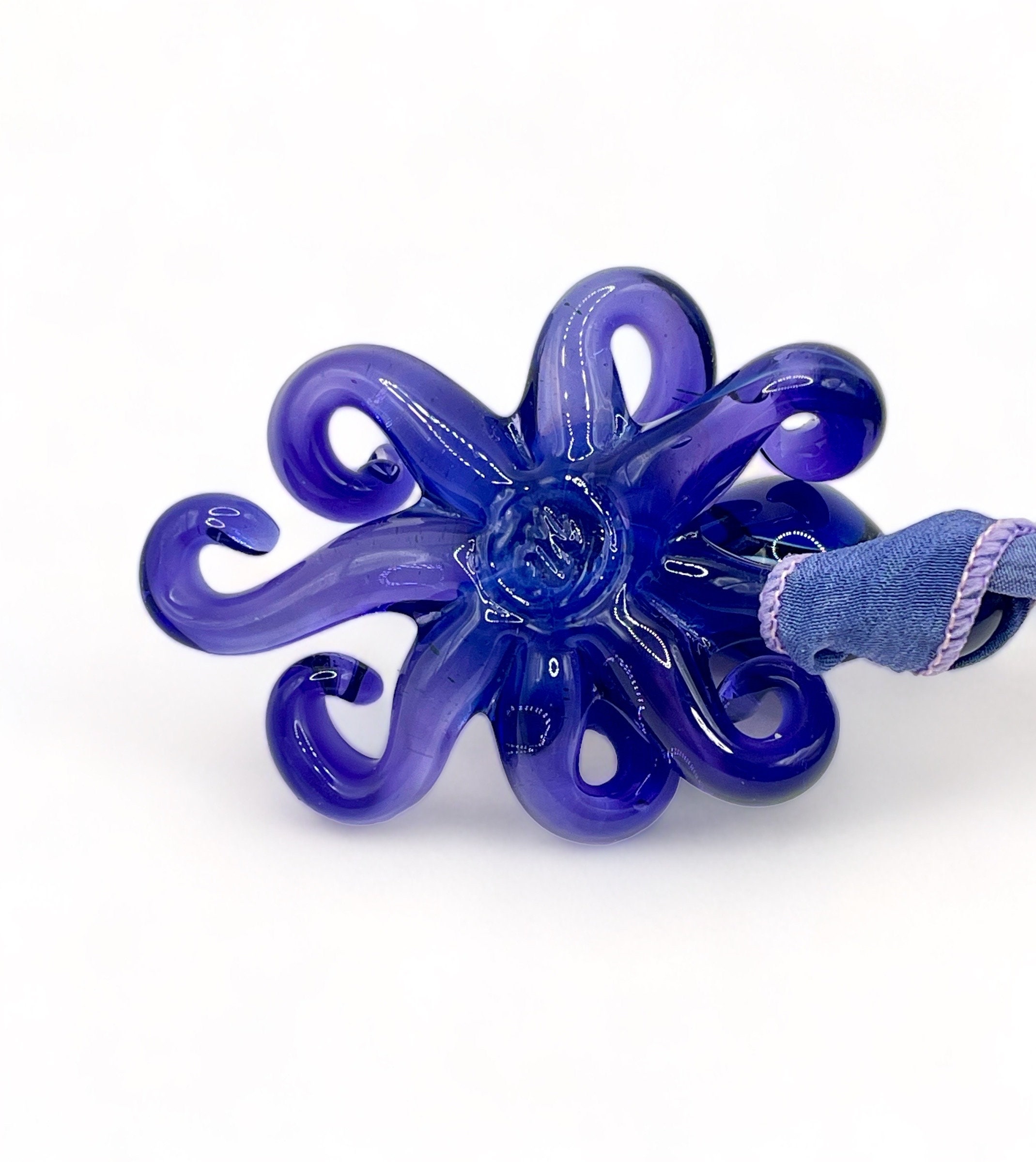 Another boro octopus glass necklace, this is the Royal Cobalt Kraken. This is a beautiful one using Molten Aura Amethyst Gold with a touch of the sparkly cobalt for hood markings. Approx 2.5" long, formed in the torch using no molds and properly annealed in a digital kiln for durability, this one arrives safely wrapped and with a removable adjustable hand dyed silk ribbon necklace threaded thru the back leg, ready to give or keep. Handmade glass eye chip gives her such realistic blue eyes, you might want to keep her on her leash, just in case! Really fun and safe to wear, for a truly dramatic look!