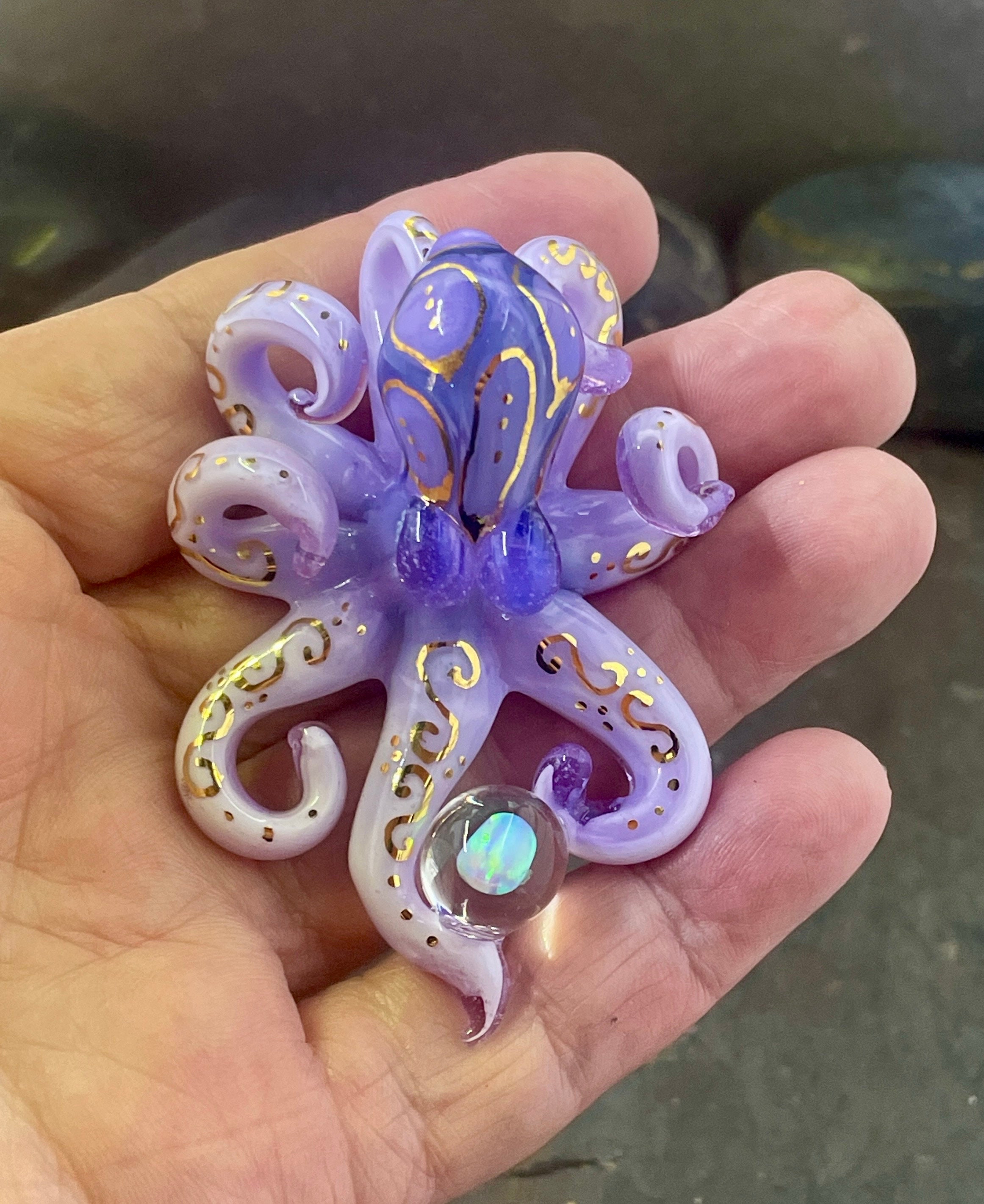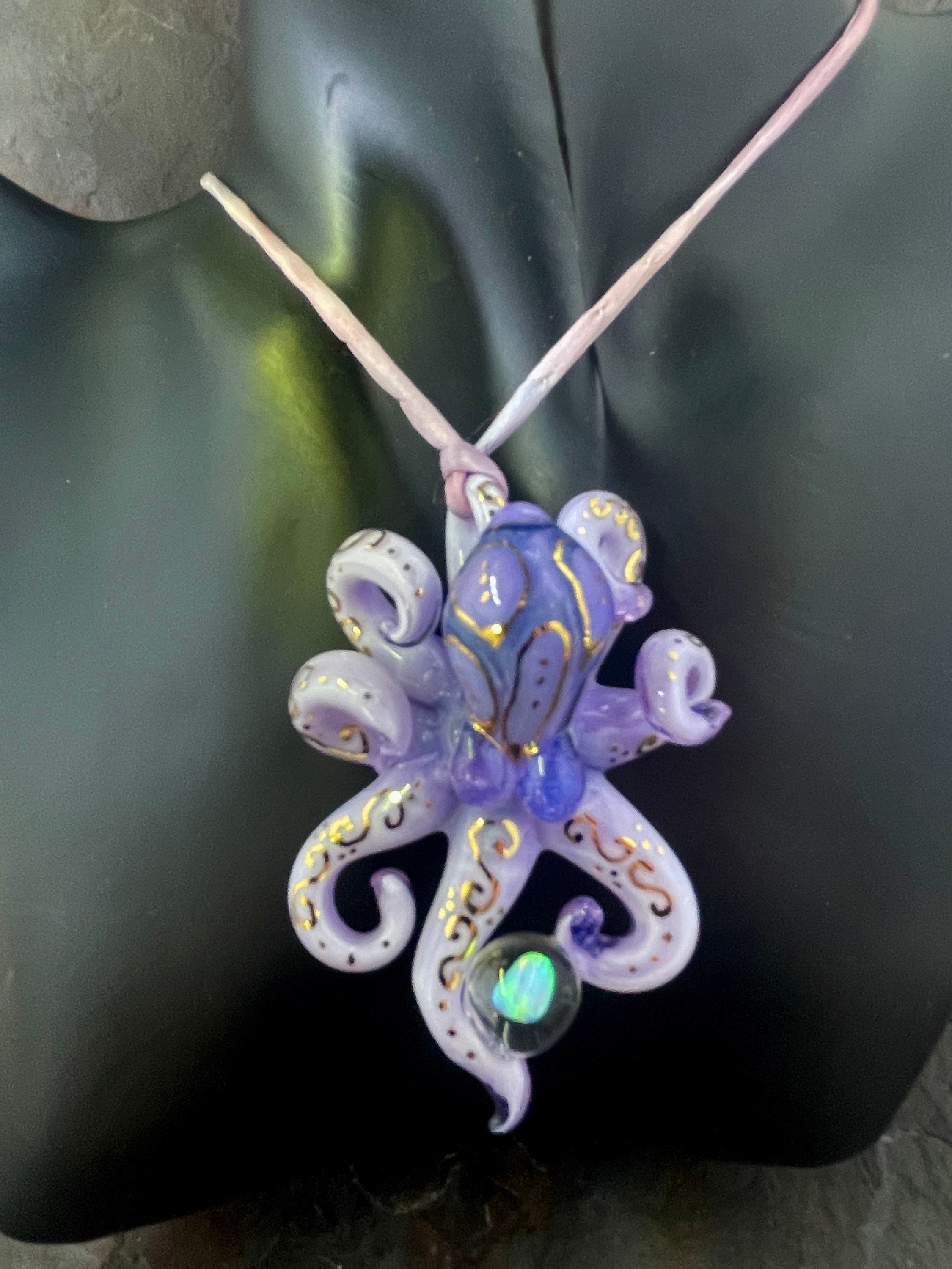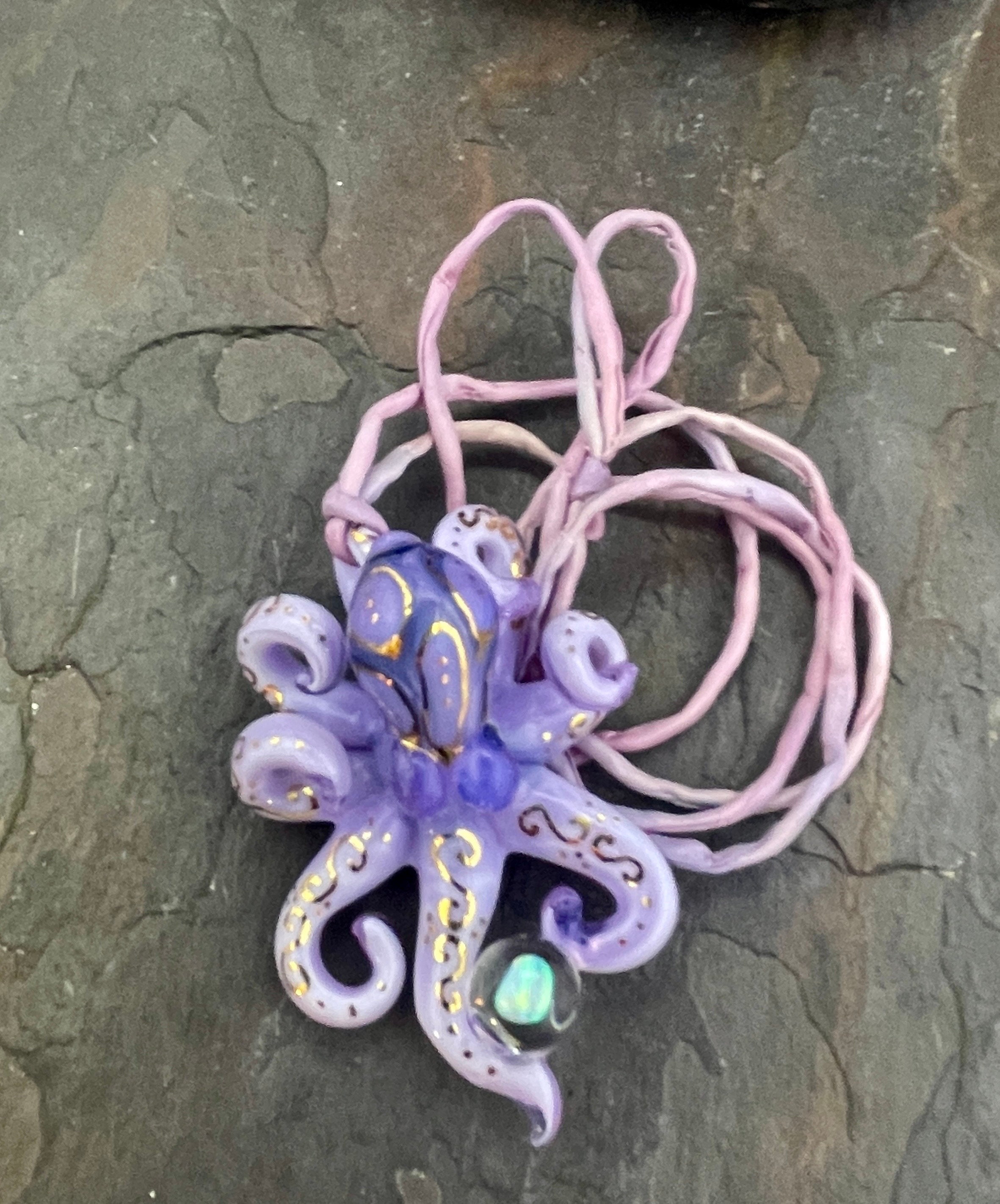 The Golden Tattoo Titan Opal Catcher Kraken. The classic Octopus pendant using one of the best Slyme glasses! And her shiny real 22k gold tribal tattoos make her extra special. And then the genuine Gilson Opal pushes it over the top! Approx 2.5" long, formed in the torch using no molds and properly annealed in a digital kiln for durability, this one arrives safely wrapped and attached to an adjustable pink silk necklace threaded thru the back leg, ready to give or keep. Handmade glass eye chip gives him such realistic eyes, you might want to keep him on her rope, just in case! Really fun and safe to wear, for a truly dramatic look!