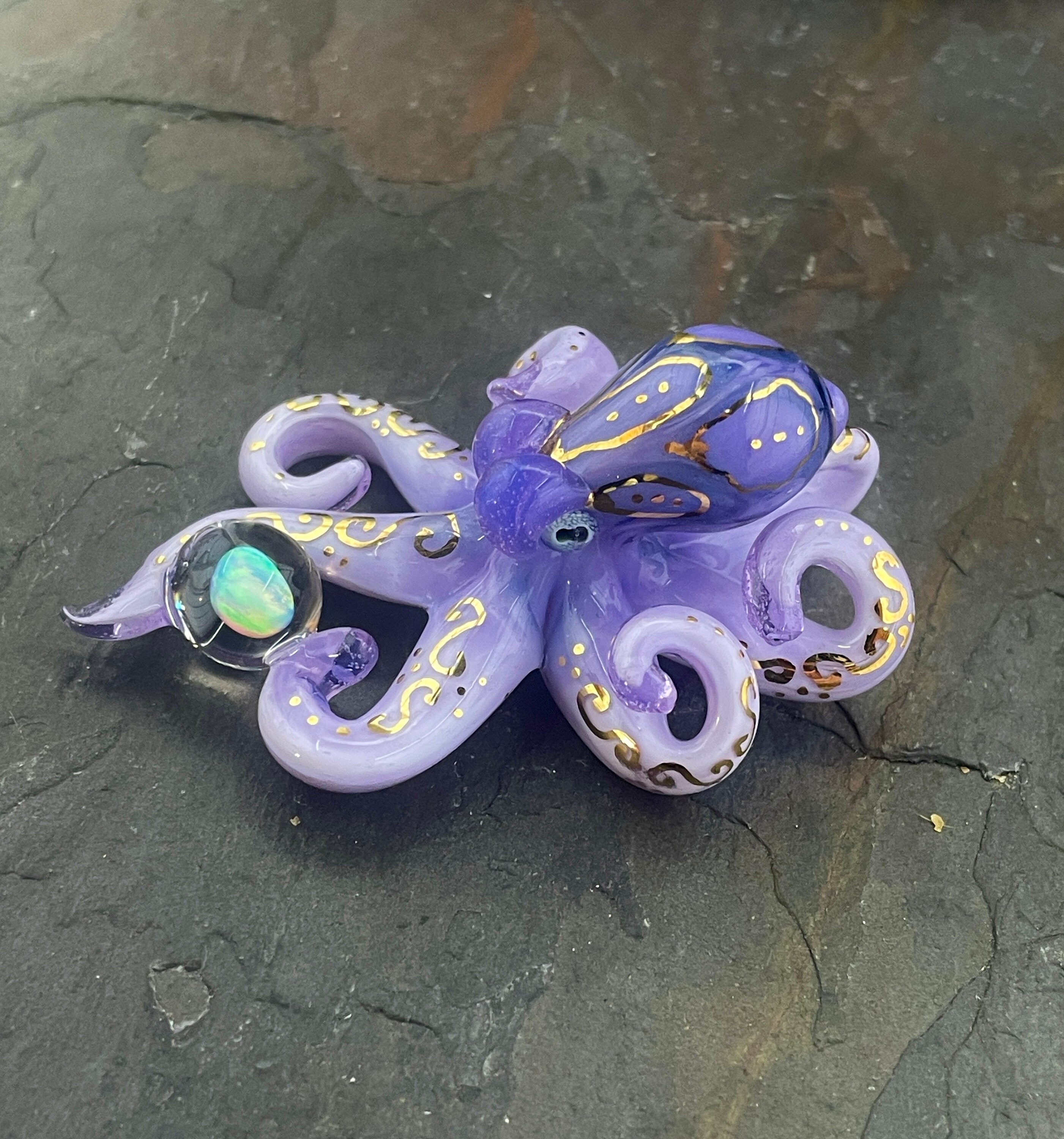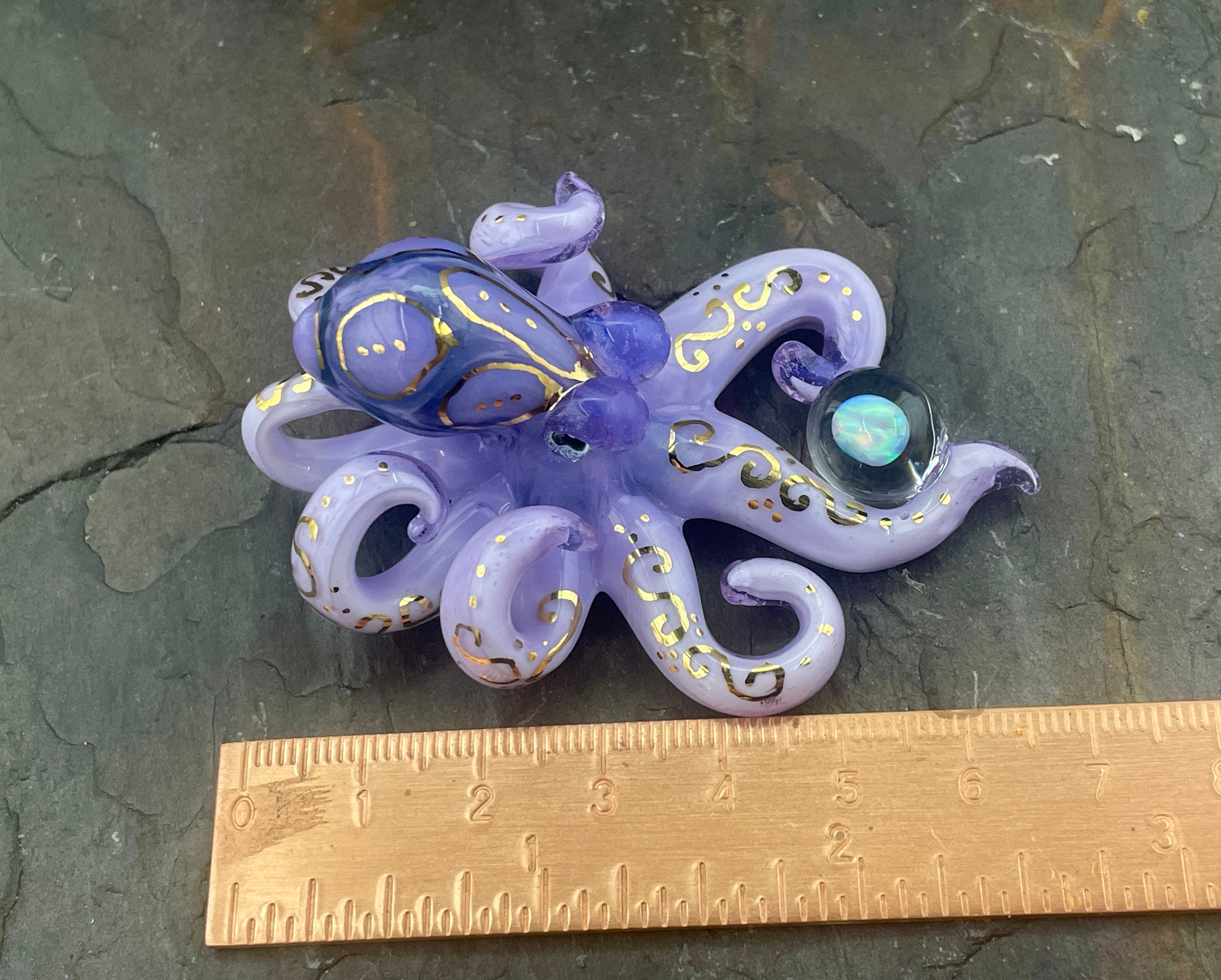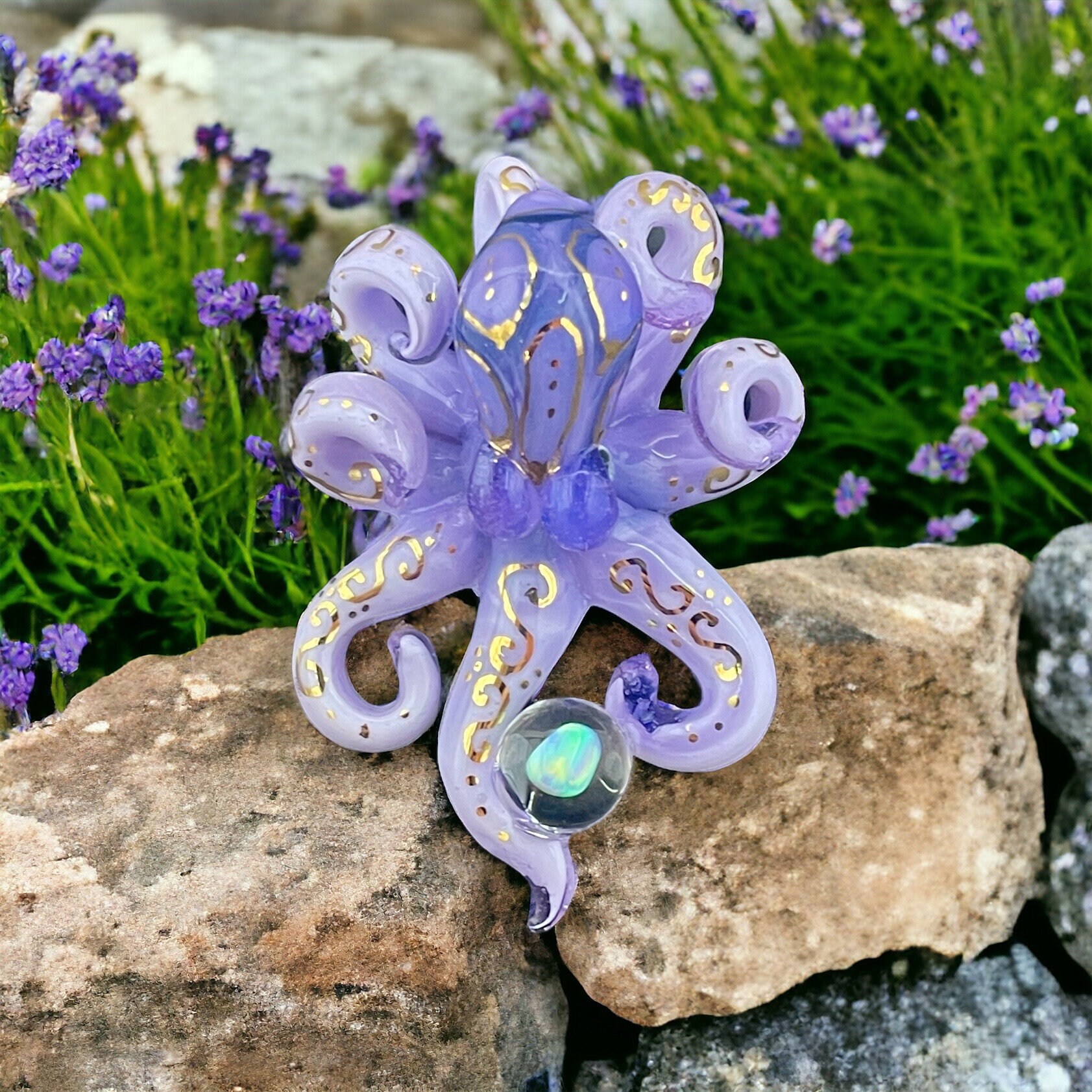 The Golden Tattoo Titan Opal Catcher Kraken. The classic Octopus pendant using one of the best Slyme glasses! And her shiny real 22k gold tribal tattoos make her extra special. And then the genuine Gilson Opal pushes it over the top! Approx 2.5" long, formed in the torch using no molds and properly annealed in a digital kiln for durability, this one arrives safely wrapped and attached to an adjustable pink silk necklace threaded thru the back leg, ready to give or keep. Handmade glass eye chip gives him such realistic eyes, you might want to keep him on her rope, just in case! Really fun and safe to wear, for a truly dramatic look!