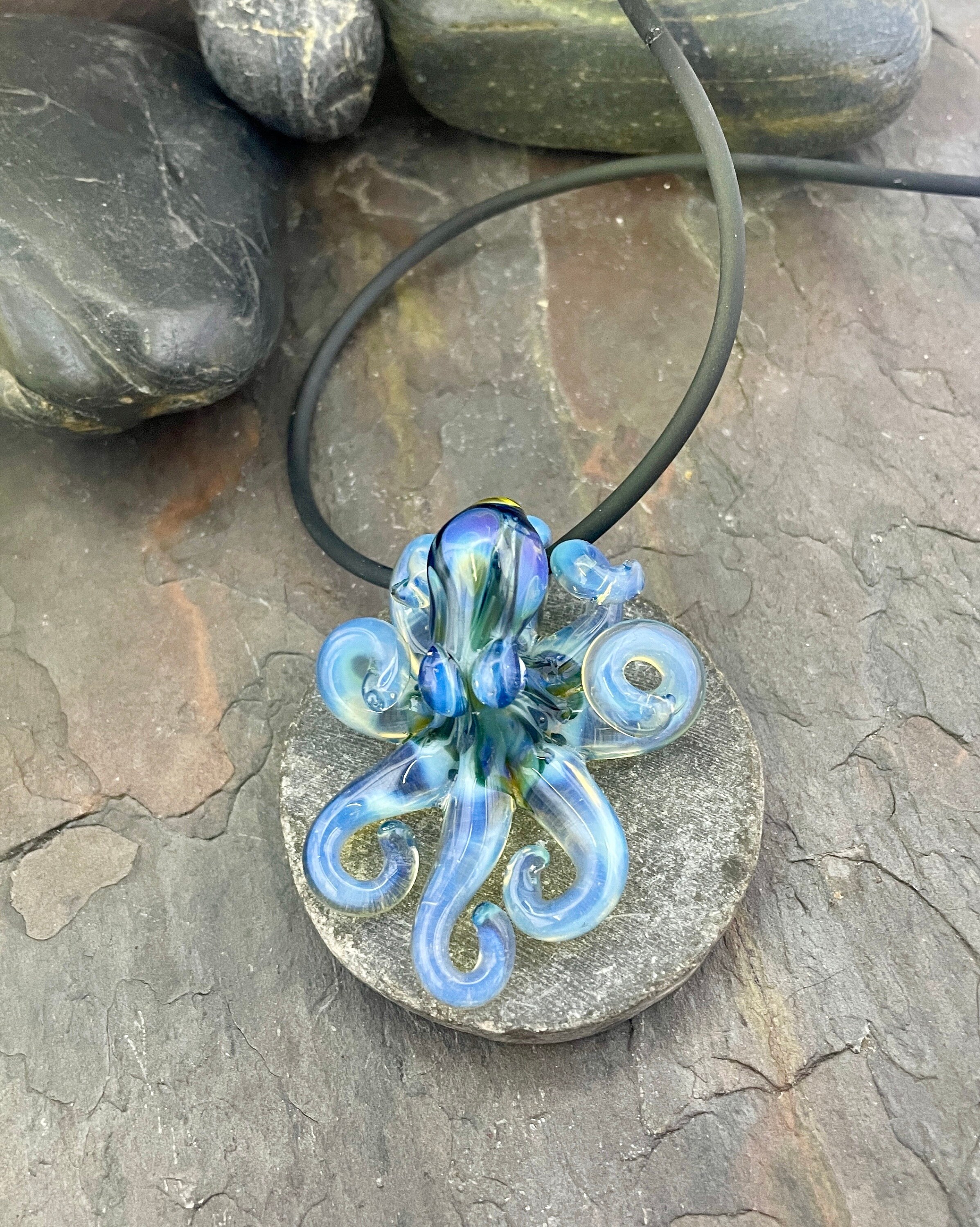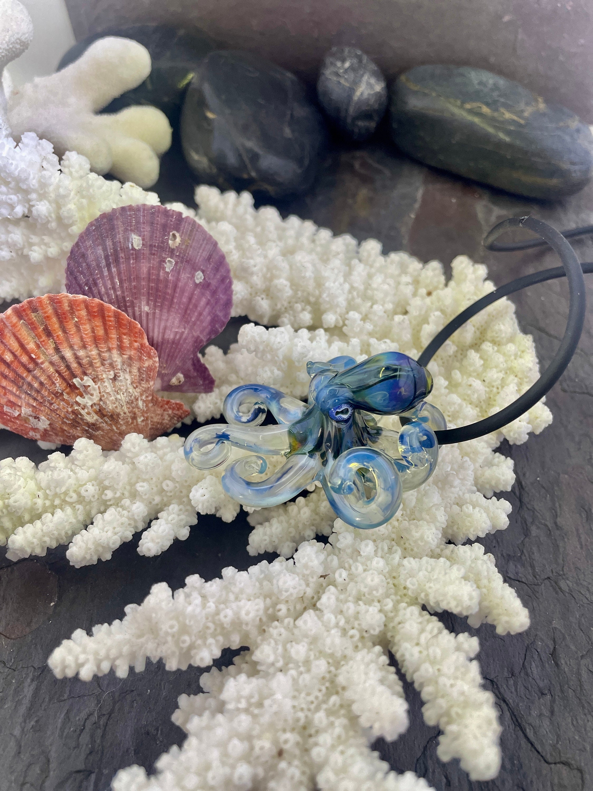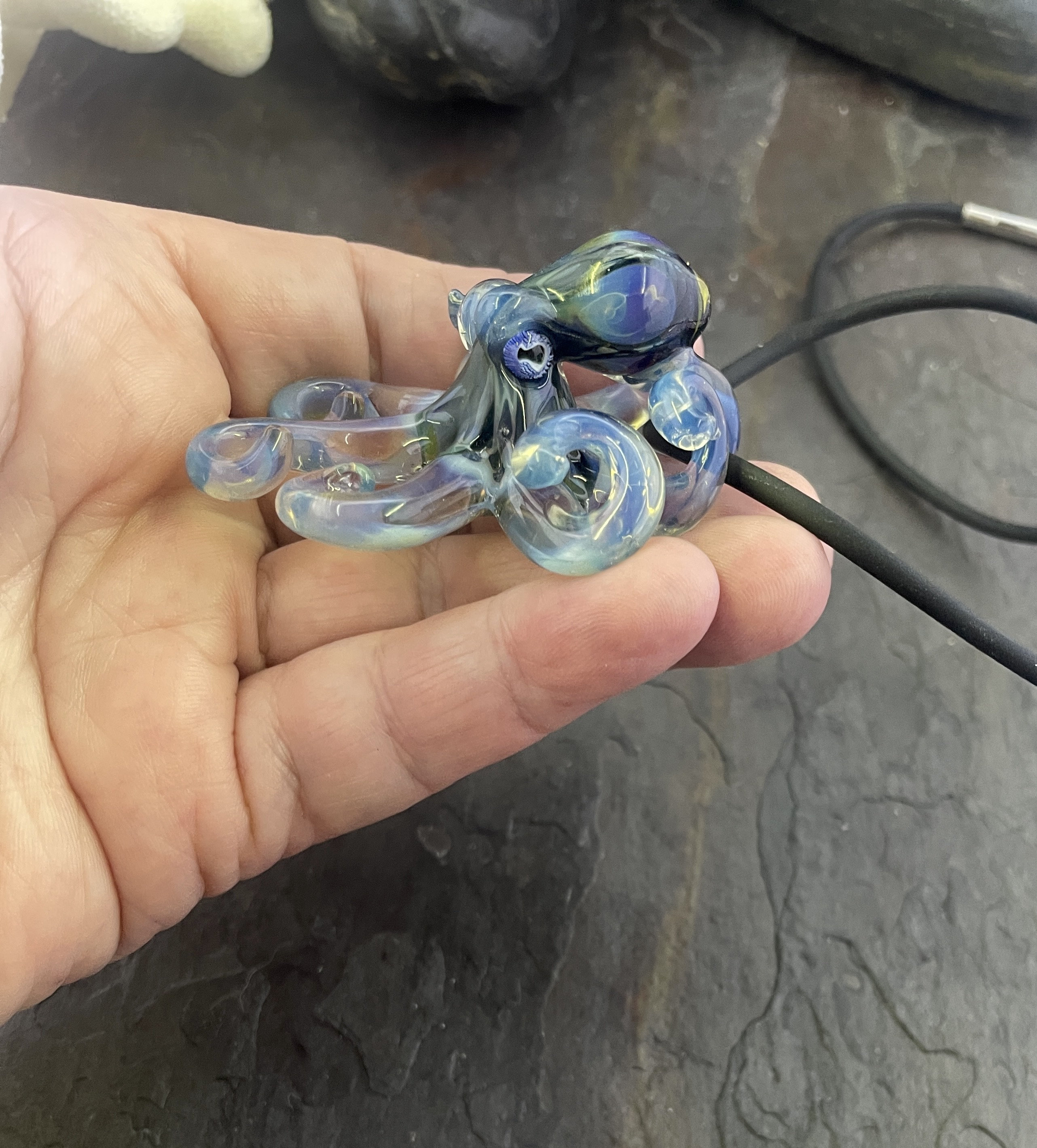 The Blue Moonstone ....another amazing color using silver blue and Moonstone! The body is a cool, jelly like bluish moonstone with subtle hood markings! I'm not sure if being made during a Leap Year changes the Moonstone but it sure seems like it! Approx 2" long, formed in the torch and properly annealed in a digital kiln for durability, this one arrives safely wrapped attached to a black silicone 22” surfer necklace. Handmade glass eye chip gives him such realistic eyes, you might want to keep him on his rope, just in case! Really fun and safe to wear, for a truly dramatic look!