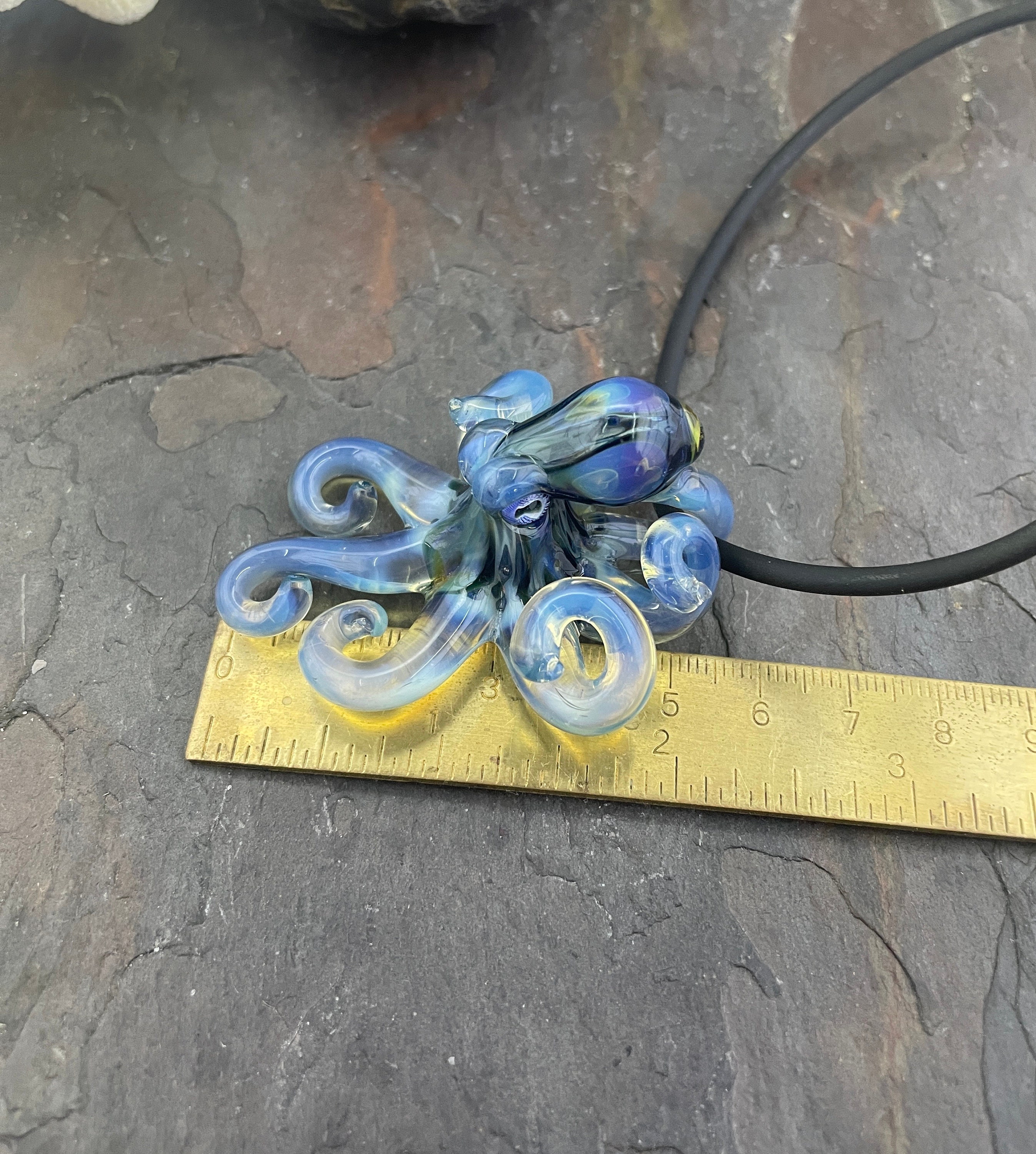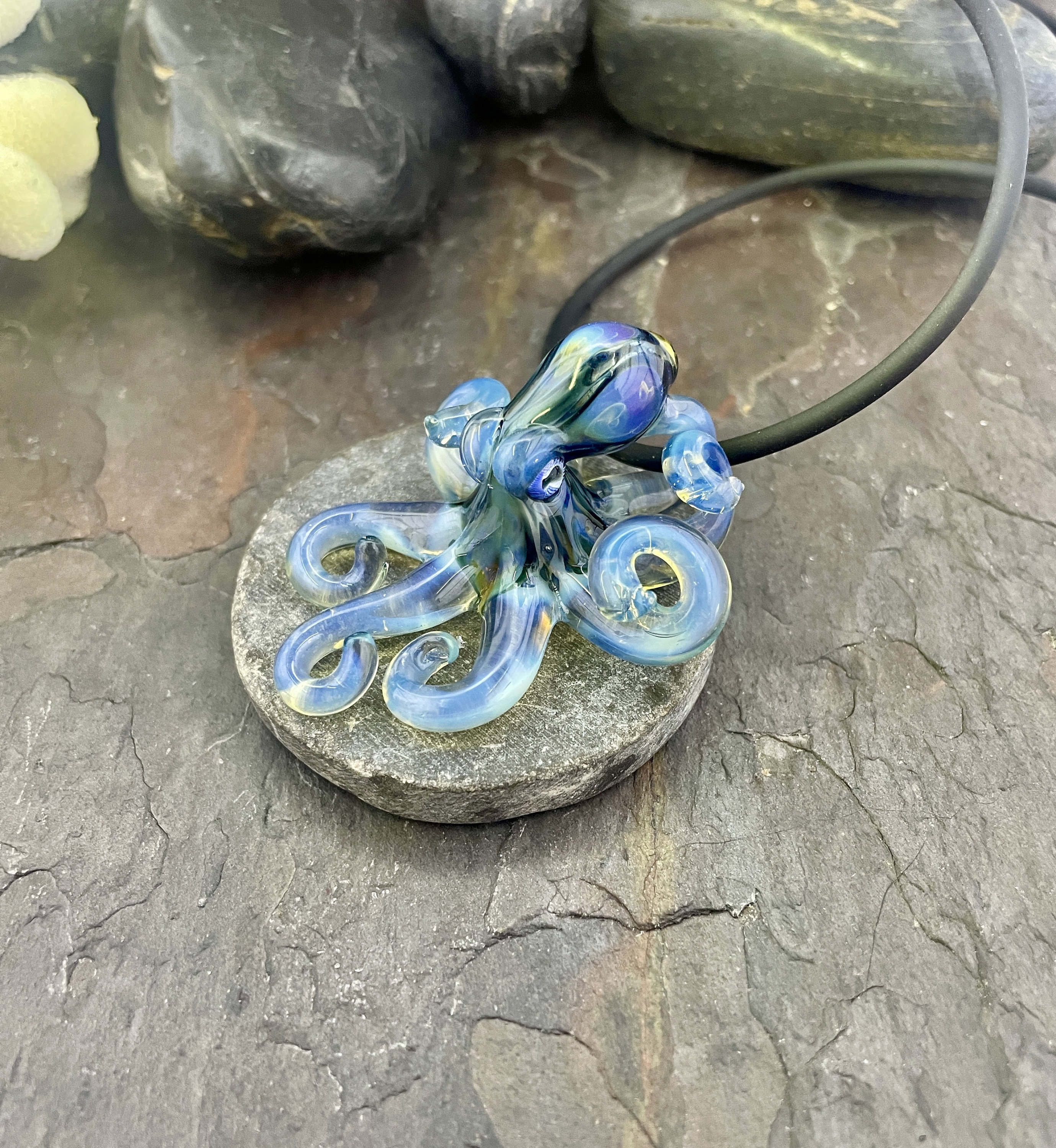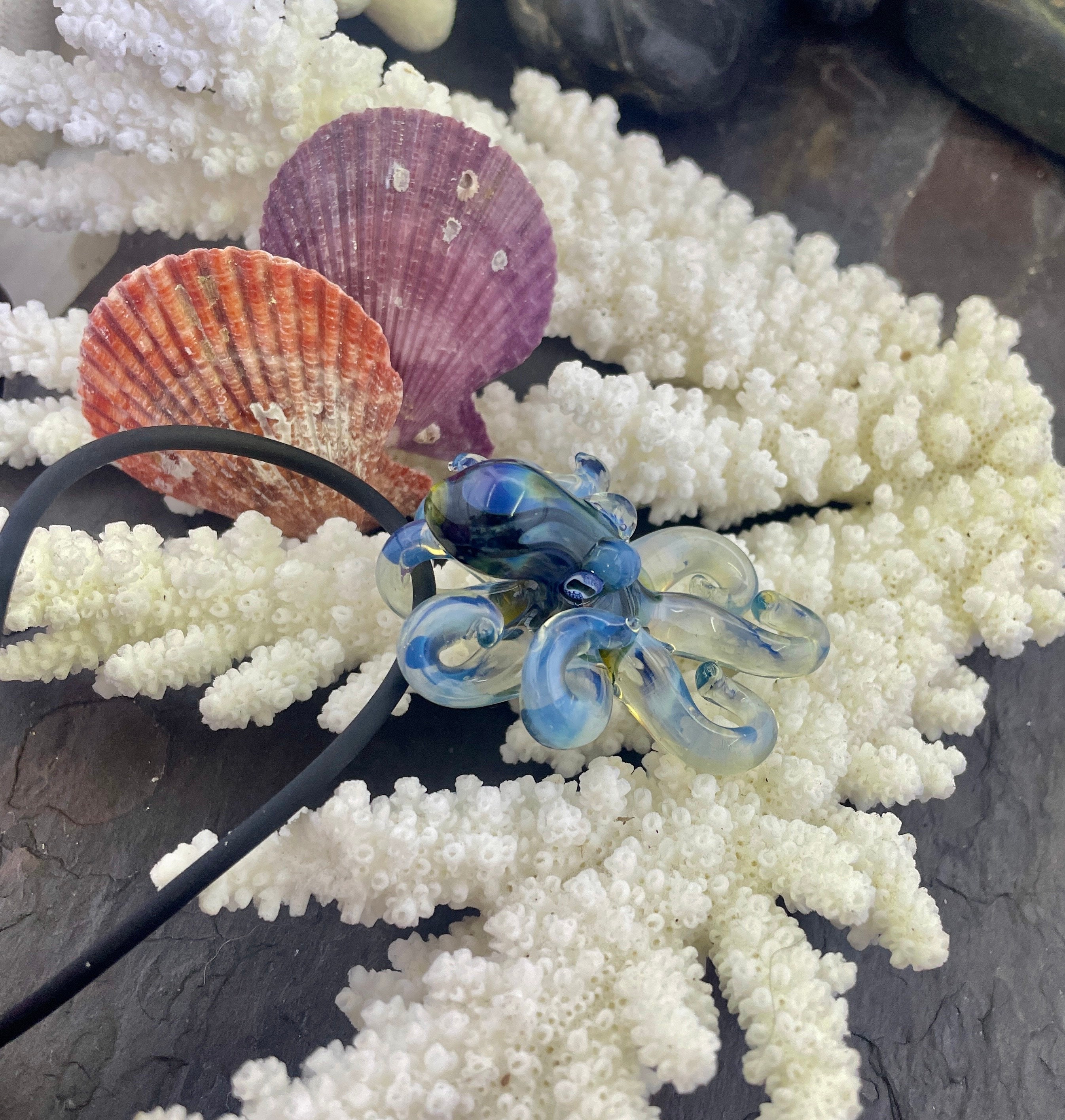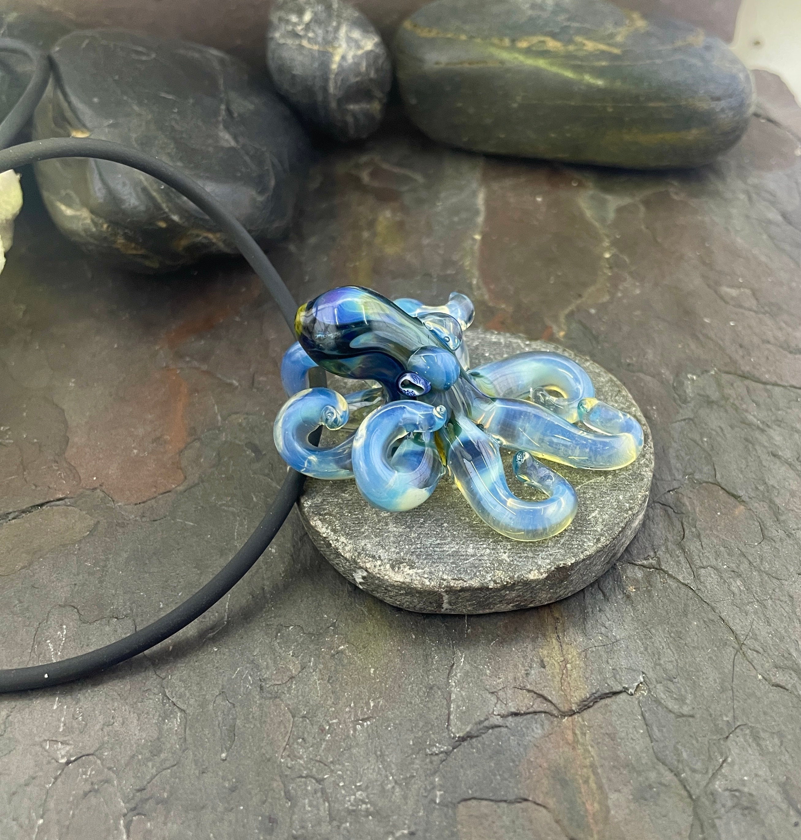 The Blue Moonstone ....another amazing color using silver blue and Moonstone! The body is a cool, jelly like bluish moonstone with subtle hood markings! I'm not sure if being made during a Leap Year changes the Moonstone but it sure seems like it! Approx 2" long, formed in the torch and properly annealed in a digital kiln for durability, this one arrives safely wrapped attached to a black silicone 22” surfer necklace. Handmade glass eye chip gives him such realistic eyes, you might want to keep him on his rope, just in case! Really fun and safe to wear, for a truly dramatic look!