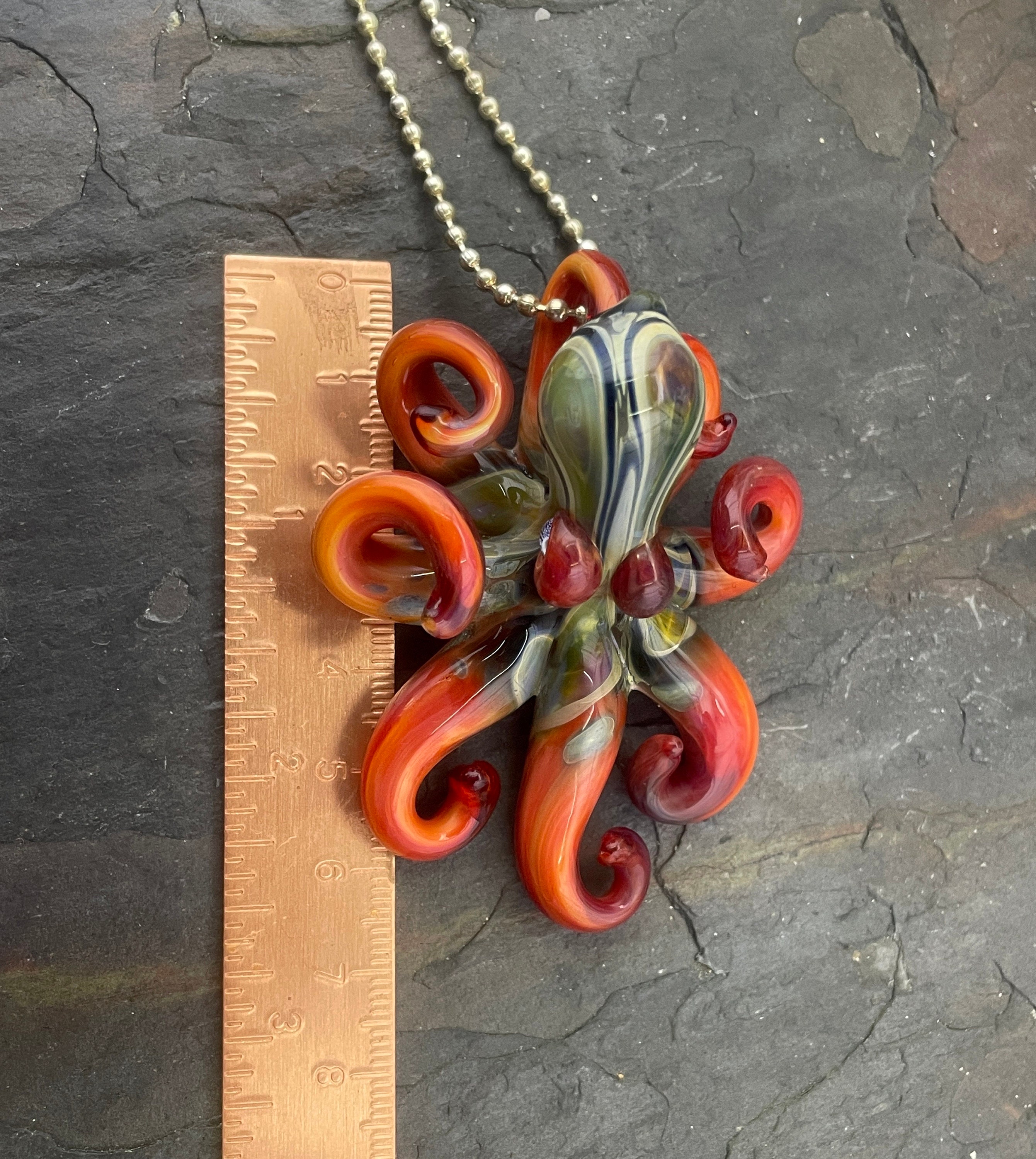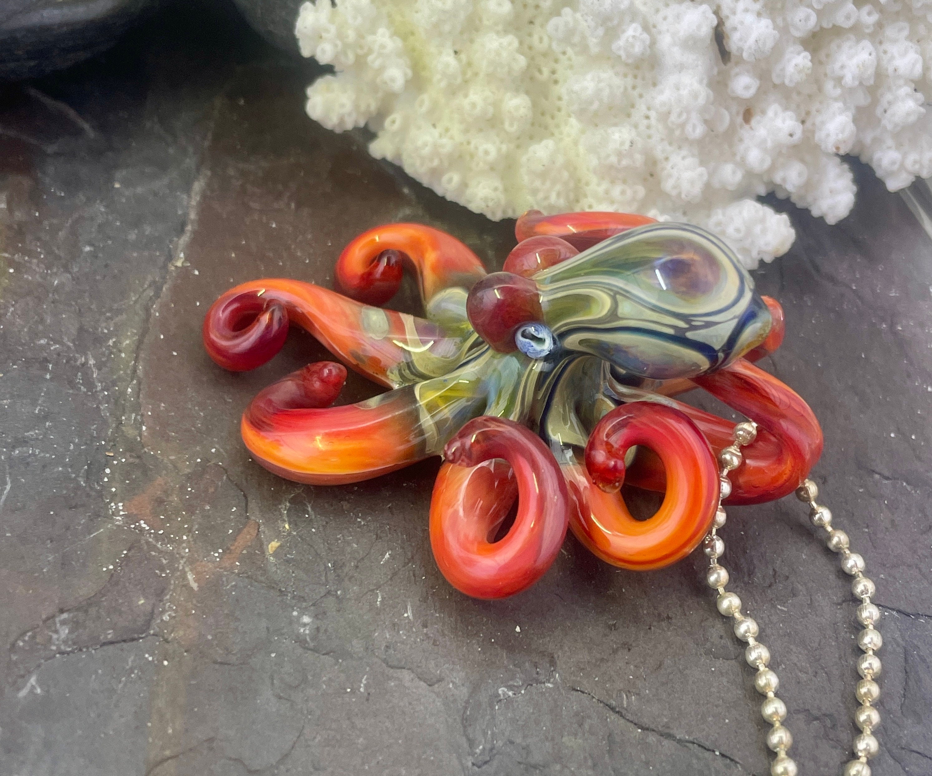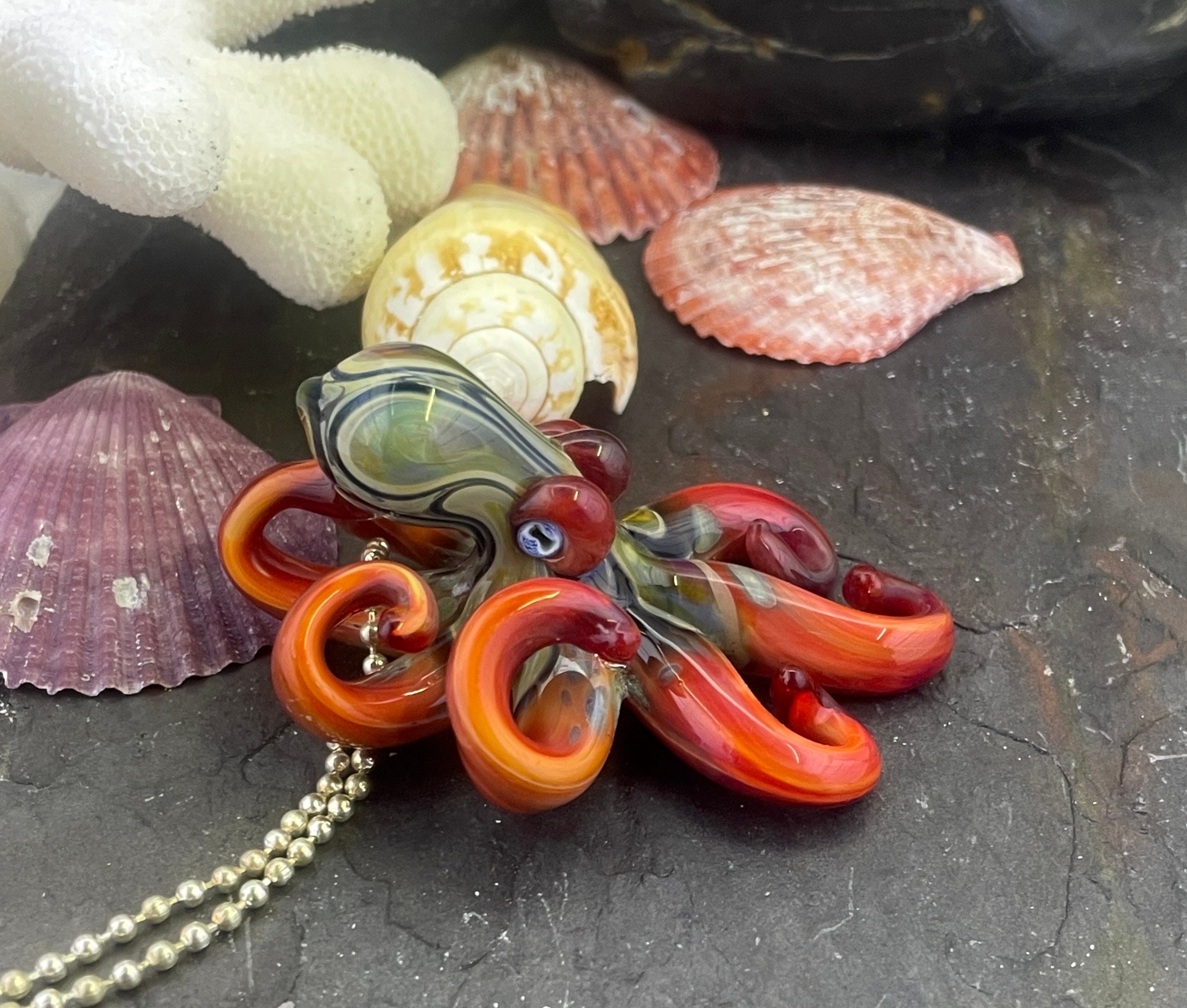 The Blue Moon Persimmon Octo....another fun pendant made with the beautiful persimmon glass. The beautiful red body sports black sparkle and Blue Moon hood markings. Approx 2.5" long, formed in the torch and properly annealed in a digital kiln for durability, this one arrives safely wrapped attached to a 2mm silver filled ball chain. Handmade glass eye chip gives him such realistic eyes, you might want to keep him on his rope, just in case! Really fun and safe to wear, for a truly dramatic look!