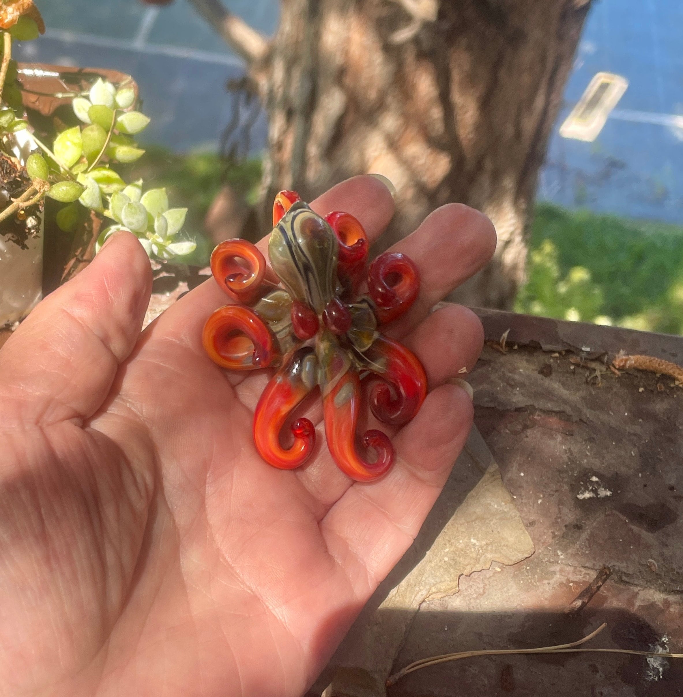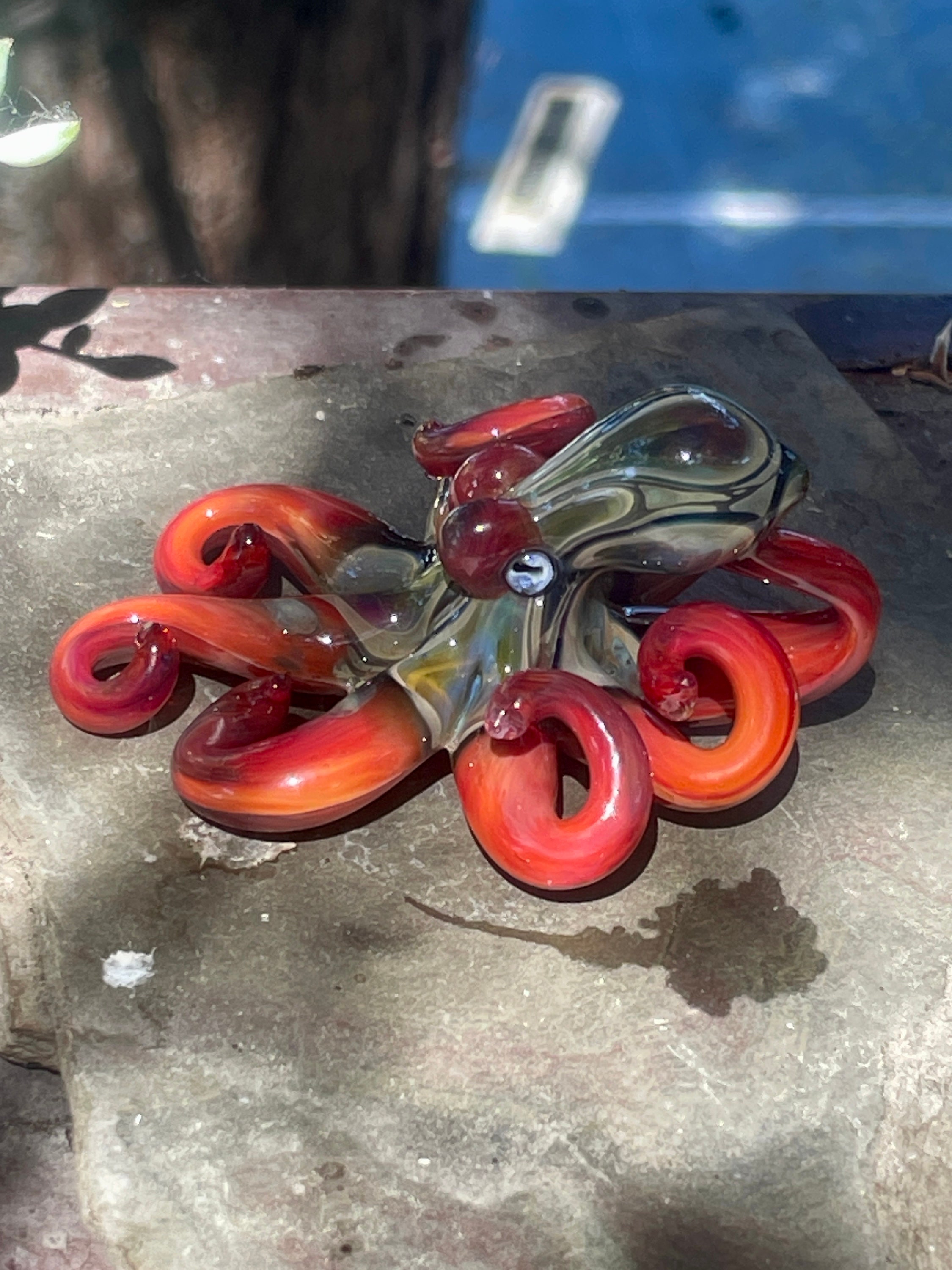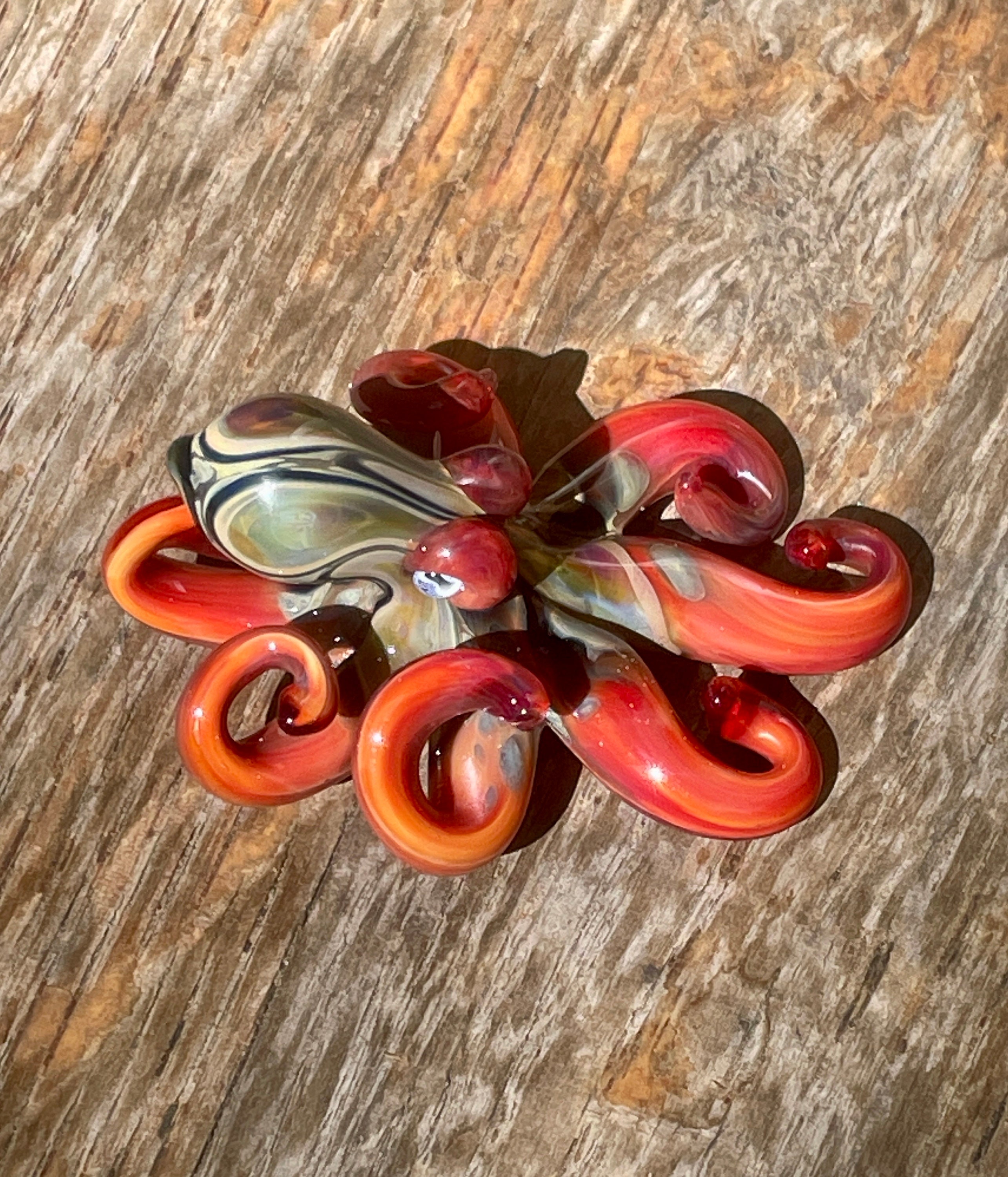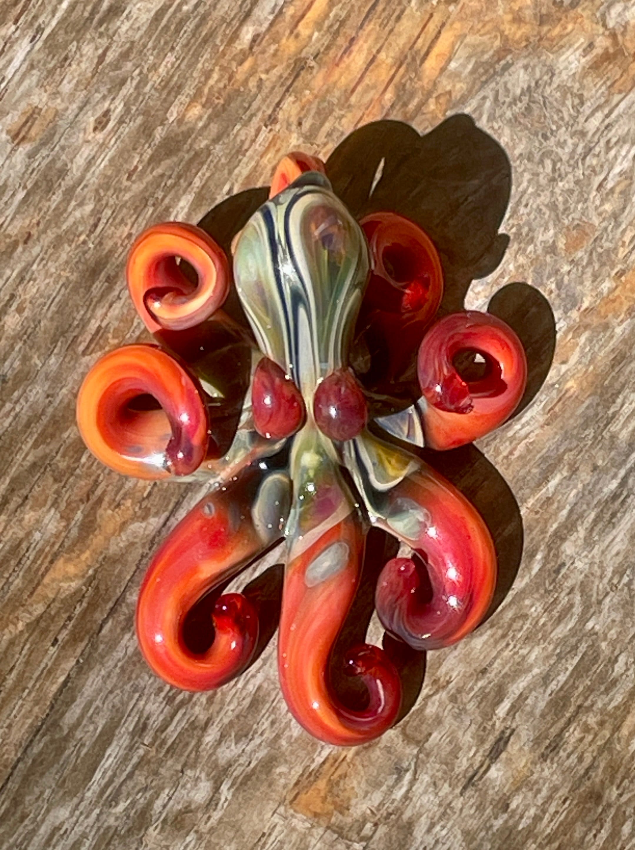 The Blue Moon Persimmon Octo....another fun pendant made with the beautiful persimmon glass. The beautiful red body sports black sparkle and Blue Moon hood markings. Approx 2.5" long, formed in the torch and properly annealed in a digital kiln for durability, this one arrives safely wrapped attached to a 2mm silver filled ball chain. Handmade glass eye chip gives him such realistic eyes, you might want to keep him on his rope, just in case! Really fun and safe to wear, for a truly dramatic look!