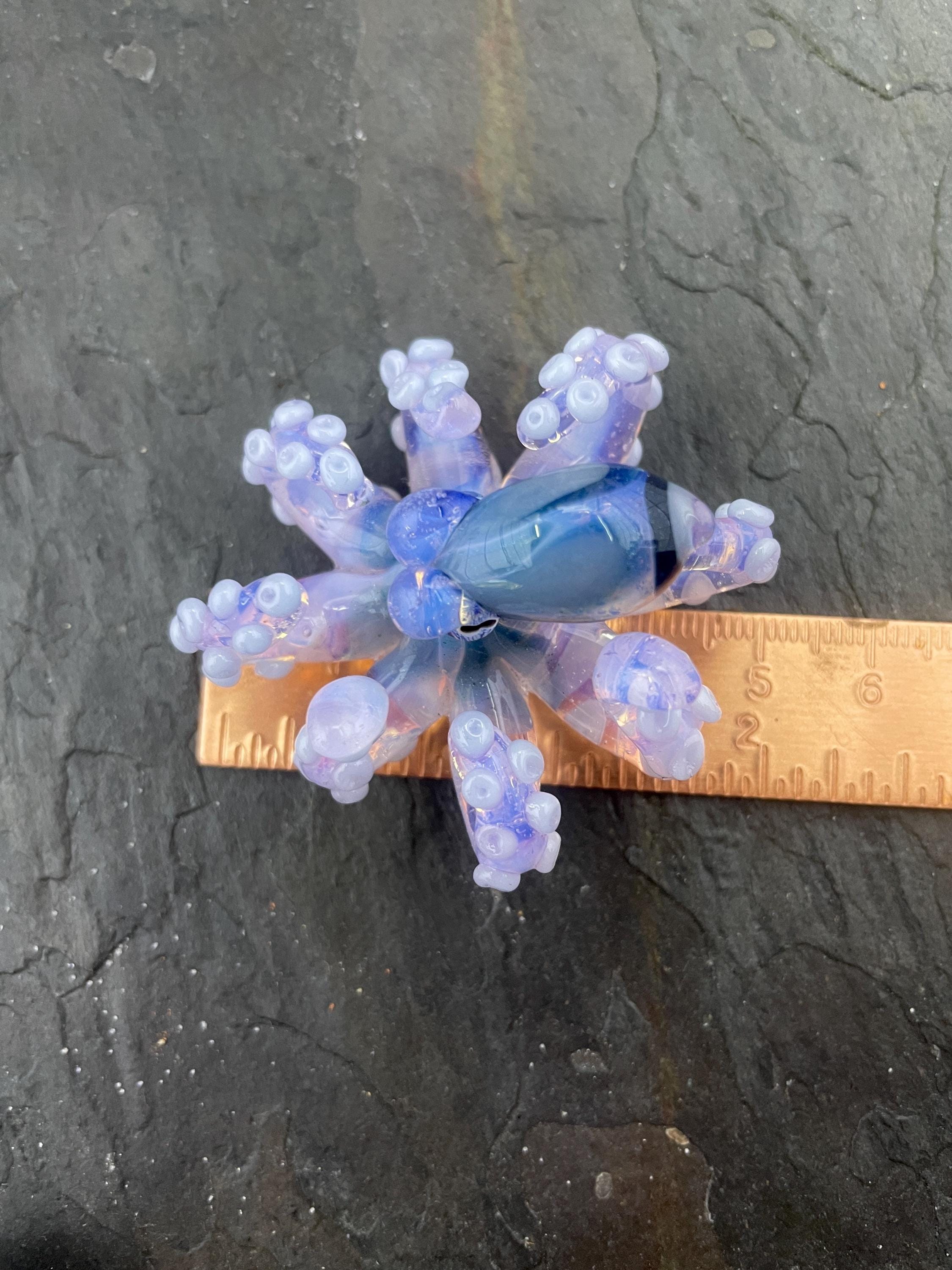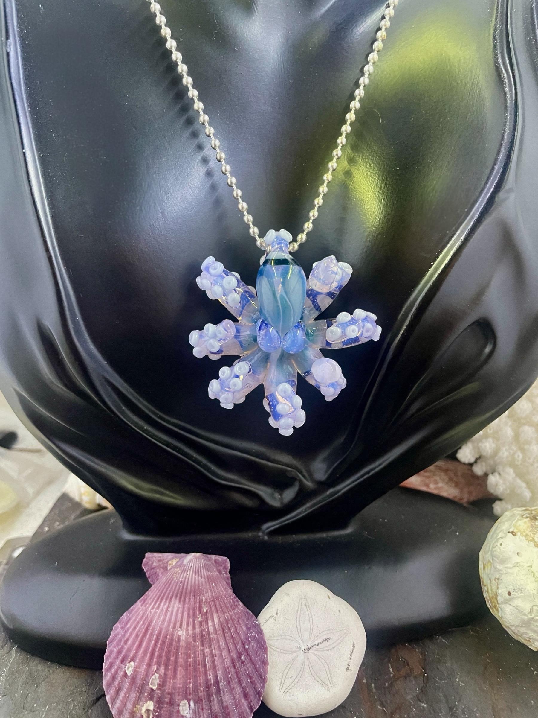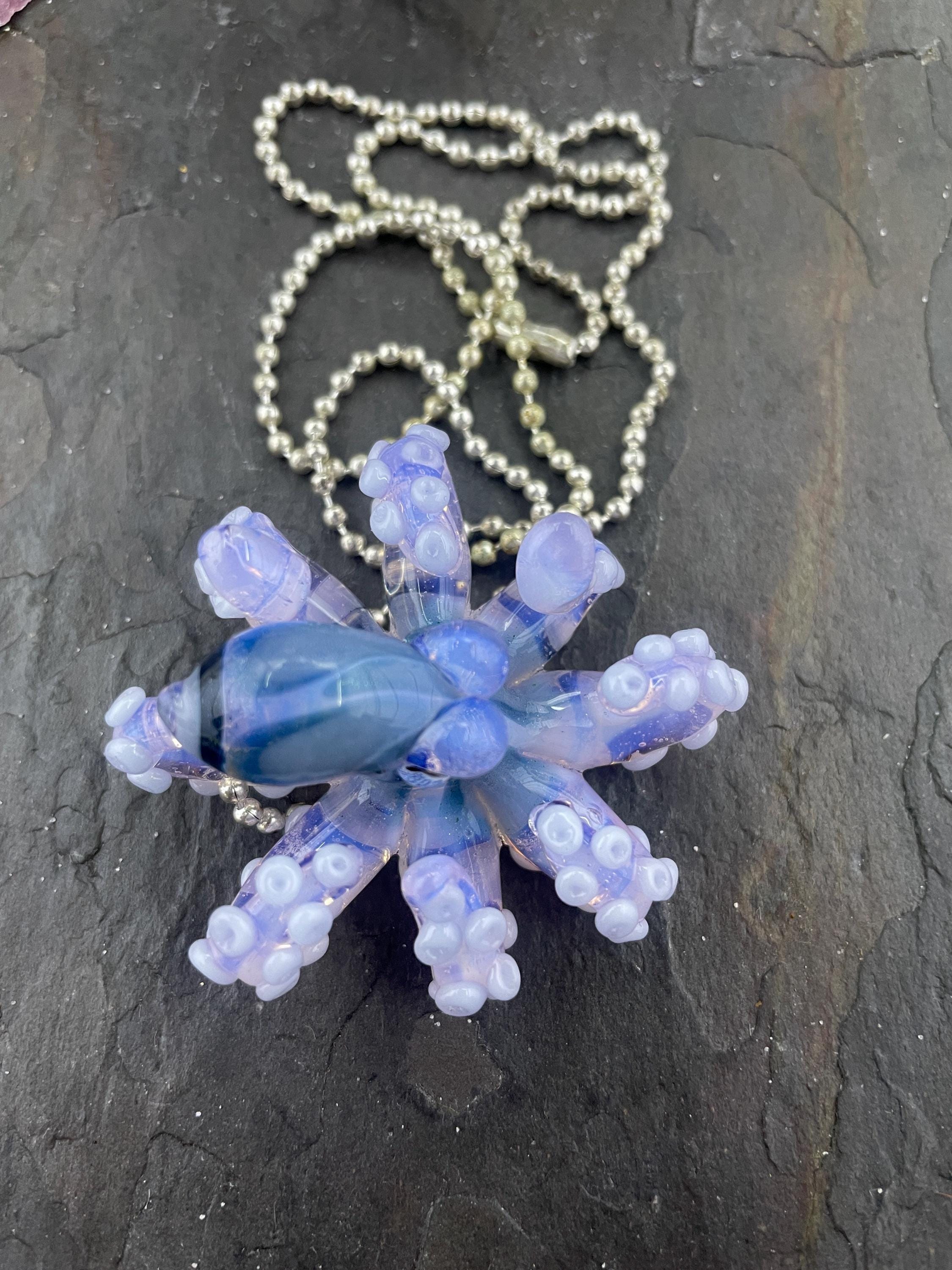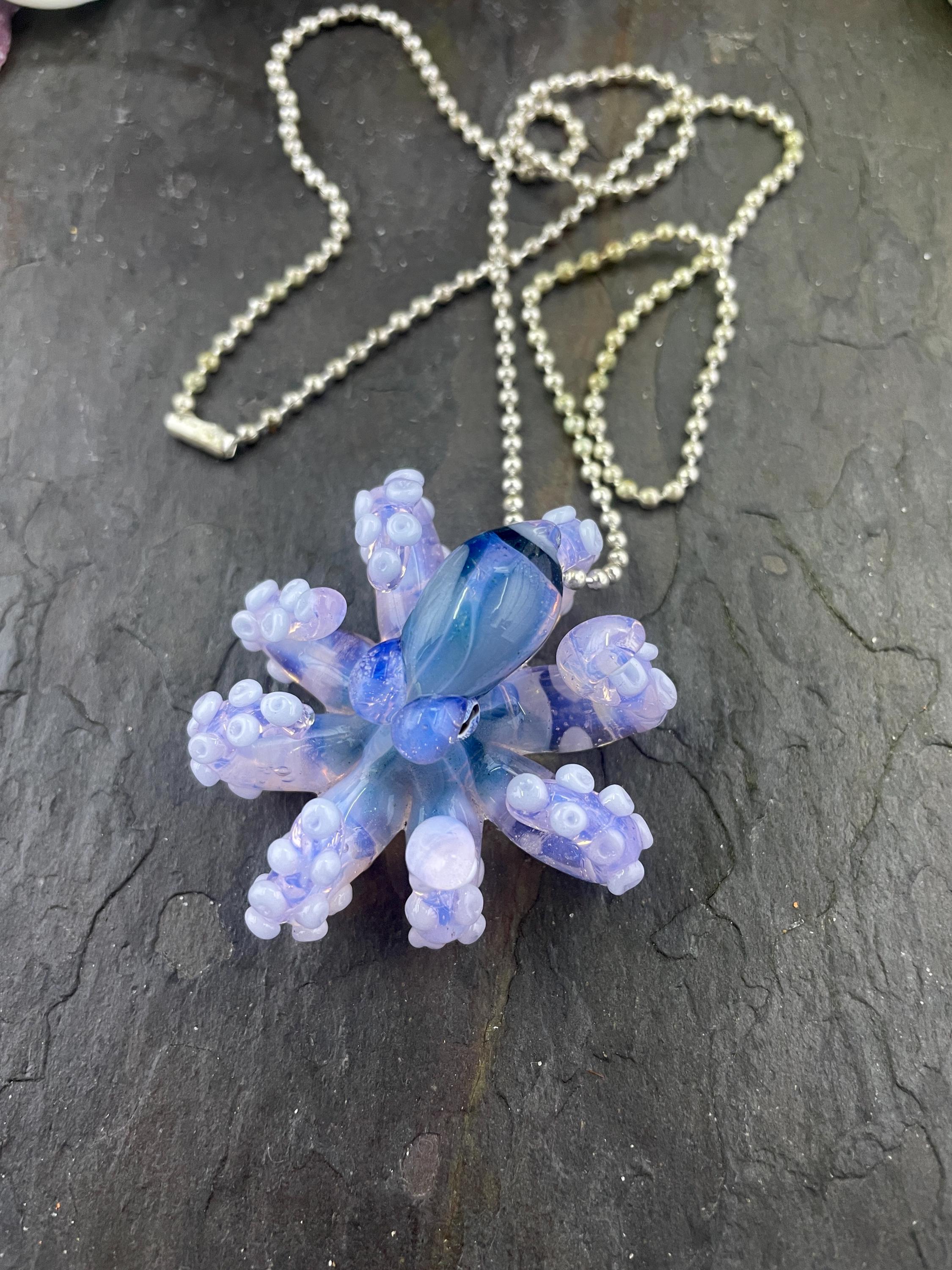 Another of my new favorites.... a mini octo friend made with the beautiful Blossom borosilicate glass. This one is right around 2" across. This is a new style, with many, many little wisteria suckers on her little arms. She arrives on a silver filled mini ball chain necklace. Formed in the torch using no molds and properly annealed in a digital kiln for durability, this one arrives safely wrapped in a fun reusable tin box. Handmade glass eye chip gives her such realistic eyes, you might want to keep him on his chain, just in case! Really fun and safe to wear, for a truly dramatic look! Marked on the bottom with the Maker's Mark "M" while still molten..