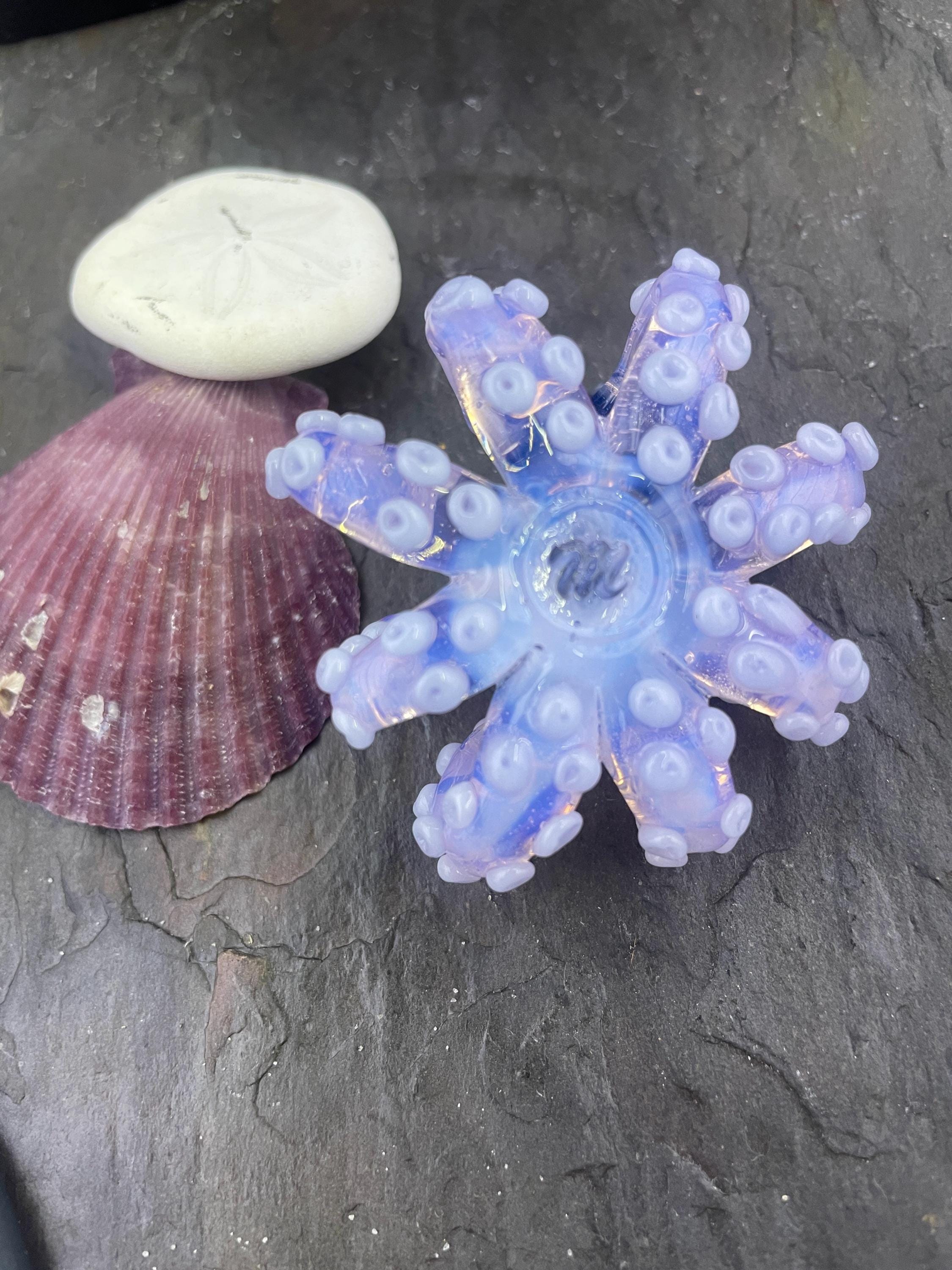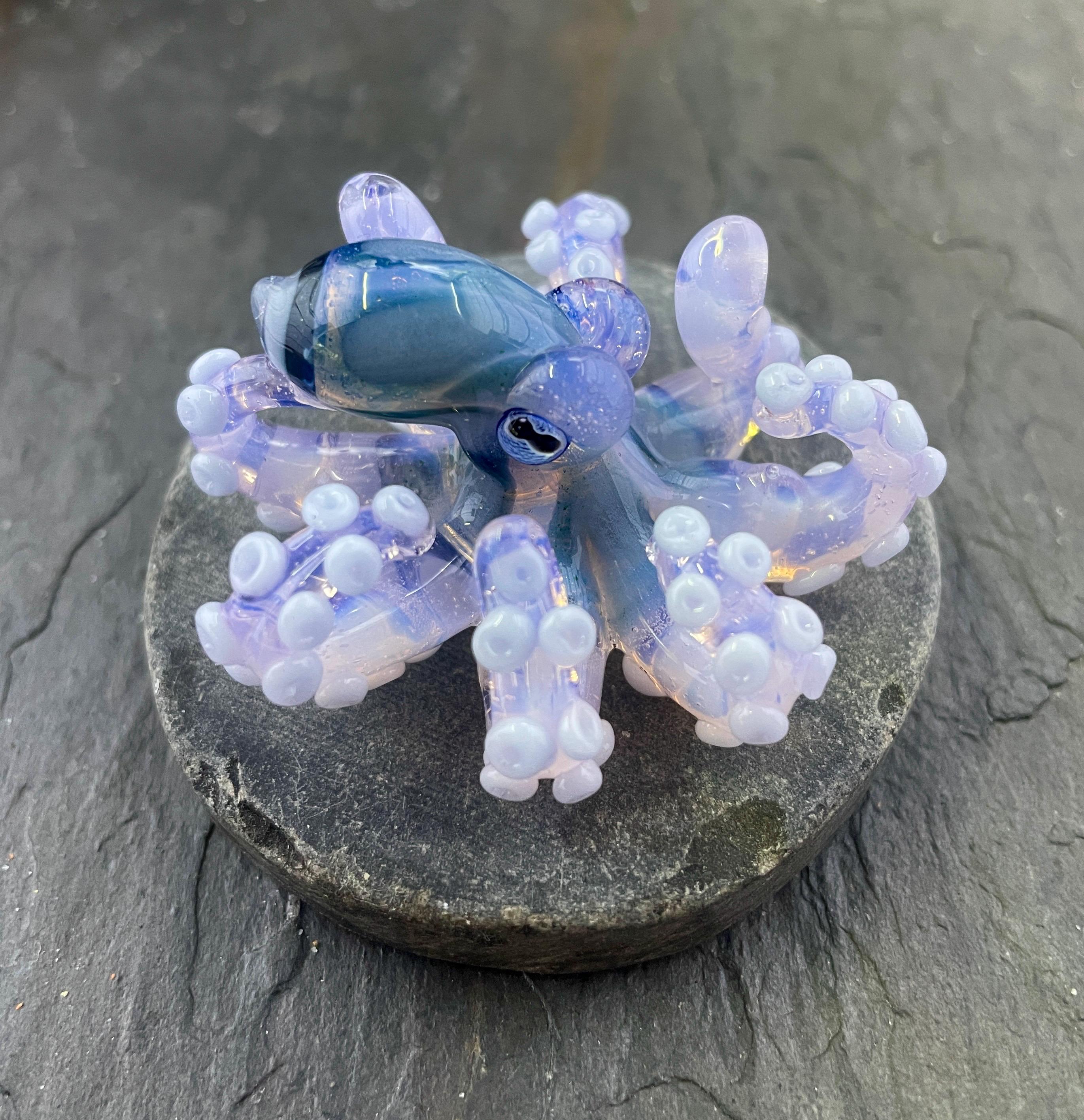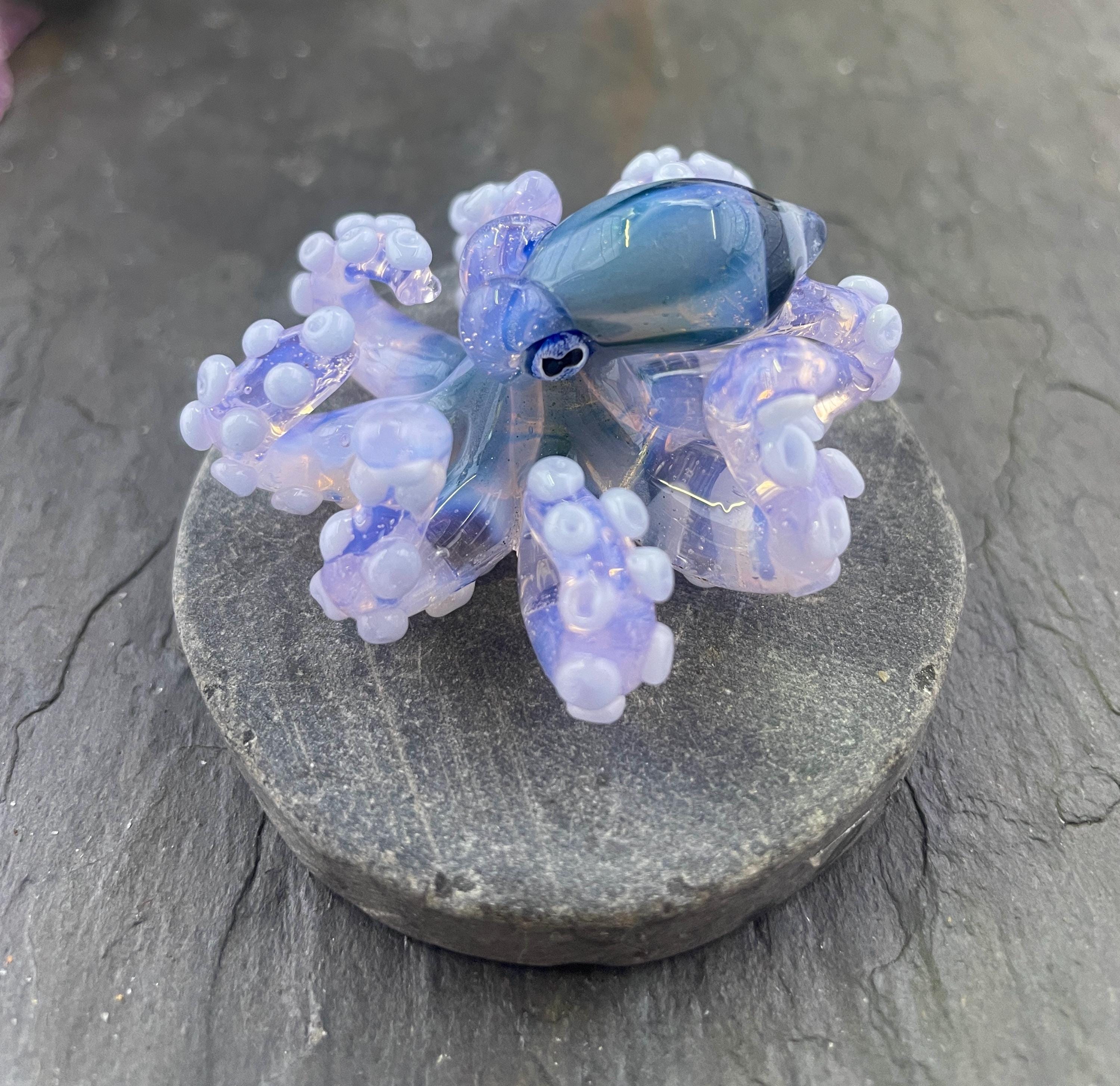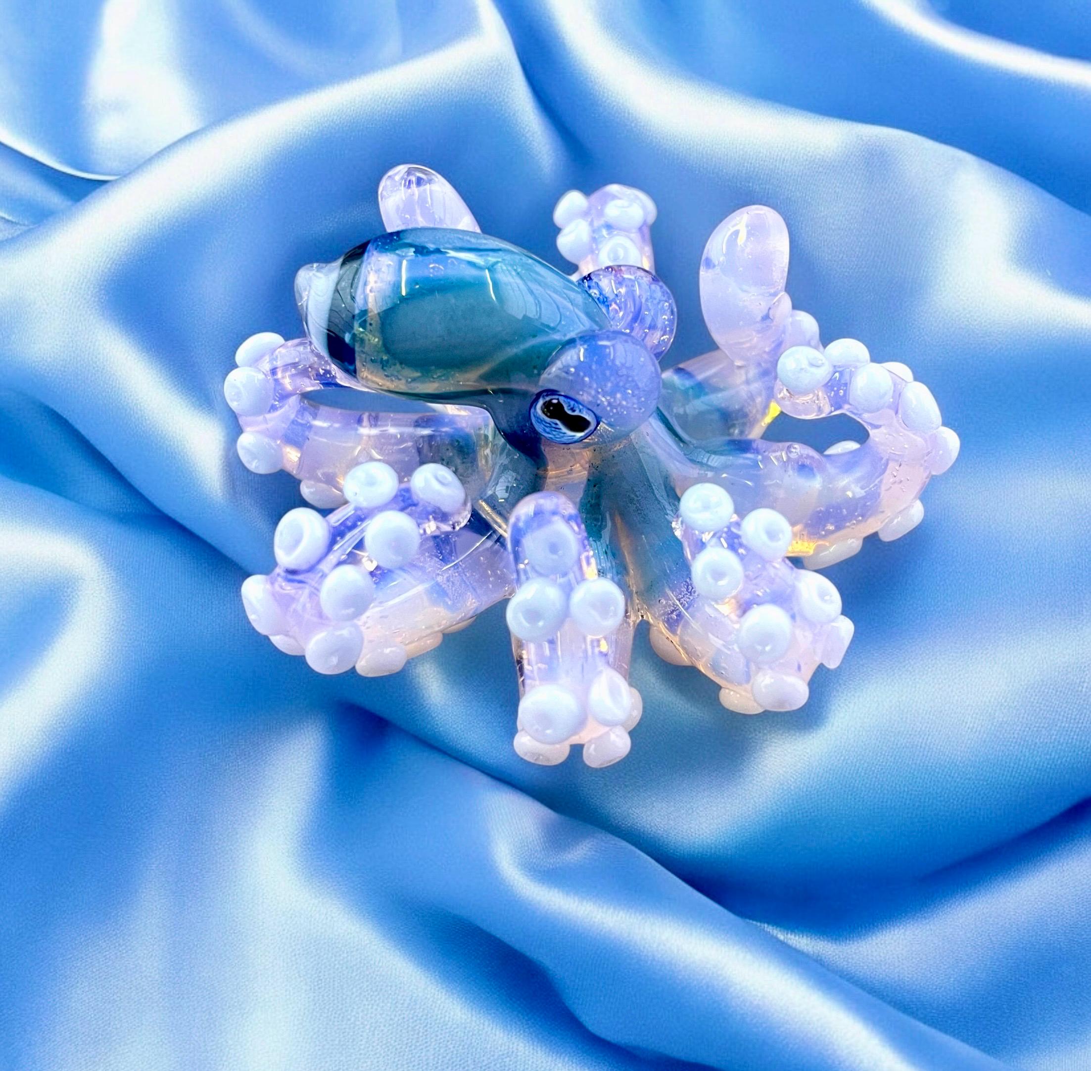 Another of my new favorites.... a mini octo friend made with the beautiful Blossom borosilicate glass. This one is right around 2" across. This is a new style, with many, many little wisteria suckers on her little arms. She arrives on a silver filled mini ball chain necklace. Formed in the torch using no molds and properly annealed in a digital kiln for durability, this one arrives safely wrapped in a fun reusable tin box. Handmade glass eye chip gives her such realistic eyes, you might want to keep him on his chain, just in case! Really fun and safe to wear, for a truly dramatic look! Marked on the bottom with the Maker's Mark "M" while still molten..