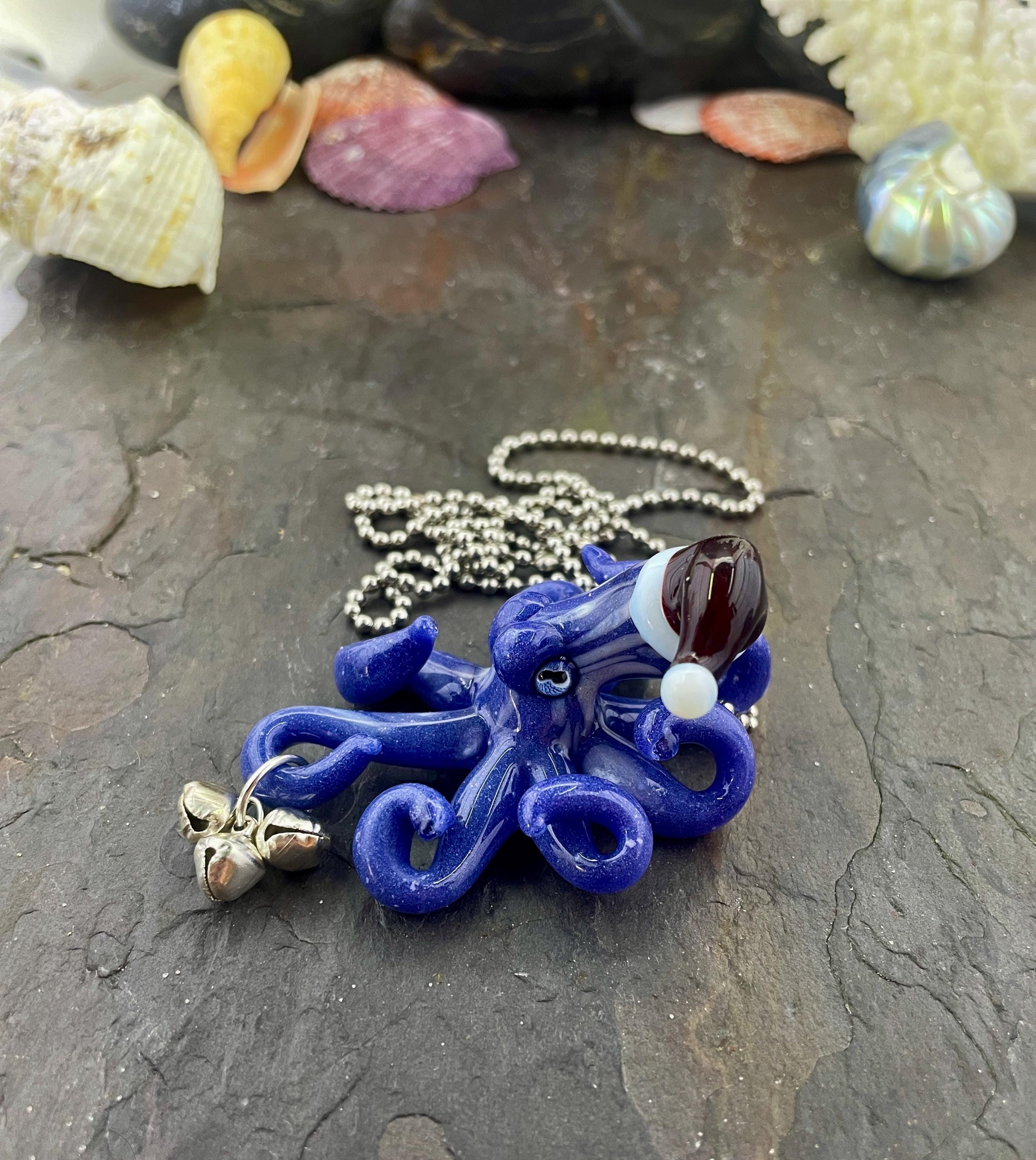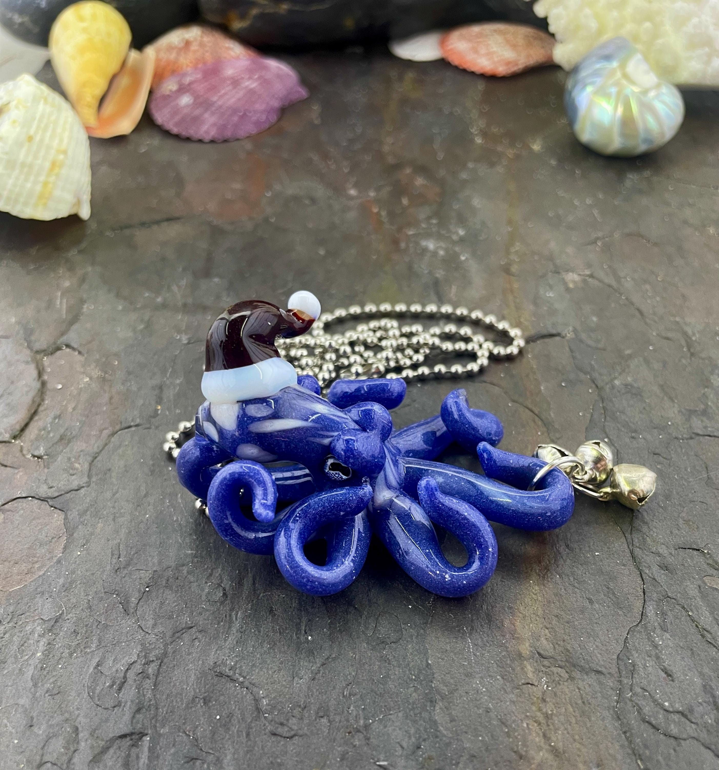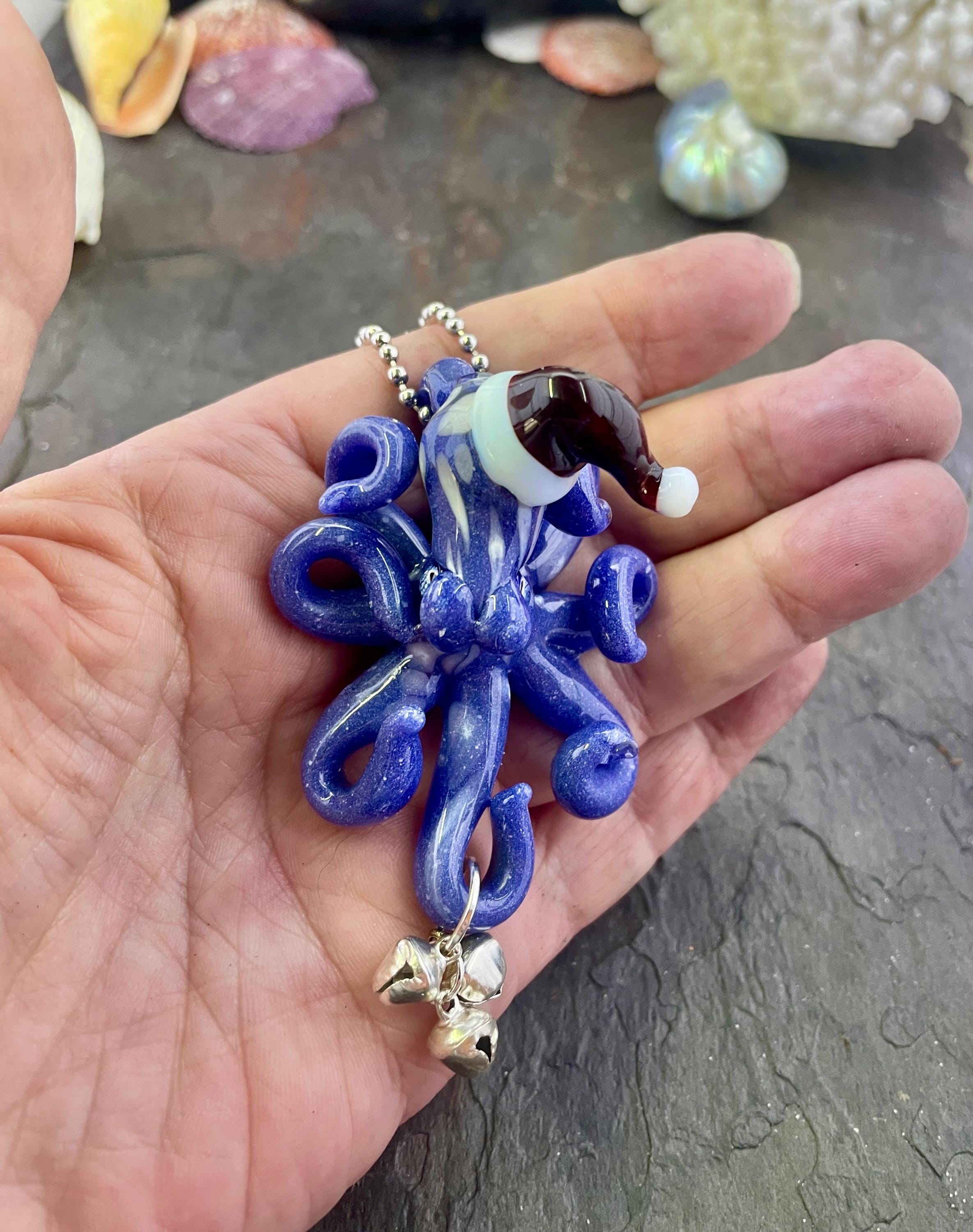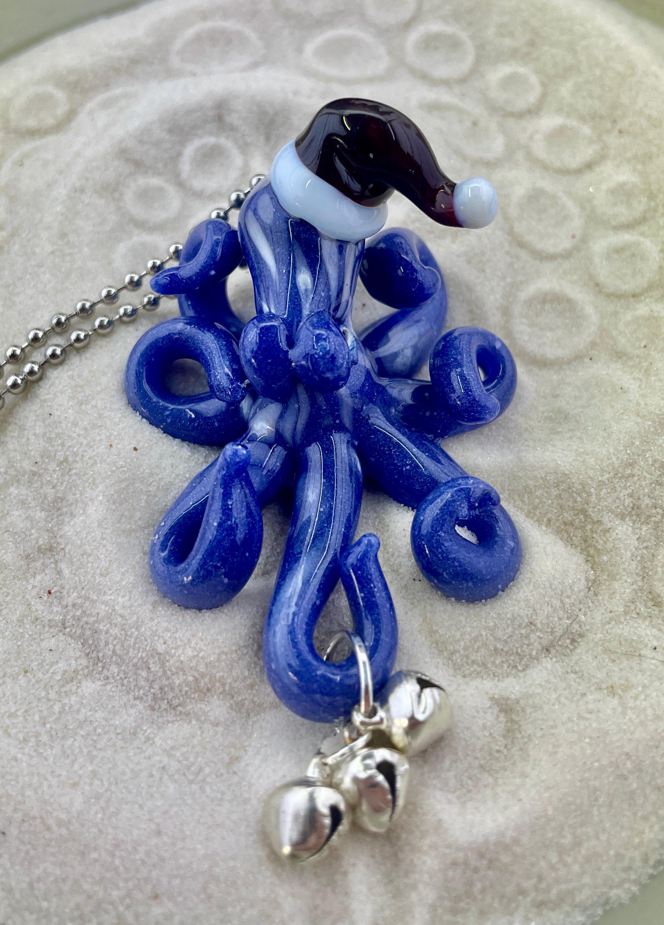 This is the 2024 Annual Christmas Octo-Ornament......a rare Blue Blizzard Octo wearing a festive Santa hat and holding tight to three silver bells! This is the sixth in a series of annual ornaments so don't miss out, they won't be remade in this color next year and only six are available. Handmade glass eye chip gives him such realistic eyes, you'll think he really is keeping track of the gifts under your tree! He comes with a hand made solid silver wire hanger for your tree or ornament holder. He arrives on a silver filled mini ball chain necklace because…who wouldn’t want to wear an octo in a Santa hat?!?!