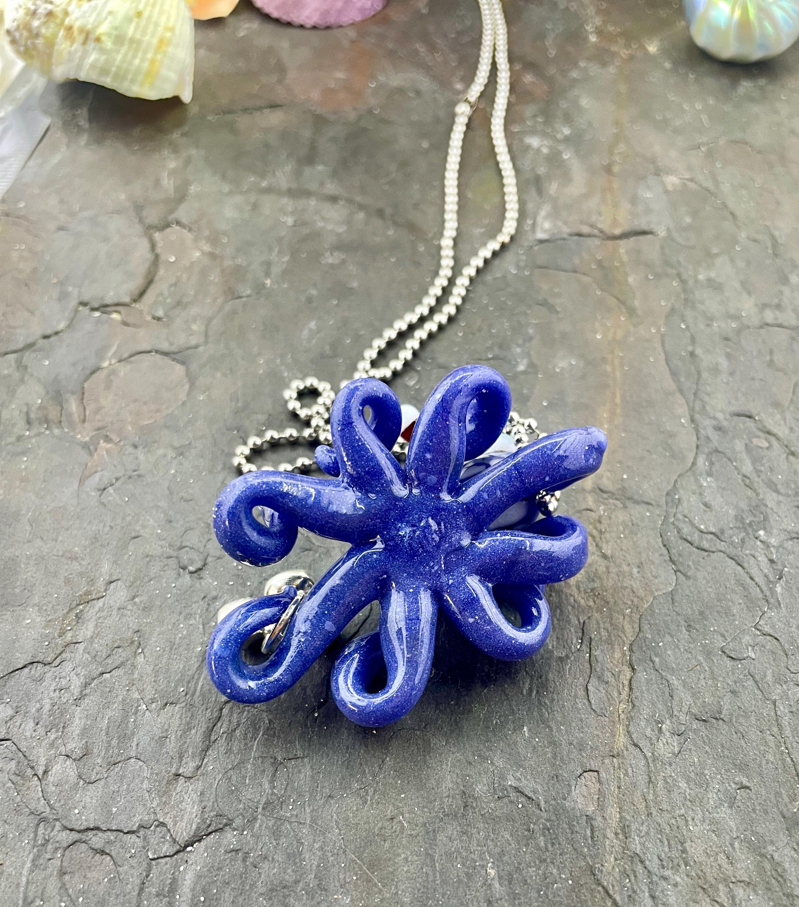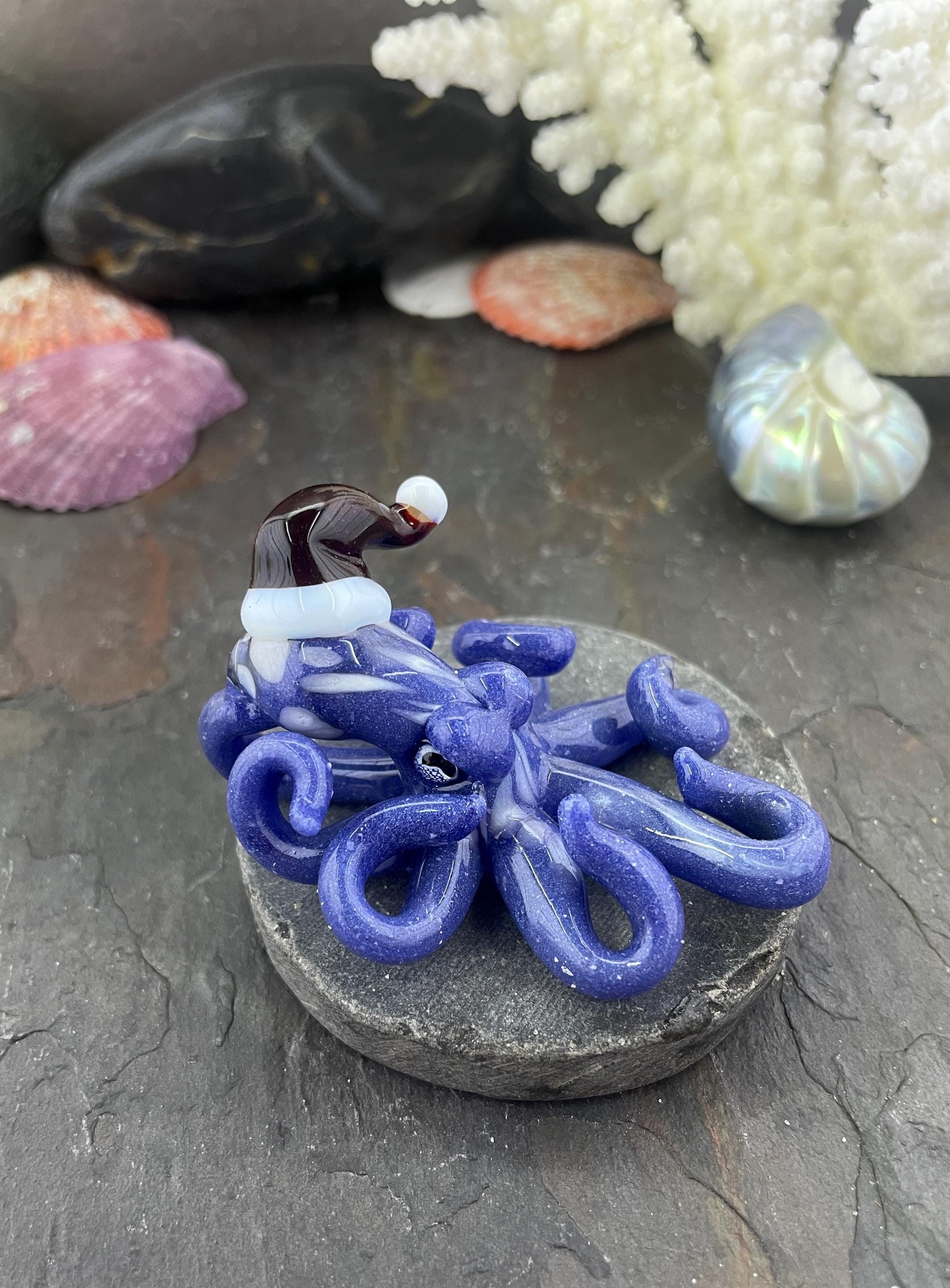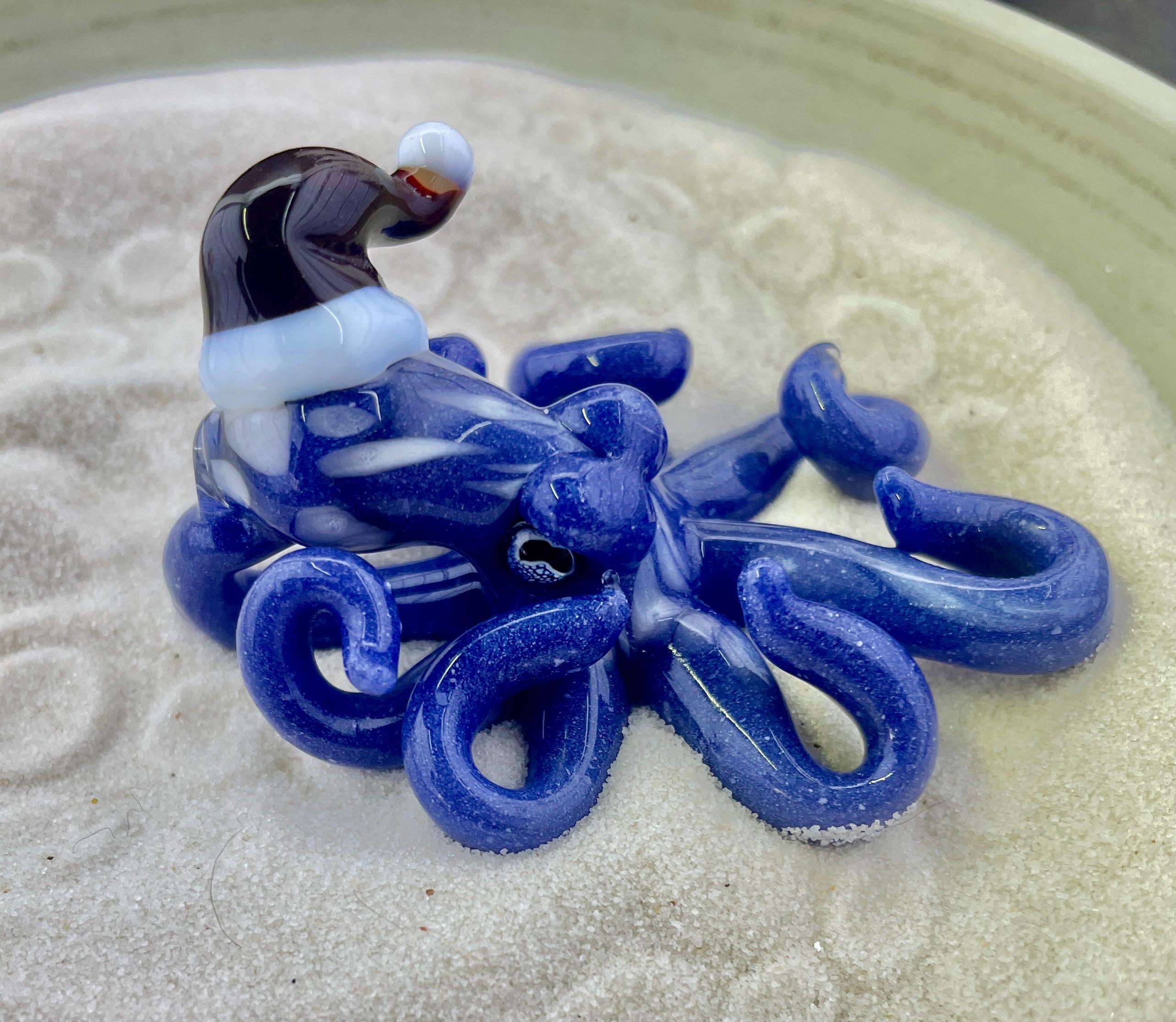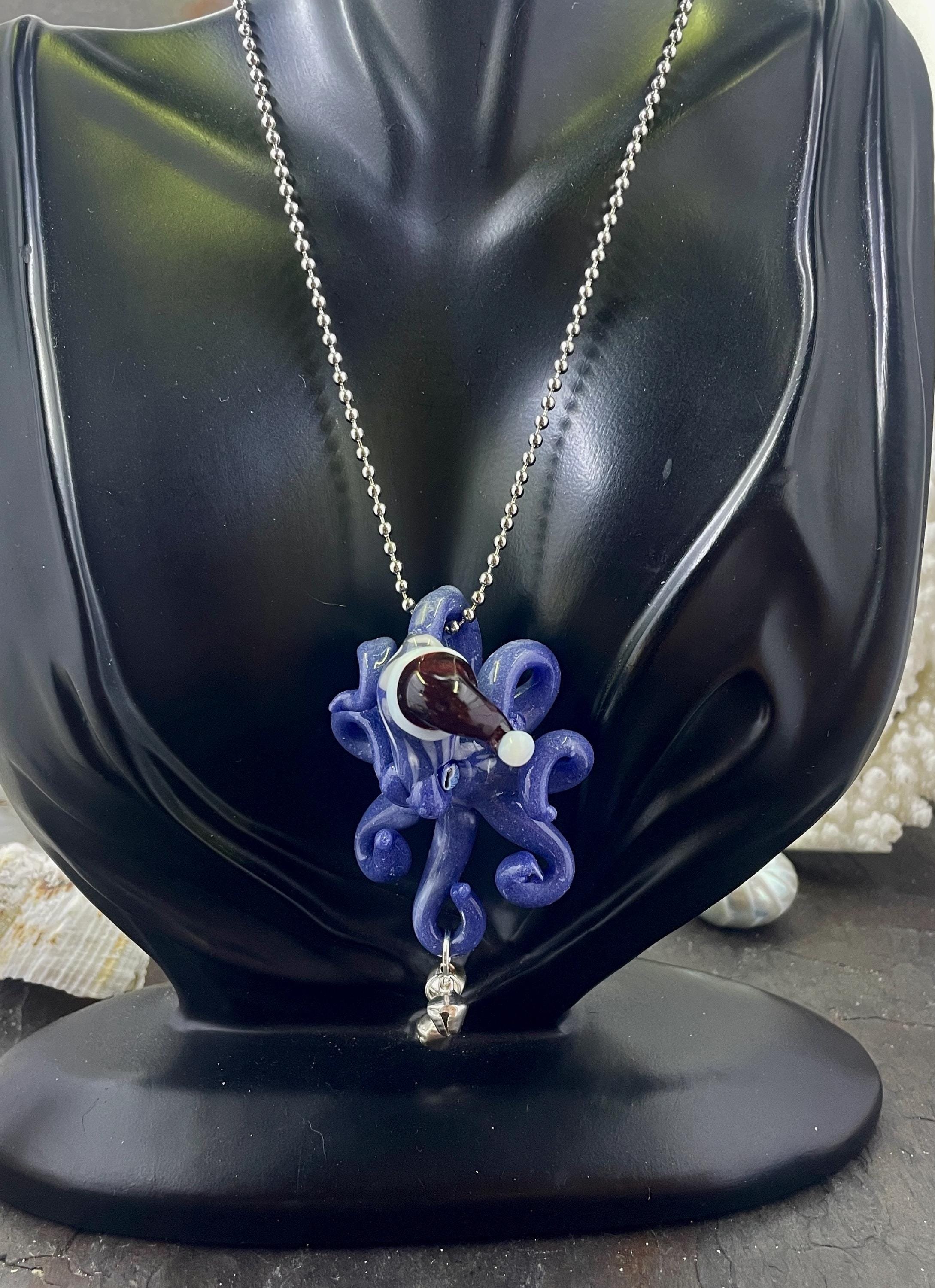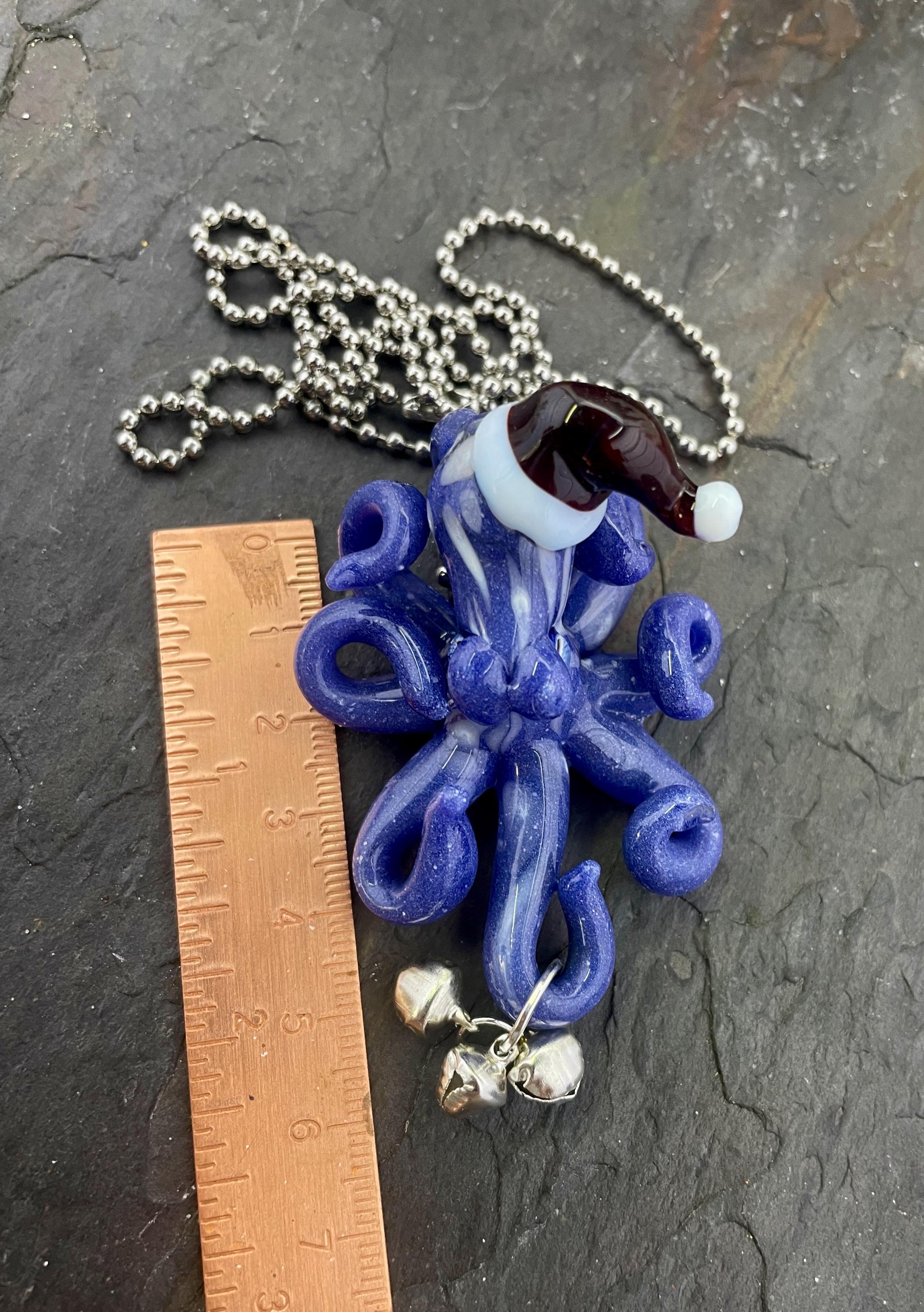 This is the 2024 Annual Christmas Octo-Ornament......a rare Blue Blizzard Octo wearing a festive Santa hat and holding tight to three silver bells! This is the sixth in a series of annual ornaments so don't miss out, they won't be remade in this color next year and only six are available. Handmade glass eye chip gives him such realistic eyes, you'll think he really is keeping track of the gifts under your tree! He comes with a hand made solid silver wire hanger for your tree or ornament holder. He arrives on a silver filled mini ball chain necklace because…who wouldn’t want to wear an octo in a Santa hat?!?!