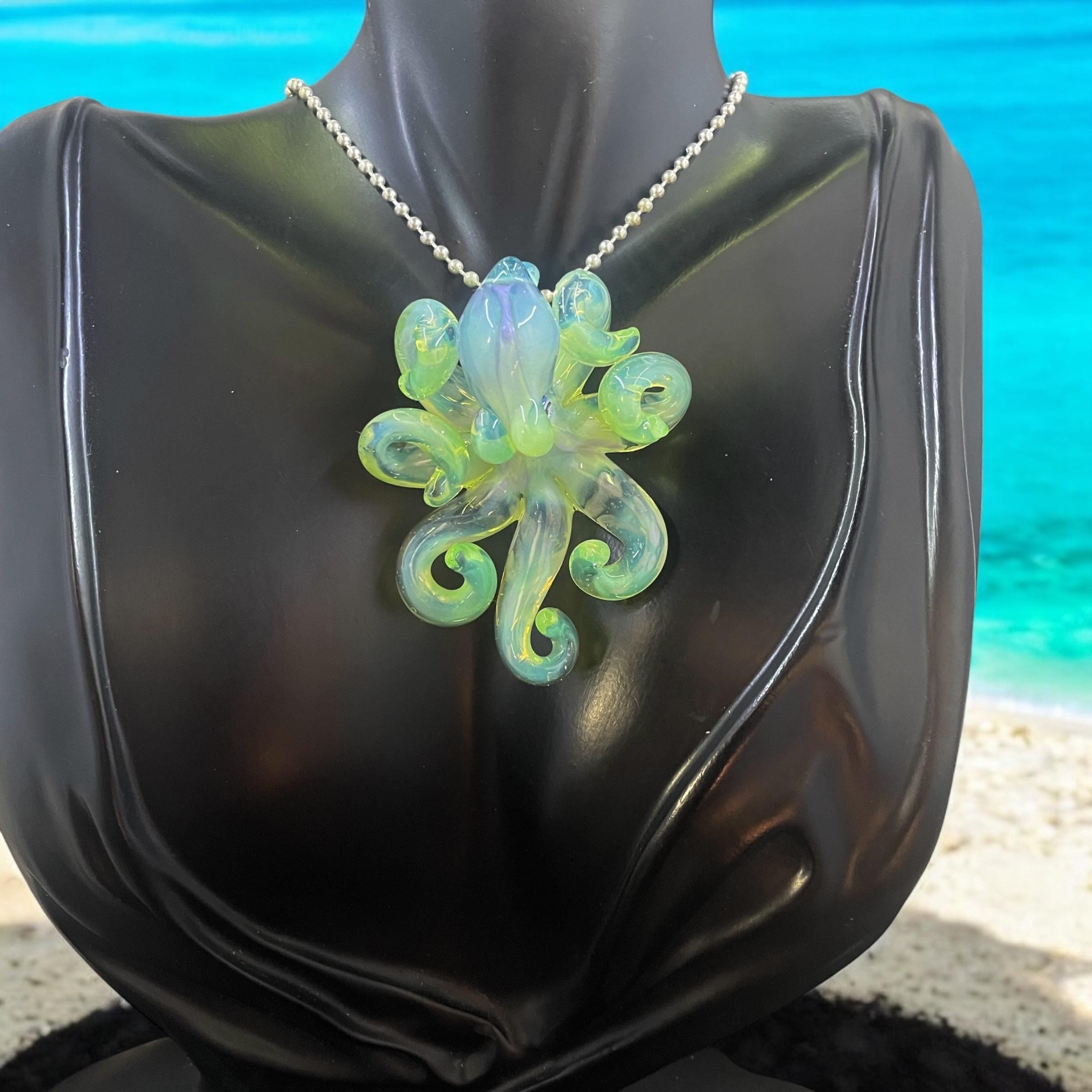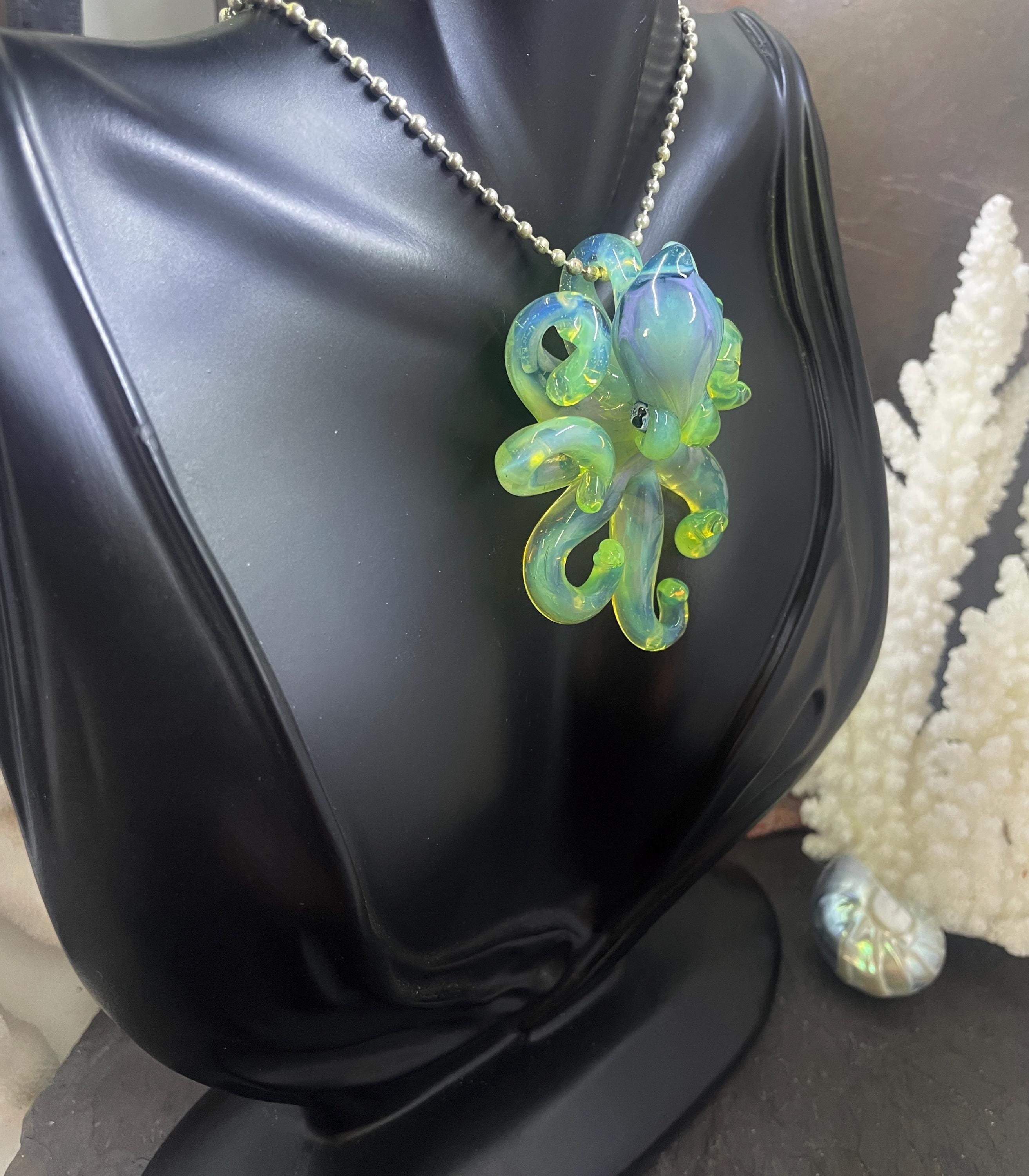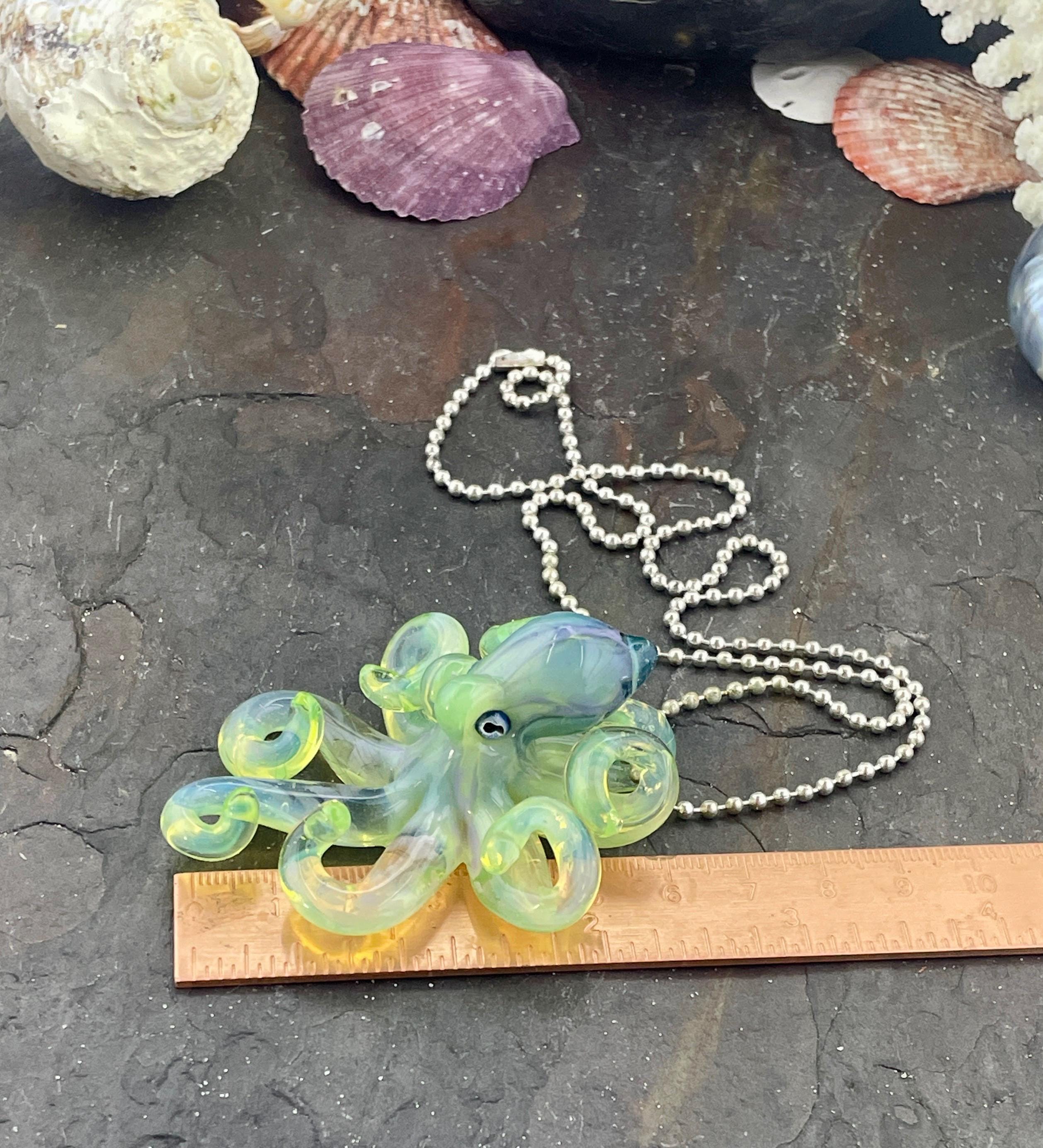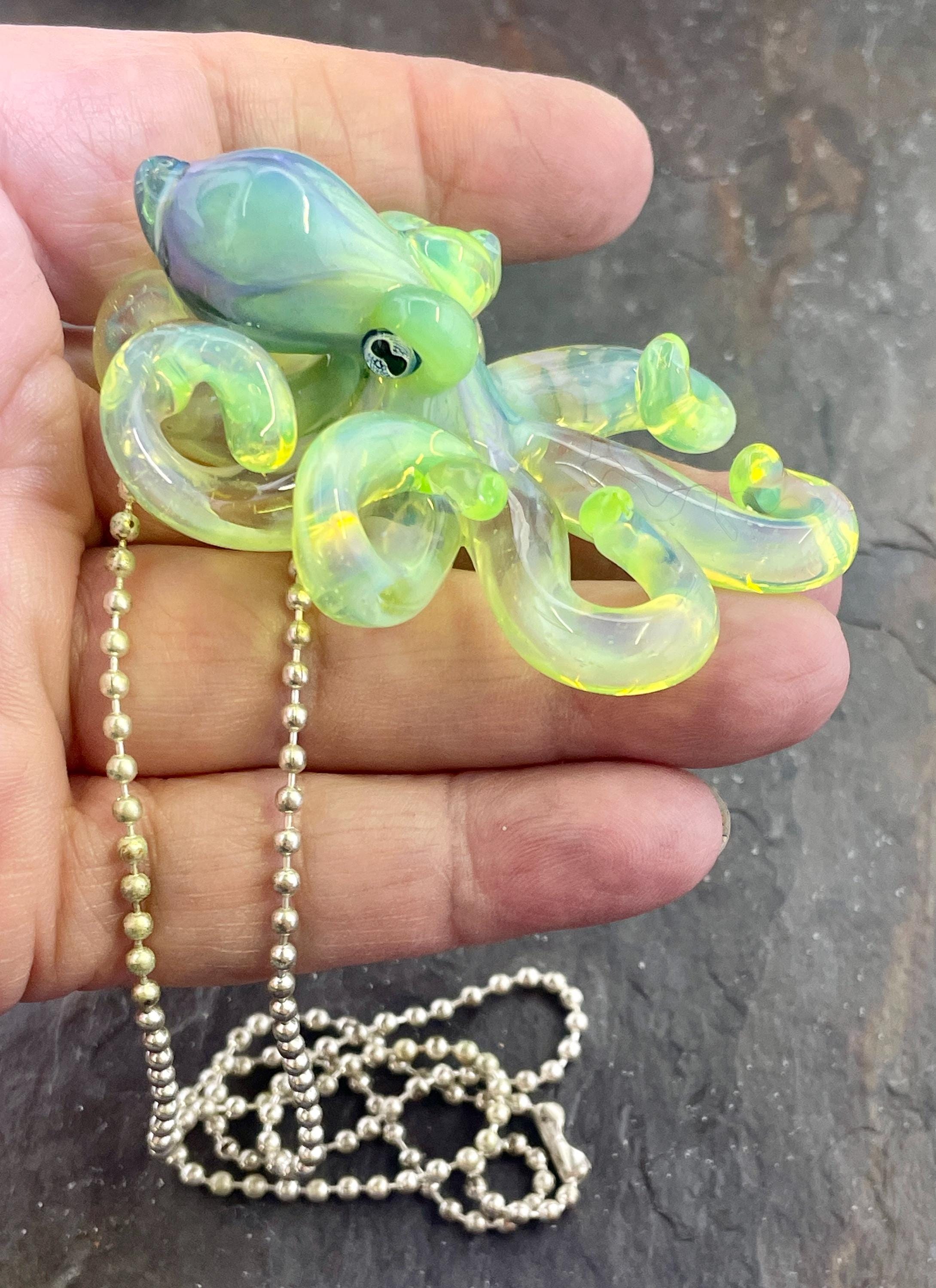 Another boro octopus glass necklace, this is the Yitai Green Moonlight. A nice size at 2.5" long, formed in the torch using no molds and properly annealed in a digital kiln for durability, this one arrives safely wrapped and attached to a silver filled mini ball chain necklace. . Handmade glass eye chip gives her such realistic eyes, you might want to keep her on her rope, just in case! Really fun and safe to wear, for a truly dramatic look! Marked on the bottom with the Maker's Mark "M" while still molten..