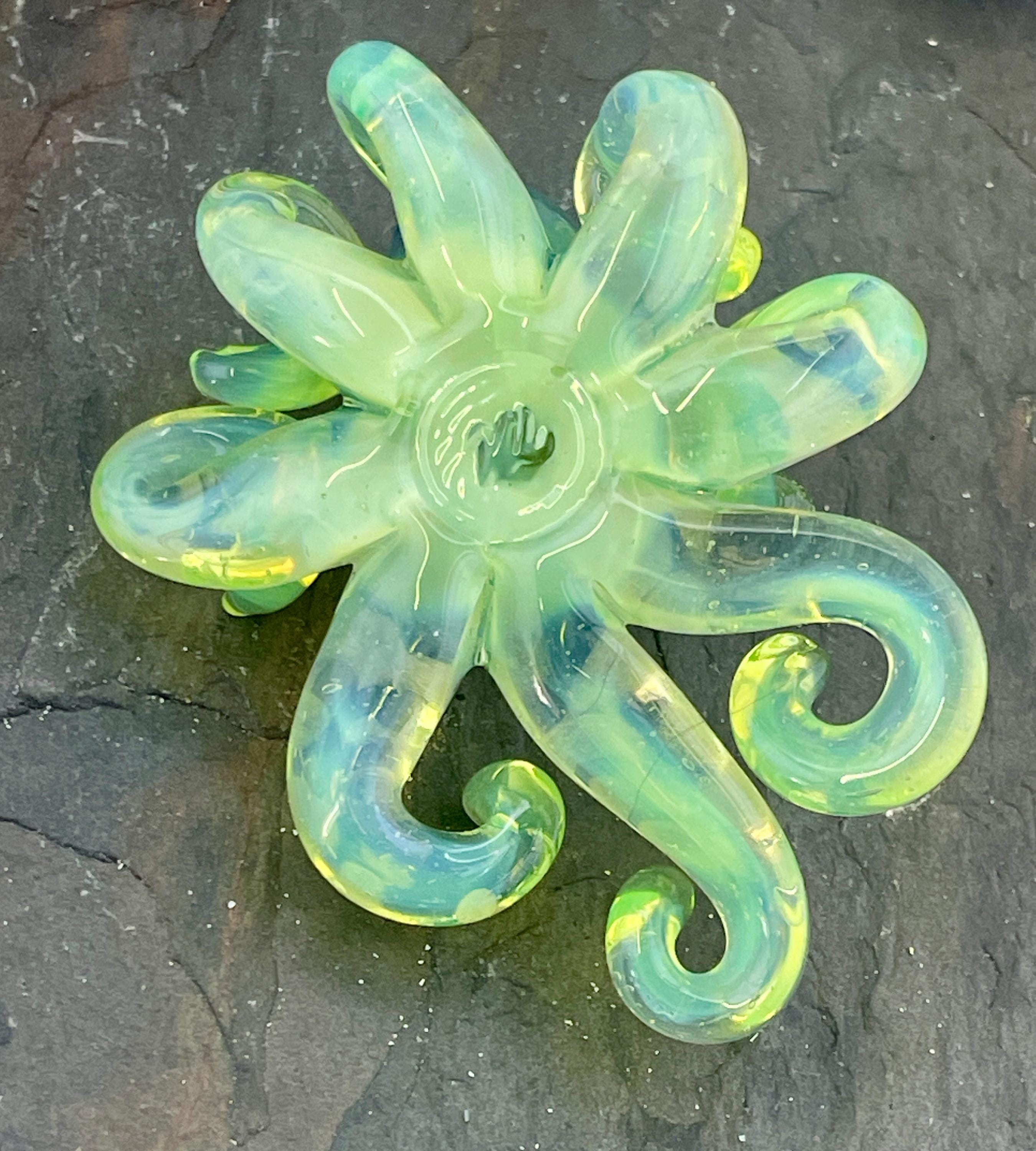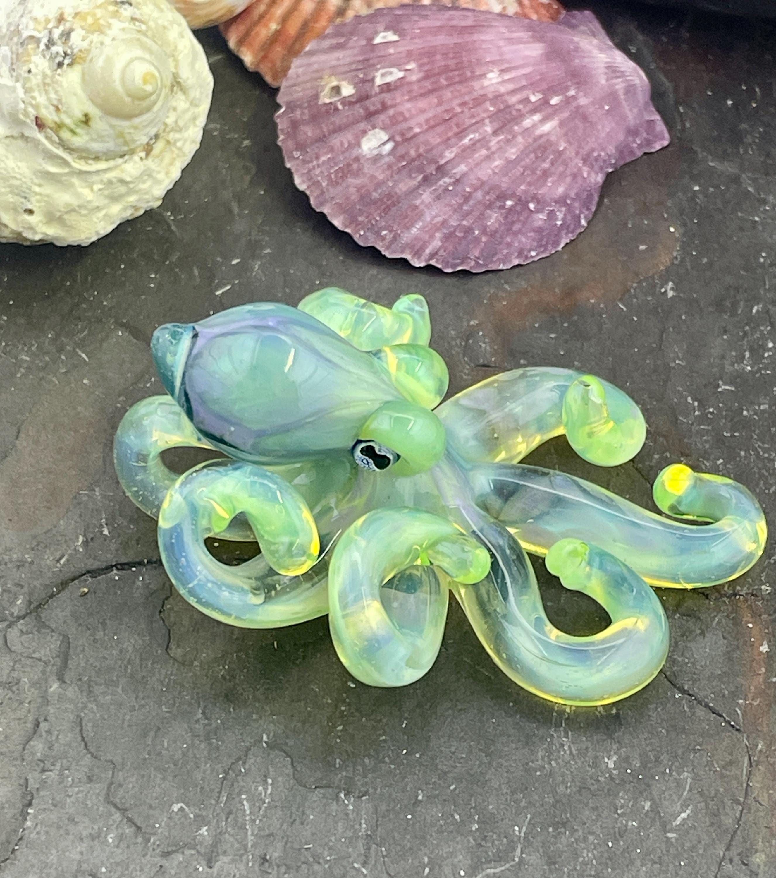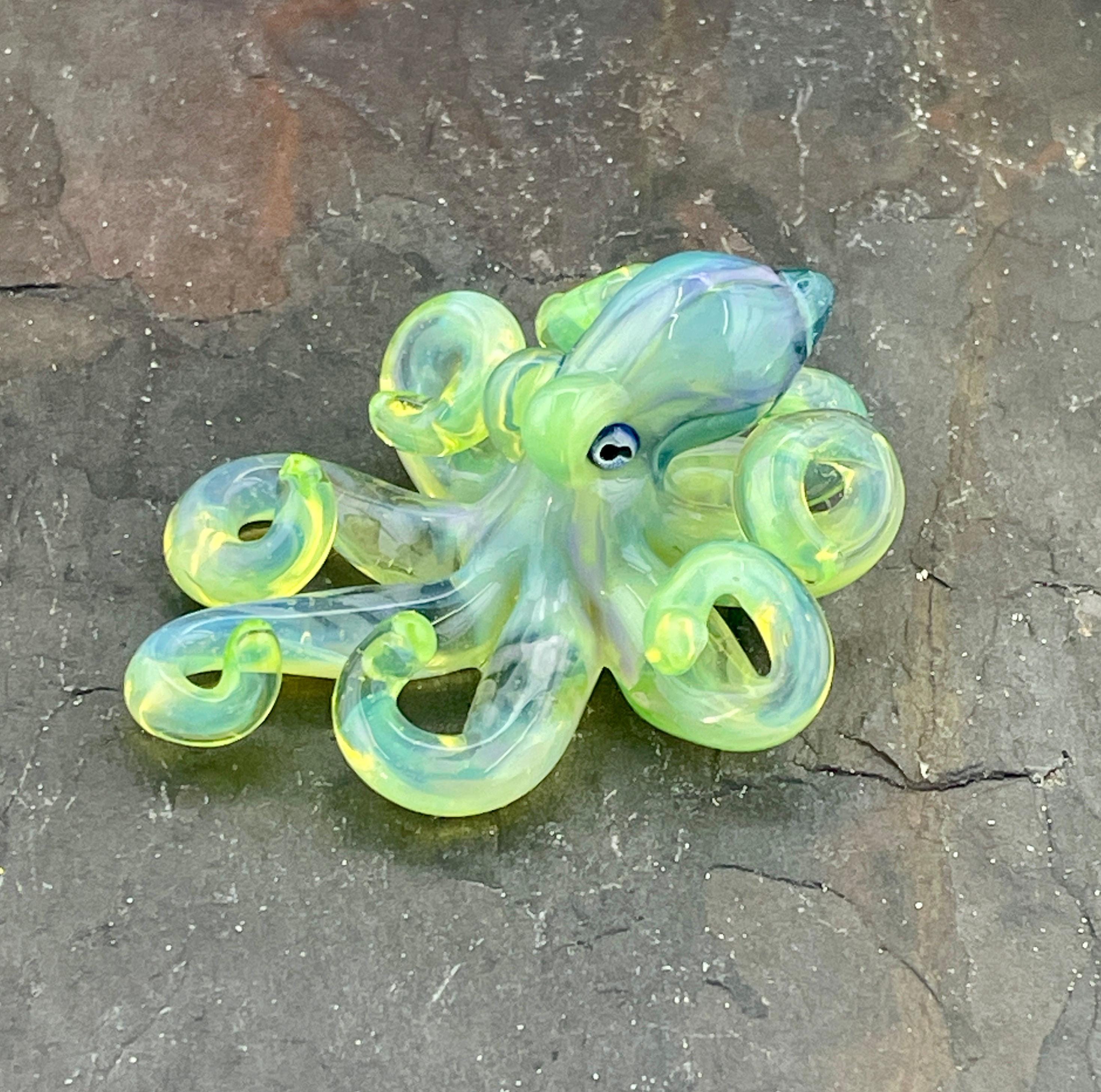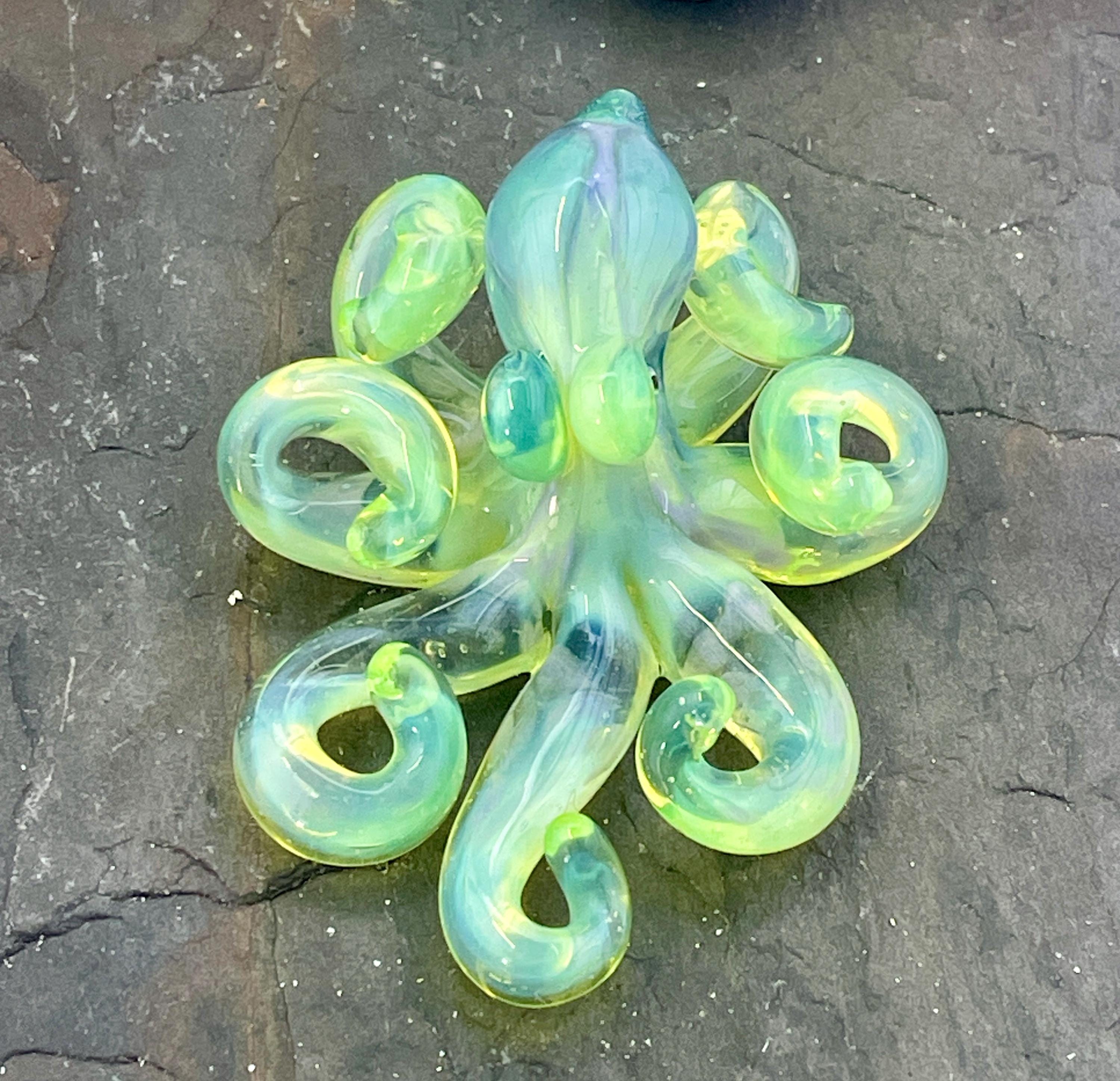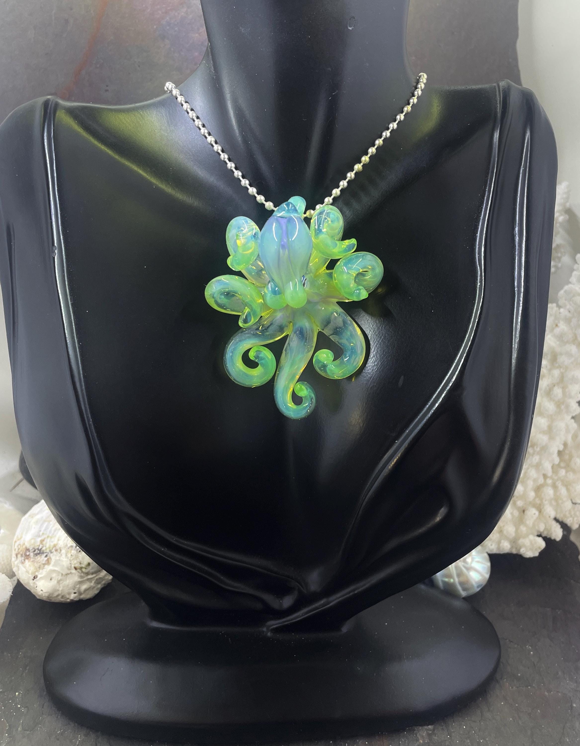 Another boro octopus glass necklace, this is the Yitai Green Moonlight. A nice size at 2.5" long, formed in the torch using no molds and properly annealed in a digital kiln for durability, this one arrives safely wrapped and attached to a silver filled mini ball chain necklace. . Handmade glass eye chip gives her such realistic eyes, you might want to keep her on her rope, just in case! Really fun and safe to wear, for a truly dramatic look! Marked on the bottom with the Maker's Mark "M" while still molten..