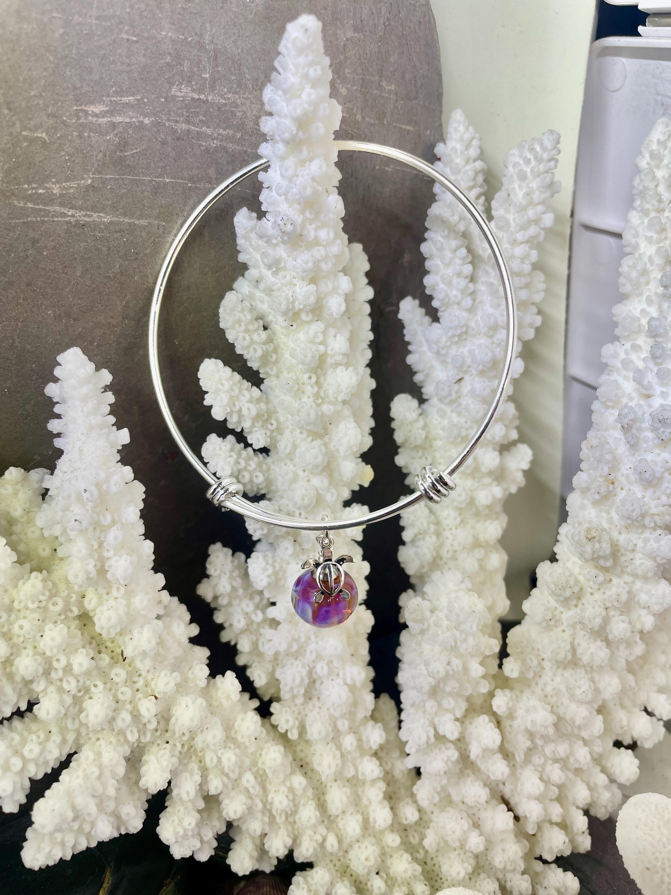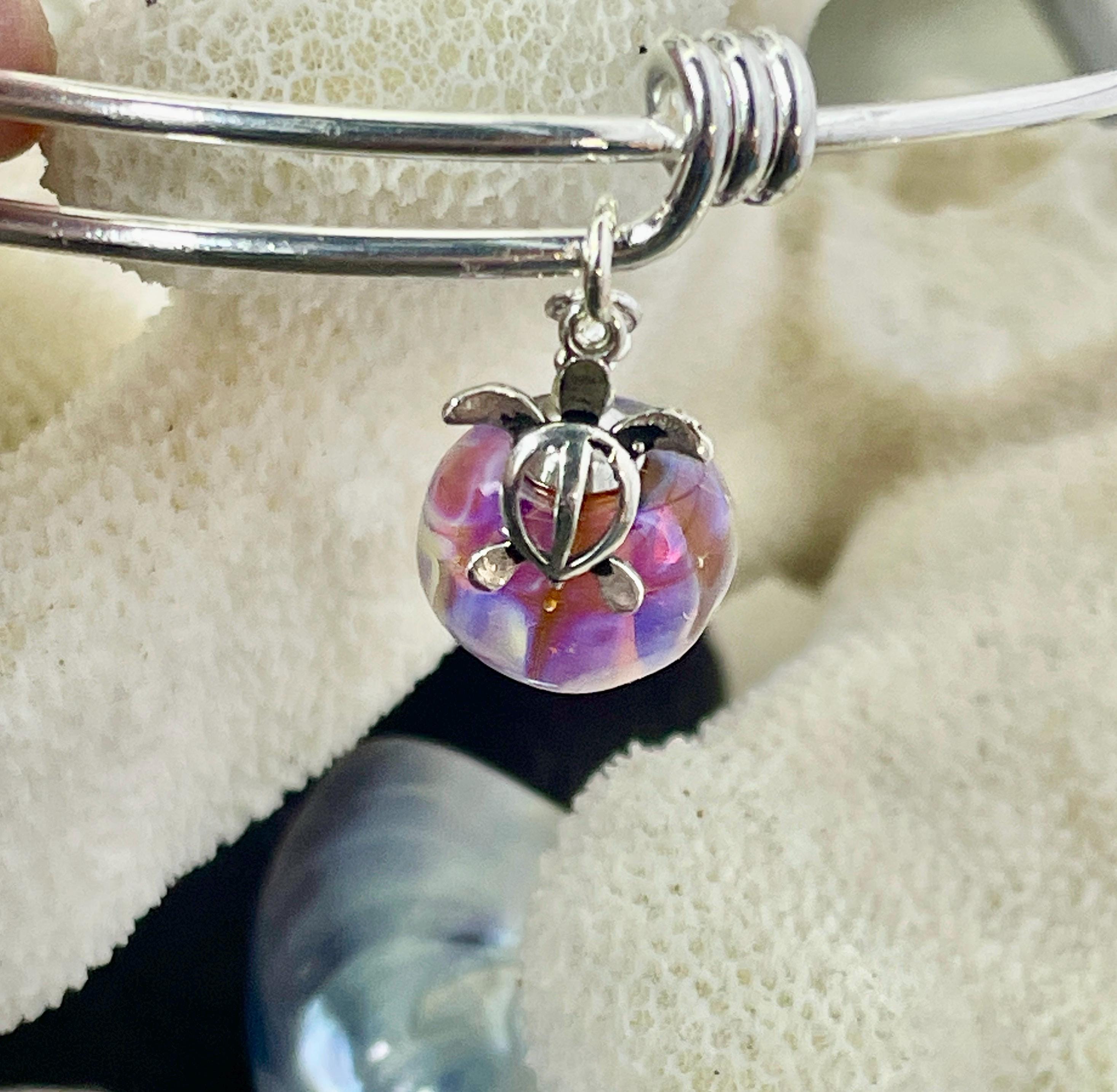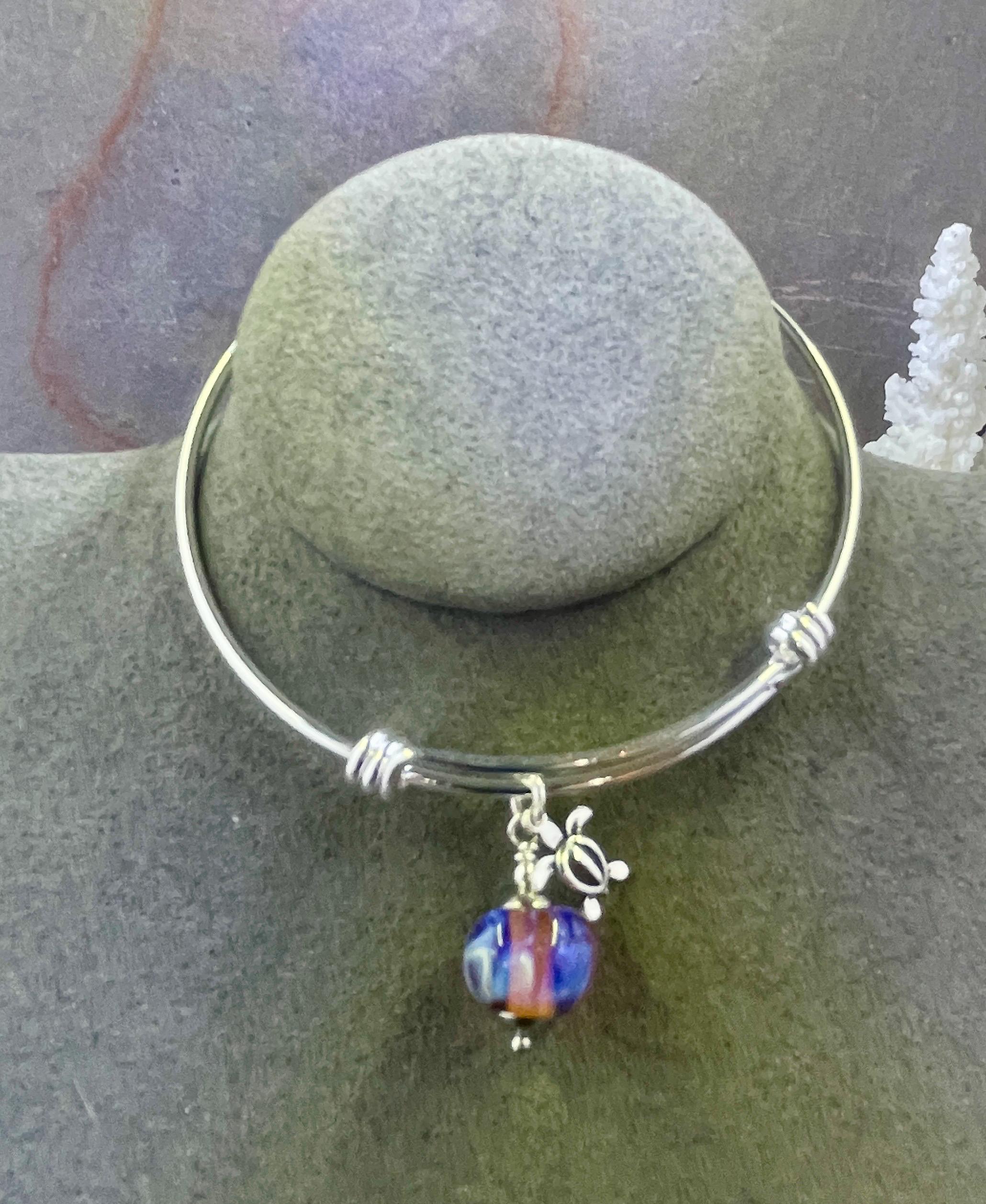 Handmade made silver glass Clio bead with a sterling silver sea turtle charm on a fun slip over style of sterling bracelet. . This one can go from camping to the fancy dinner without miss a beat. Fits just about any wrist, easy to put on but it really stays put.
