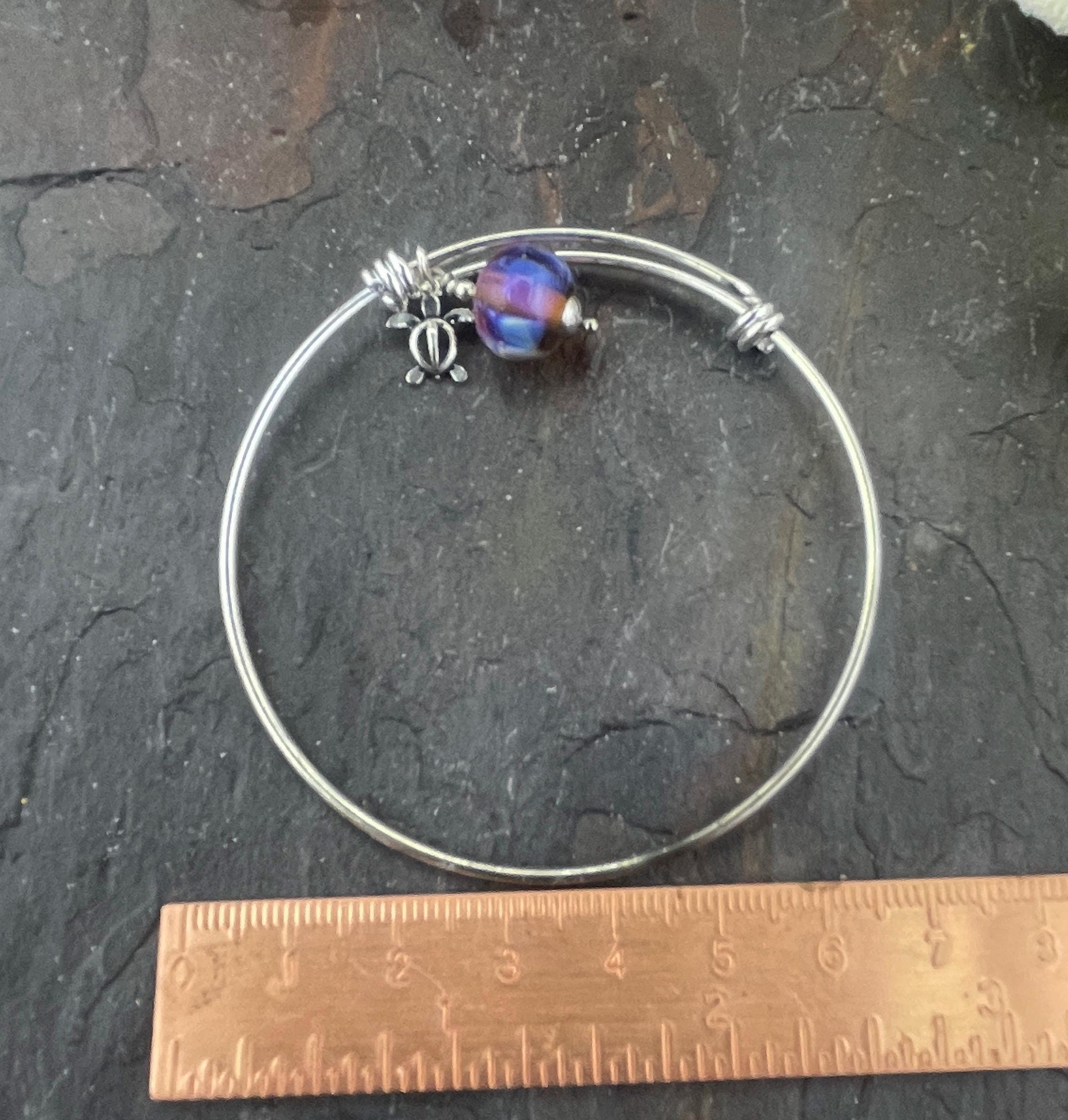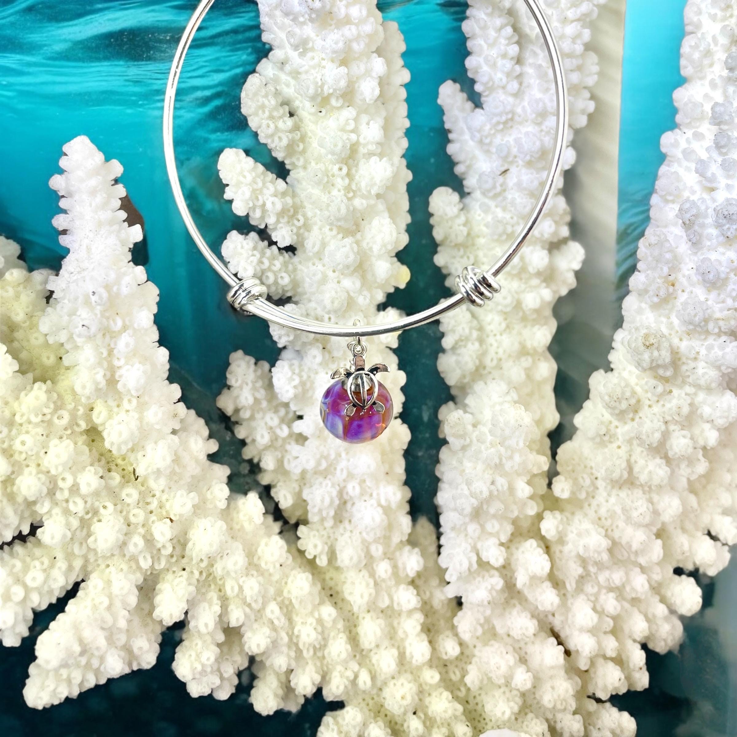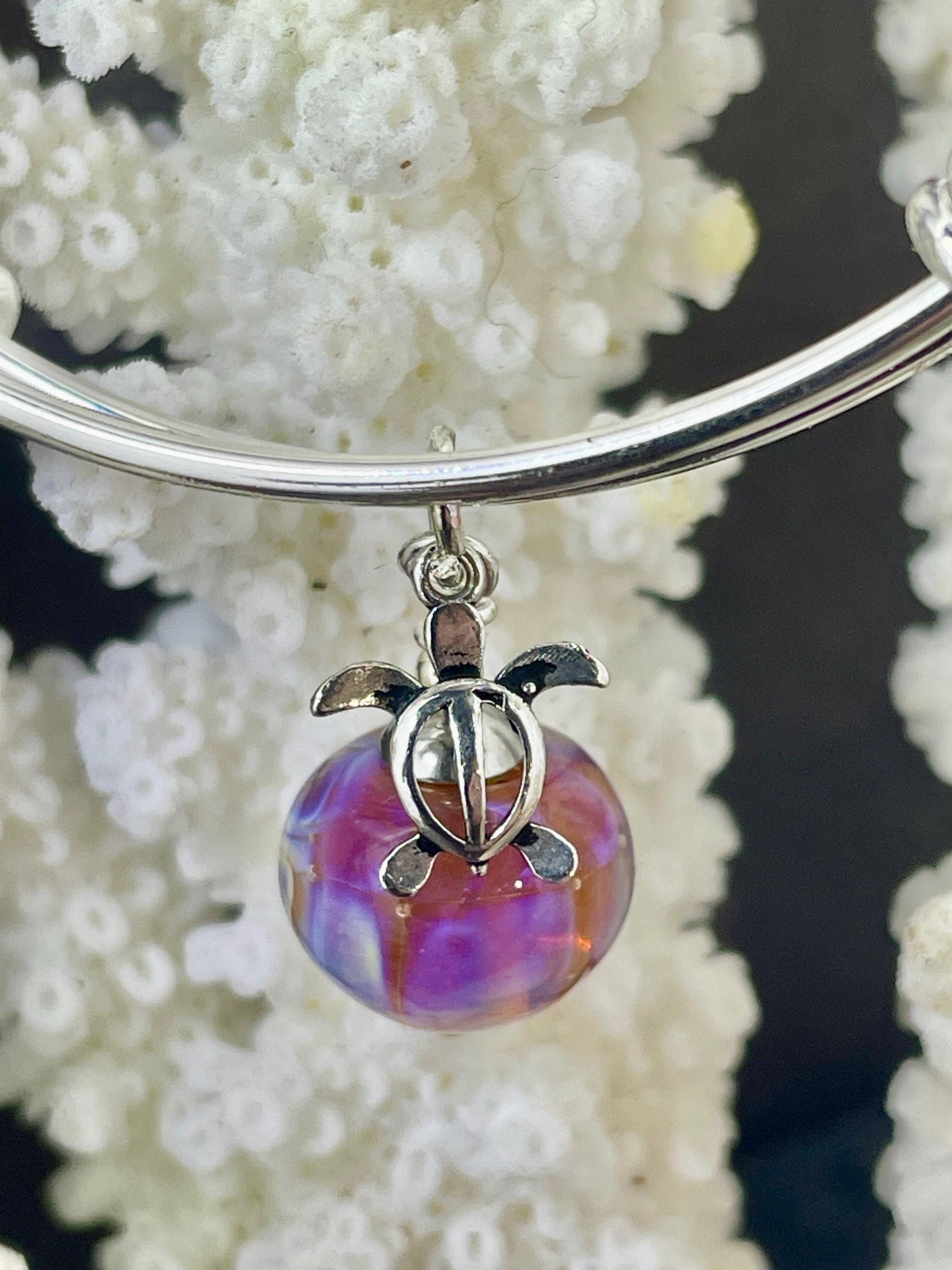 Handmade made silver glass Clio bead with a sterling silver sea turtle charm on a fun slip over style of sterling bracelet. . This one can go from camping to the fancy dinner without miss a beat. Fits just about any wrist, easy to put on but it really stays put.
