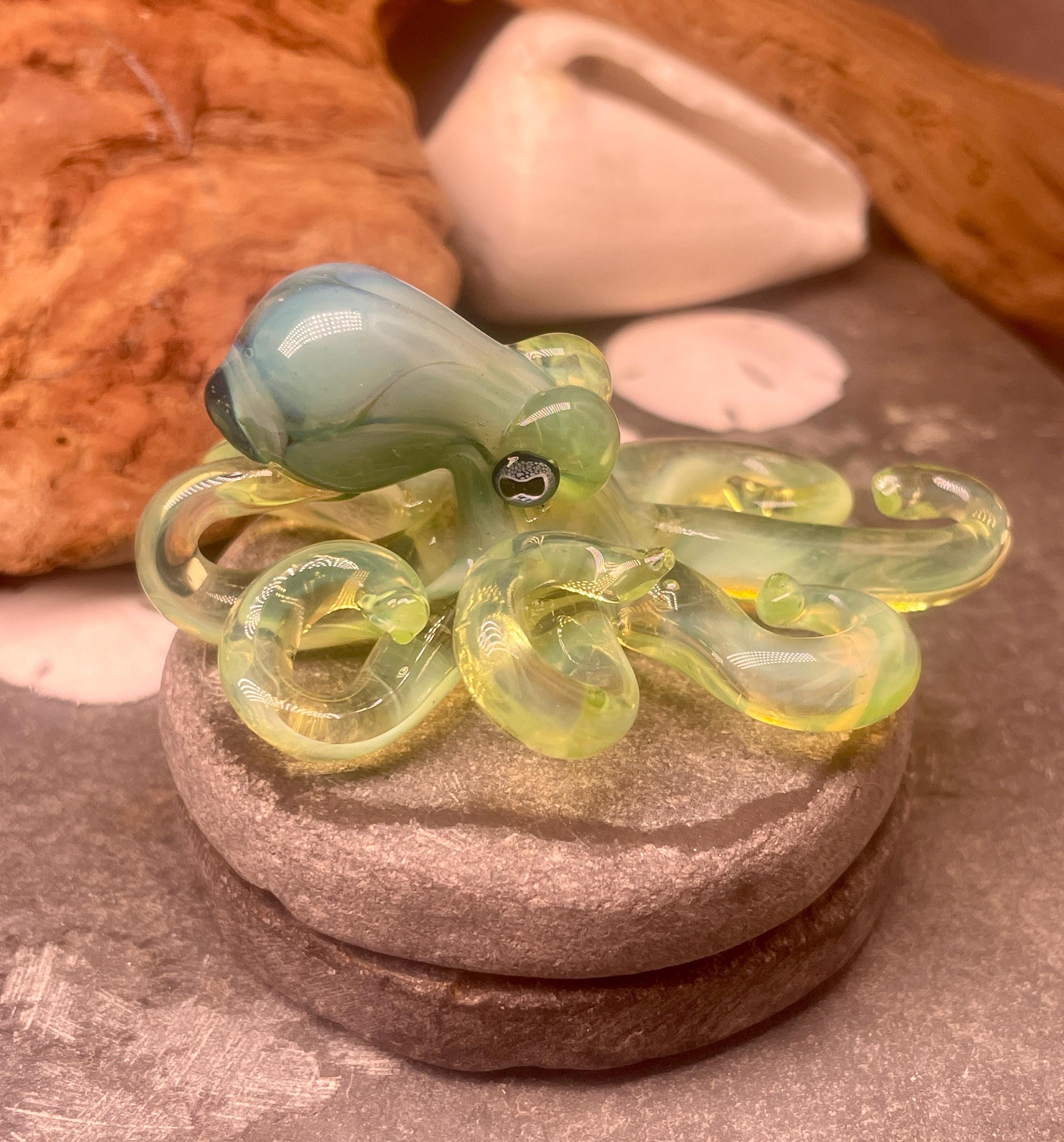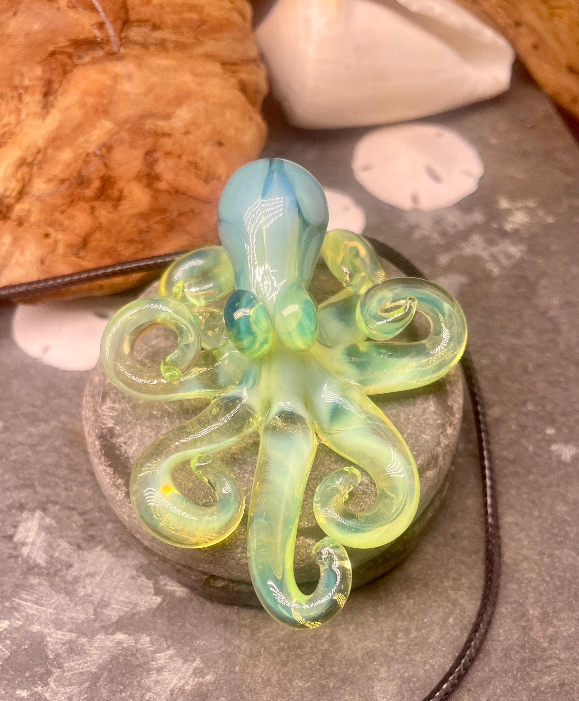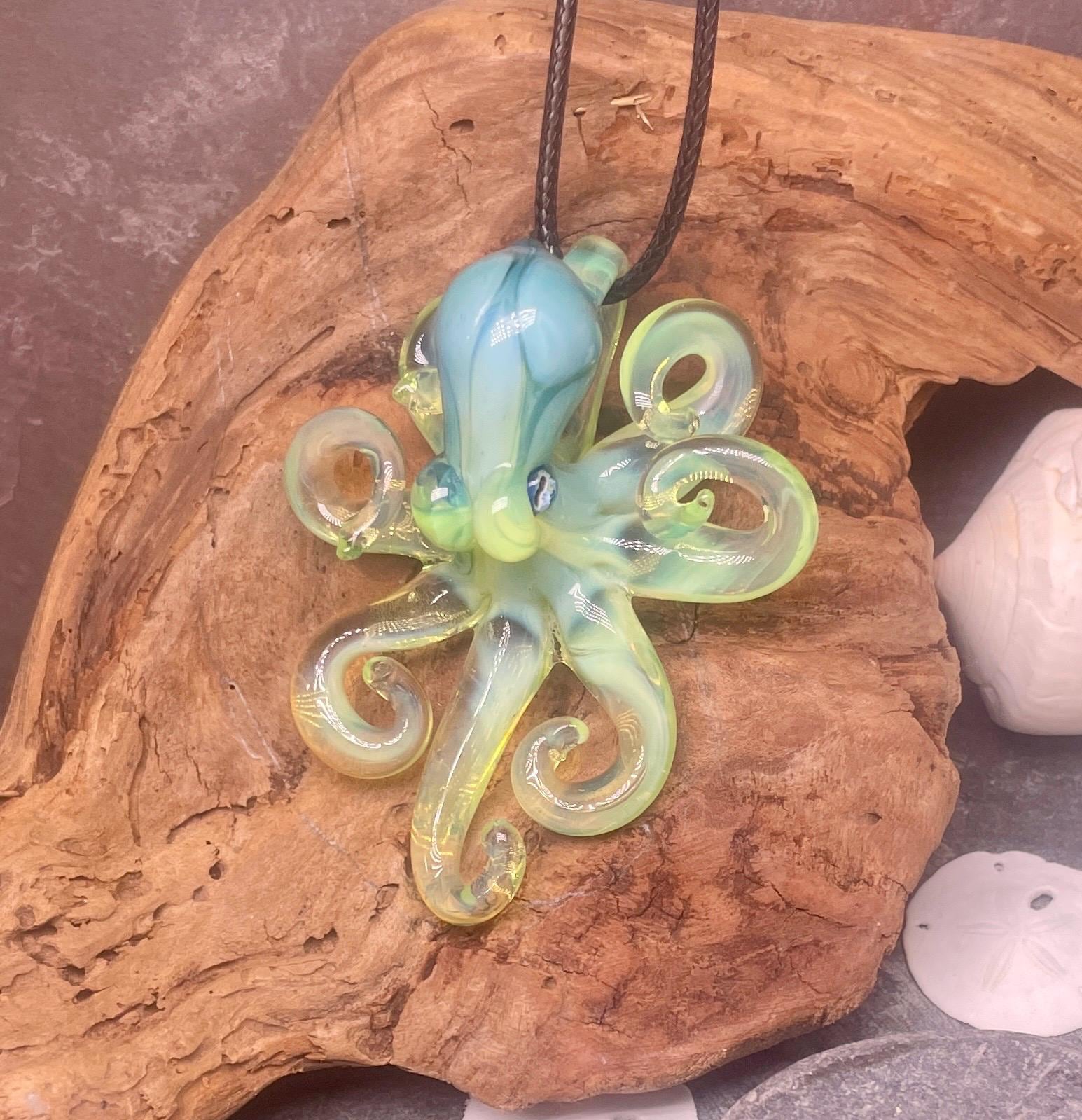 The Opal Yellow Octo....another fun pendant made with the beautiful Yellow Opal by Greasy Glass. The beautiful yellow body with aqua green mantle markings is such a great addition for springtime. Approx 2.5" long, formed in the torch and properly annealed in a digital kiln for durability, this one arrives safely wrapped attached to a 2mm adjustable black silk cord. Handmade glass eye chip gives him such realistic eyes, you might want to keep him on his rope, just in case! Really fun and safe to wear, for a truly dramatic look!