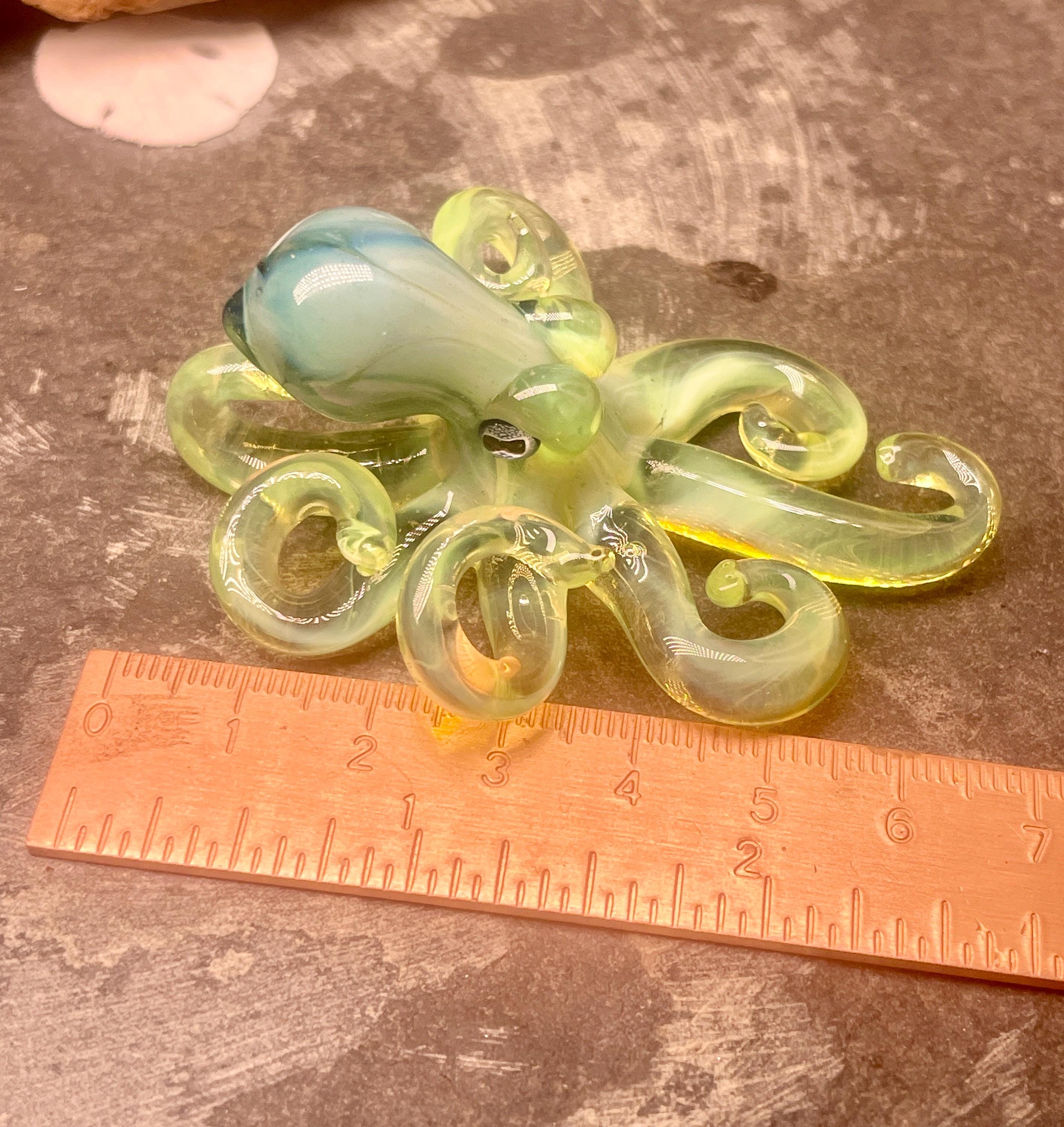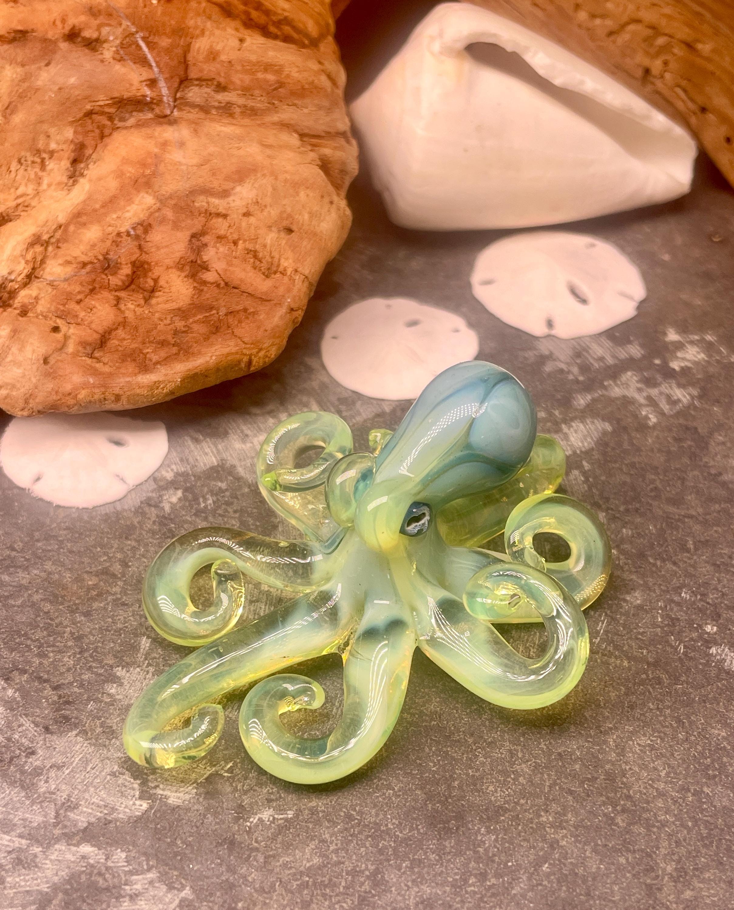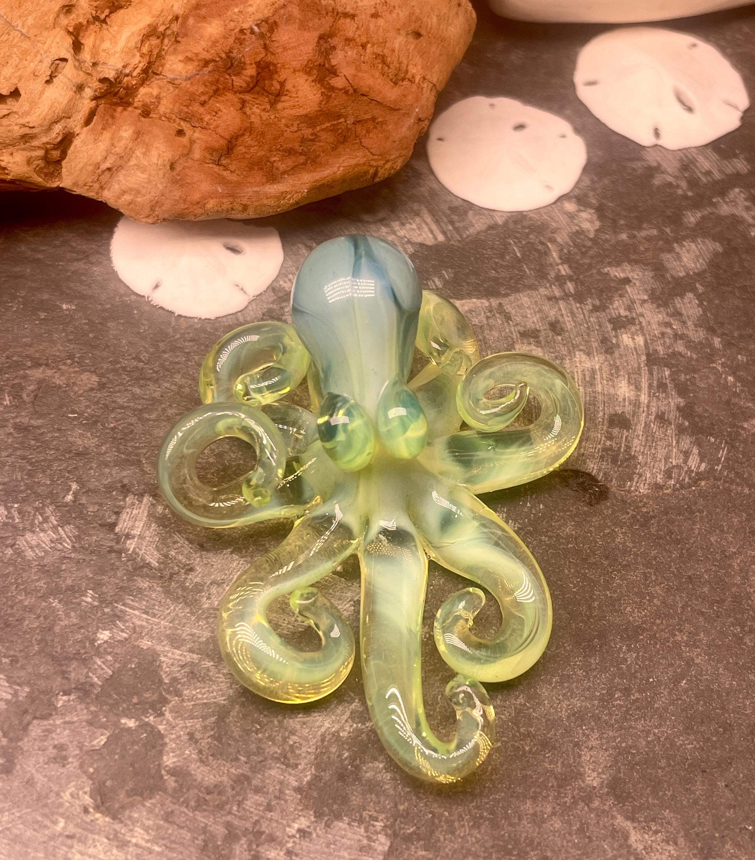 The Opal Yellow Octo....another fun pendant made with the beautiful Yellow Opal by Greasy Glass. The beautiful yellow body with aqua green mantle markings is such a great addition for springtime. Approx 2.5" long, formed in the torch and properly annealed in a digital kiln for durability, this one arrives safely wrapped attached to a 2mm adjustable black silk cord. Handmade glass eye chip gives him such realistic eyes, you might want to keep him on his rope, just in case! Really fun and safe to wear, for a truly dramatic look!