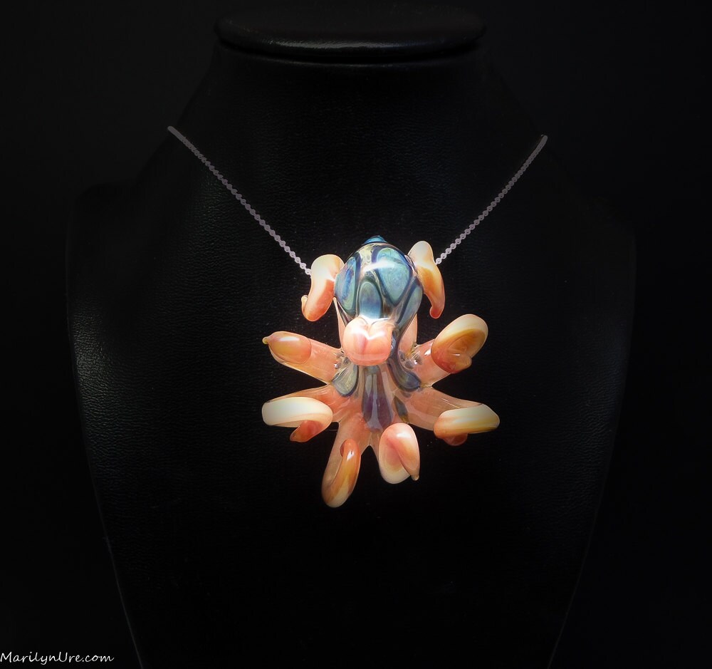 This is the Morning Sunrise Kracken, made with a glass called Tequila Blush which is made in small batches by hand. All the colors of a morning sunrise in an approaching storm. Approx 2.25" across, formed in the torch and properly annealed in a digital kiln for durability, this one arrives safely wrapped attached to a silver mini ball chain necklace, ready to give or keep. Handmade glass eye chip gives him such realistic eyes, you might want to keep him on his chain, just in case! Really fun and safe to wear, for a truly dramatic look!