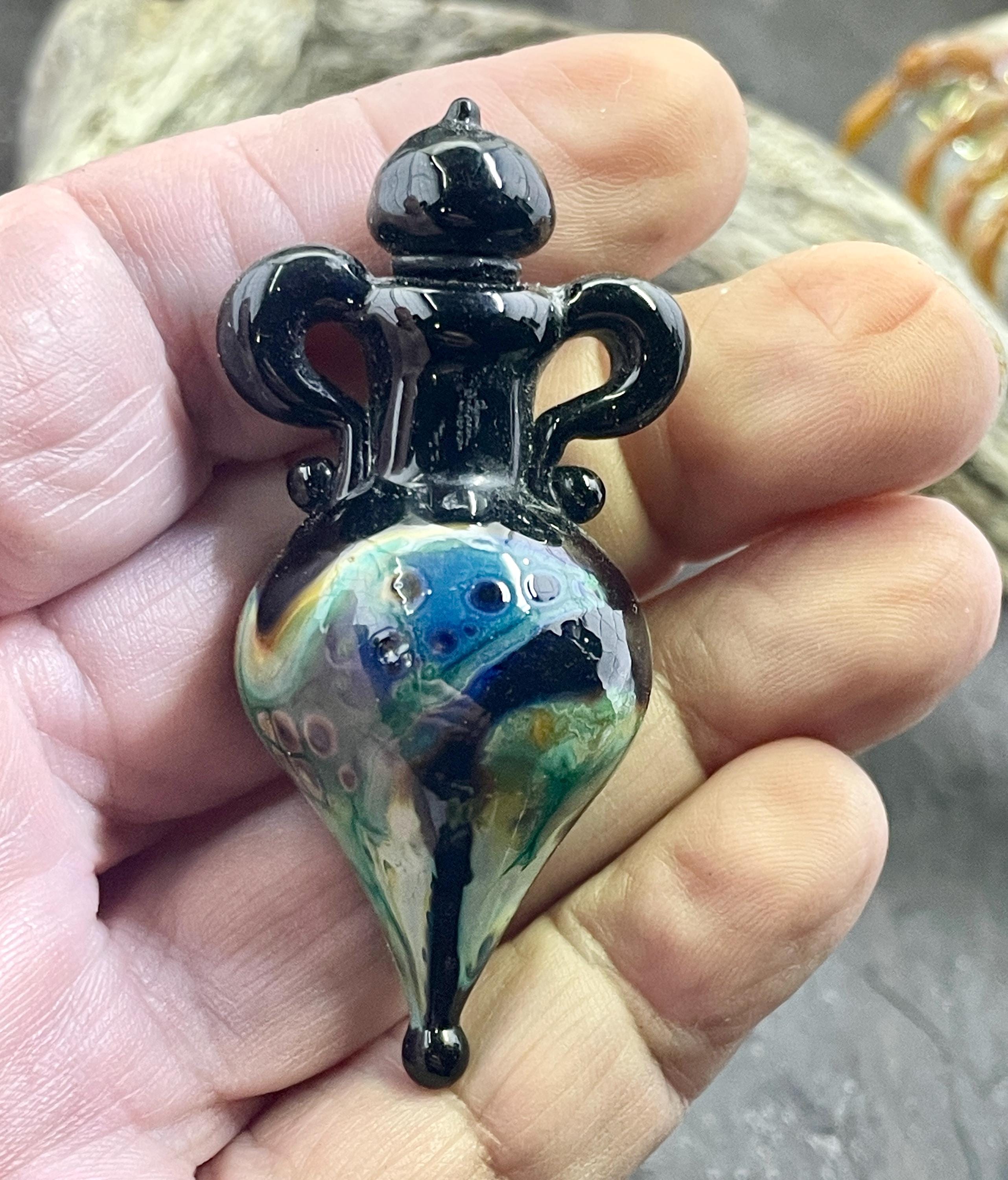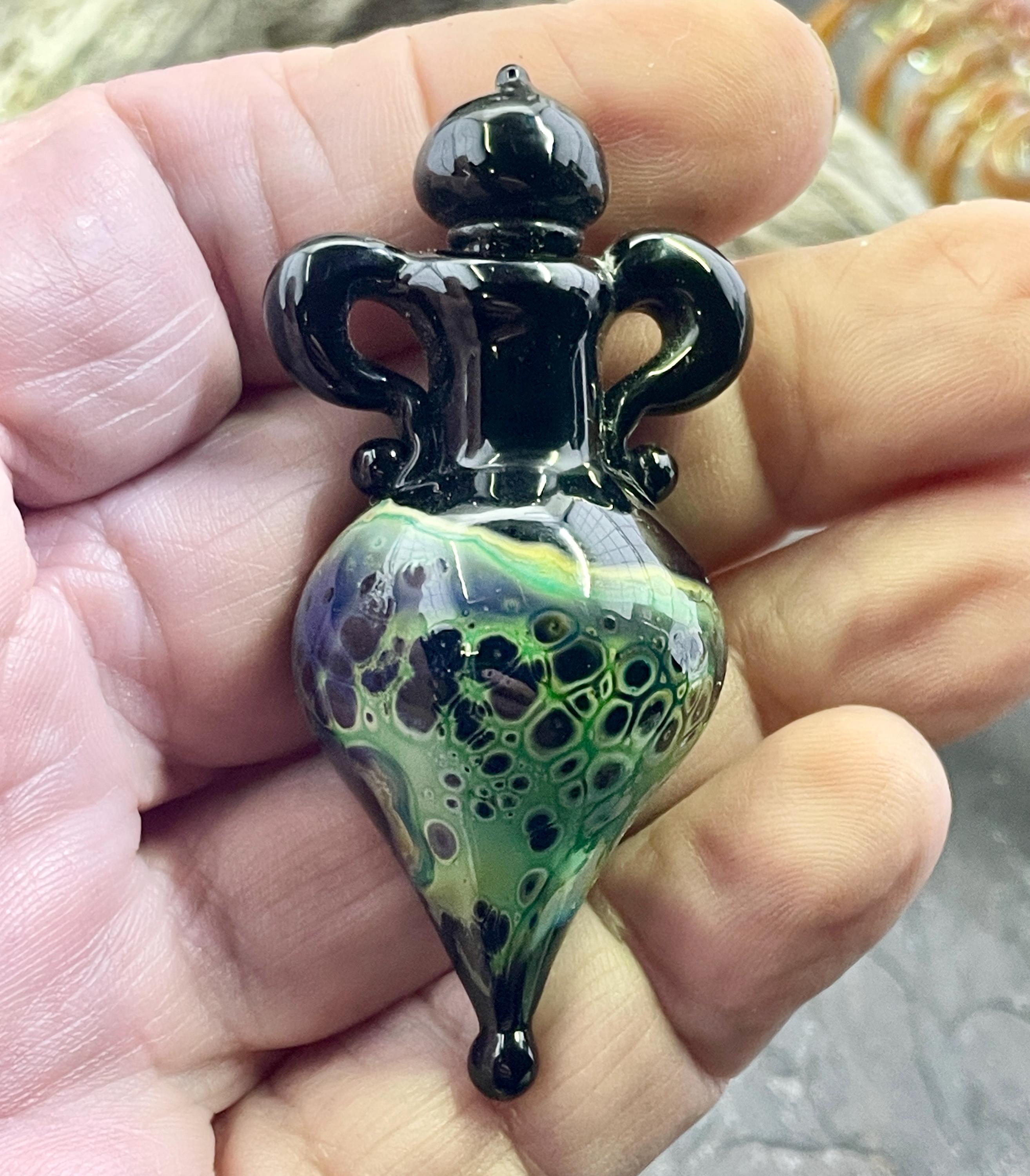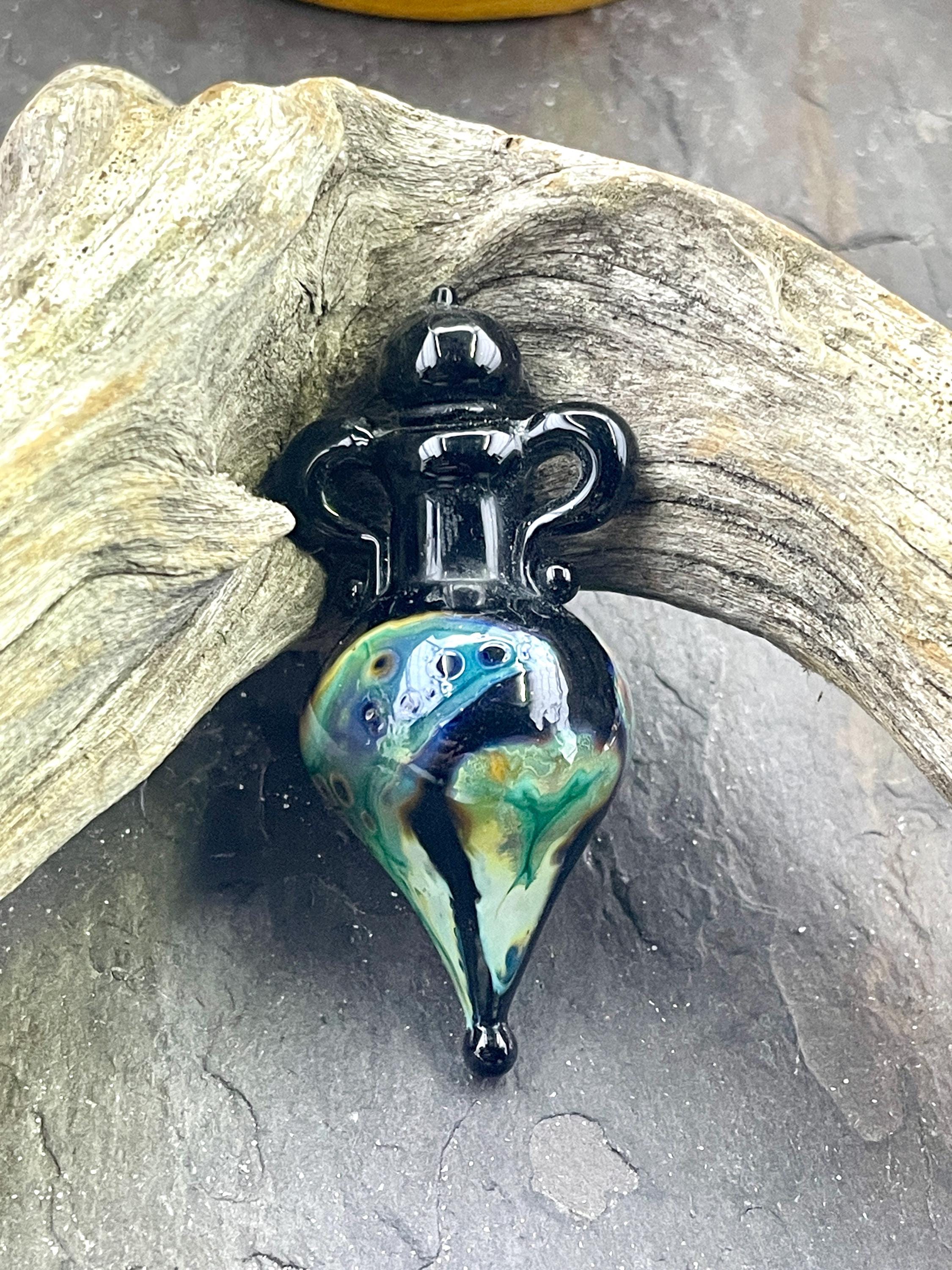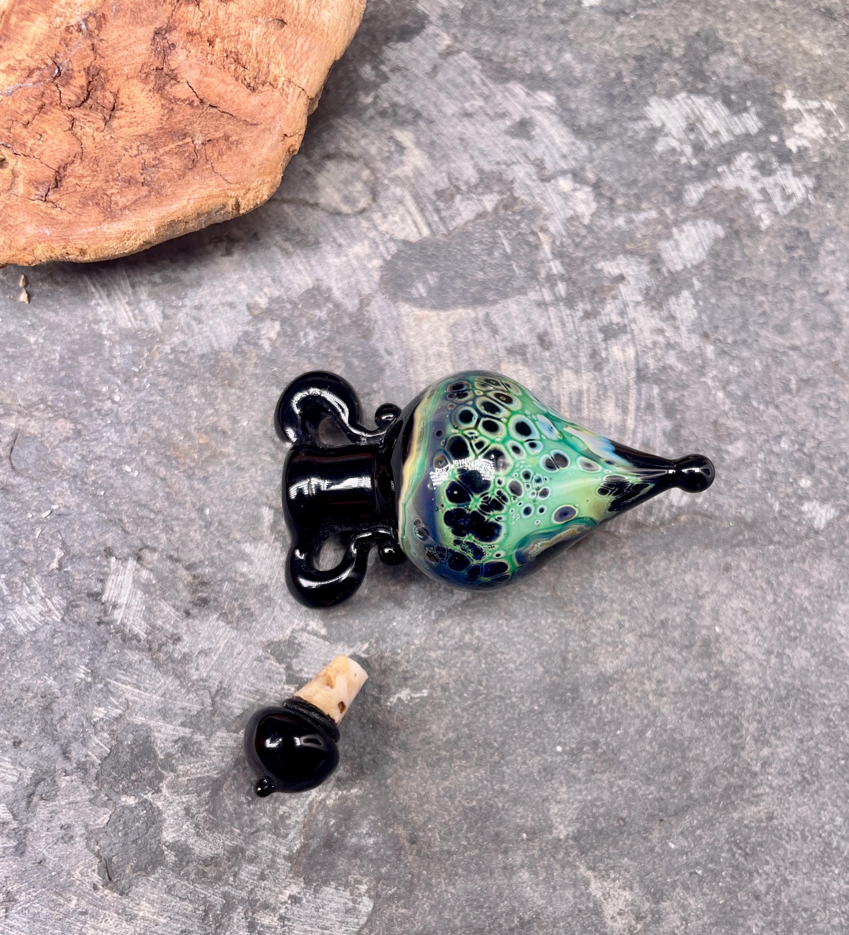 This is an Italian glass vessel bead made with silver glass for the crazy green markings. Works great for essential oils or a touch of your favorite perfume. Comes in a 1.5mm 18” silver filled mini ball chain which is removable. Approximately 1.75” top to bottom. Gently twist the cork stopper in for a nice tight fit.