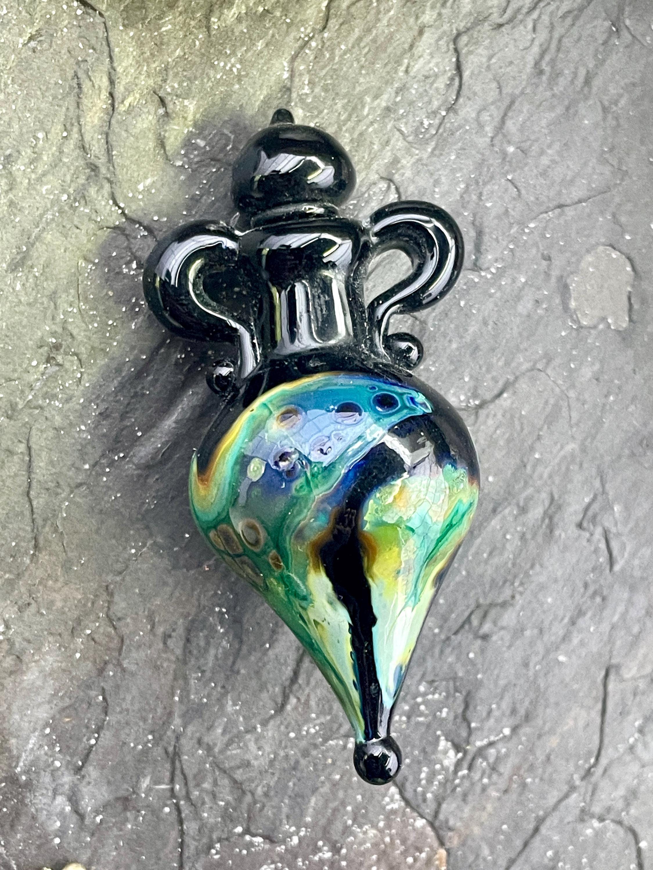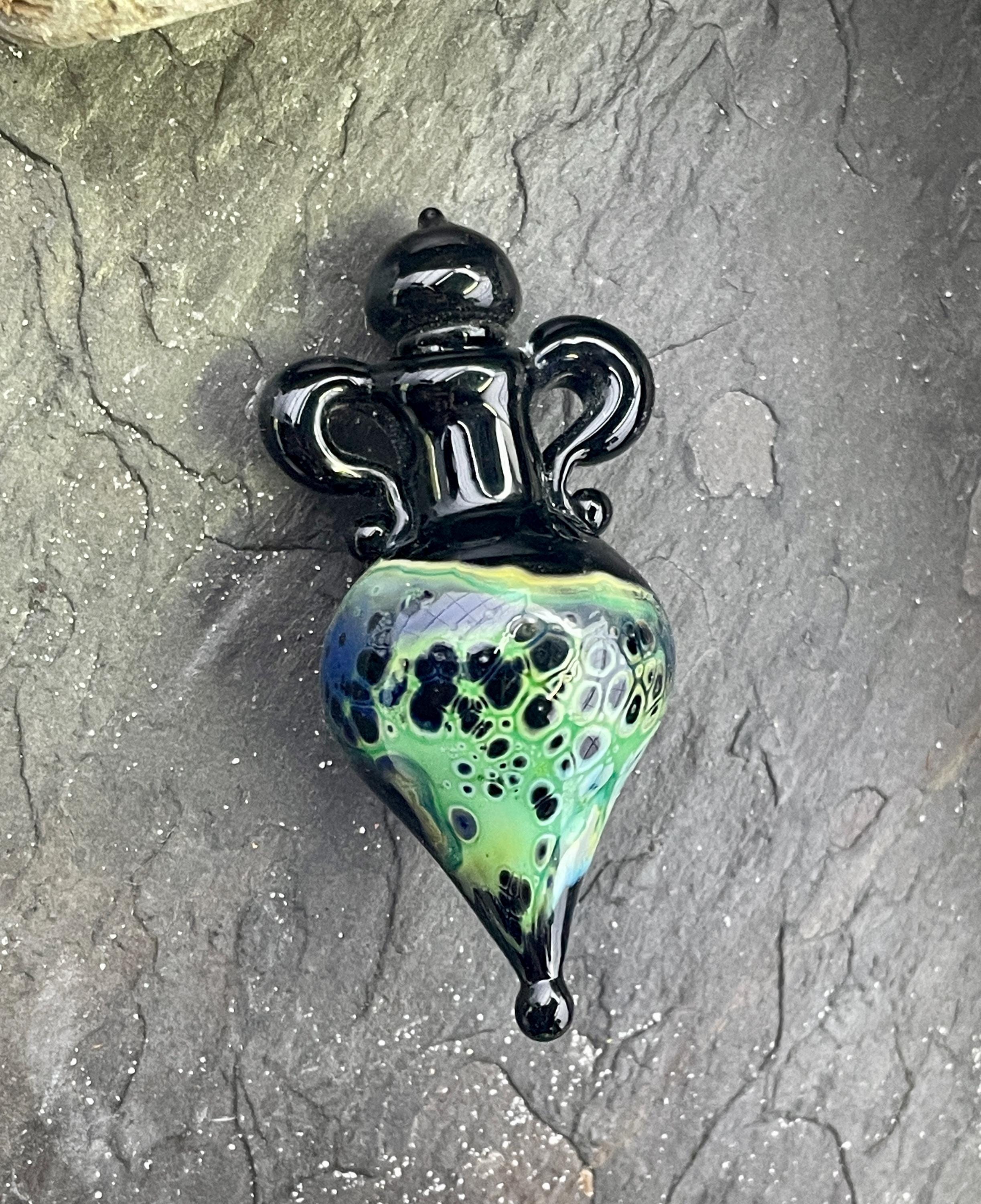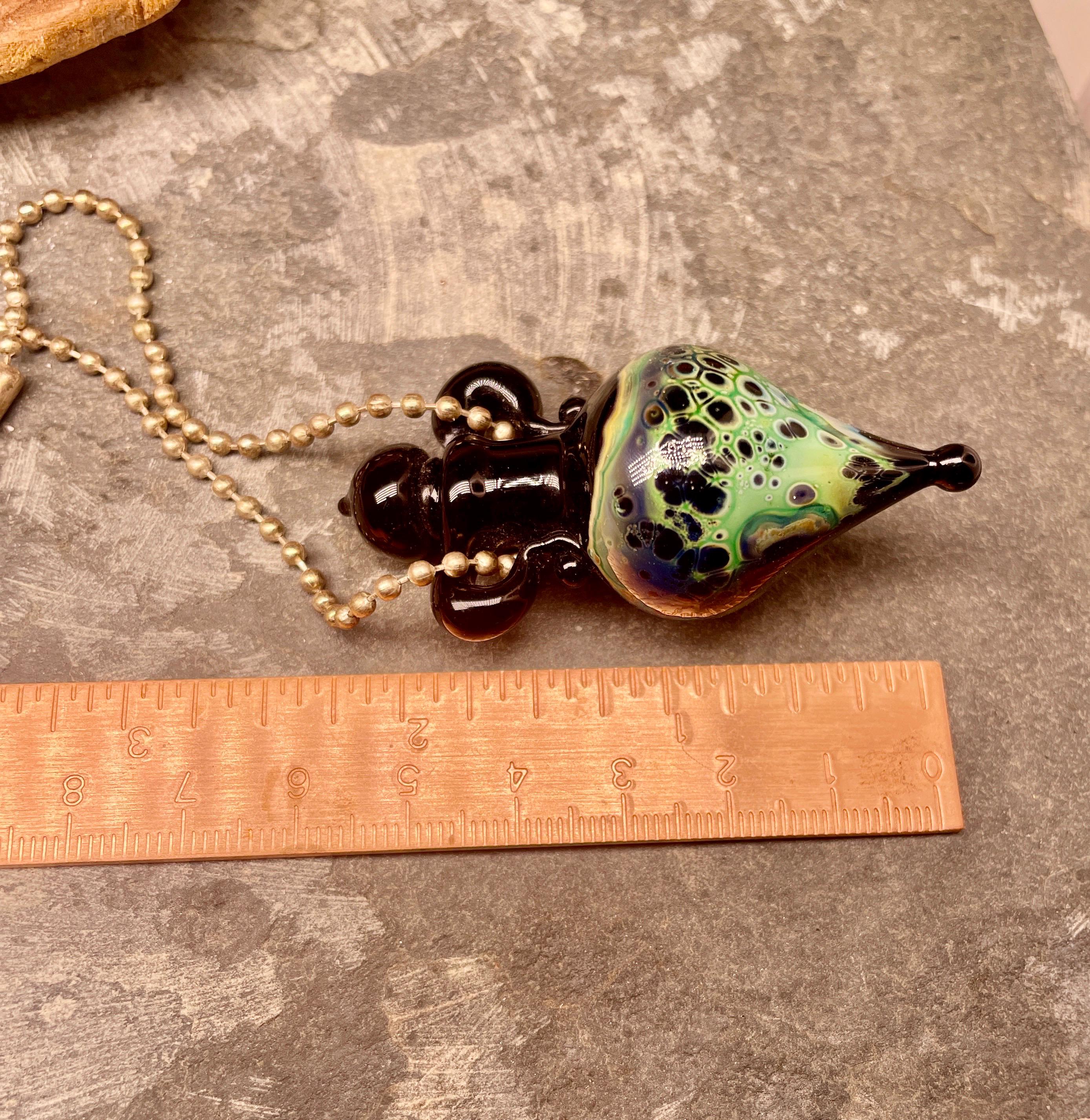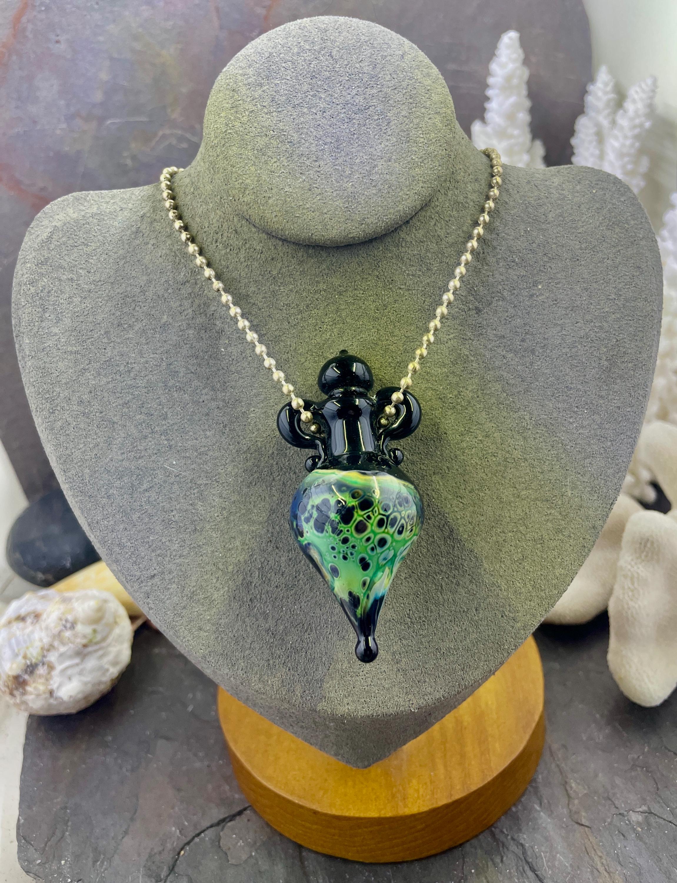 This is an Italian glass vessel bead made with silver glass for the crazy green markings. Works great for essential oils or a touch of your favorite perfume. Comes in a 1.5mm 18” silver filled mini ball chain which is removable. Approximately 1.75” top to bottom. Gently twist the cork stopper in for a nice tight fit.