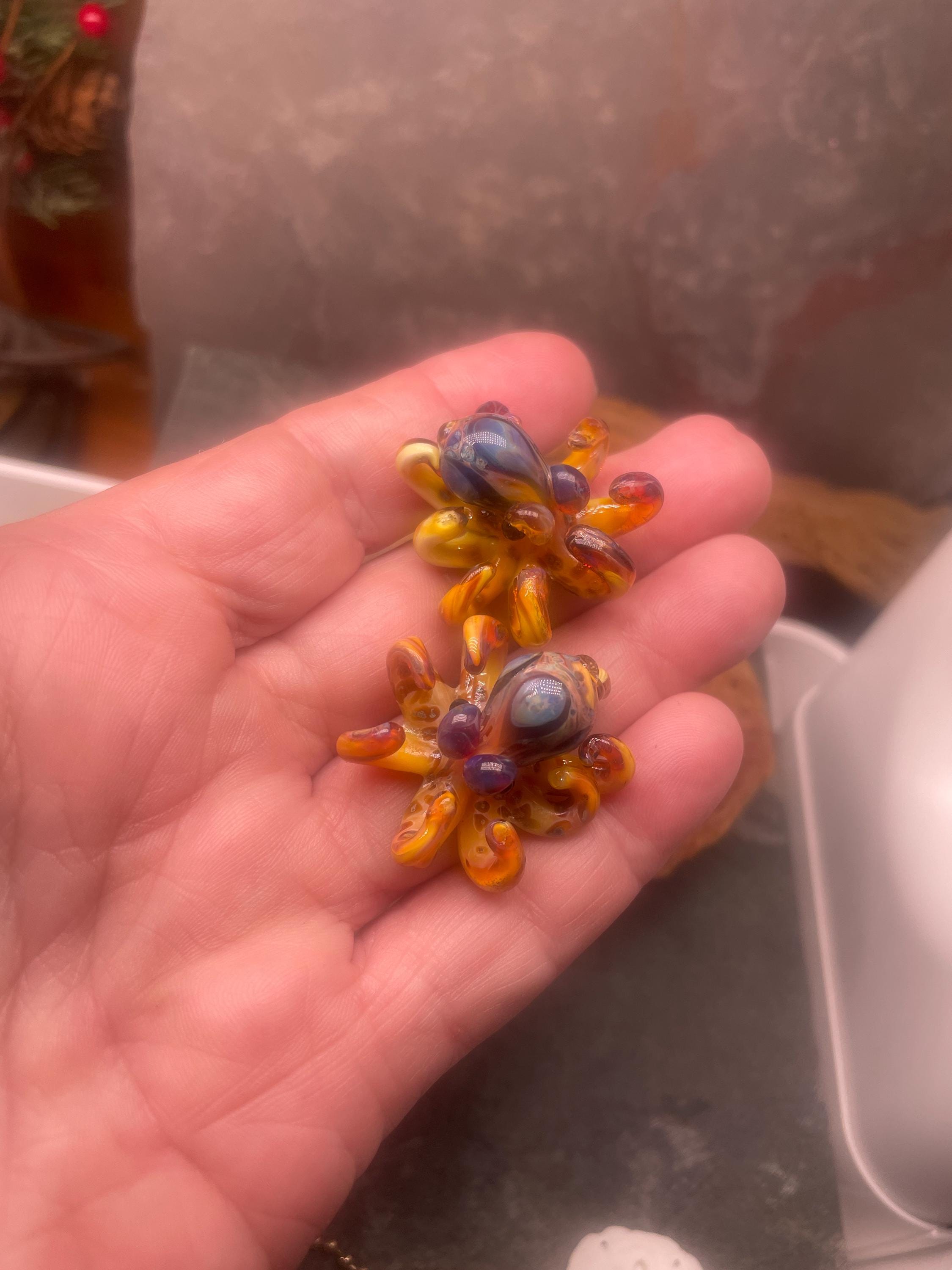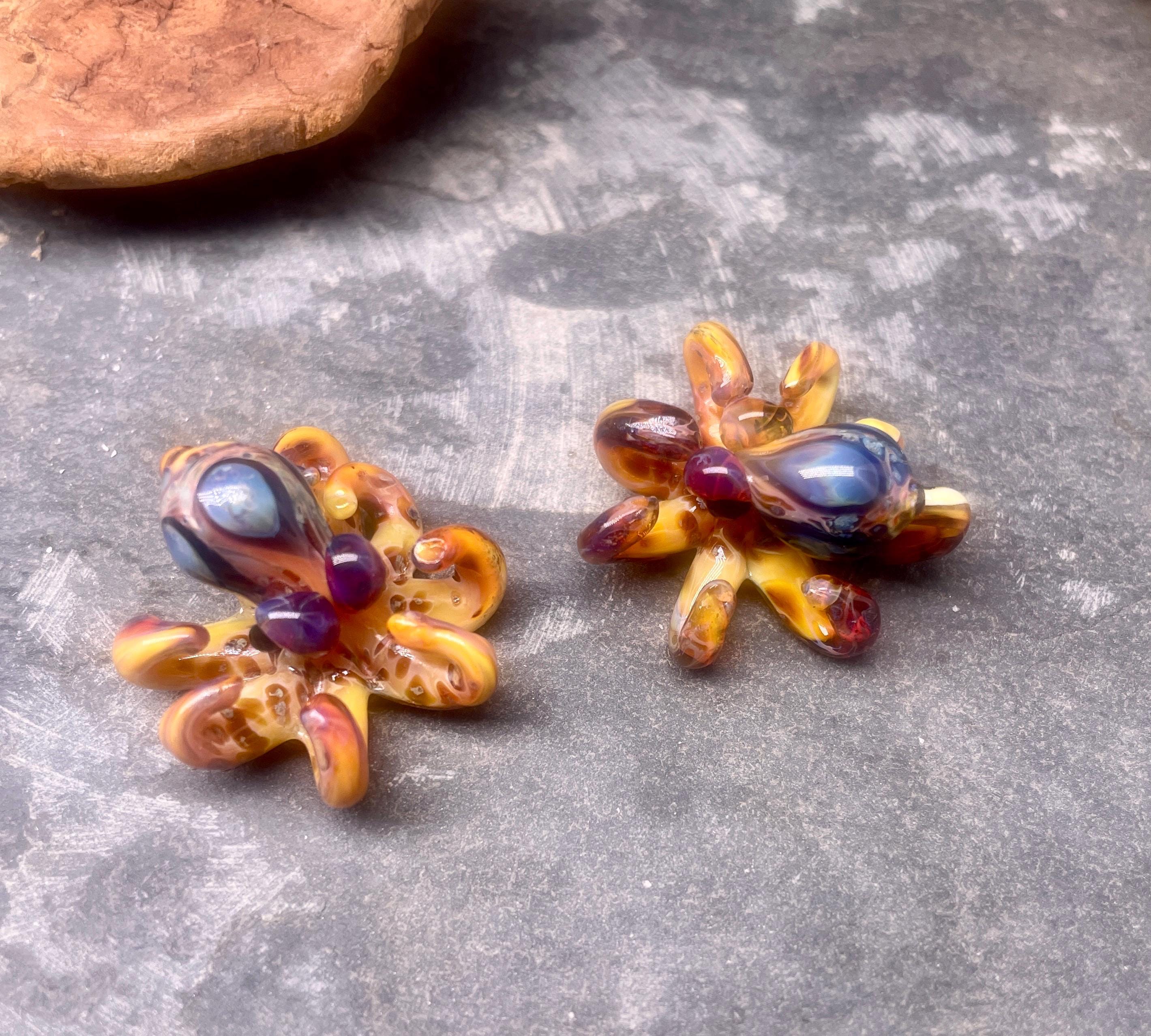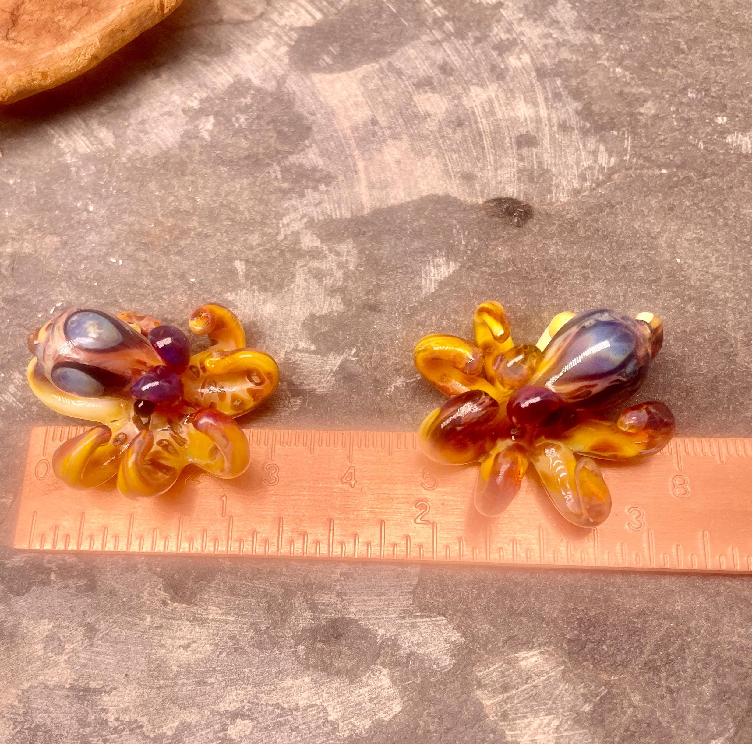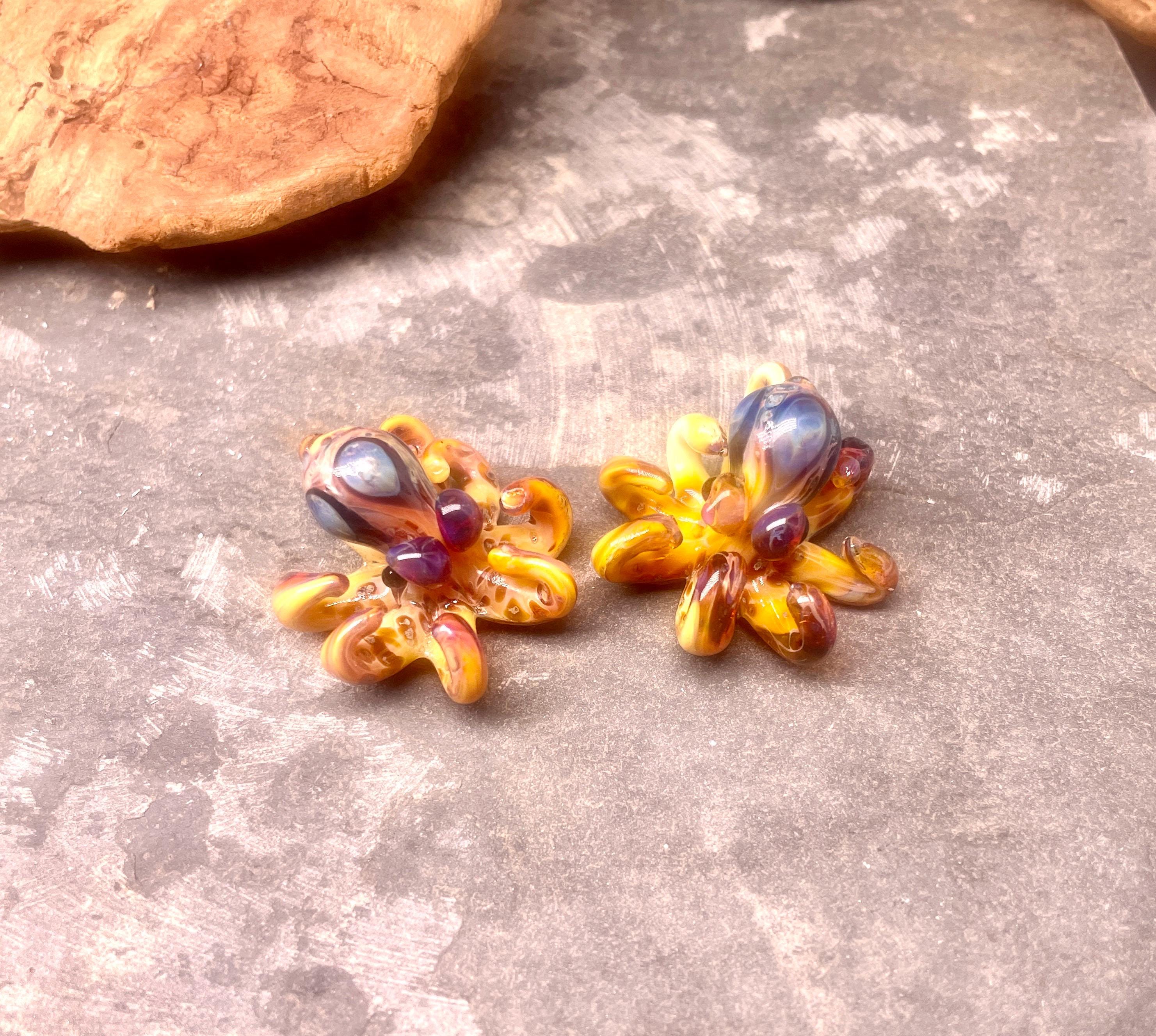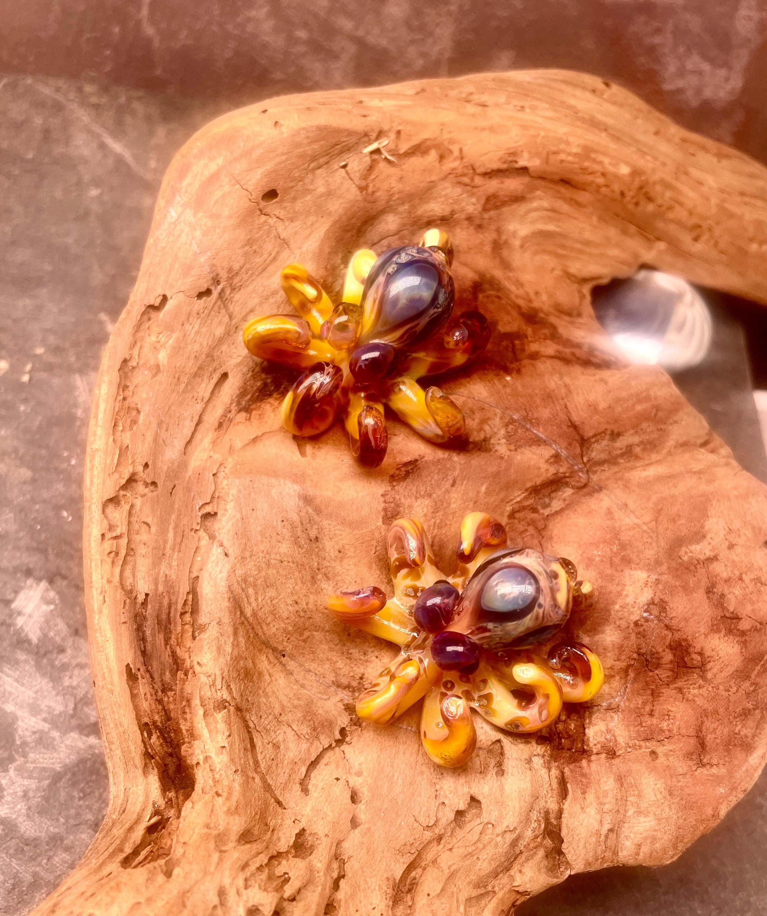 Newest of the new.....mini octo earrings in the colors of Azheris Magic! These colors take five layers of glass to achieve! Each little guy is just a bit bigger than a quarter. They come attached to silver filled French wires, but can be adapted to post earrings, just say the word. Each little guy is handmade using only traditional glass working tools, no molds. A fun new addition to our regular Octo pendants! These arrive in a cute windowed metal box, great as a gift or for yourself.