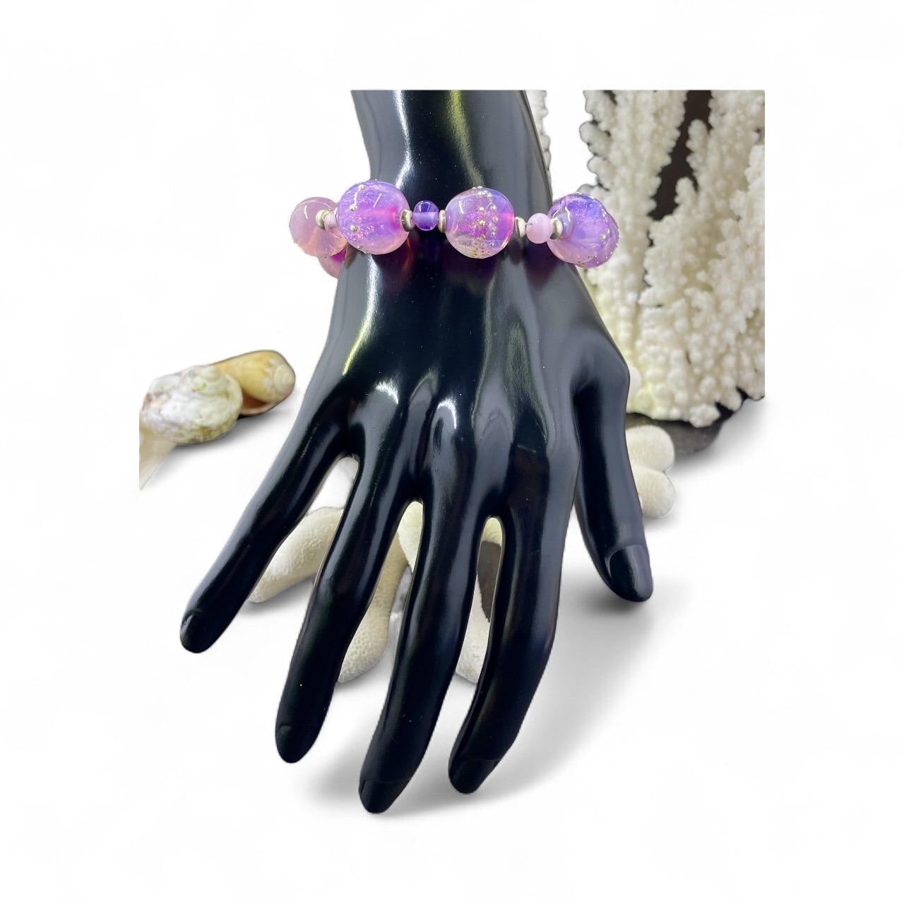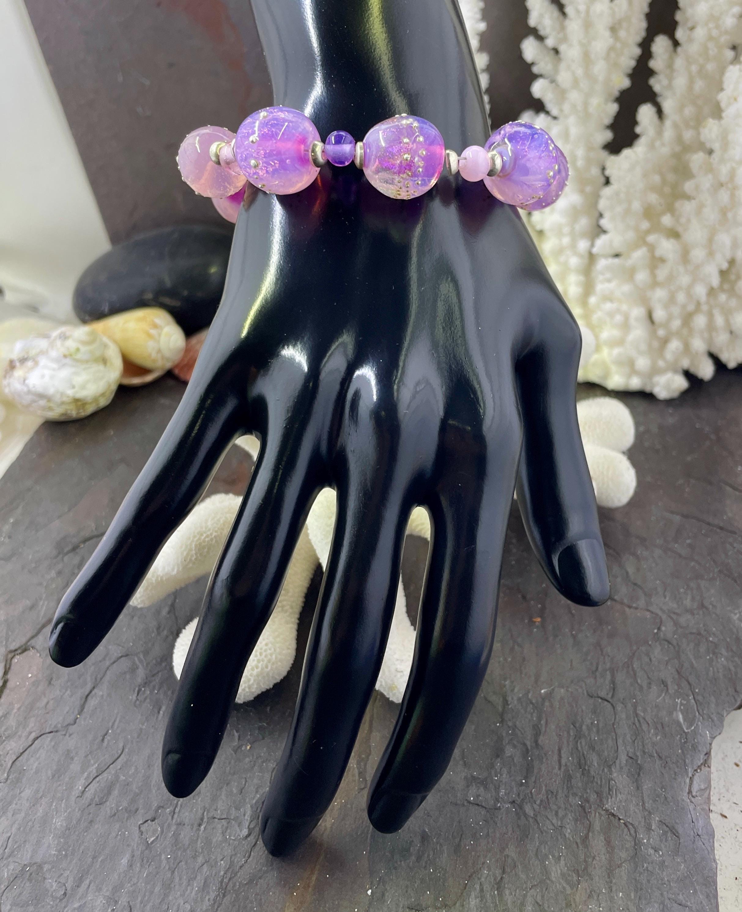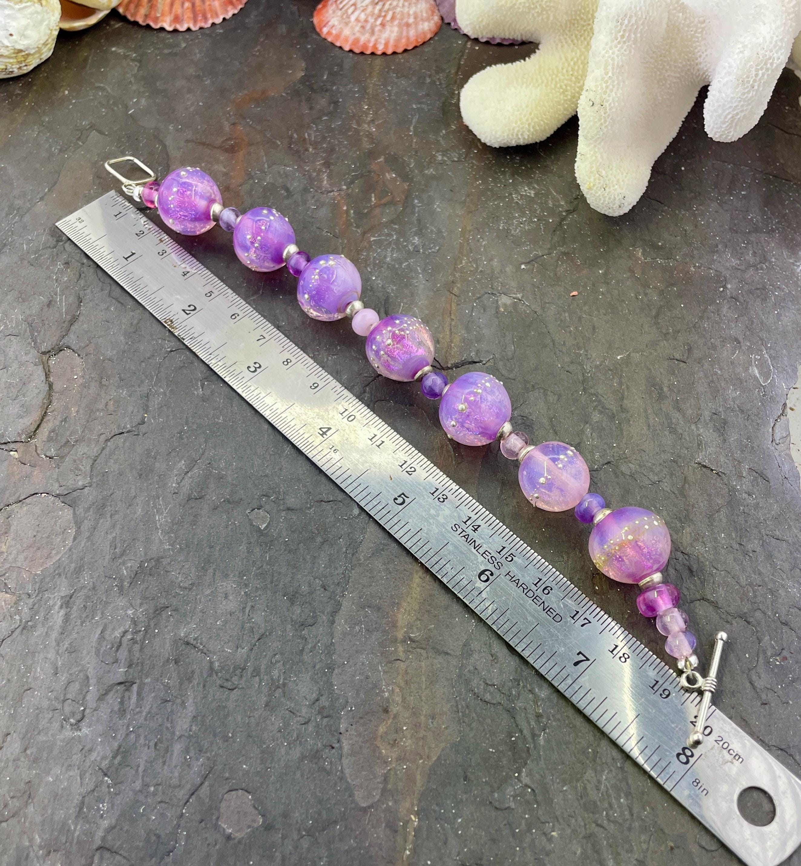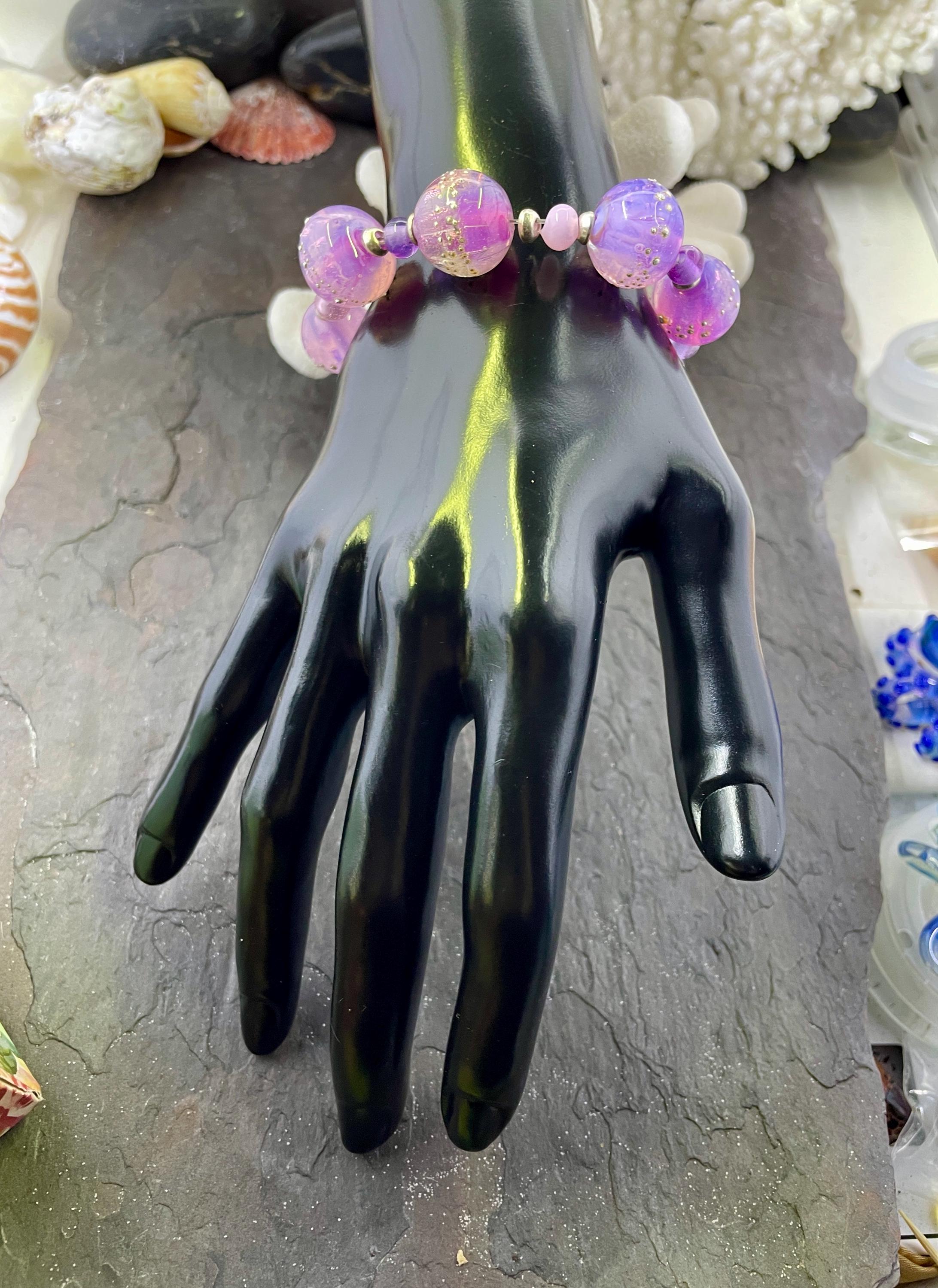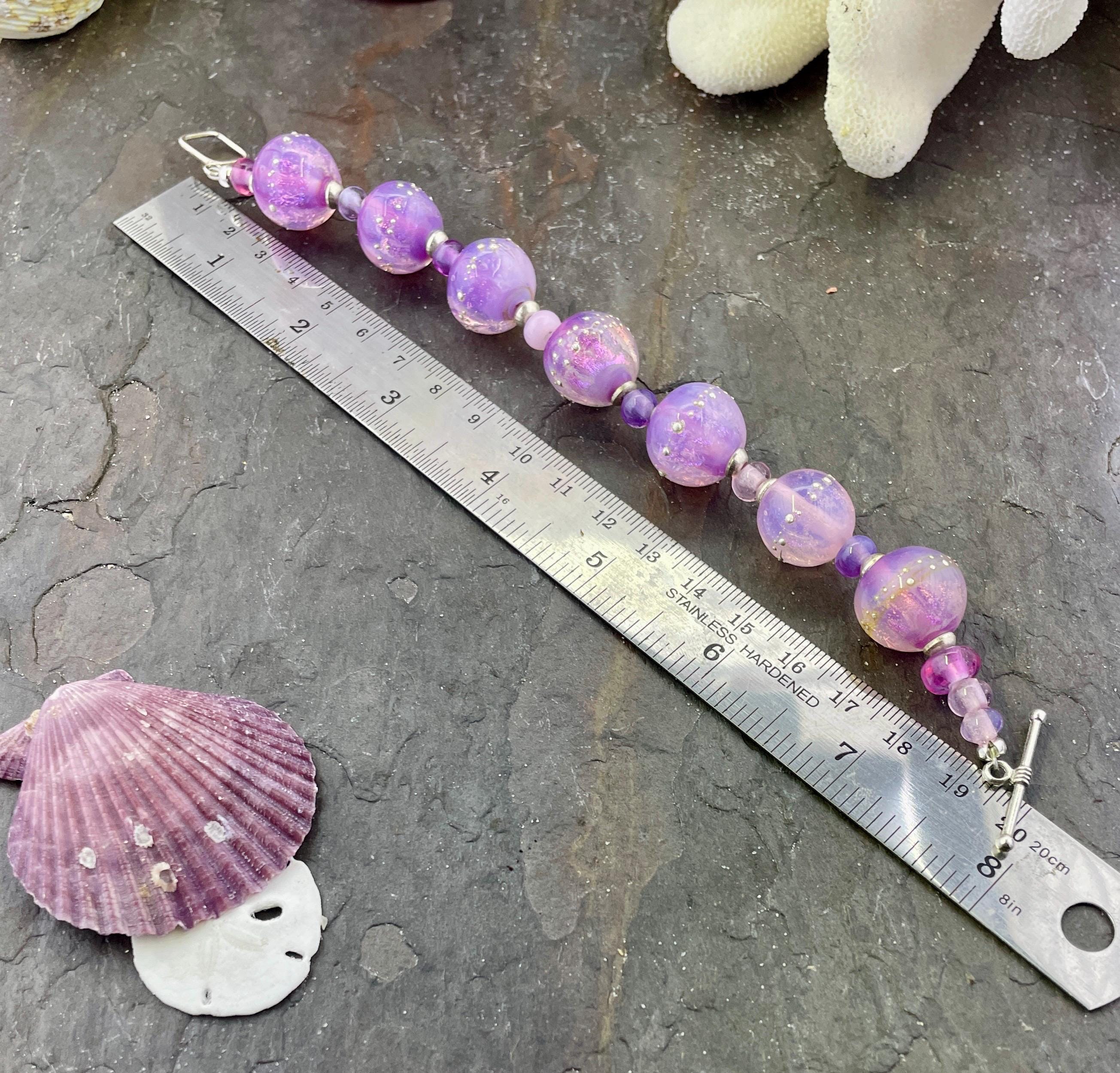 Handmade made silver glass with 7 different lampwork beads using Lotus glass and wrapped in pure silver wire for a touch of glitter. These beads are separated with 8 tiny Lotus spacer beads. The multicolored dichroic sheen deep inside each larger bead is the perfect final touch. This one can go from camping to the fancy dinner without miss a beat. At 8” long it fits the average wrist.