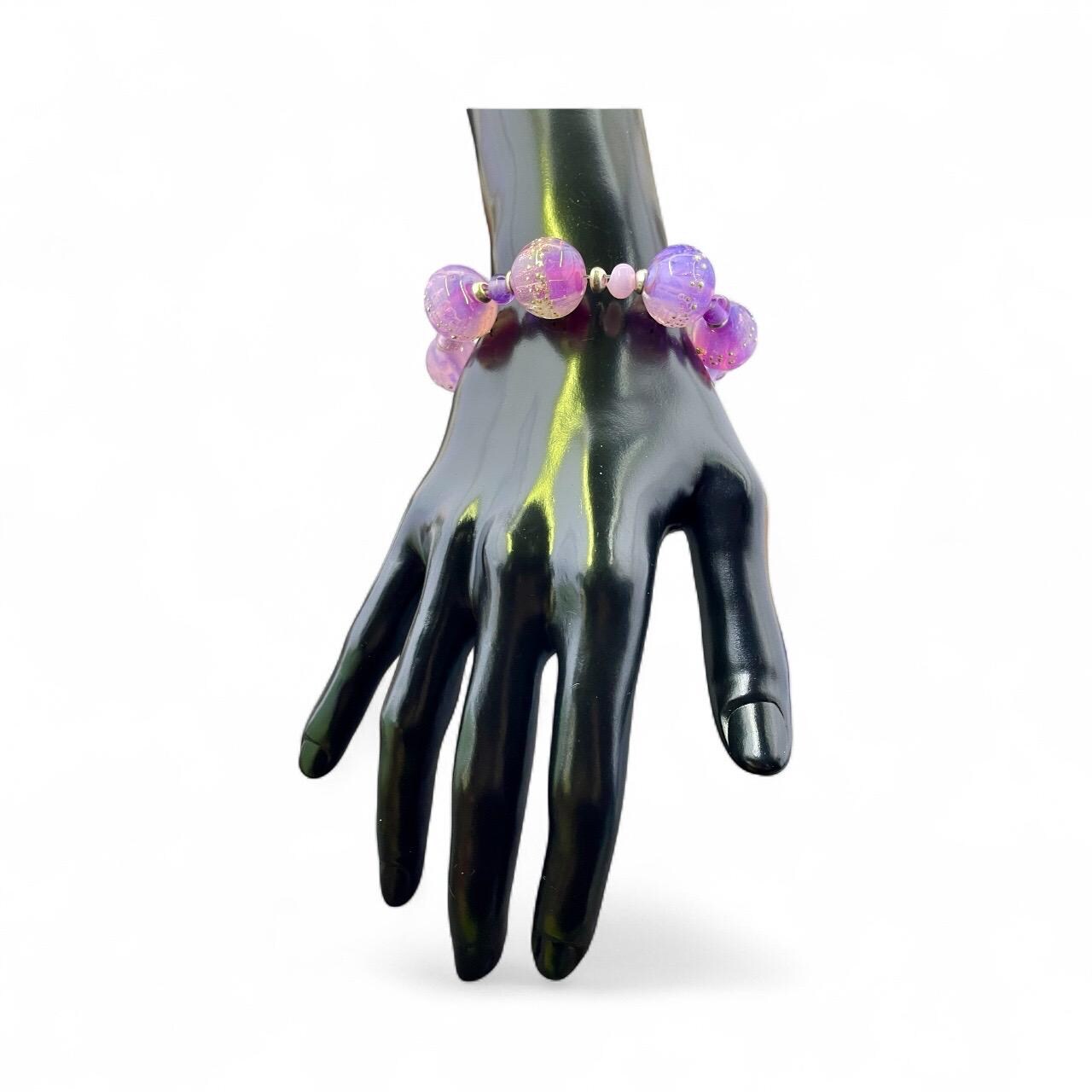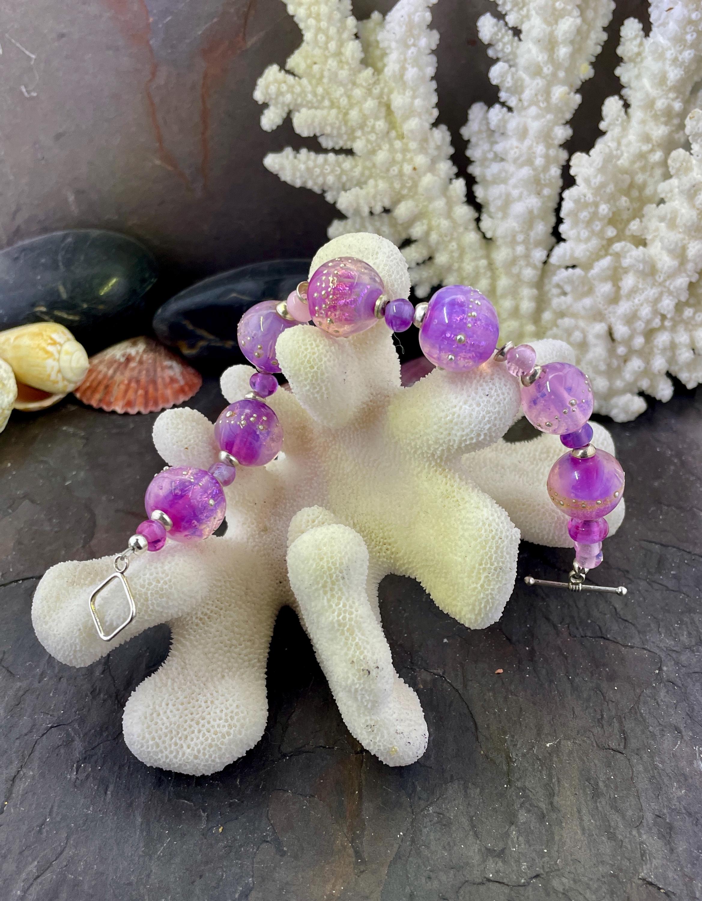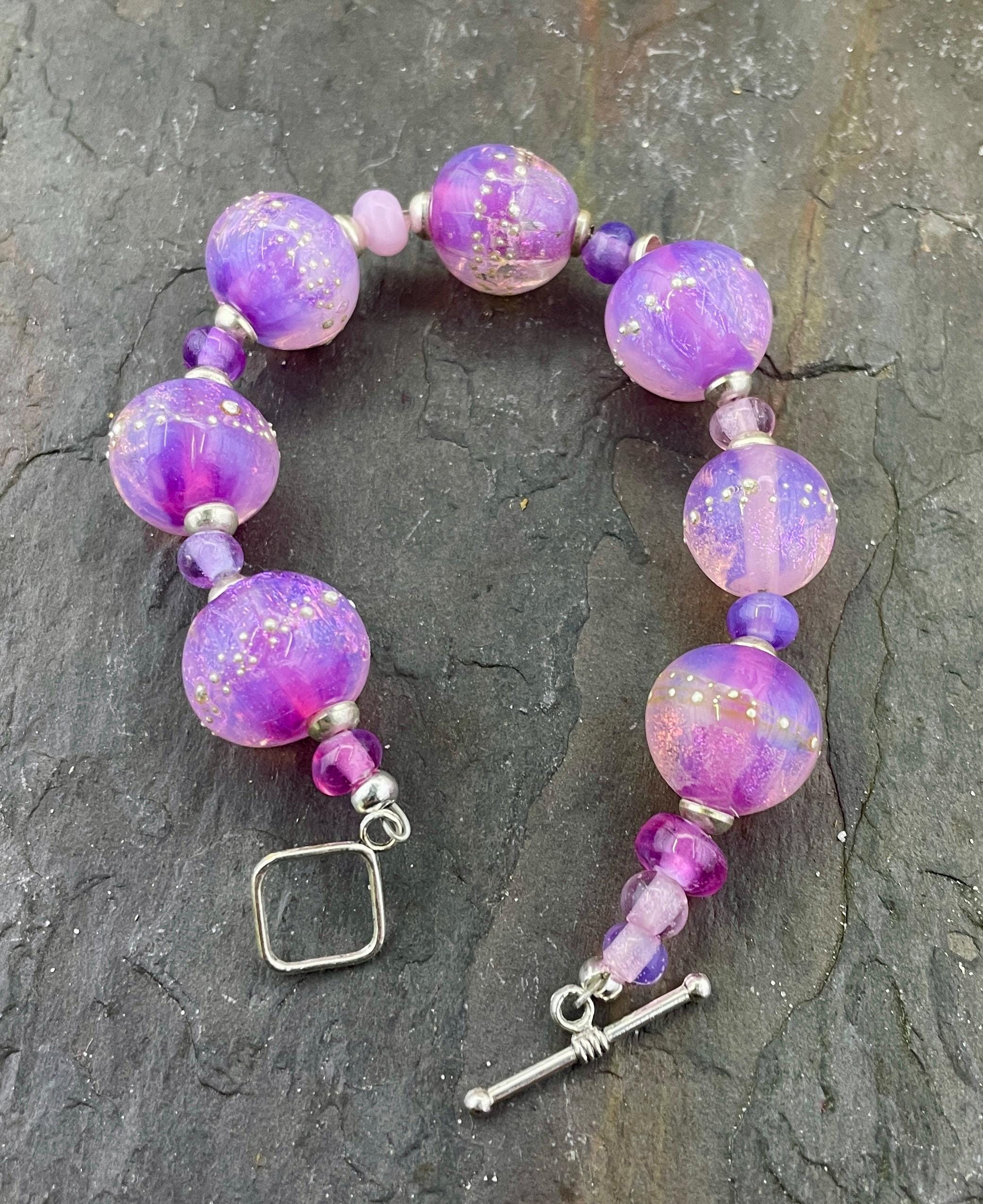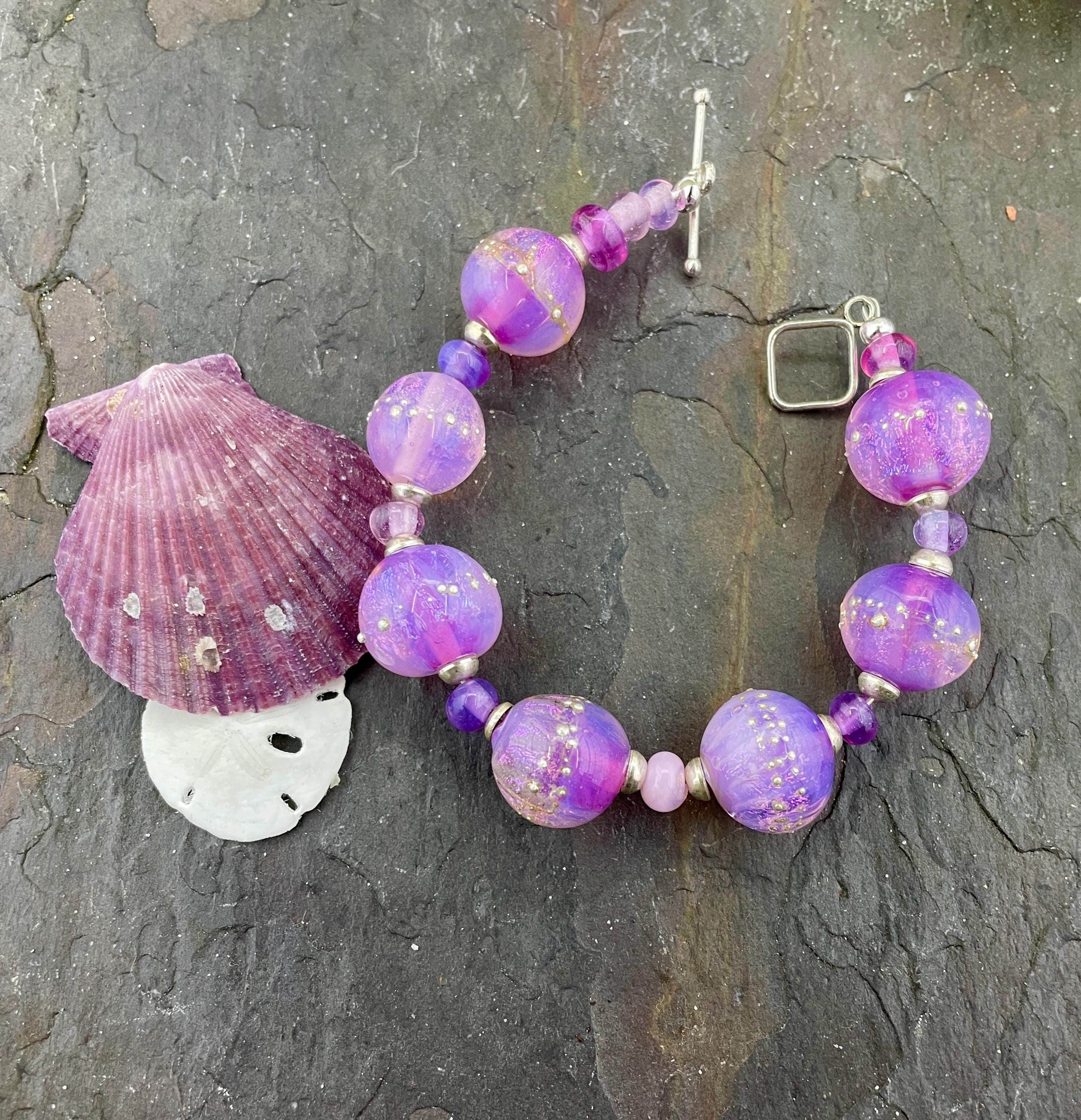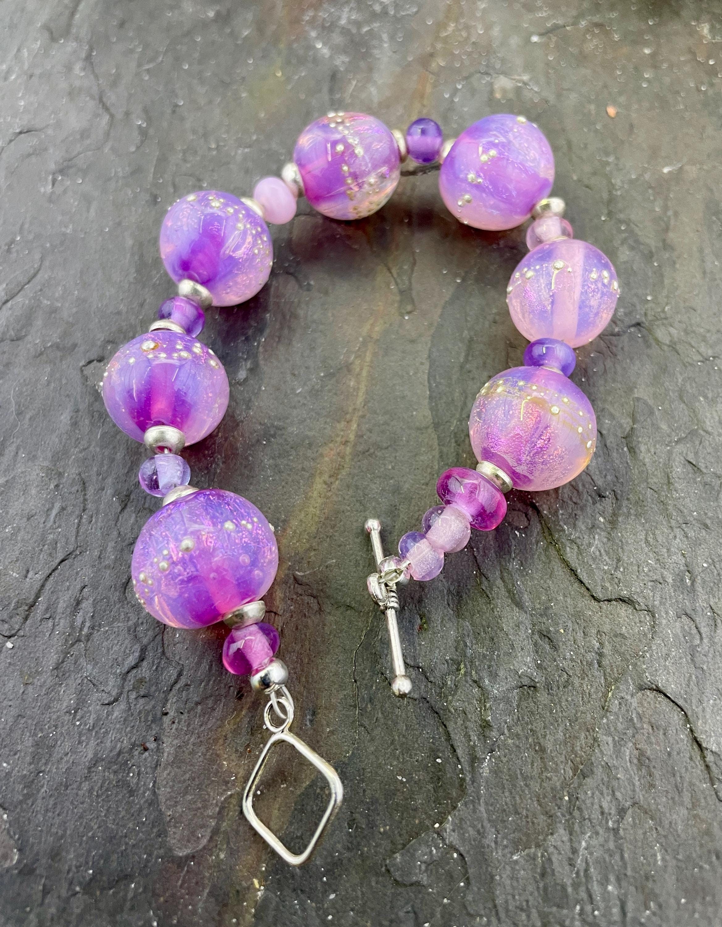 Handmade made silver glass with 7 different lampwork beads using Lotus glass and wrapped in pure silver wire for a touch of glitter. These beads are separated with 8 tiny Lotus spacer beads. The multicolored dichroic sheen deep inside each larger bead is the perfect final touch. This one can go from camping to the fancy dinner without miss a beat. At 8” long it fits the average wrist.