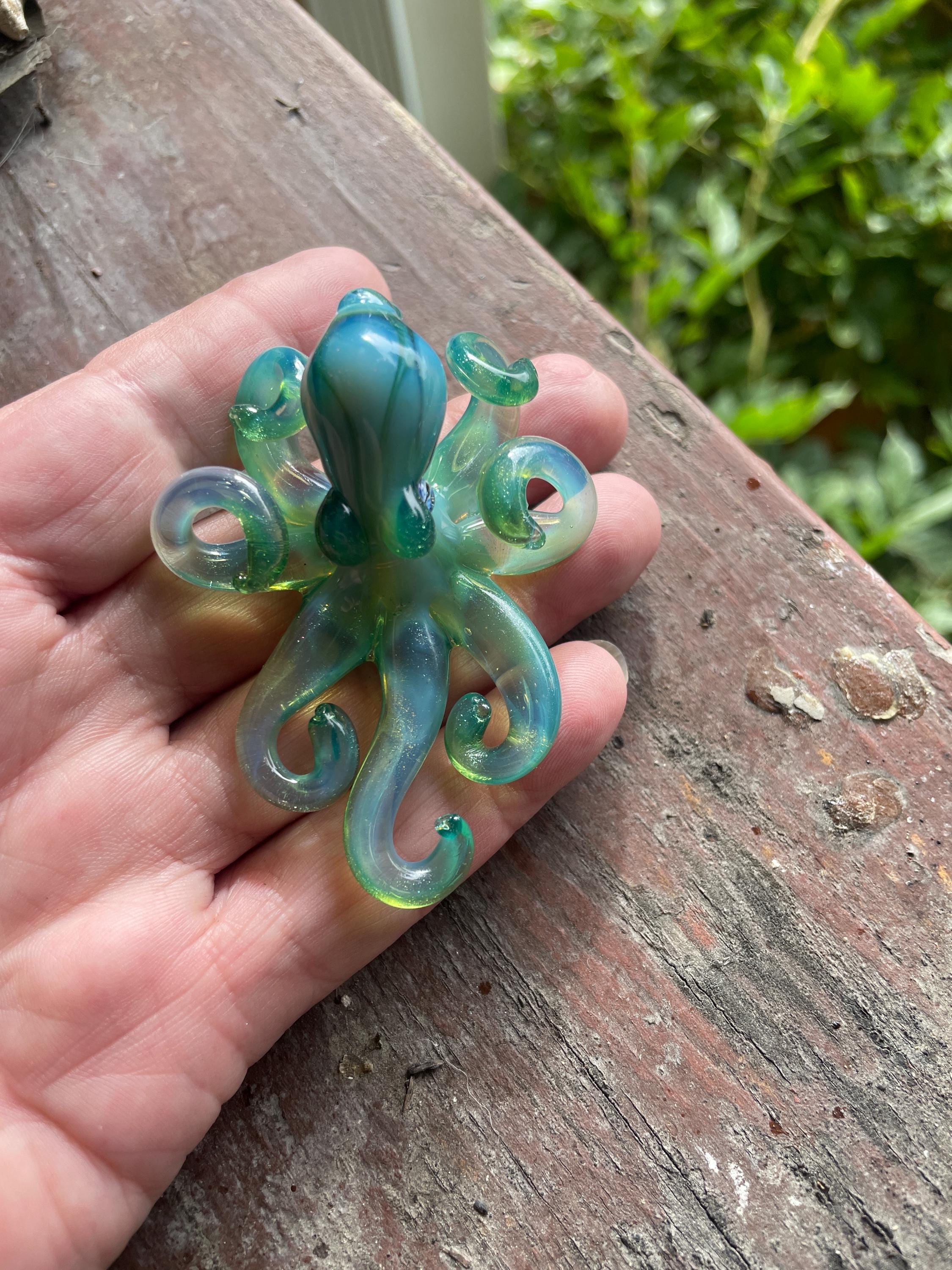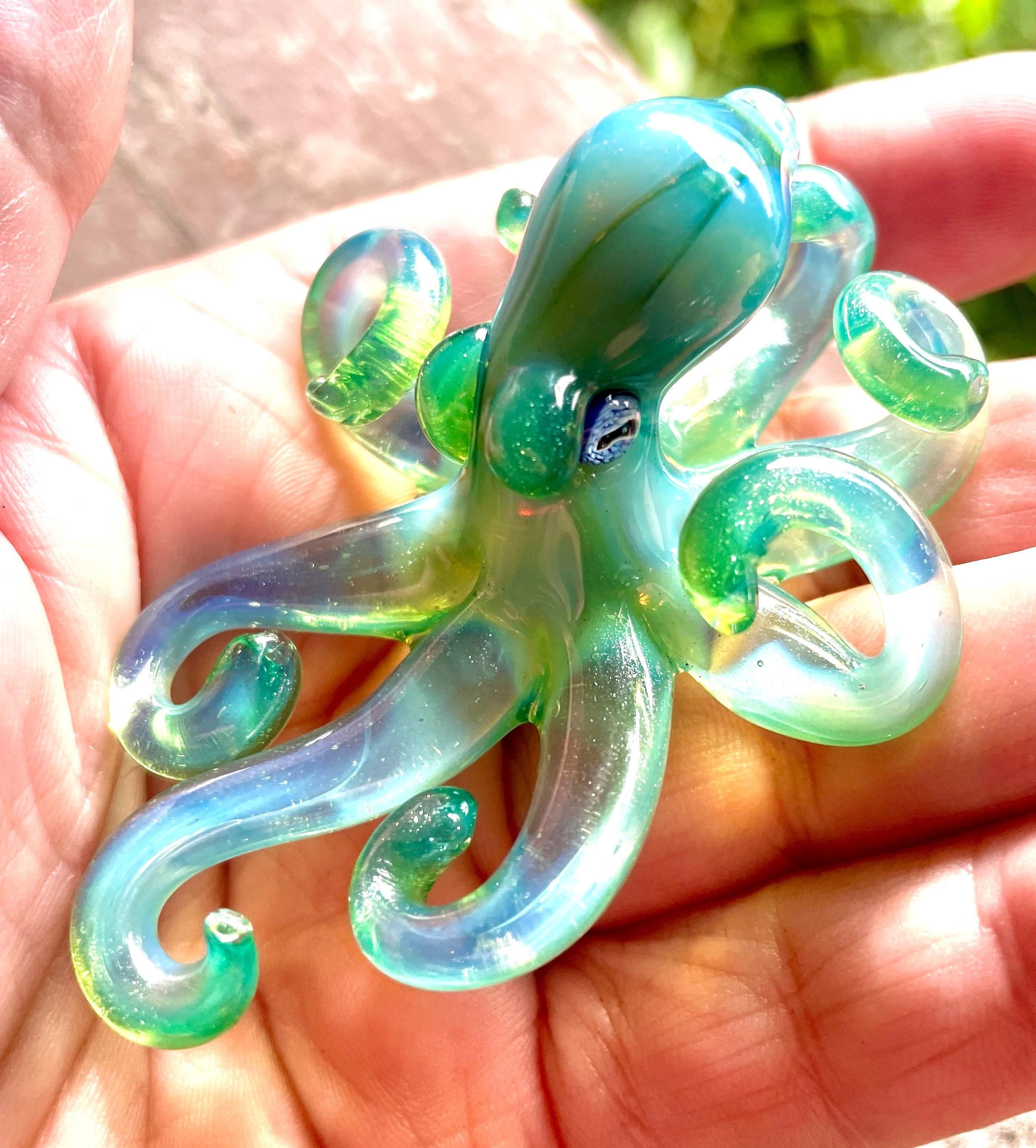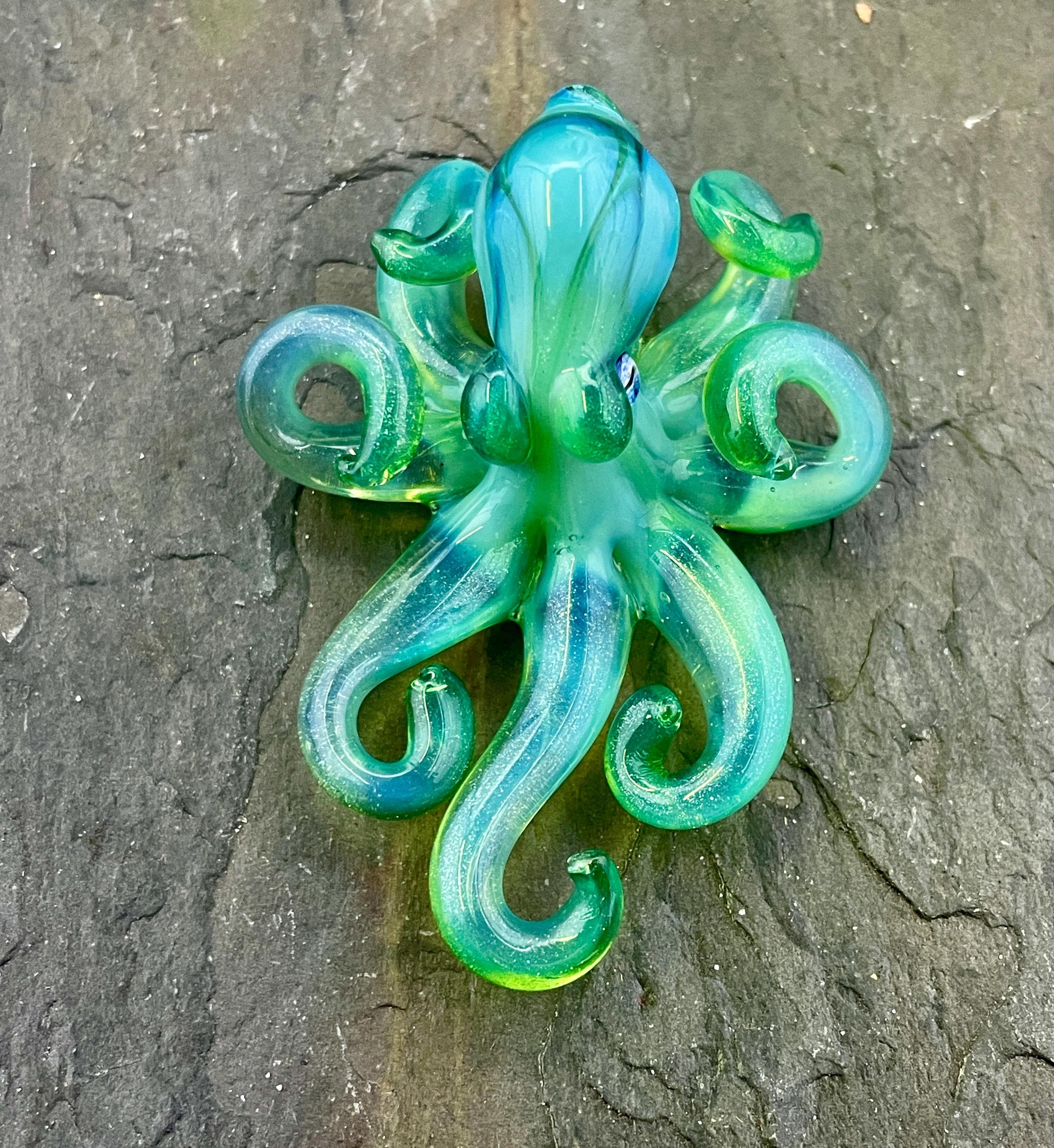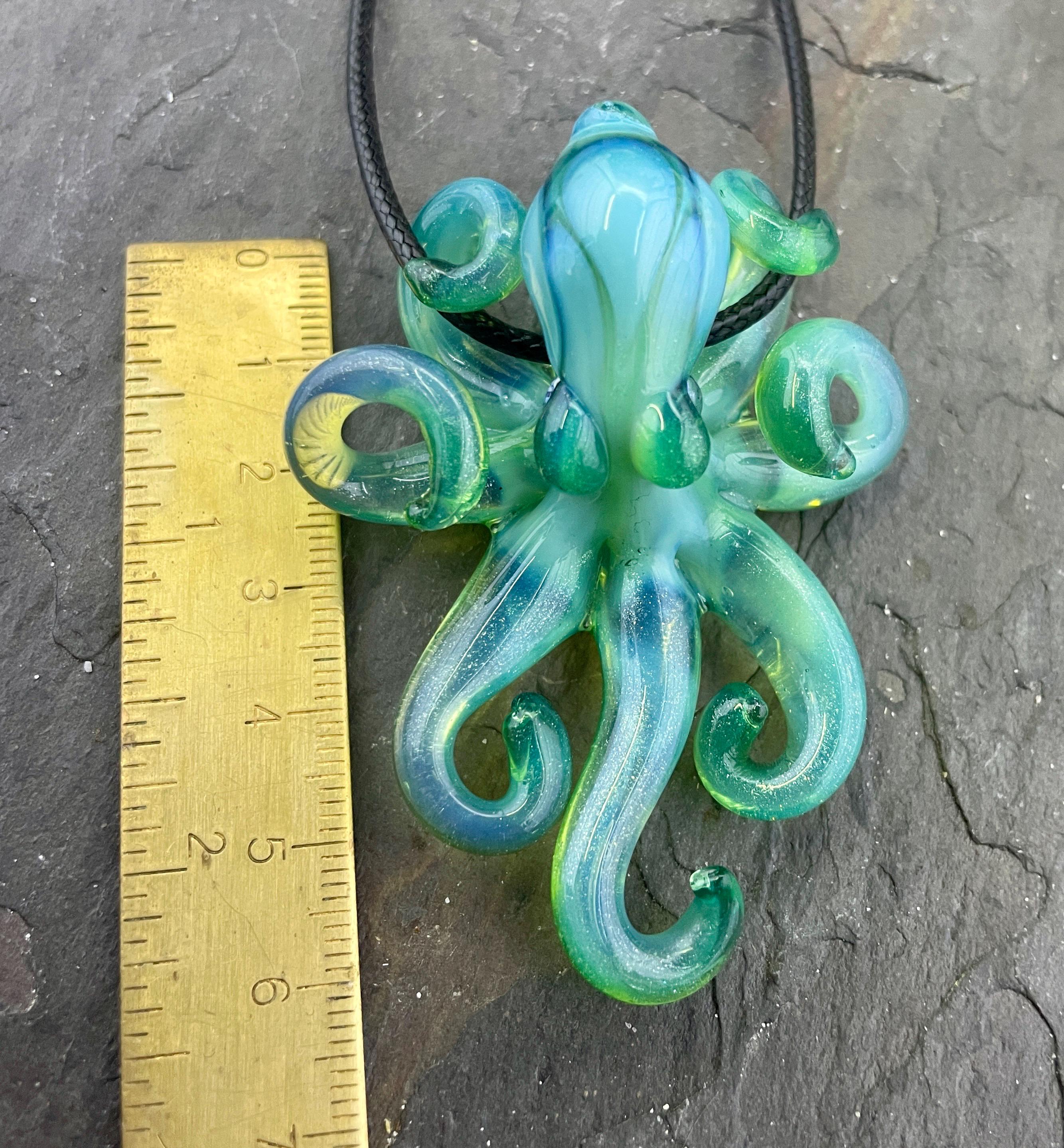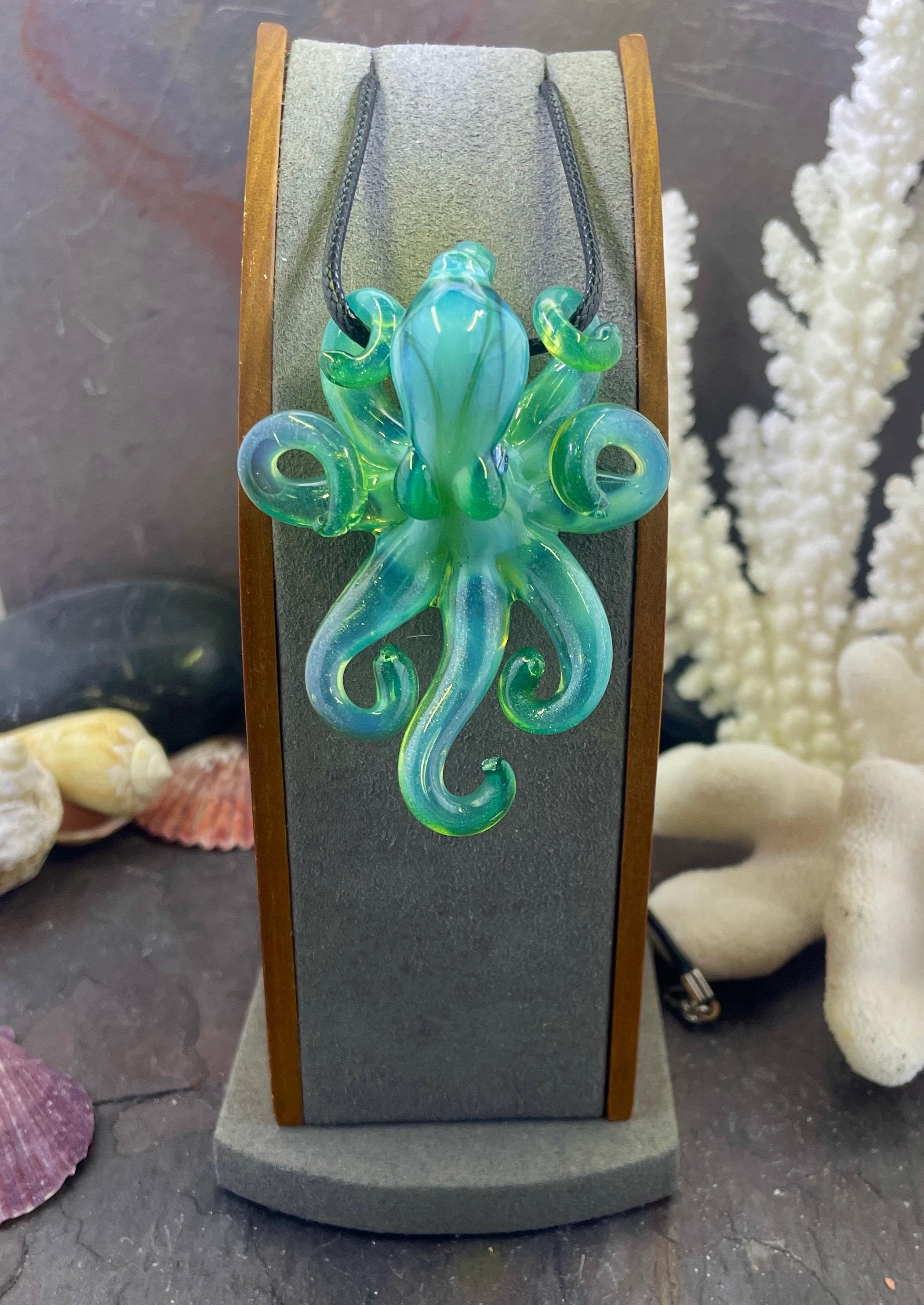 Another boro octopus glass necklace, this is the Green Sparkle Kraken. A nice size at 2.25" long, formed in the torch using no molds and properly annealed in a digital kiln for durability, this one arrives safely wrapped and attached to an adjustable black cord necklace. This new glass from Lunar has a sparkle like I've never seen before, but it's hard to catch in photos. Handmade glass eye chip gives her such realistic eyes, you might want to keep her on her rope, just in case! Really fun and safe to wear, for a truly dramatic look! Marked on the bottom with the Maker's Mark "M" while still molten..