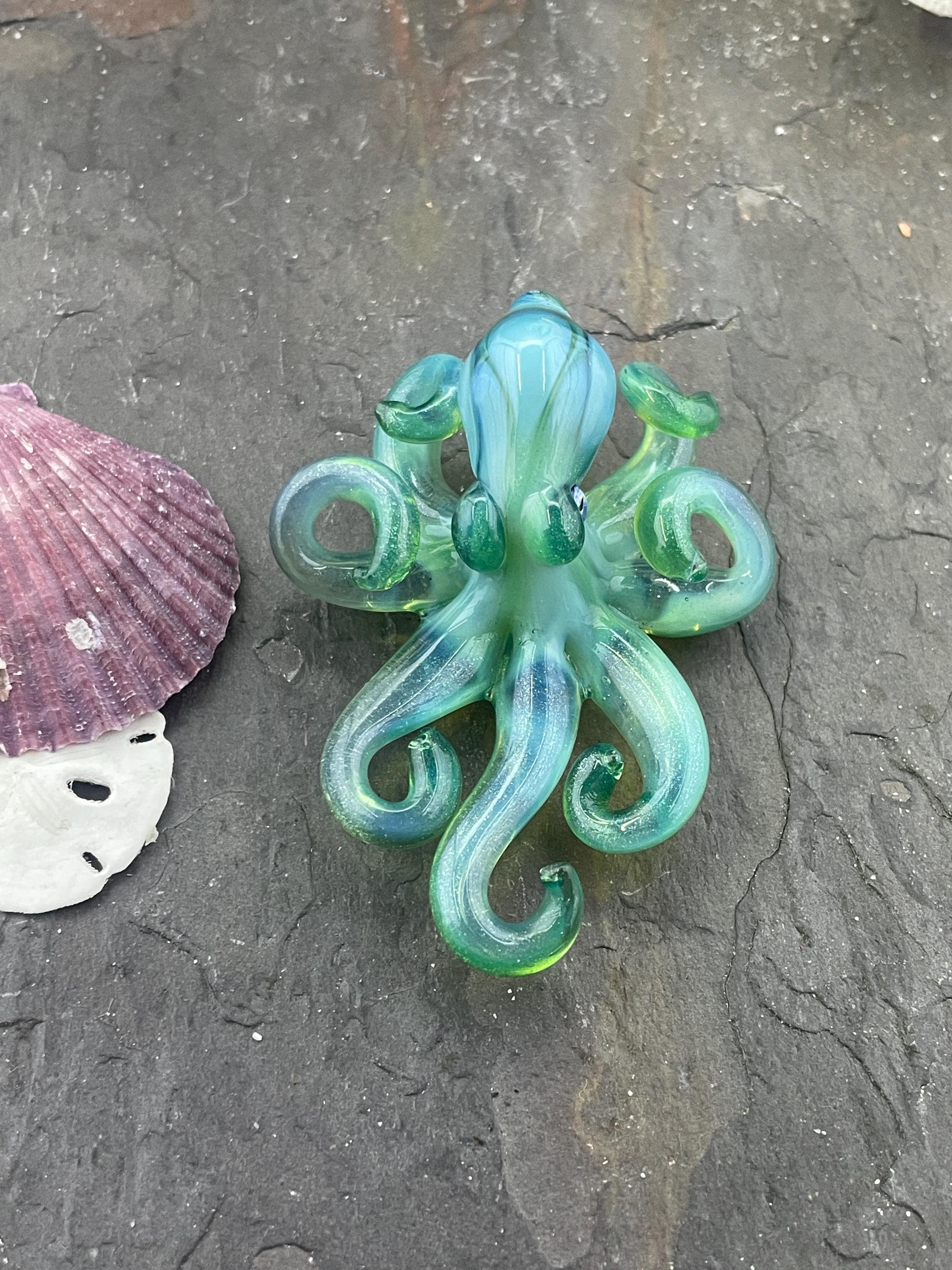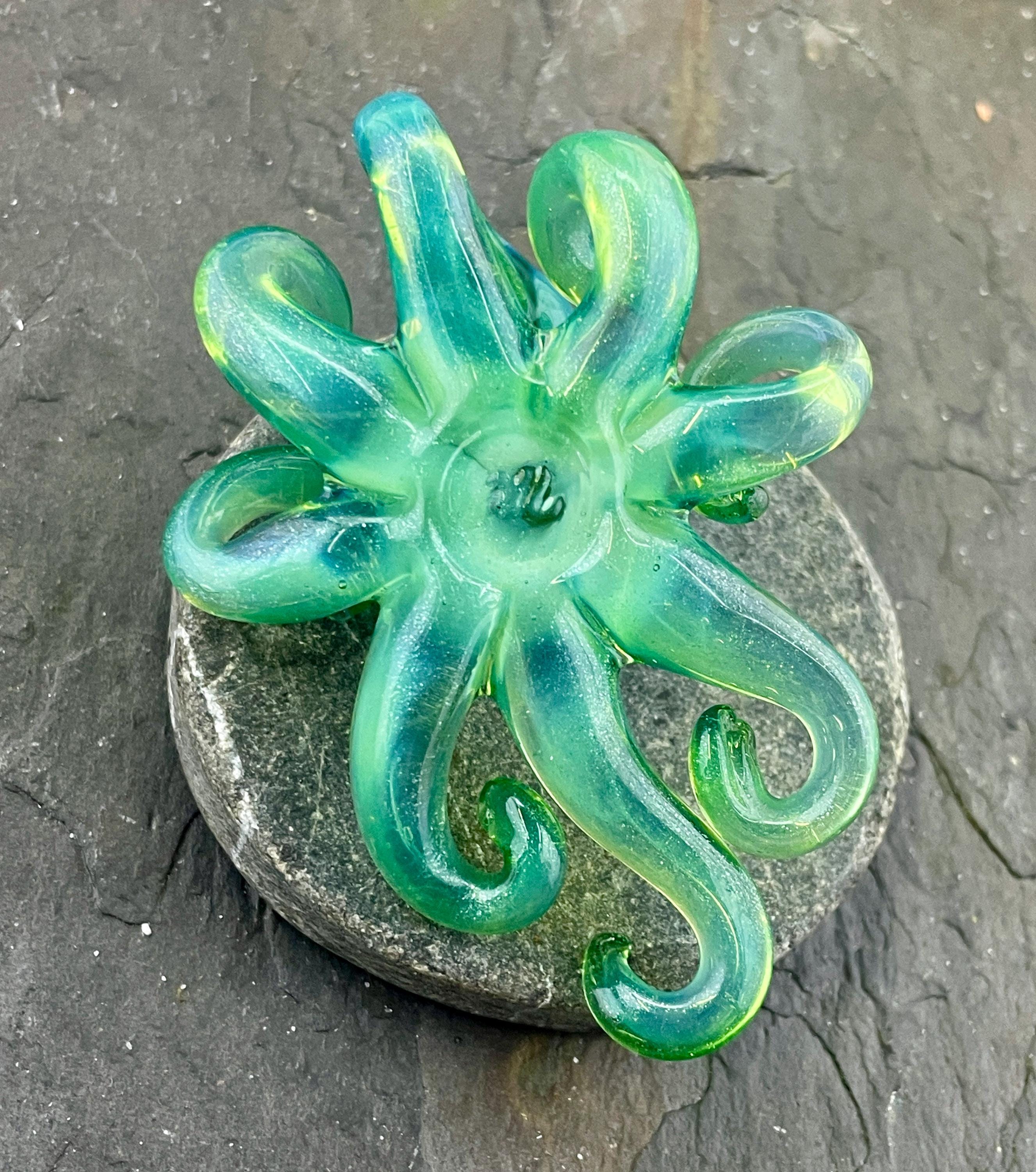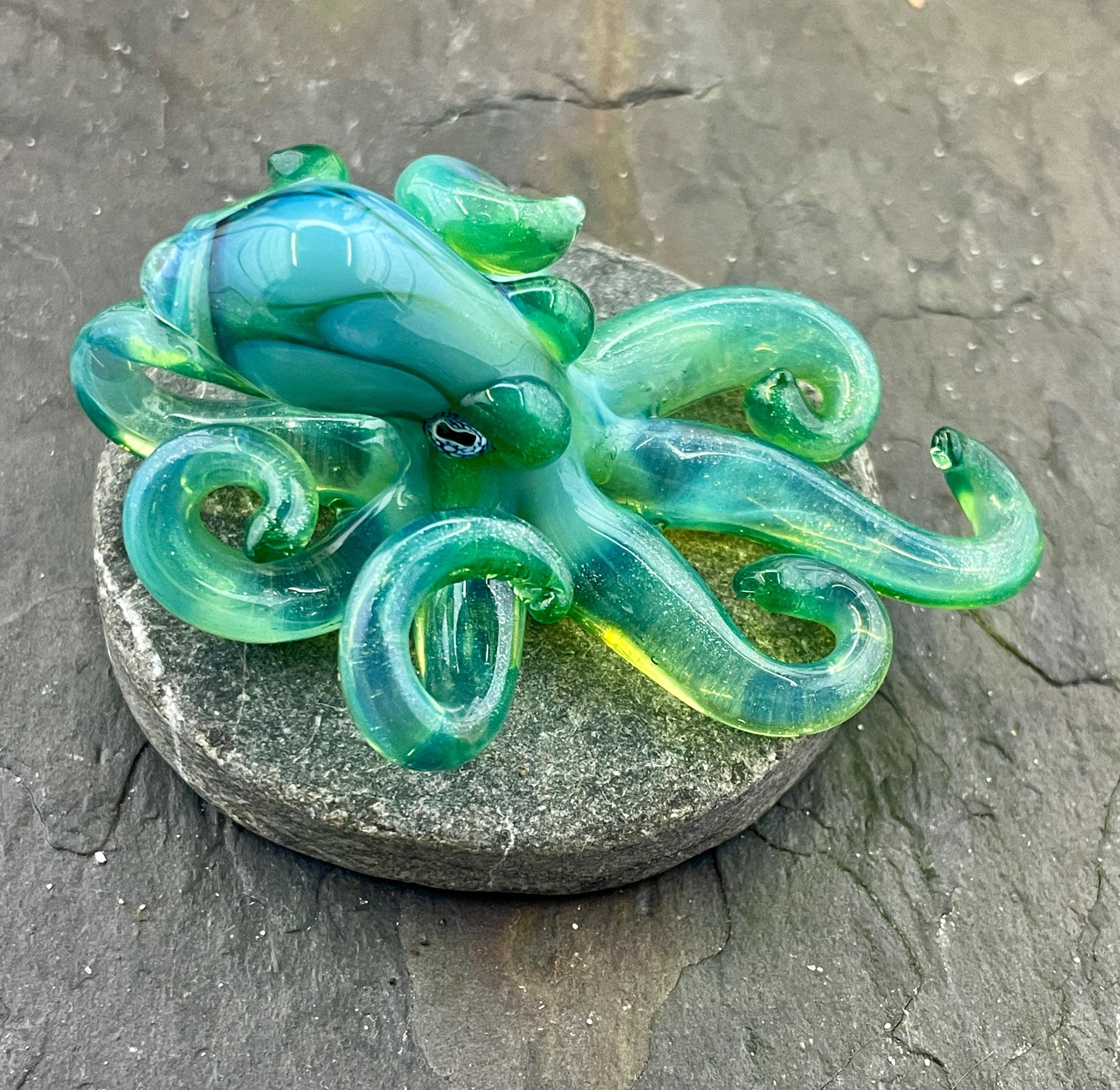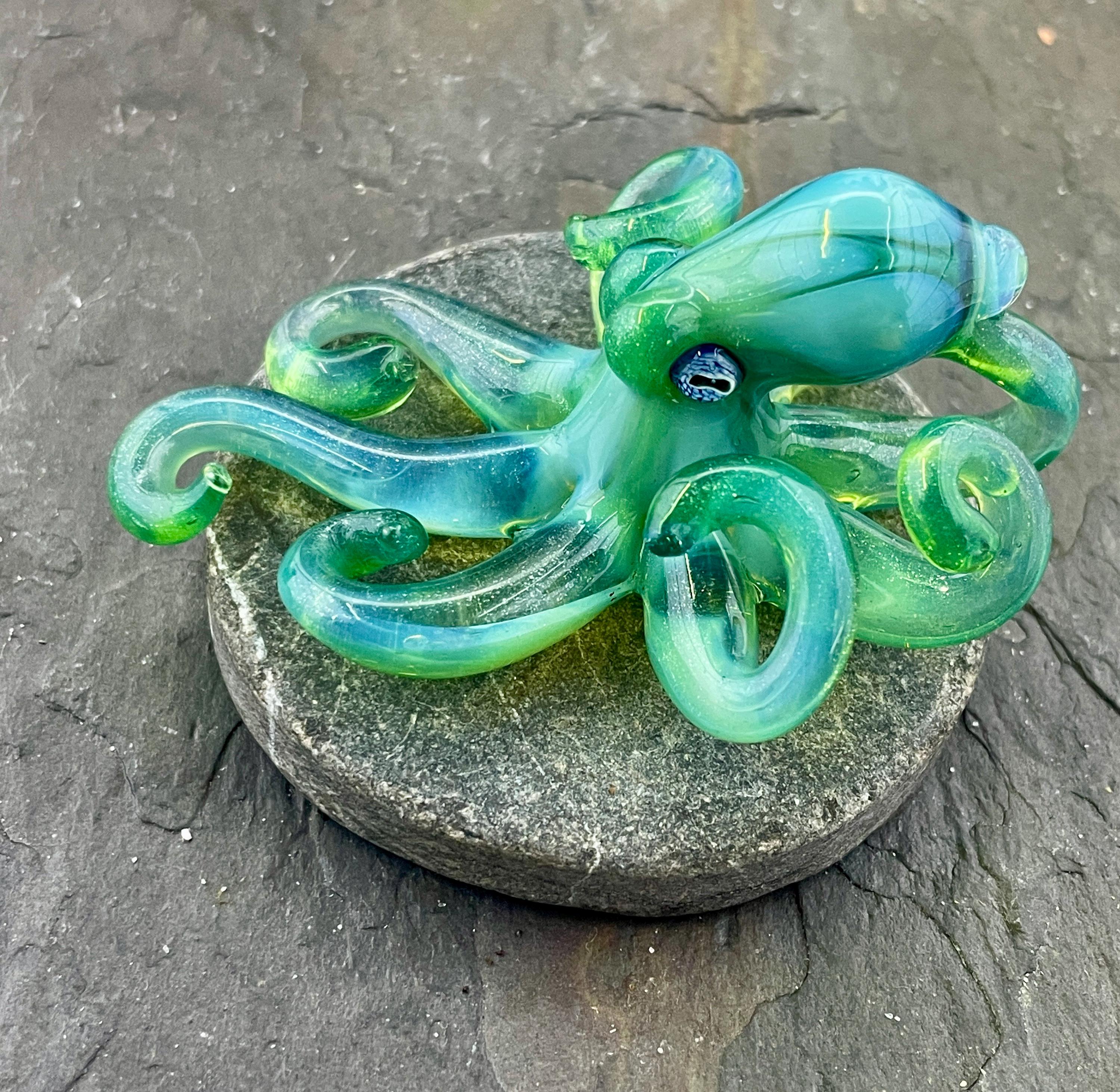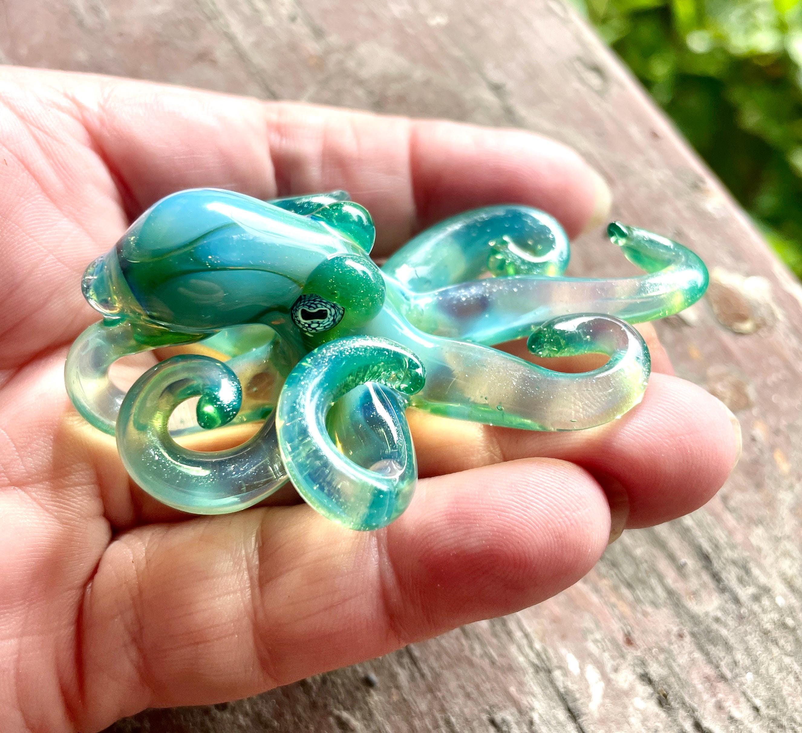 Another boro octopus glass necklace, this is the Green Sparkle Kraken. A nice size at 2.25" long, formed in the torch using no molds and properly annealed in a digital kiln for durability, this one arrives safely wrapped and attached to an adjustable black cord necklace. This new glass from Lunar has a sparkle like I've never seen before, but it's hard to catch in photos. Handmade glass eye chip gives her such realistic eyes, you might want to keep her on her rope, just in case! Really fun and safe to wear, for a truly dramatic look! Marked on the bottom with the Maker's Mark "M" while still molten..