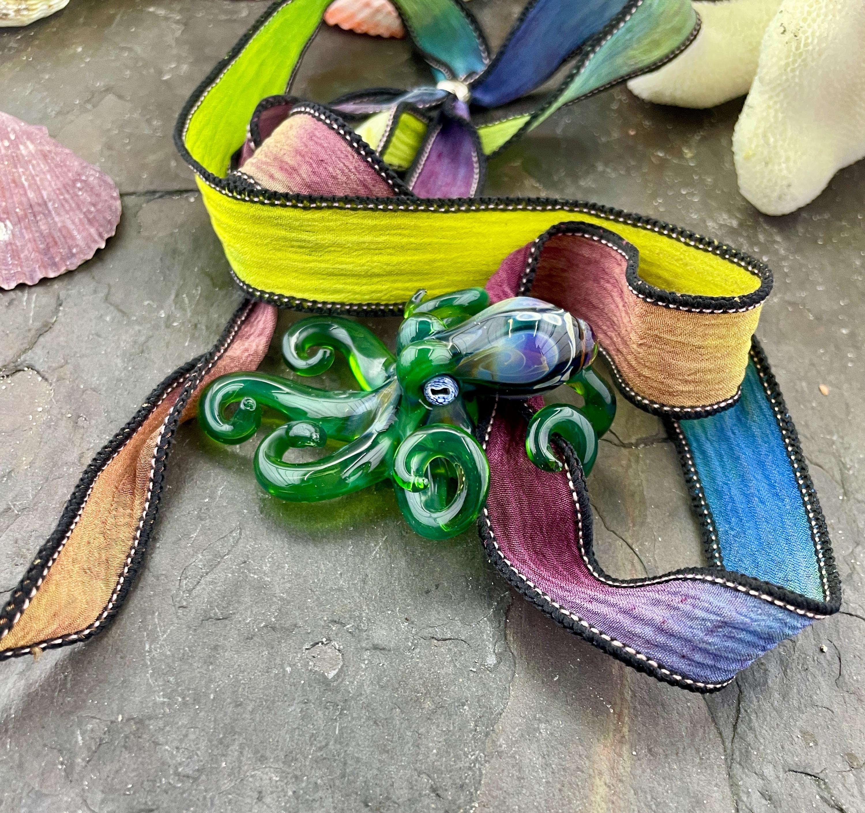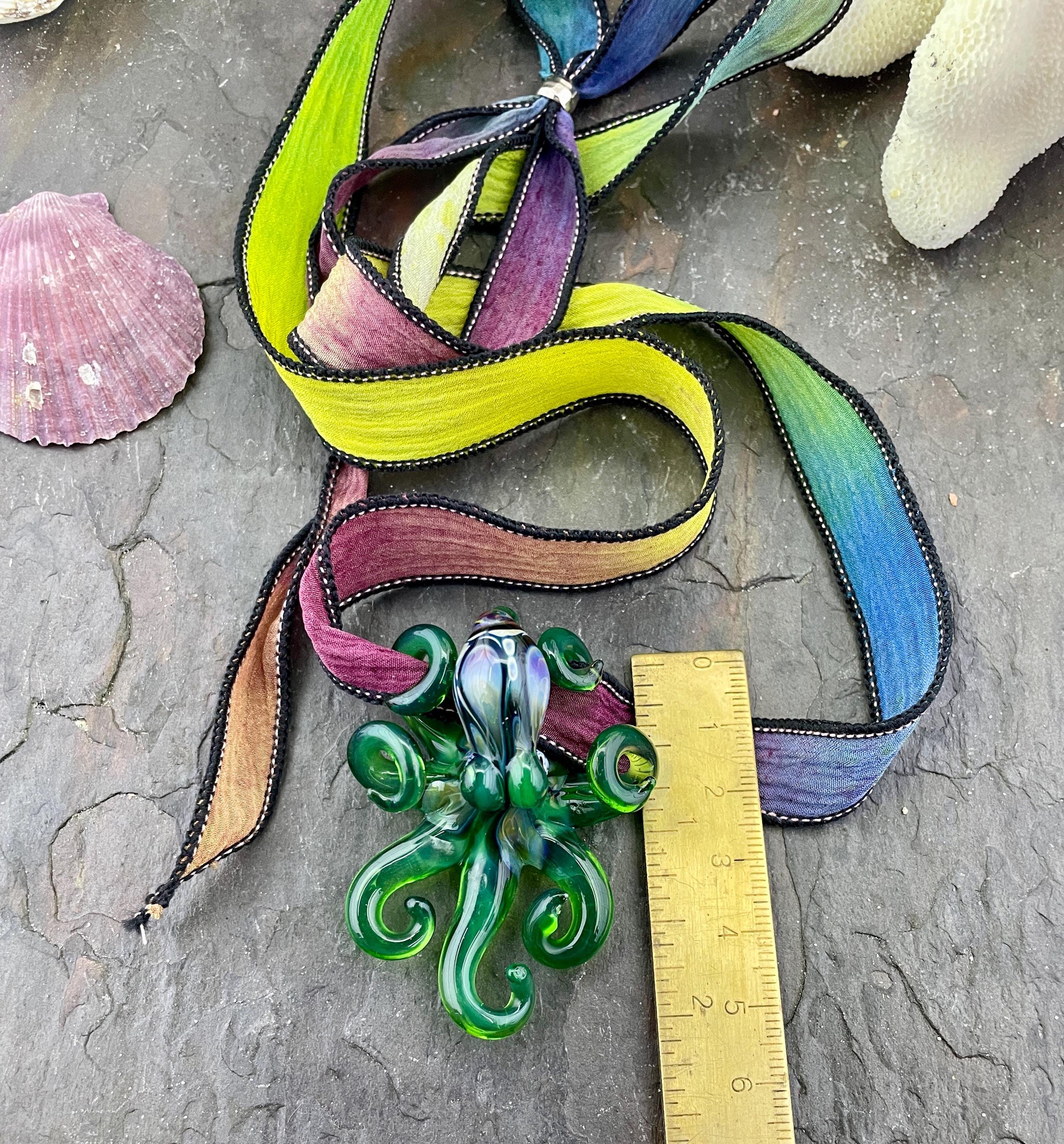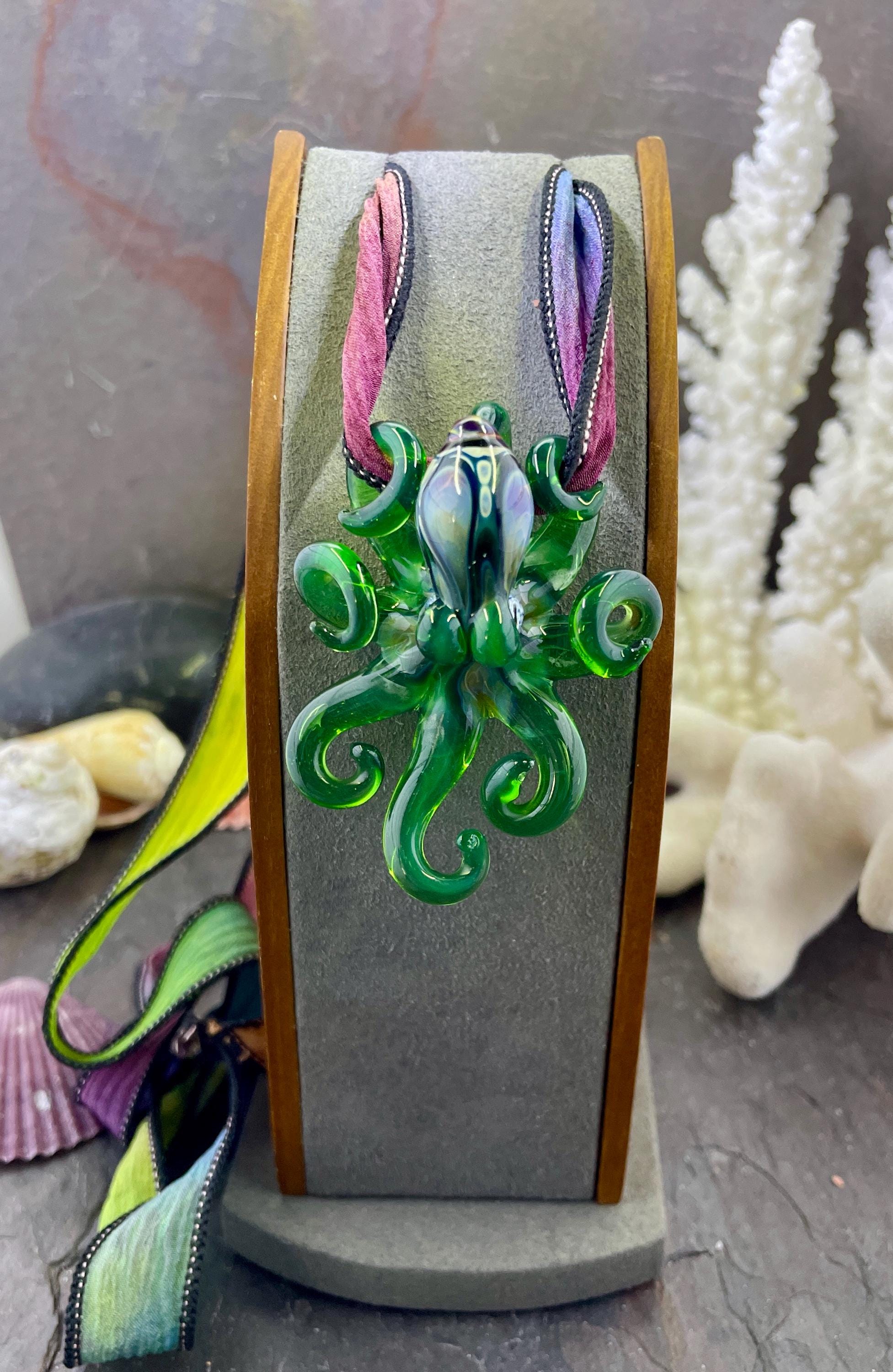 Another boro octopus glass necklace, this is the Green Hunter. A beautiful new green from Lunar Glass with hood markings of the Loki. A nice size at 2" long, formed in the torch using no molds and properly annealed in a digital kiln for durability, this one arrives safely wrapped and attached to an adjustable hand dyed silk necklace. Handmade glass eye chip gives her such realistic eyes, you might want to keep her on her rope, just in case! Really fun and safe to wear, for a truly dramatic look! Marked on the bottom with the Maker's Mark "M" while still molten..