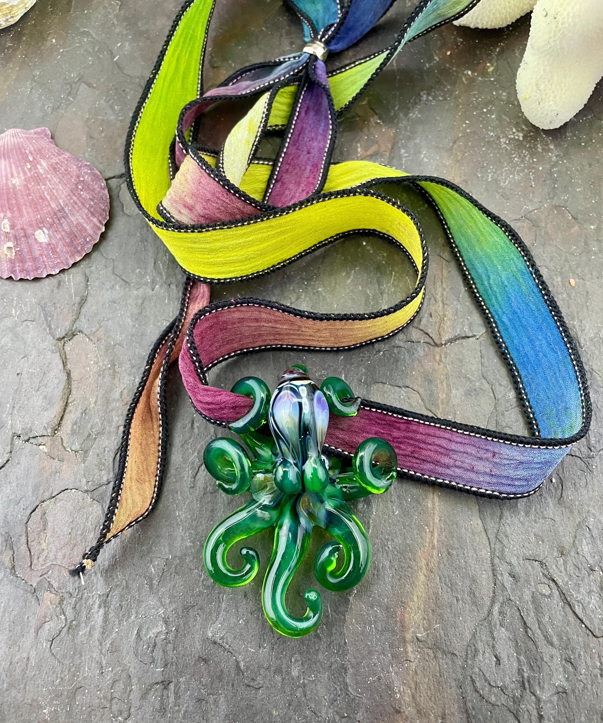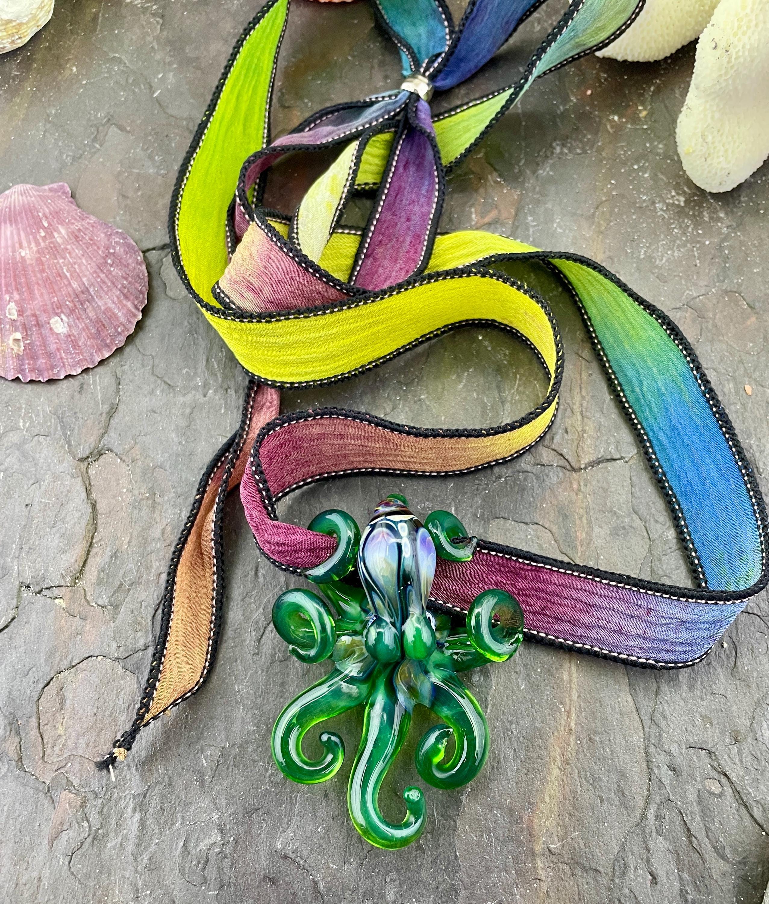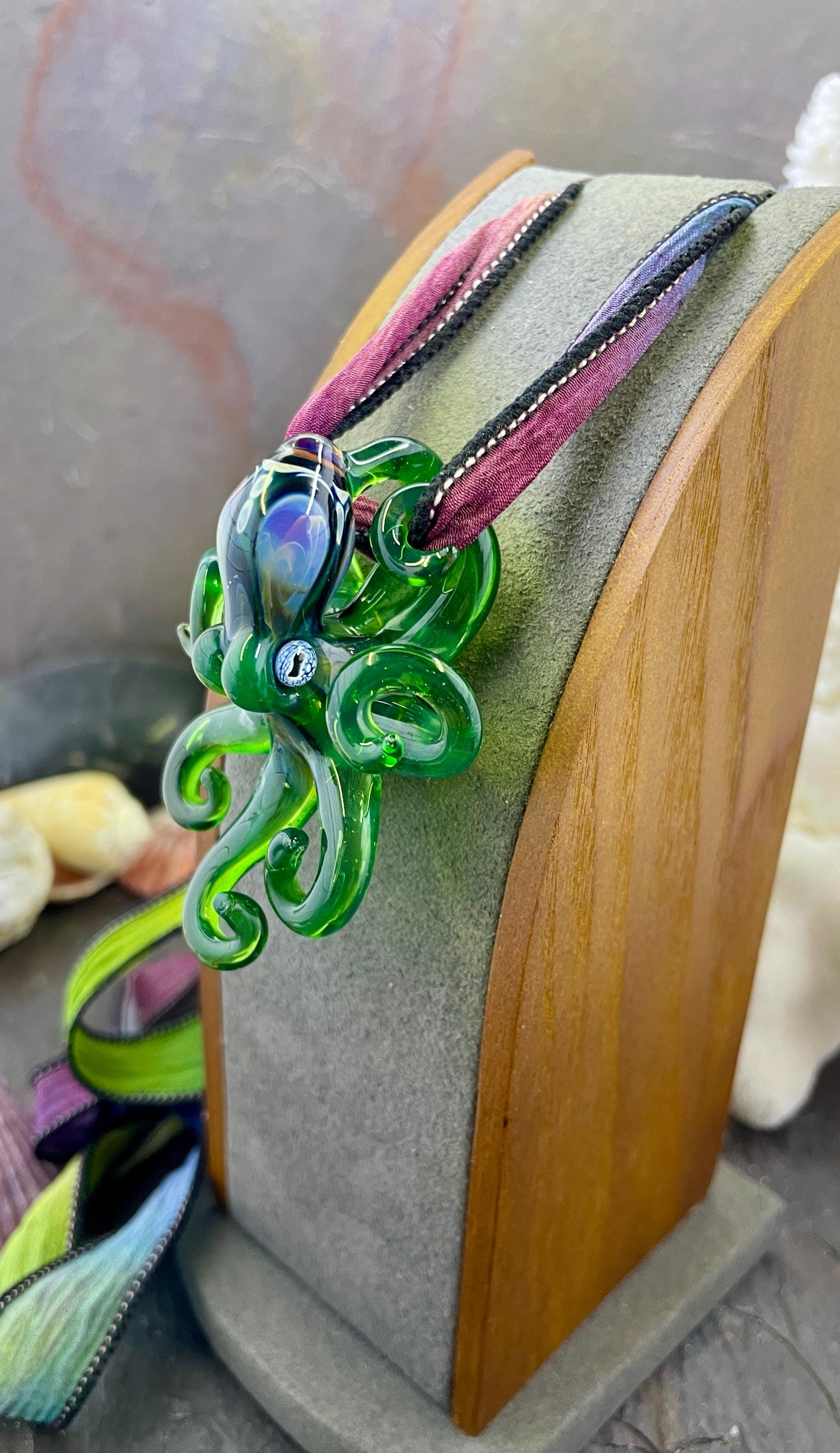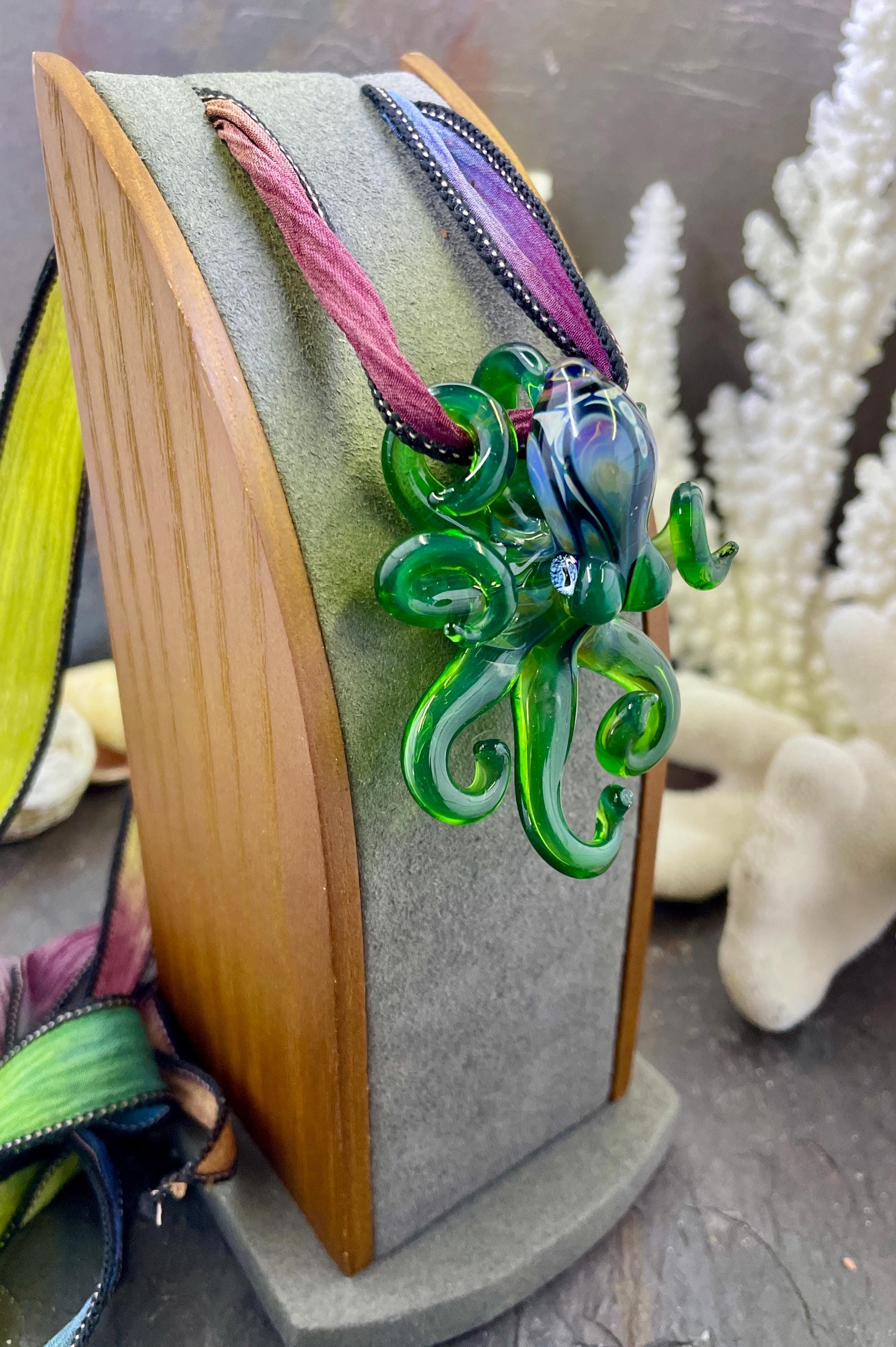 Another boro octopus glass necklace, this is the Green Hunter. A beautiful new green from Lunar Glass with hood markings of the Loki. A nice size at 2" long, formed in the torch using no molds and properly annealed in a digital kiln for durability, this one arrives safely wrapped and attached to an adjustable hand dyed silk necklace. Handmade glass eye chip gives her such realistic eyes, you might want to keep her on her rope, just in case! Really fun and safe to wear, for a truly dramatic look! Marked on the bottom with the Maker's Mark "M" while still molten..