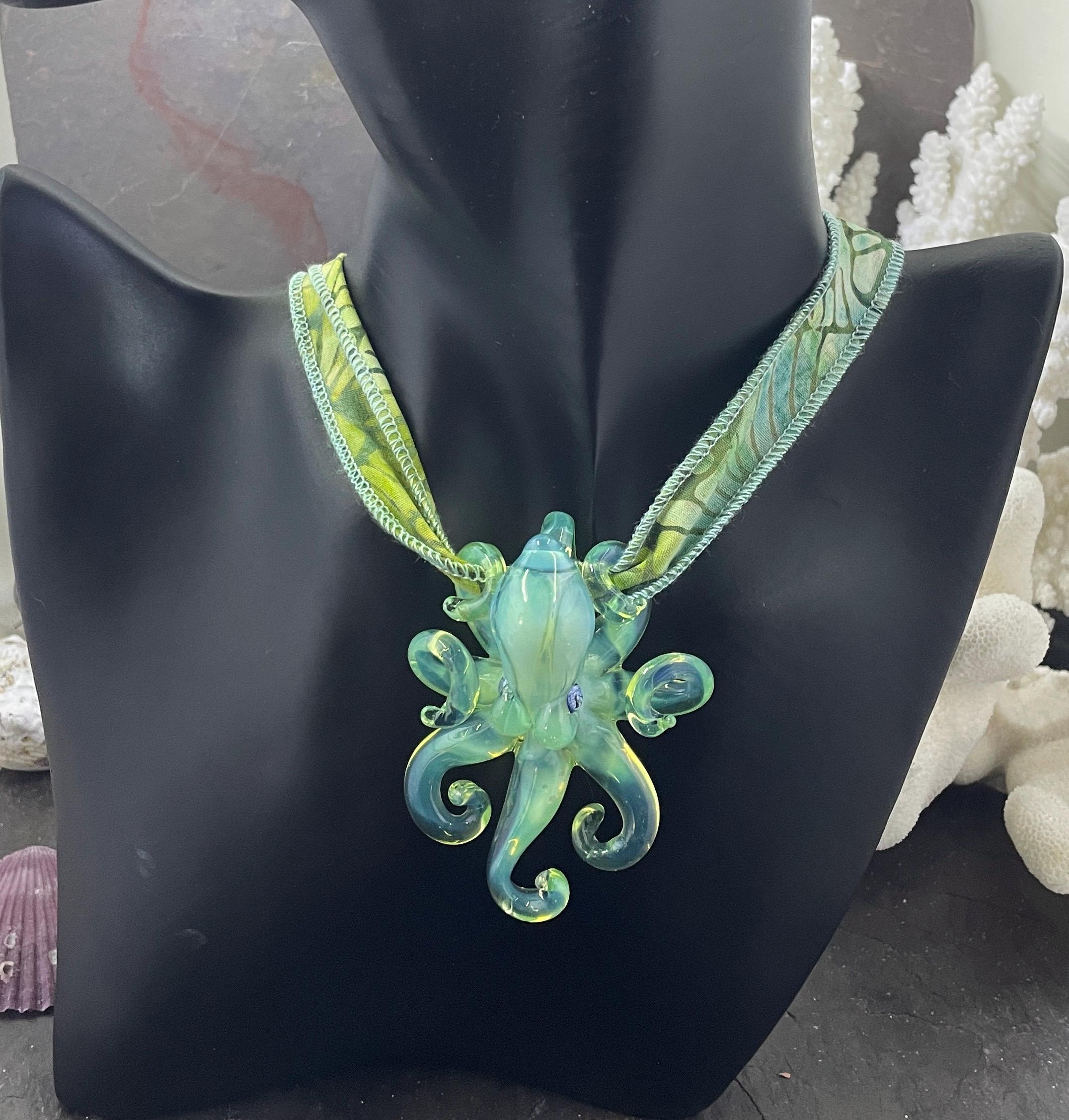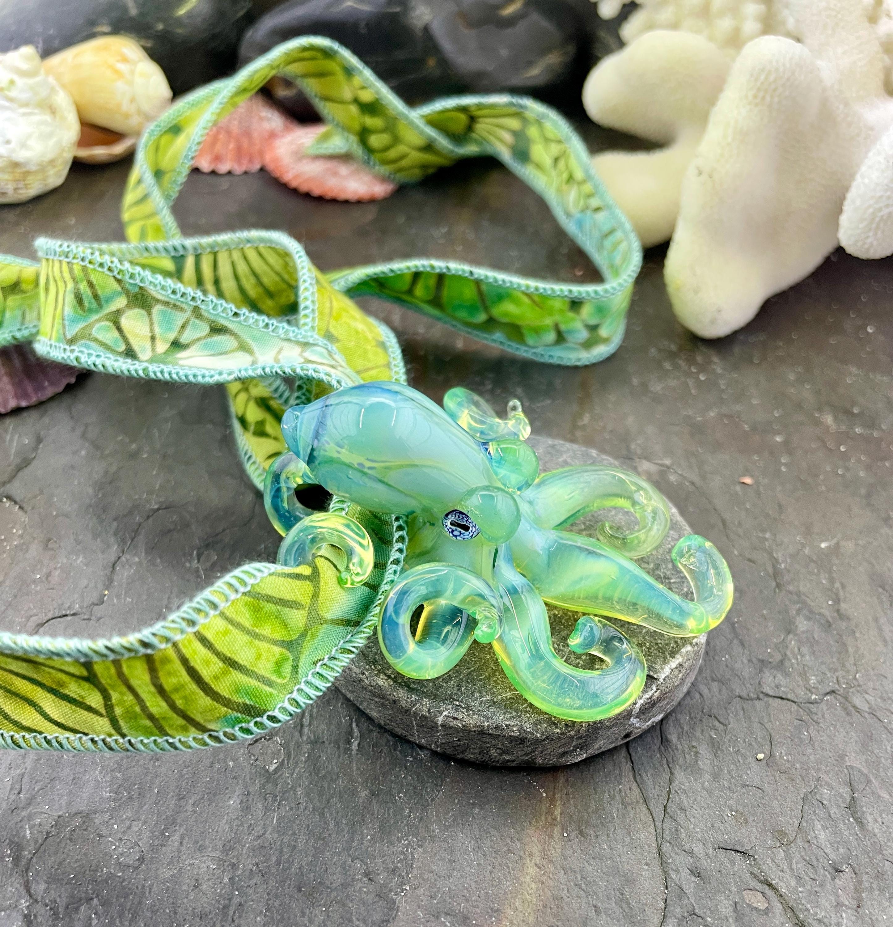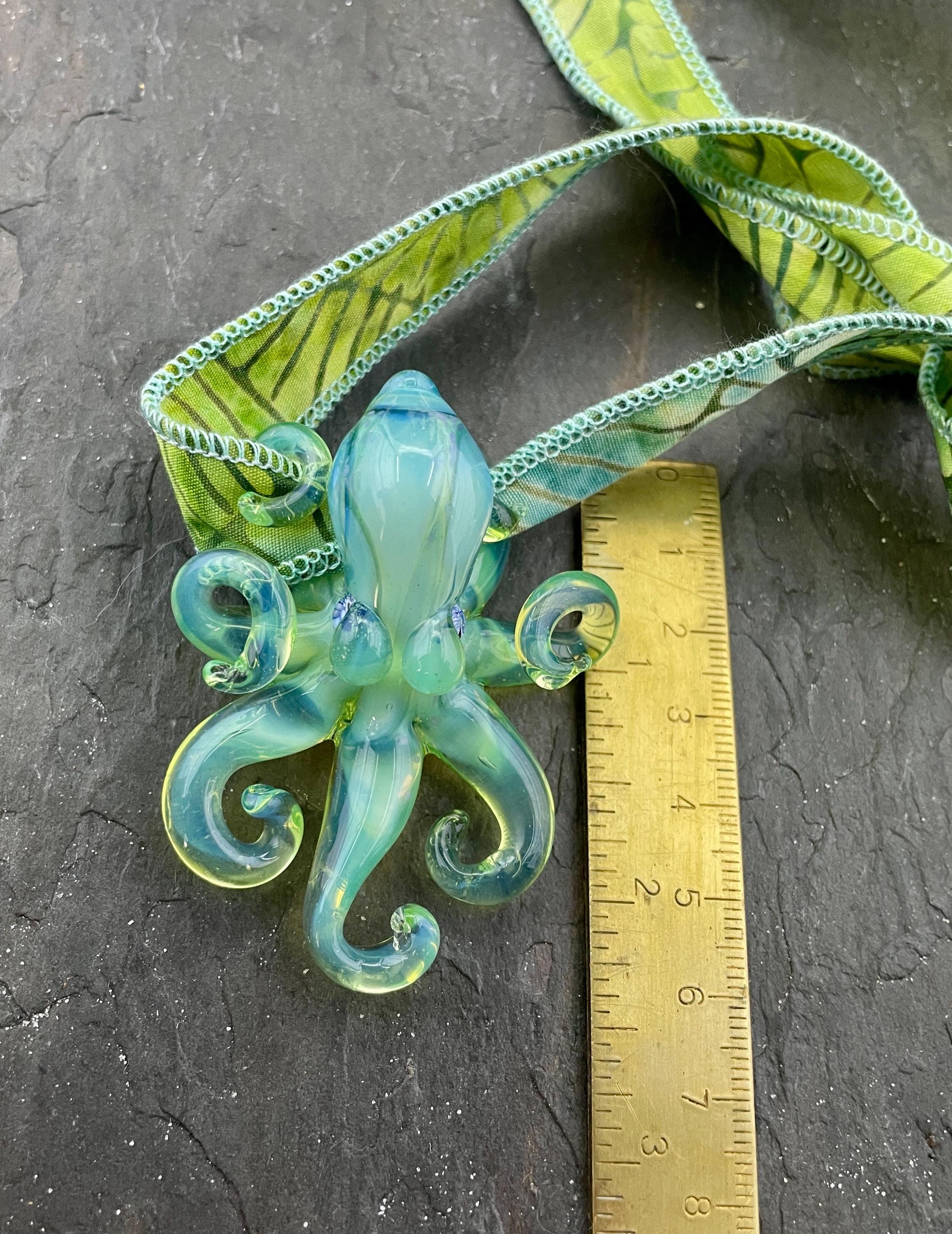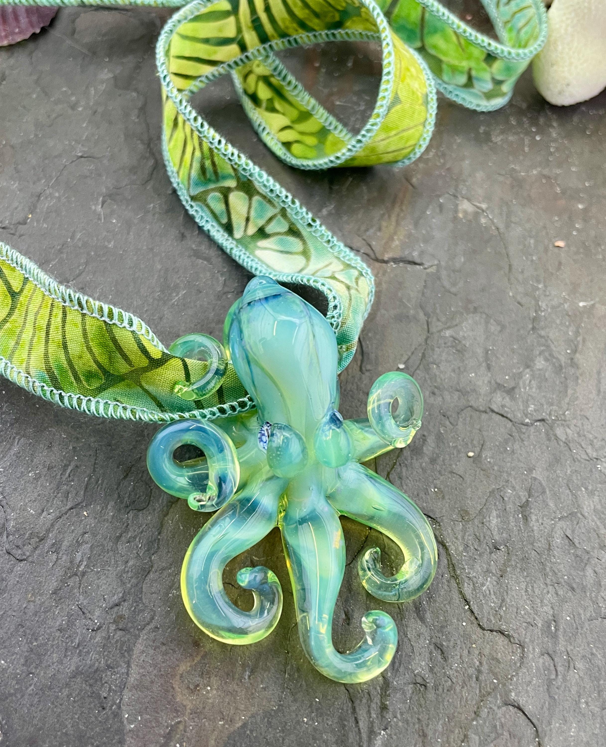 Another boro octopus glass necklace, this is the Green WVe from Lunar Glass! A beautiful Opal green with four layer hood markings to get that Titan green. A nice size at 2.25" long, formed in the torch using no molds and properly annealed in a digital kiln for durability, this one arrives safely wrapped and attached to a 24" hand batiked ribbon necklace. Handmade glass eye chip gives her such realistic eyes, you might want to keep her on her rope, just in case! Really fun and safe to wear, for a truly dramatic look! Marked on the bottom with the Maker's Mark "M" while still molten..