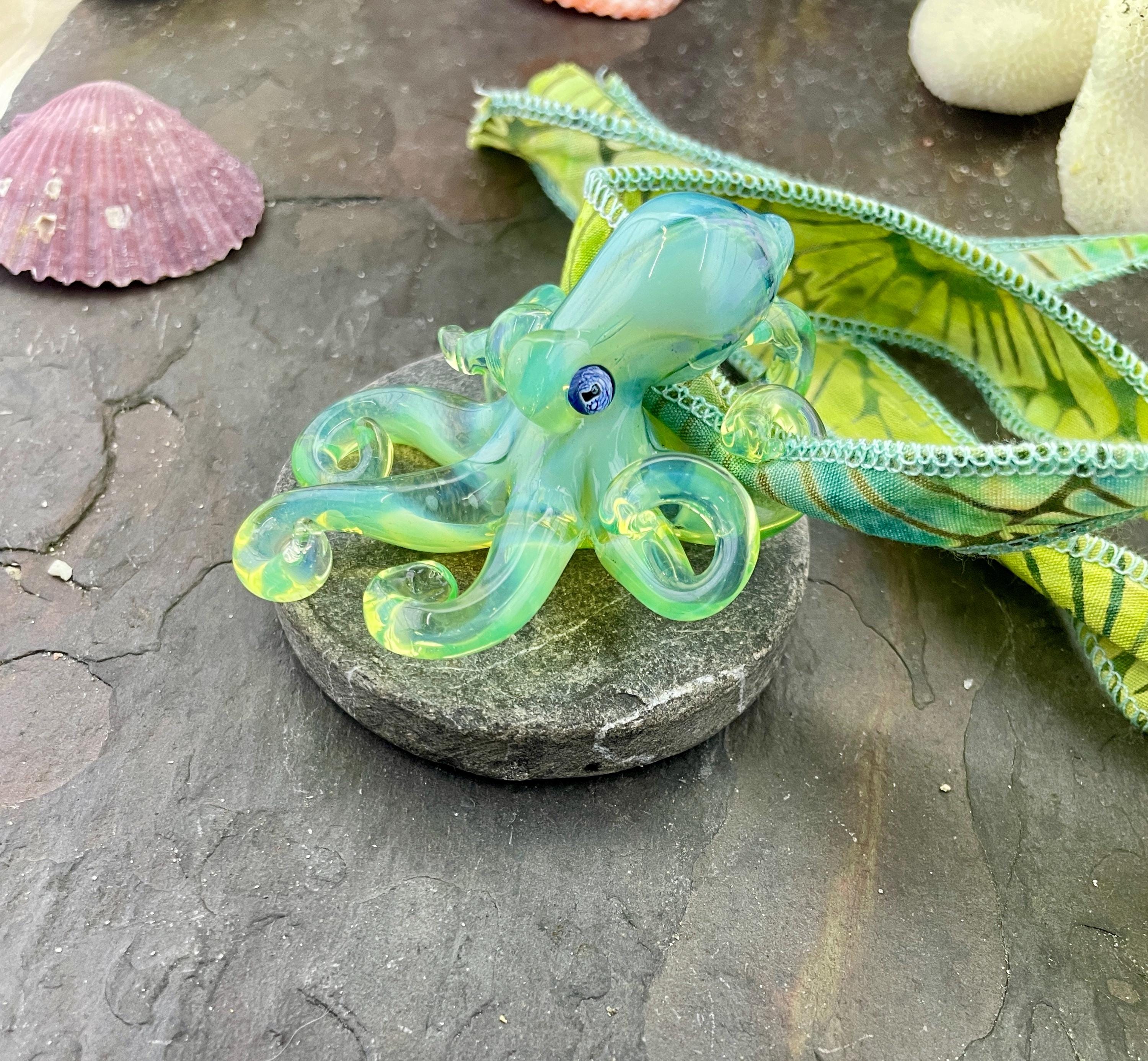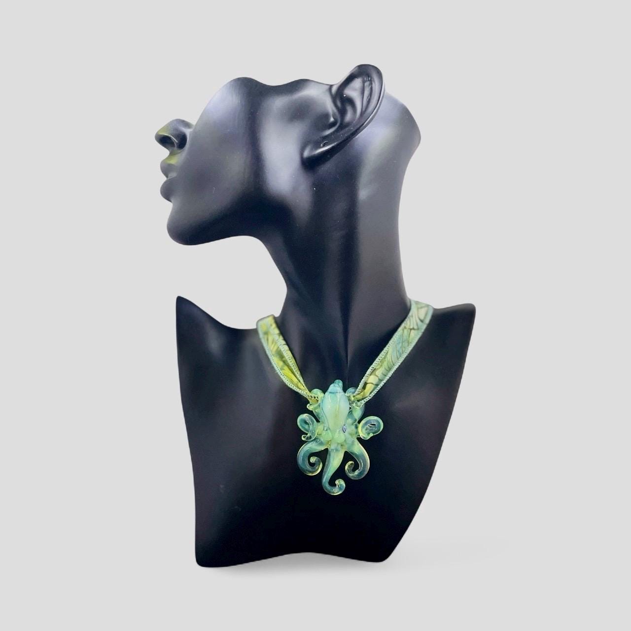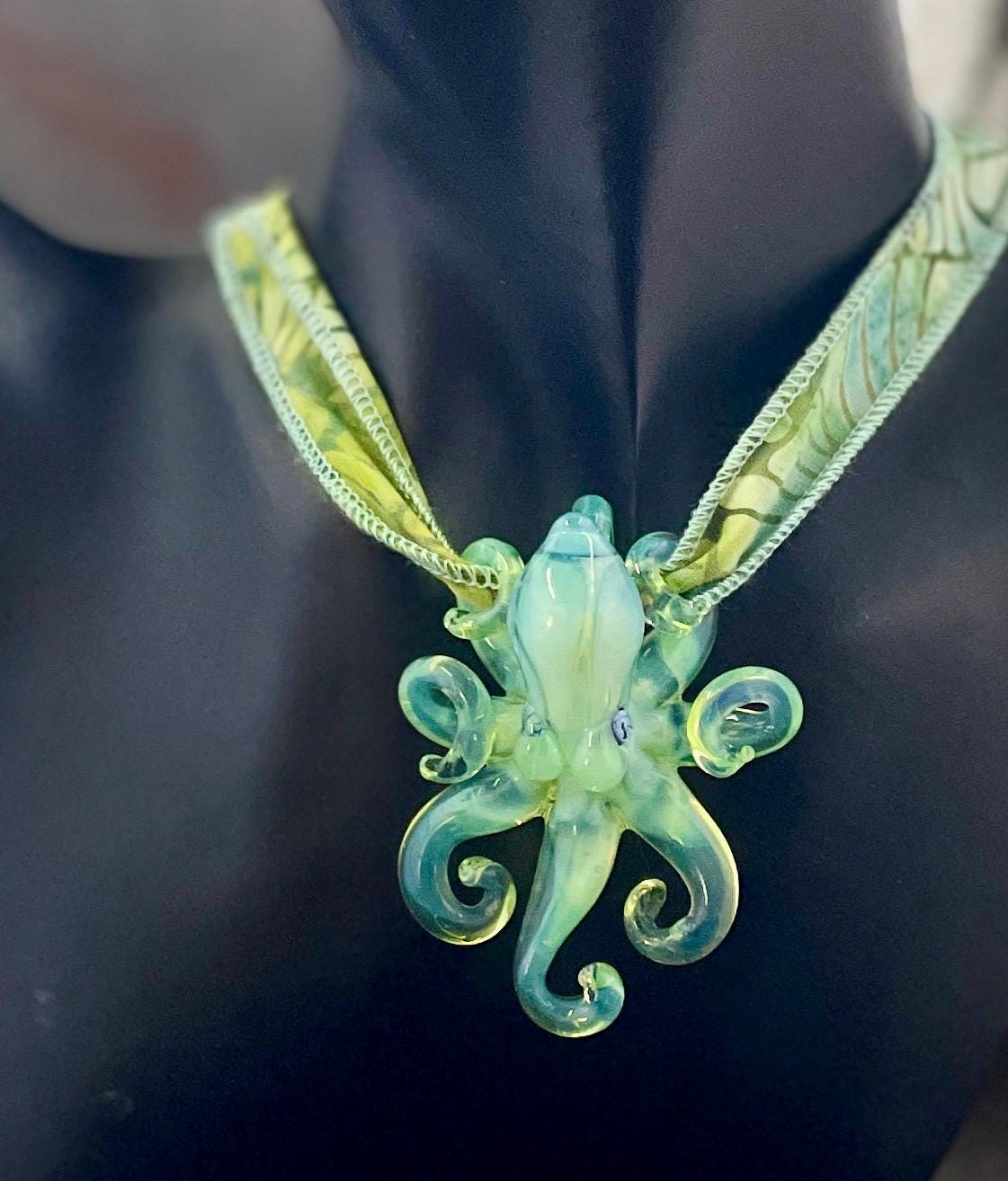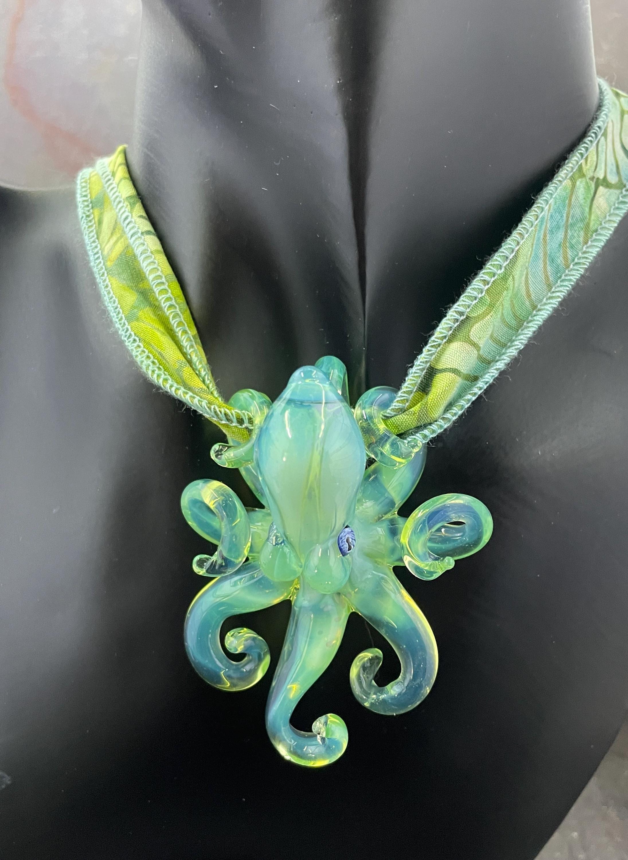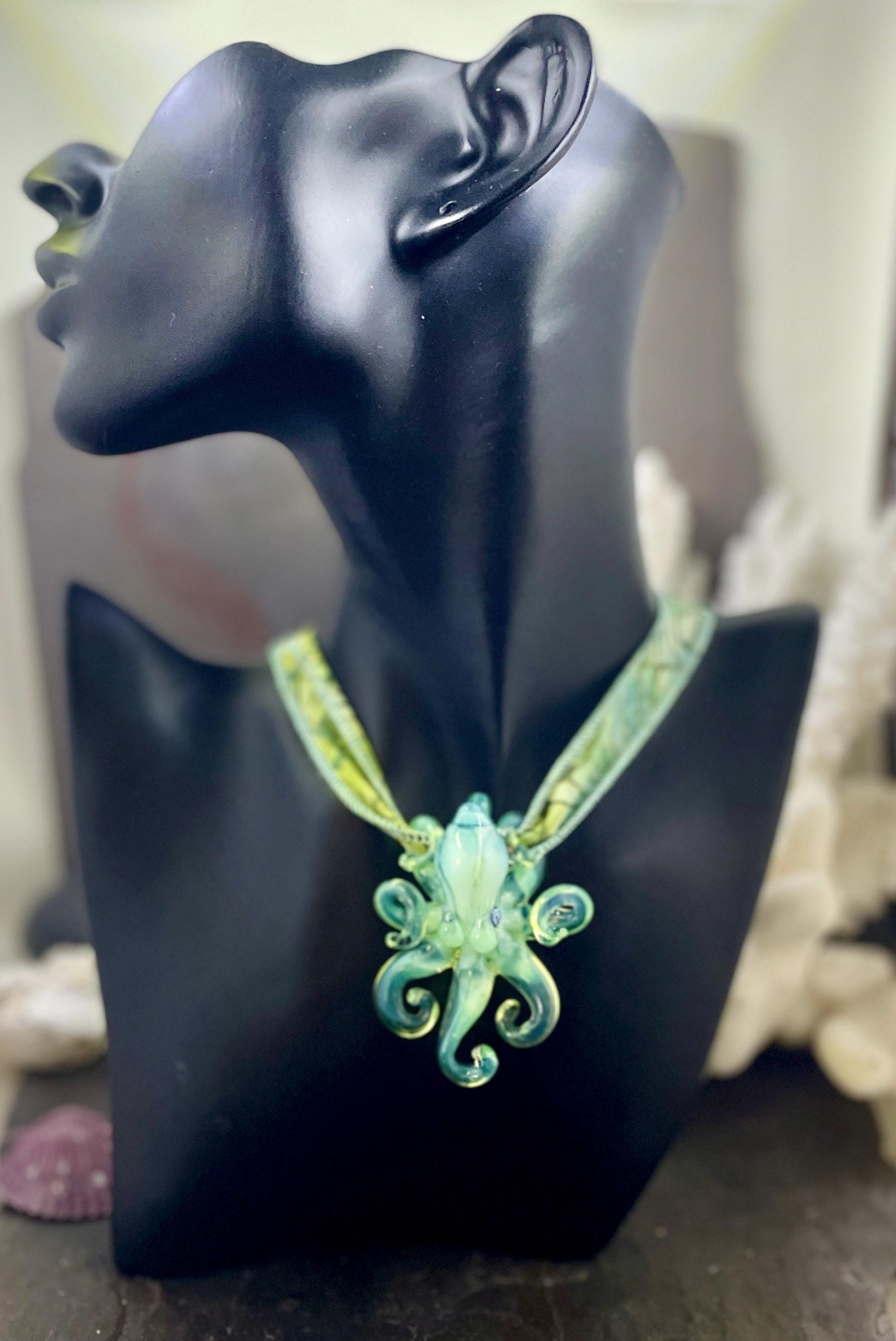 Another boro octopus glass necklace, this is the Green WVe from Lunar Glass! A beautiful Opal green with four layer hood markings to get that Titan green. A nice size at 2.25" long, formed in the torch using no molds and properly annealed in a digital kiln for durability, this one arrives safely wrapped and attached to a 24" hand batiked ribbon necklace. Handmade glass eye chip gives her such realistic eyes, you might want to keep her on her rope, just in case! Really fun and safe to wear, for a truly dramatic look! Marked on the bottom with the Maker's Mark "M" while still molten..