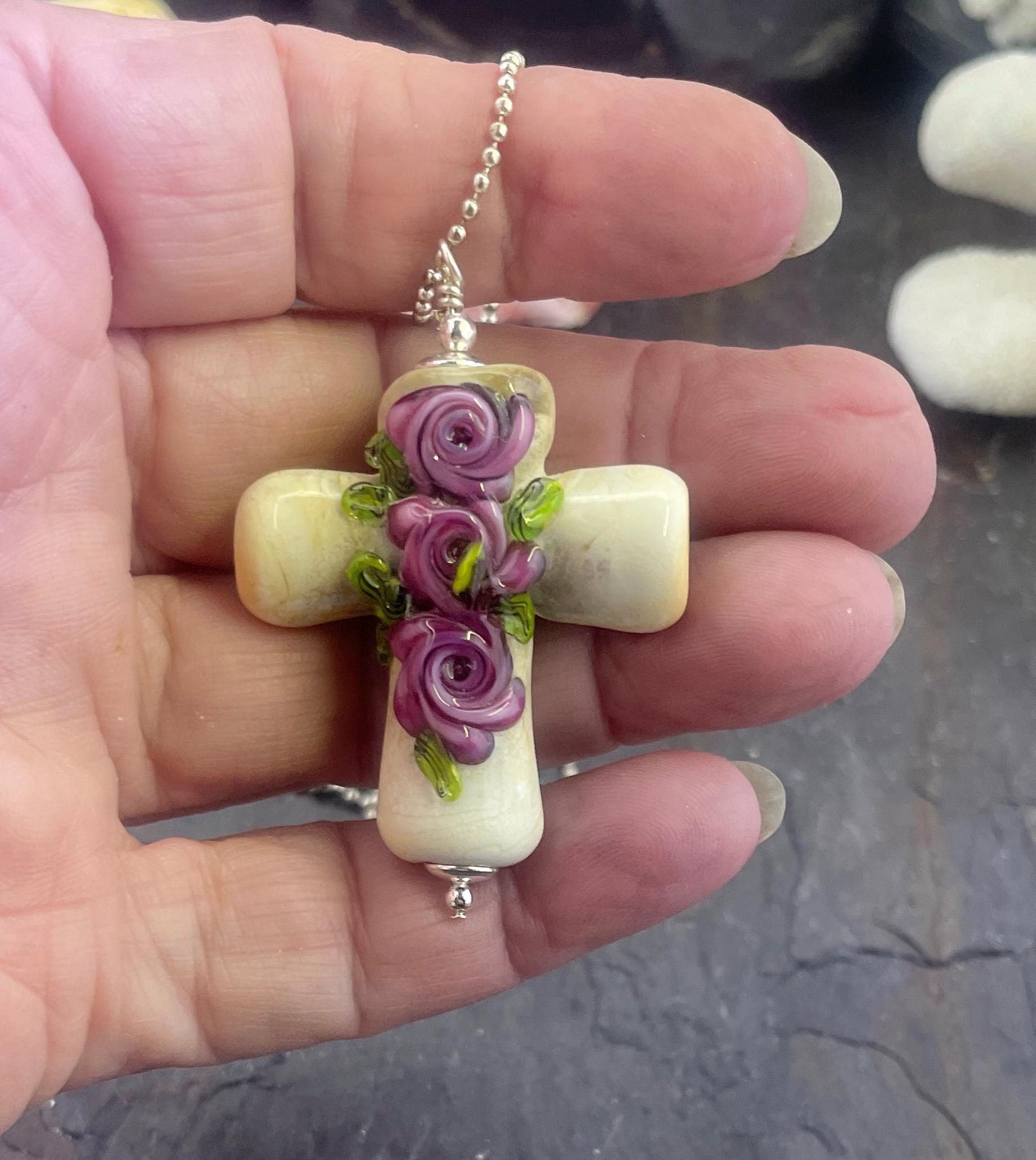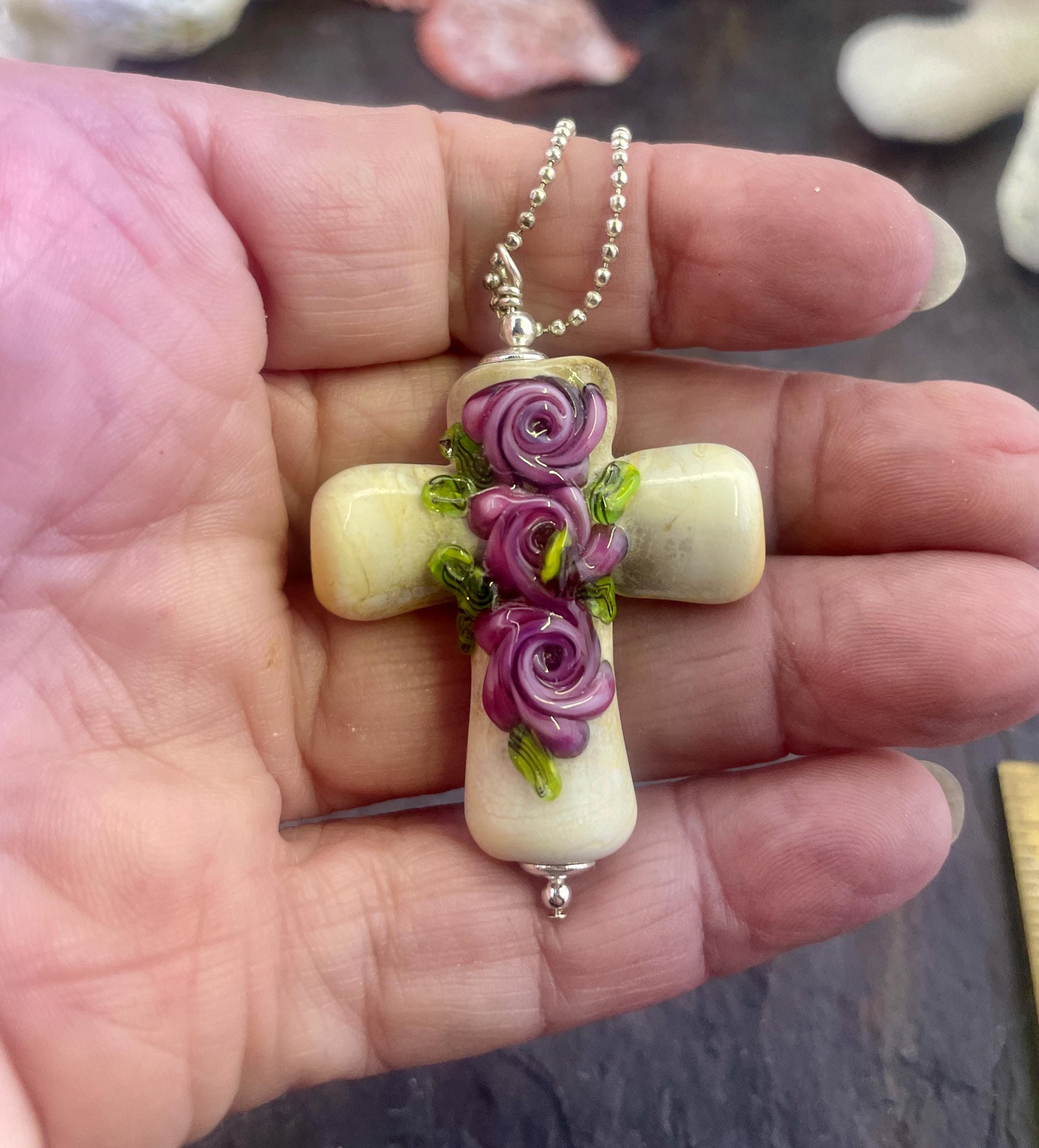 A nice ancient ivory glass cross with the traditional roses, this time in beautiful purple. Cross is approximately 2.5" top to bottom. Formed in the torch and annealed in a digital kiln for durability, this one is ready to wear on it's 24" silver mini ball chain.