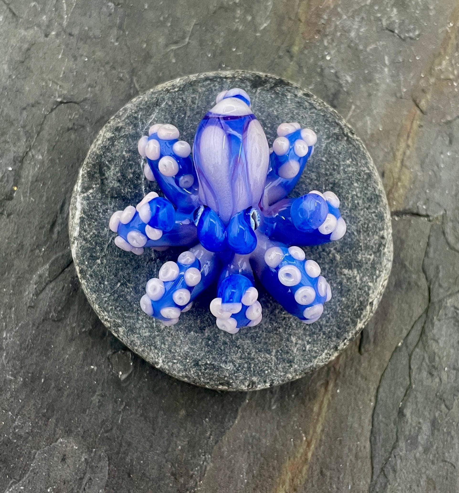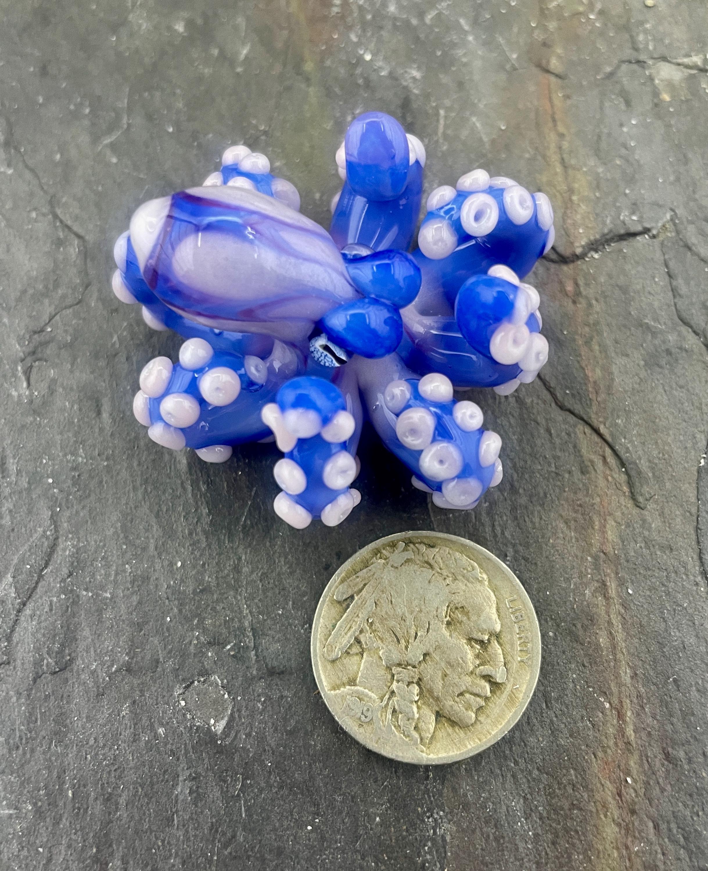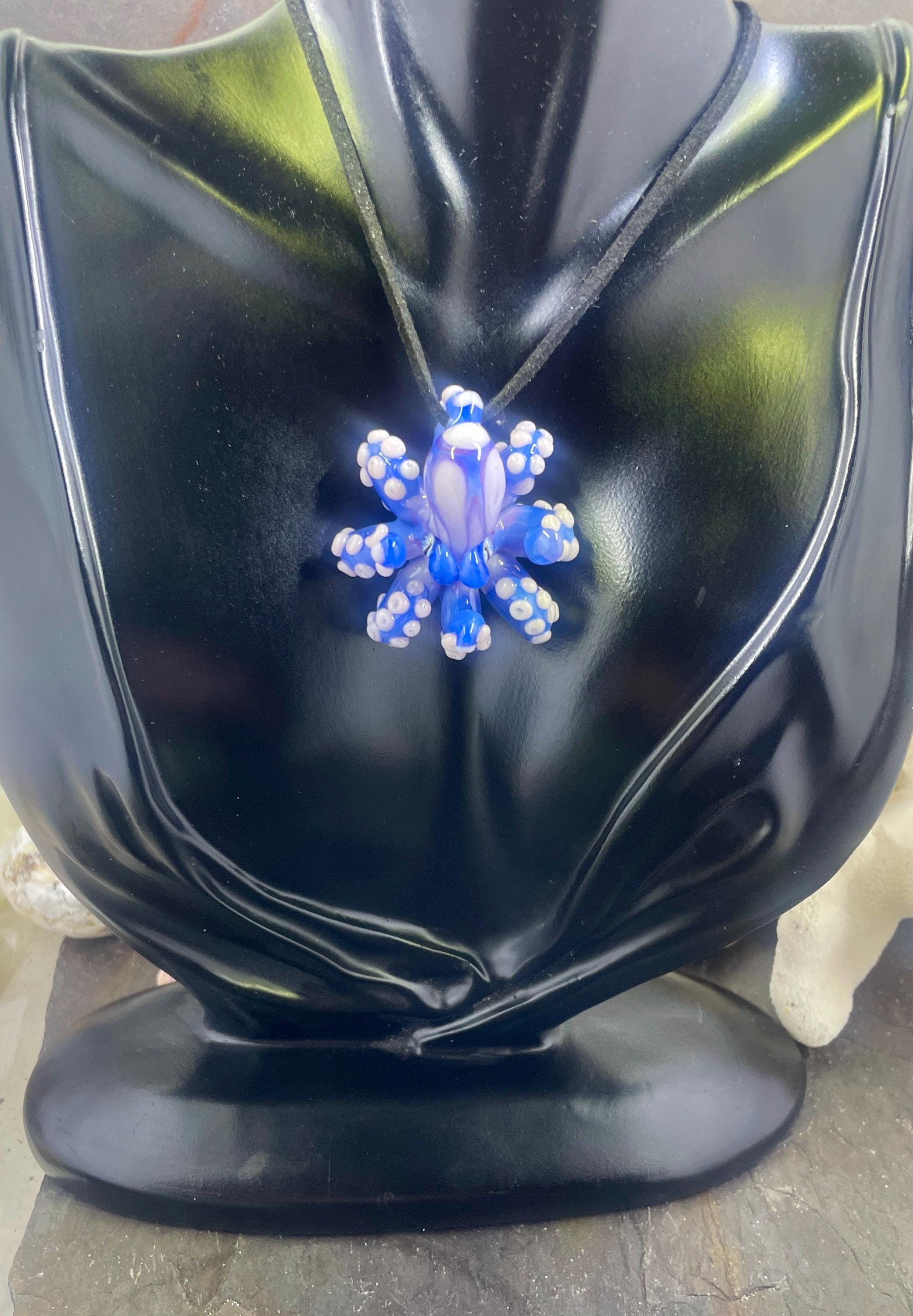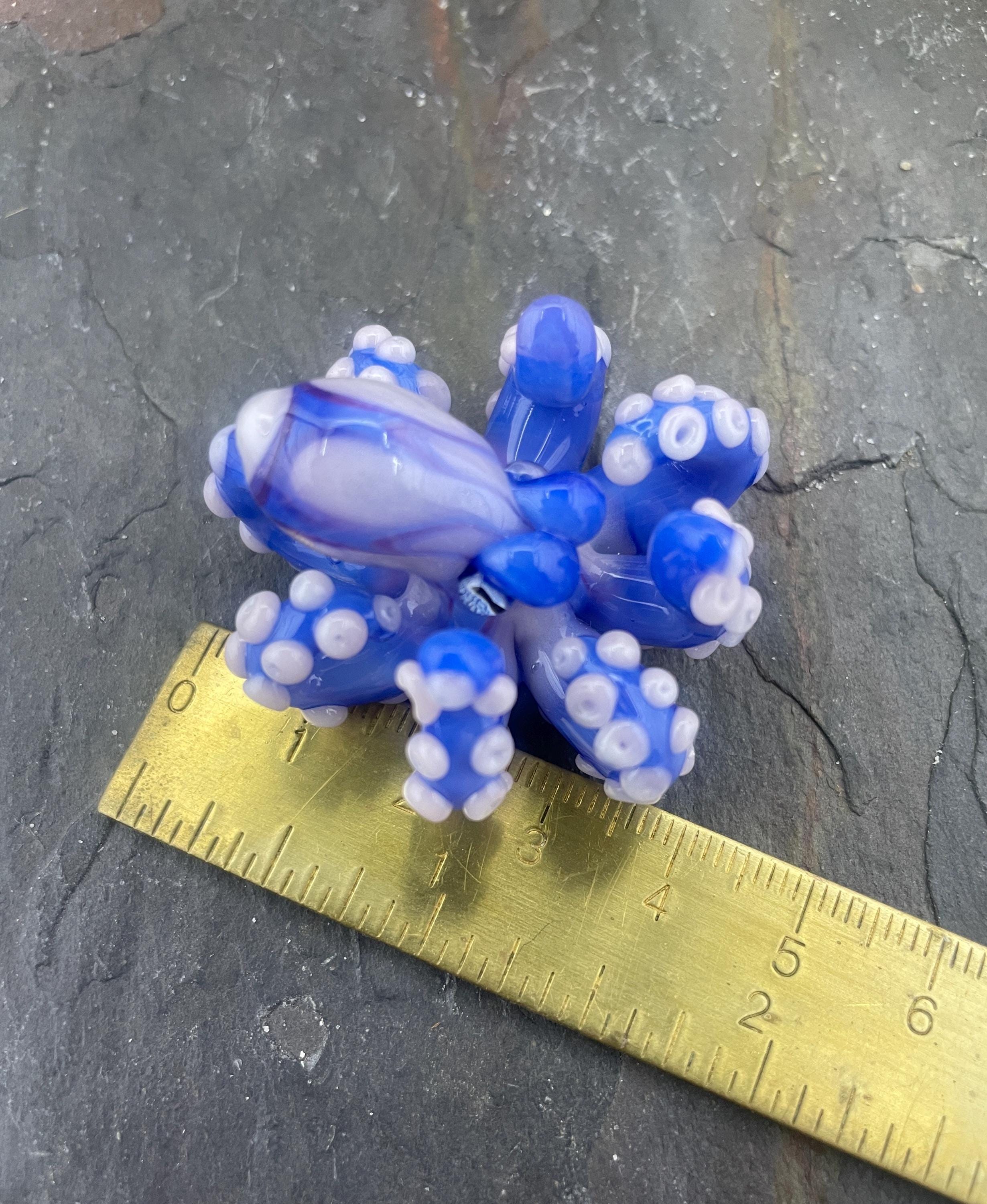 Another of my new favorites.... a mini Blue Opal from Lunar Glass with the beautiful pink of Parramore pink. This one is right around 1.5" across. This is a new style, with many, many little tiny pink suckers. She is holding tight to an adjustable black silk cord necklace. Formed in the torch using no molds and properly annealed in a digital kiln for durability, this one arrives safely wrapped in a fun reusable tin box. Handmade glass eye chip gives her such realistic eyes, you might want to keep her on her cord, just in case! Really fun and safe to wear, for a truly dramatic look! Marked on the bottom with the Maker's Mark "M" while still molten..