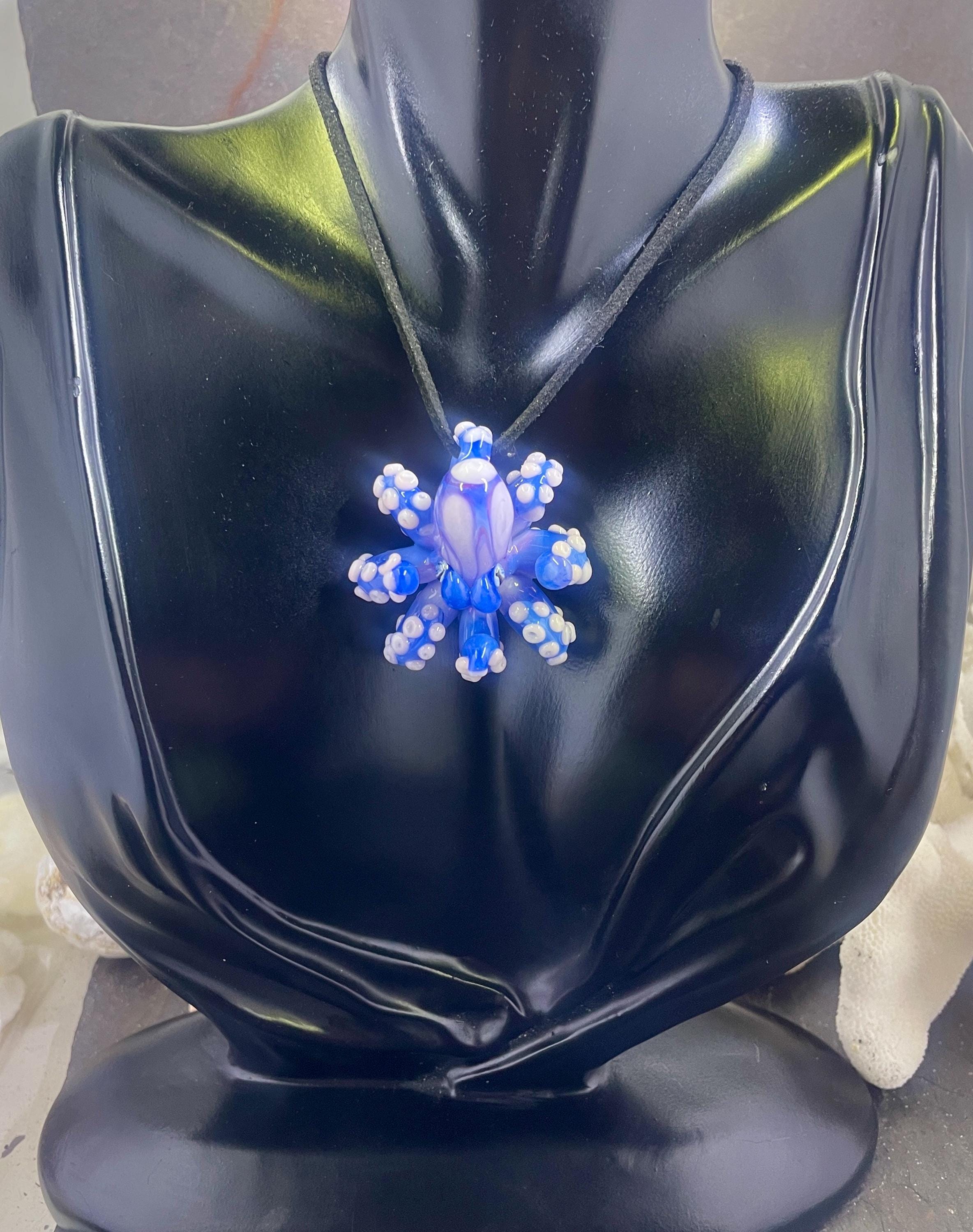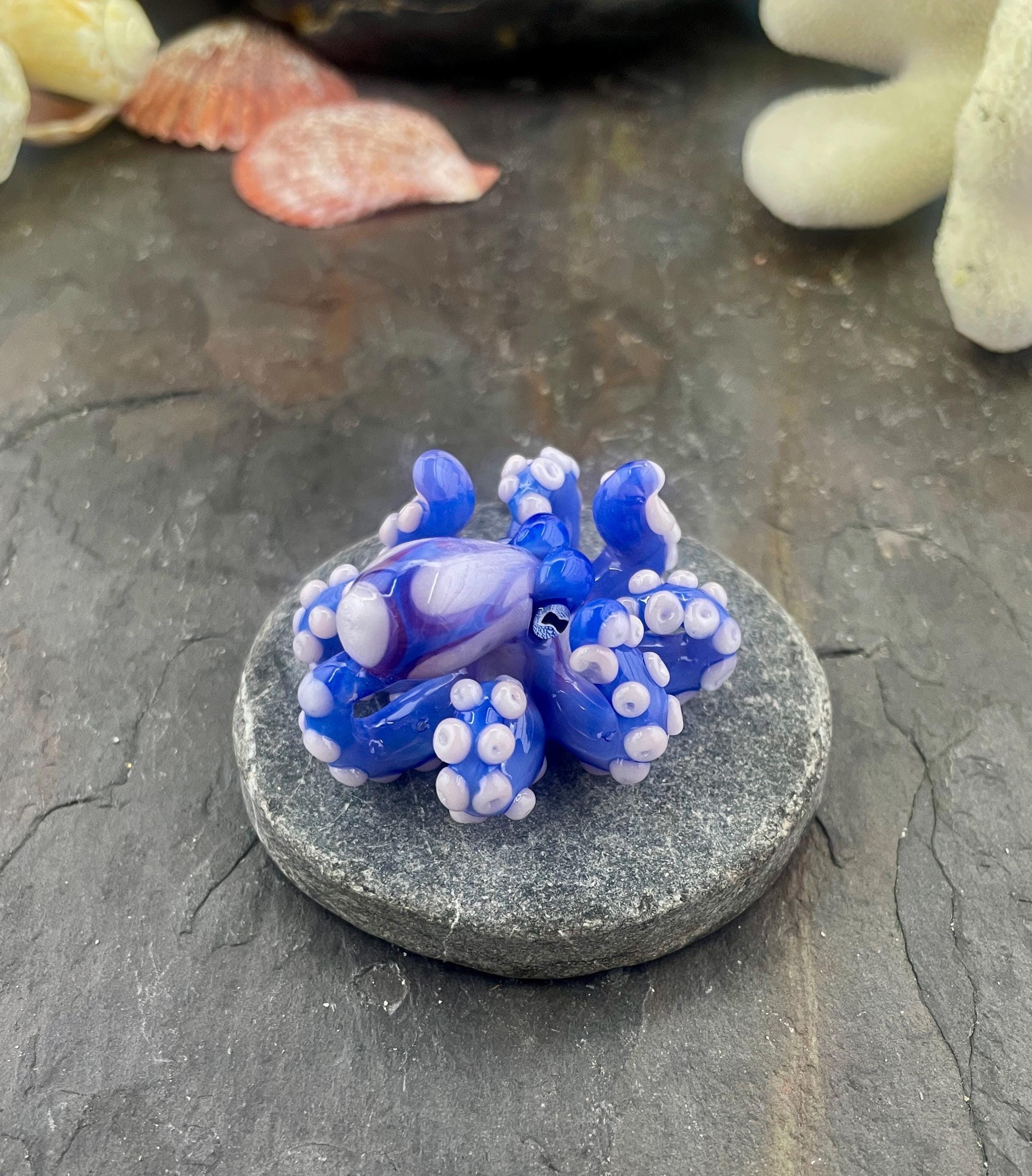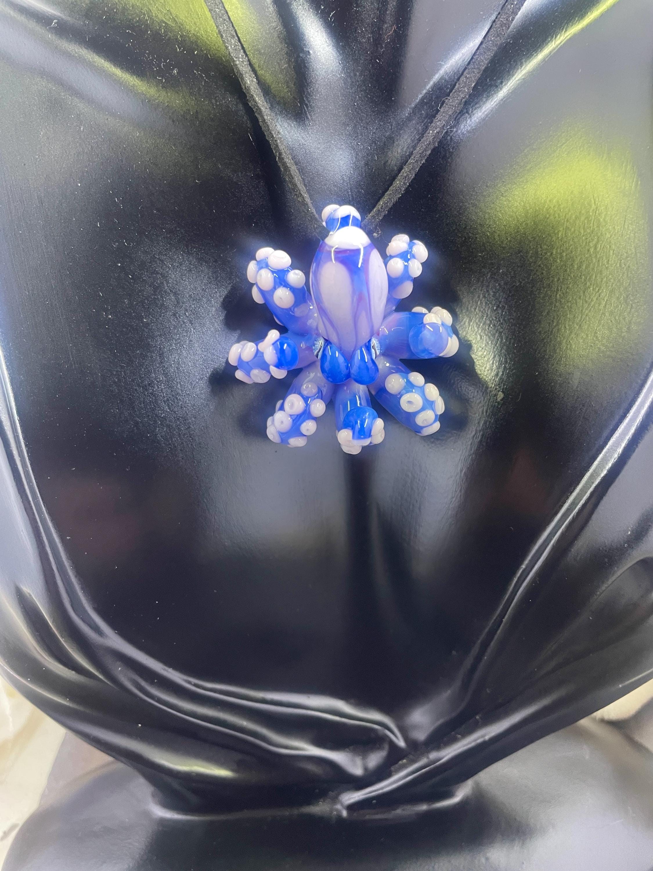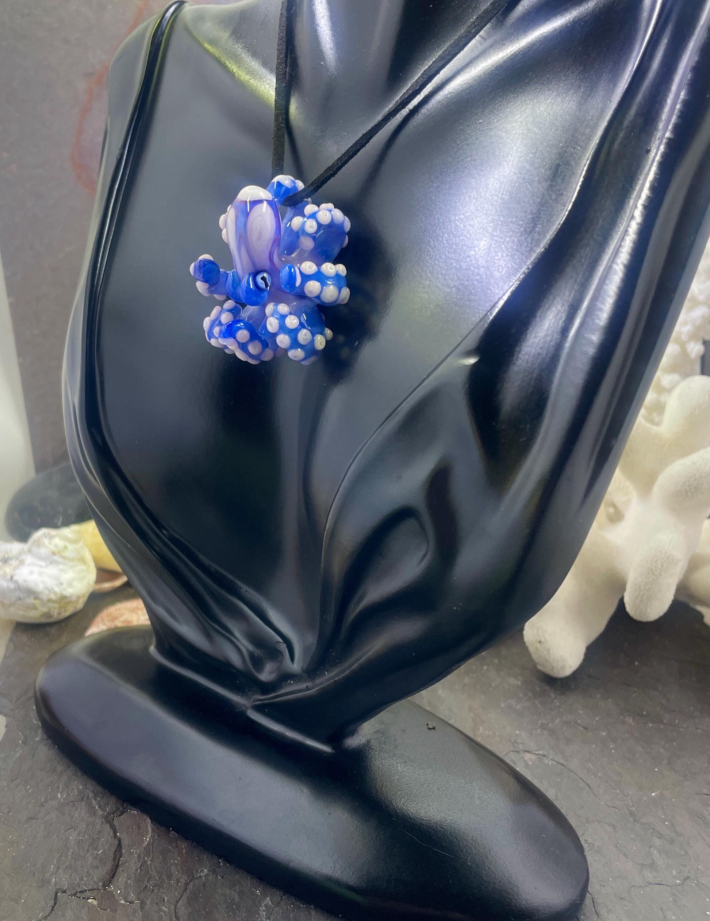 Another of my new favorites.... a mini Blue Opal from Lunar Glass with the beautiful pink of Parramore pink. This one is right around 1.5" across. This is a new style, with many, many little tiny pink suckers. She is holding tight to an adjustable black silk cord necklace. Formed in the torch using no molds and properly annealed in a digital kiln for durability, this one arrives safely wrapped in a fun reusable tin box. Handmade glass eye chip gives her such realistic eyes, you might want to keep her on her cord, just in case! Really fun and safe to wear, for a truly dramatic look! Marked on the bottom with the Maker's Mark "M" while still molten..