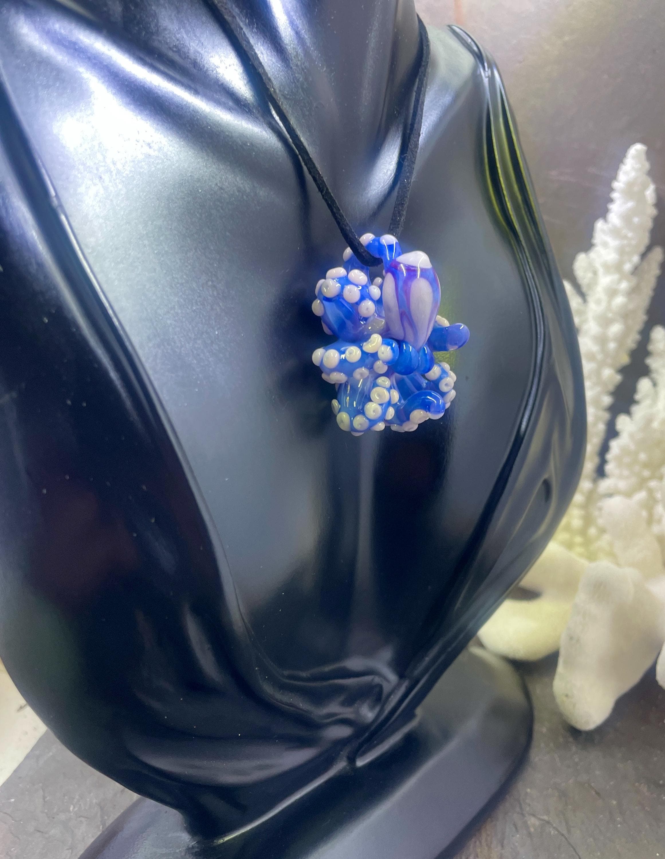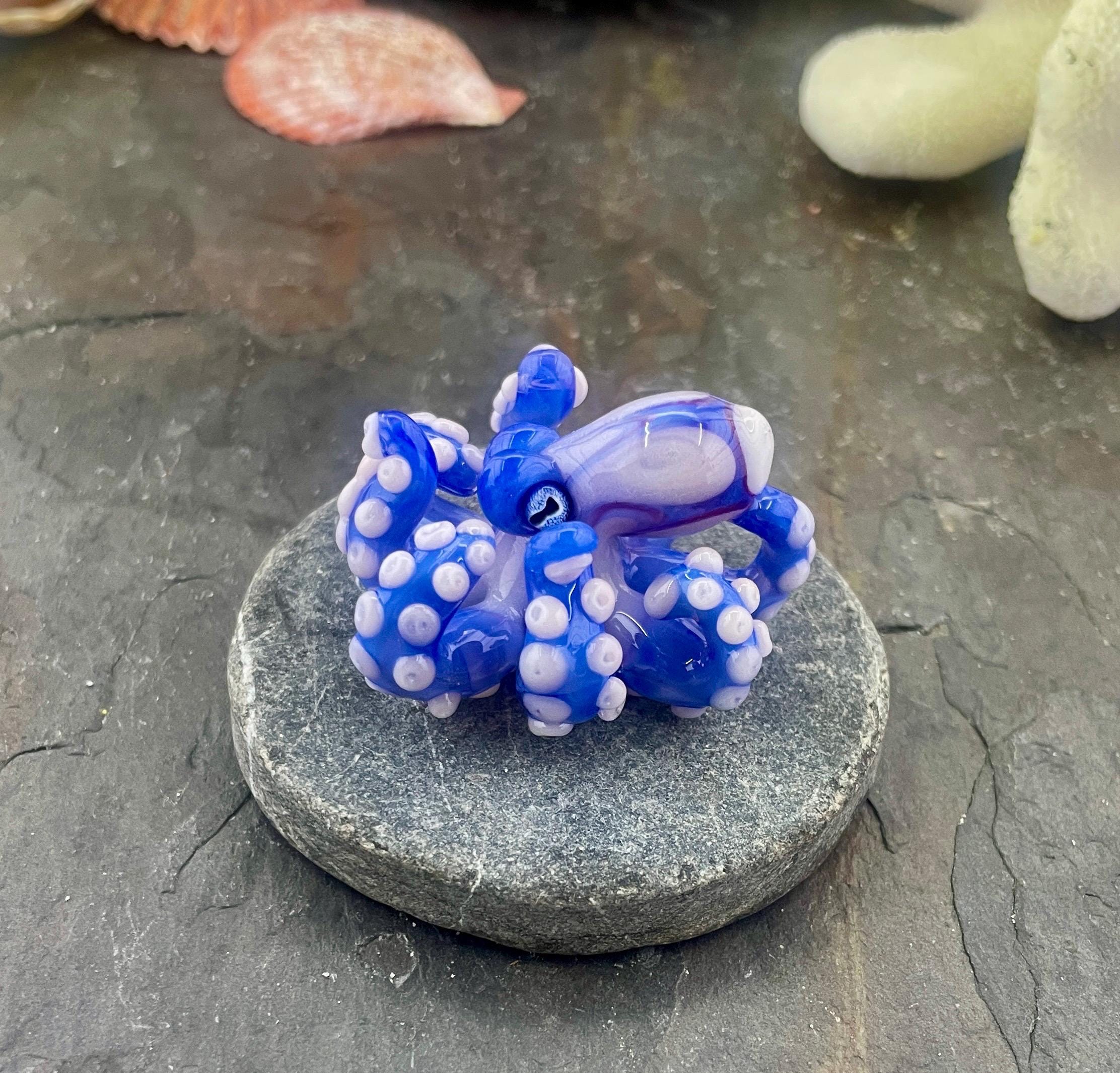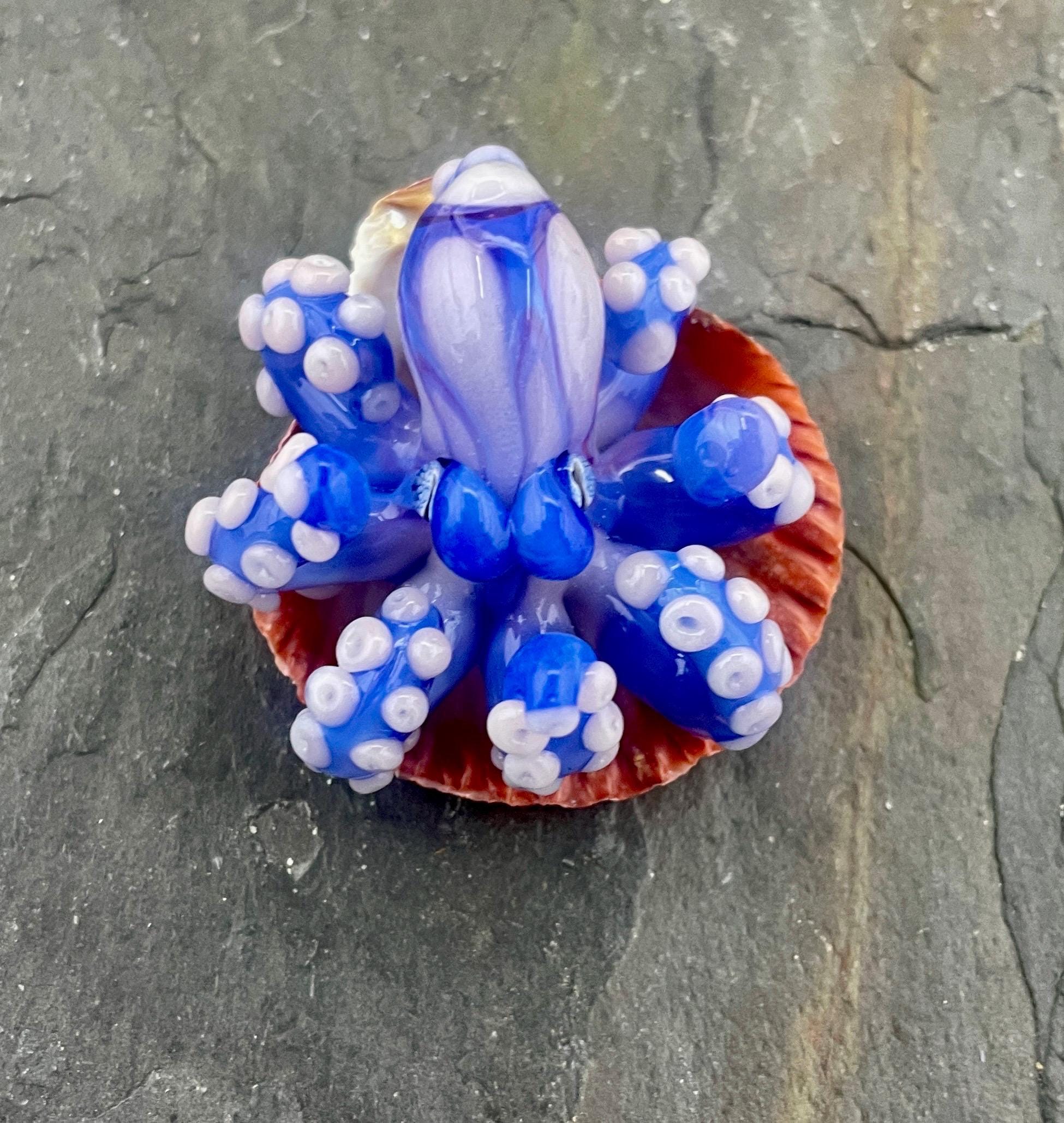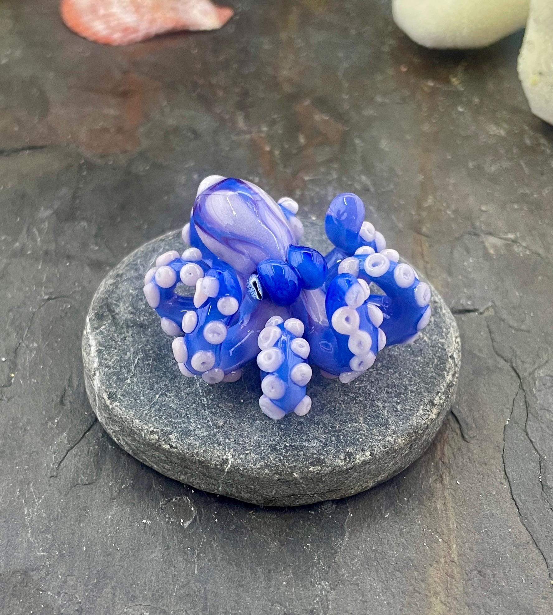Another of my new favorites.... a mini Blue Opal from Lunar Glass with the beautiful pink of Parramore pink. This one is right around 1.5" across. This is a new style, with many, many little tiny pink suckers. She is holding tight to an adjustable black silk cord necklace. Formed in the torch using no molds and properly annealed in a digital kiln for durability, this one arrives safely wrapped in a fun reusable tin box. Handmade glass eye chip gives her such realistic eyes, you might want to keep her on her cord, just in case! Really fun and safe to wear, for a truly dramatic look! Marked on the bottom with the Maker's Mark "M" while still molten..