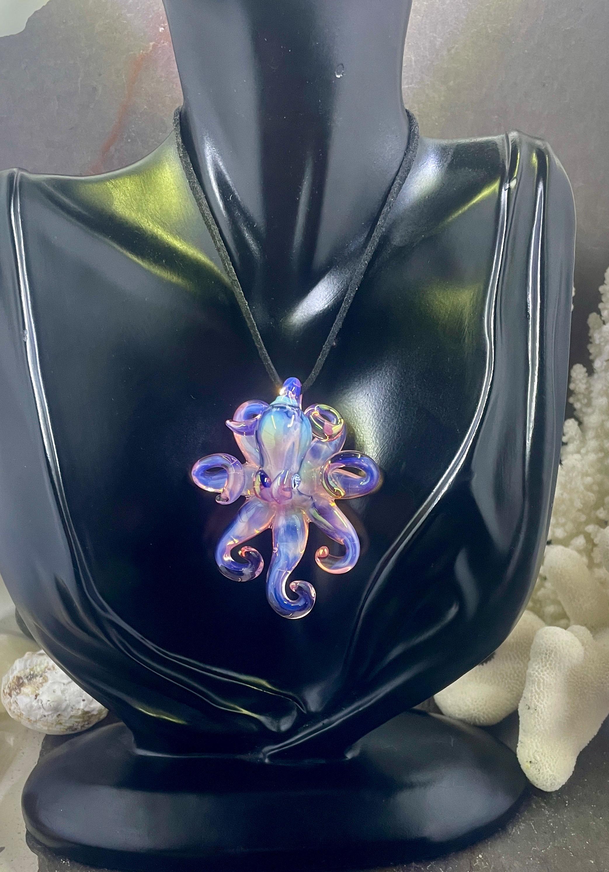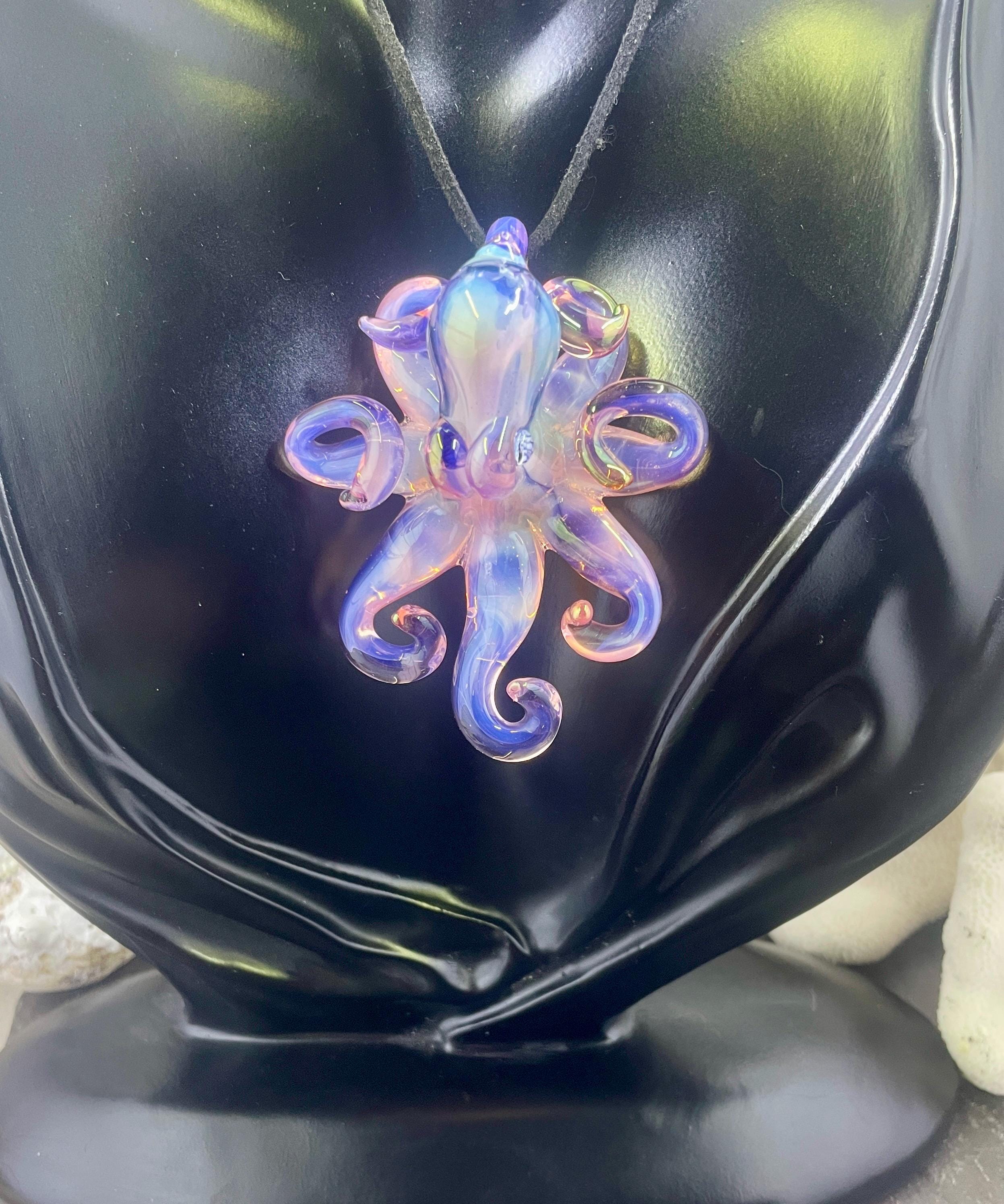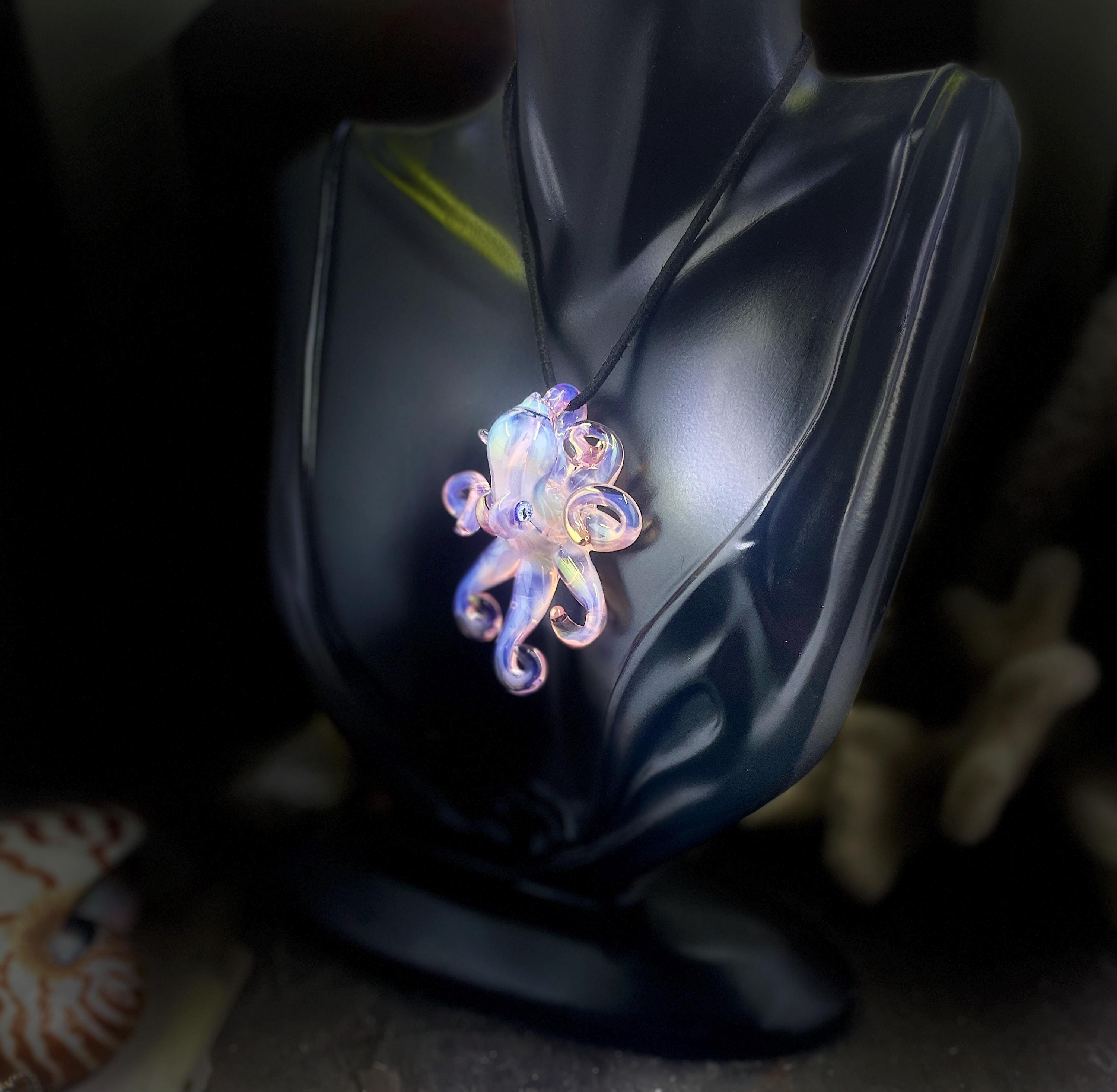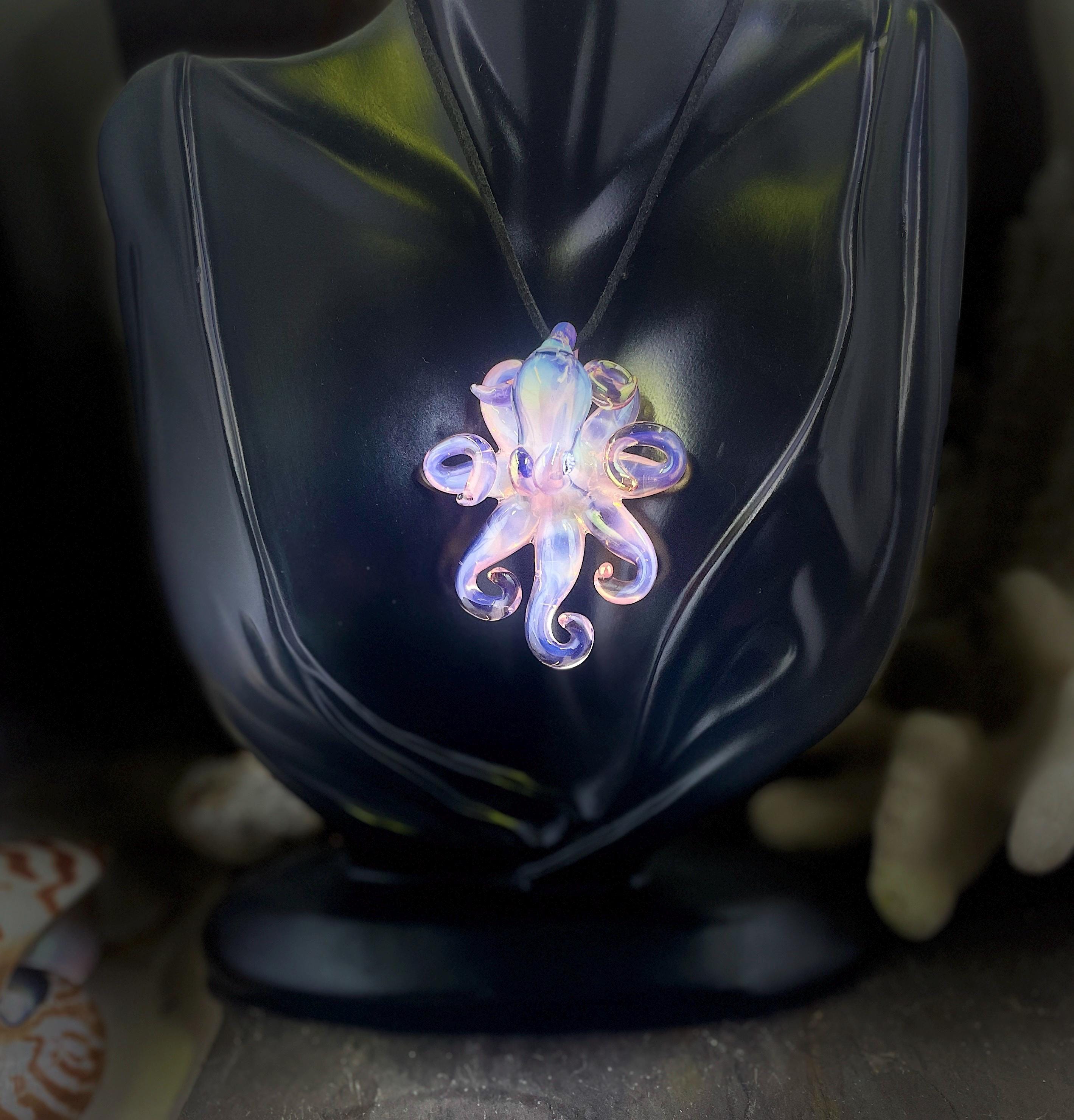 The Golden Peach Octo....another fun pendant made with the beautiful Peach Opal from Lunar glass . The beautiful peach over moonstone body has a pink sheen that only comes from fumed real gold on the top layer. The Aquamania sparkle hood markings are the perfect finishing Approx 2" long, formed in the torch and properly annealed in a digital kiln for durability, this one arrives safely wrapped attached to a 2mm adjustable black silk cord. Handmade glass eye chip gives him such realistic eyes, you might want to keep him on his rope, just in case! Really fun and safe to wear, for a truly dramatic look!