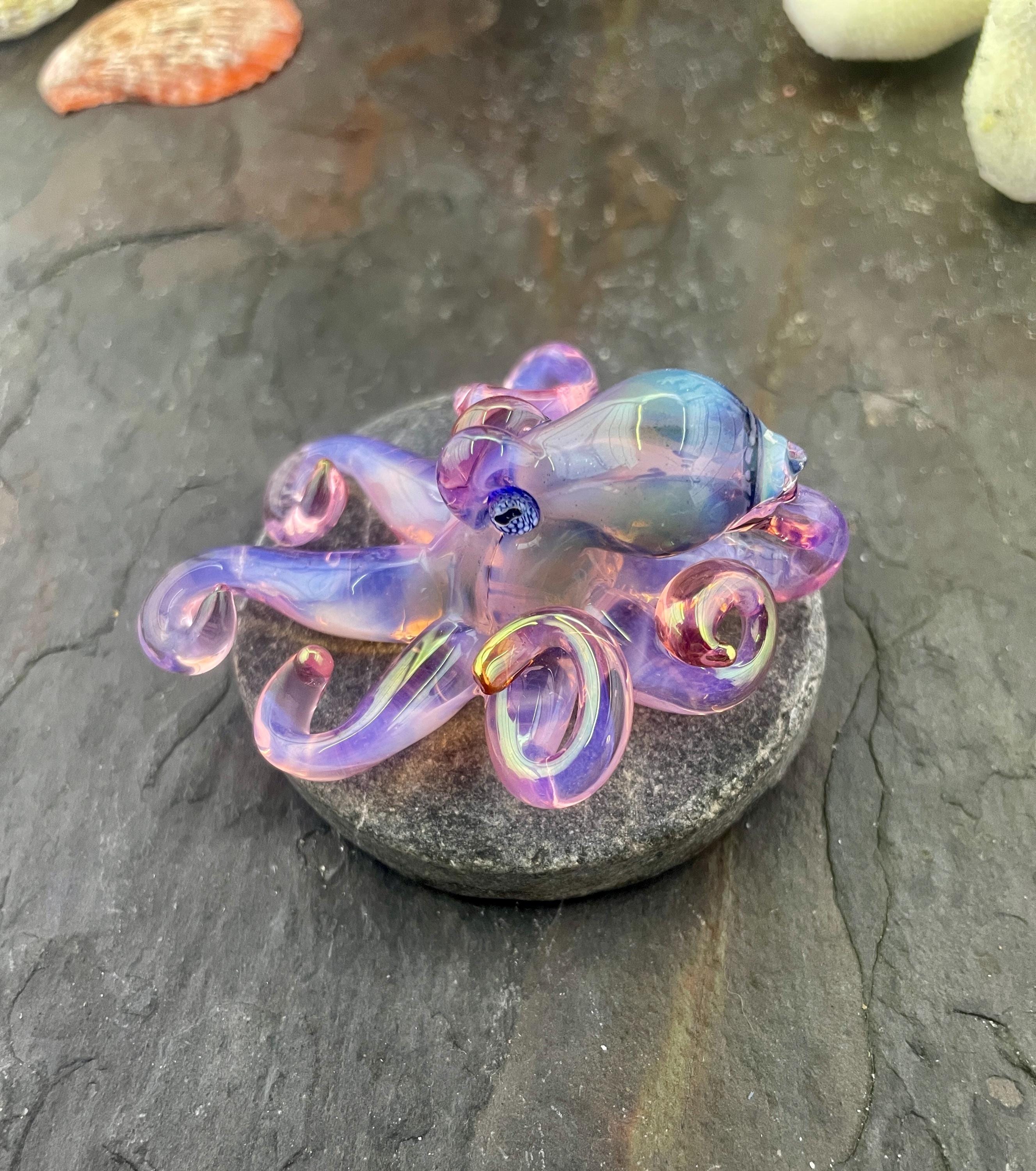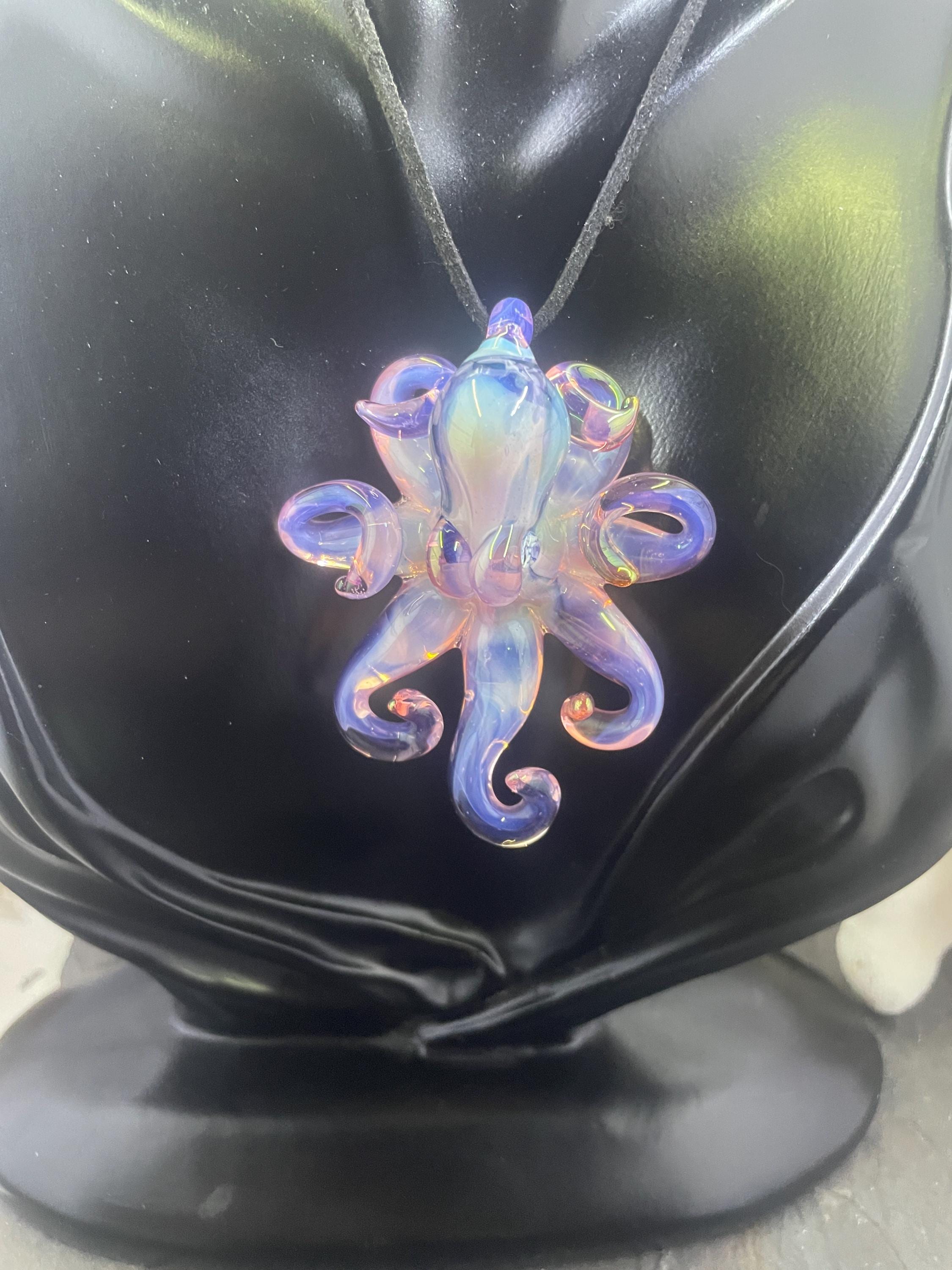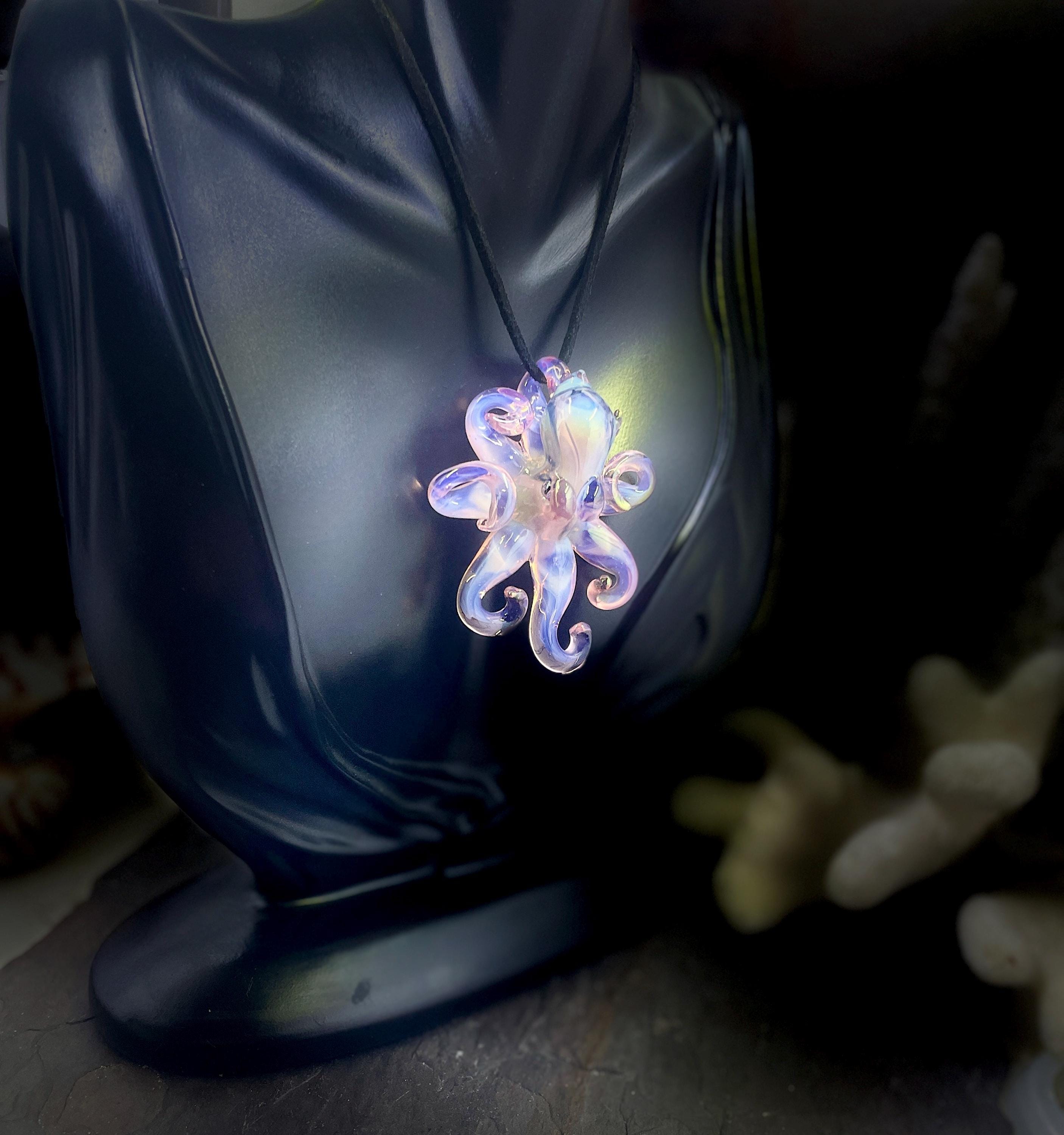 The Golden Peach Octo....another fun pendant made with the beautiful Peach Opal from Lunar glass . The beautiful peach over moonstone body has a pink sheen that only comes from fumed real gold on the top layer. The Aquamania sparkle hood markings are the perfect finishing Approx 2" long, formed in the torch and properly annealed in a digital kiln for durability, this one arrives safely wrapped attached to a 2mm adjustable black silk cord. Handmade glass eye chip gives him such realistic eyes, you might want to keep him on his rope, just in case! Really fun and safe to wear, for a truly dramatic look!