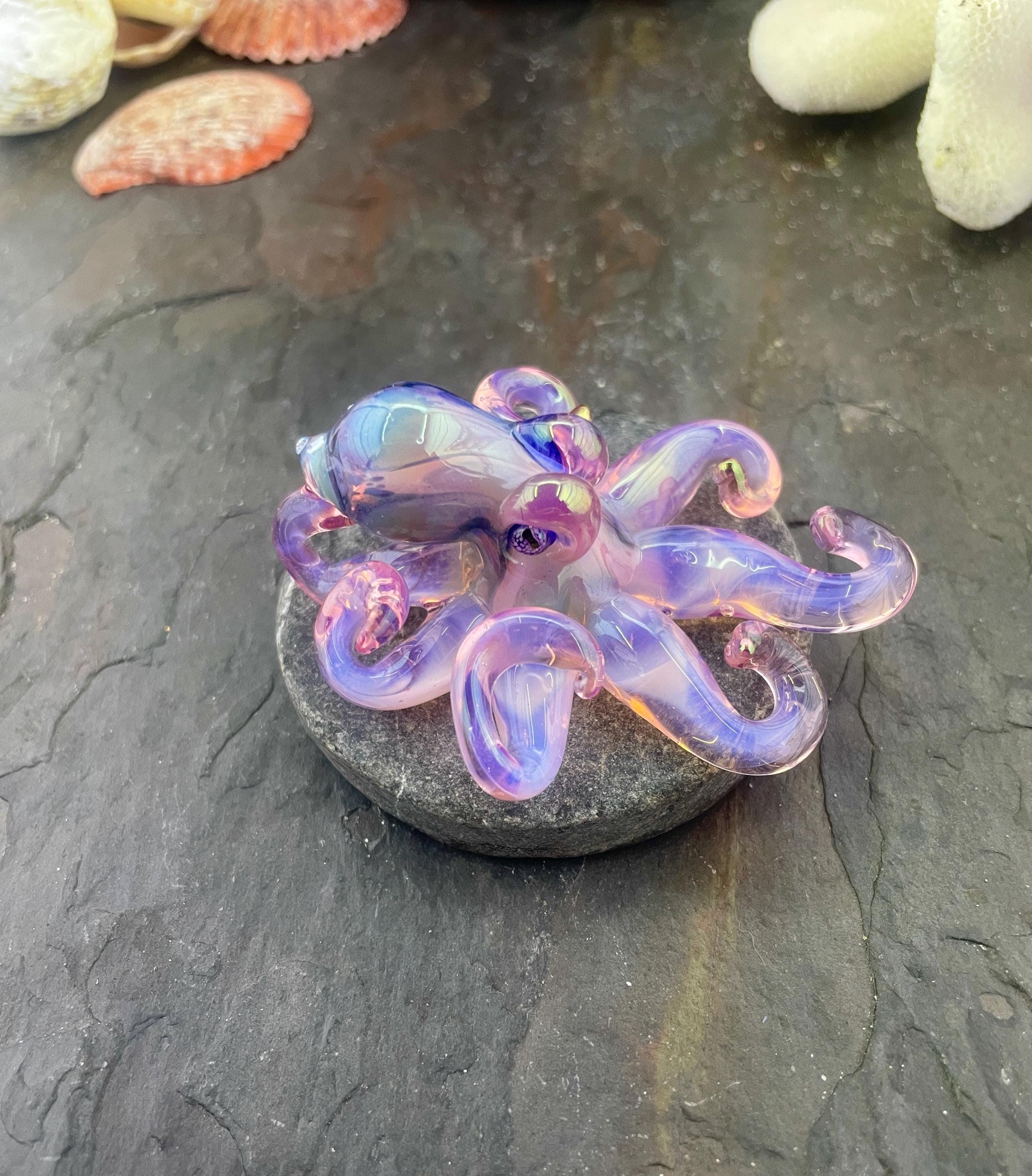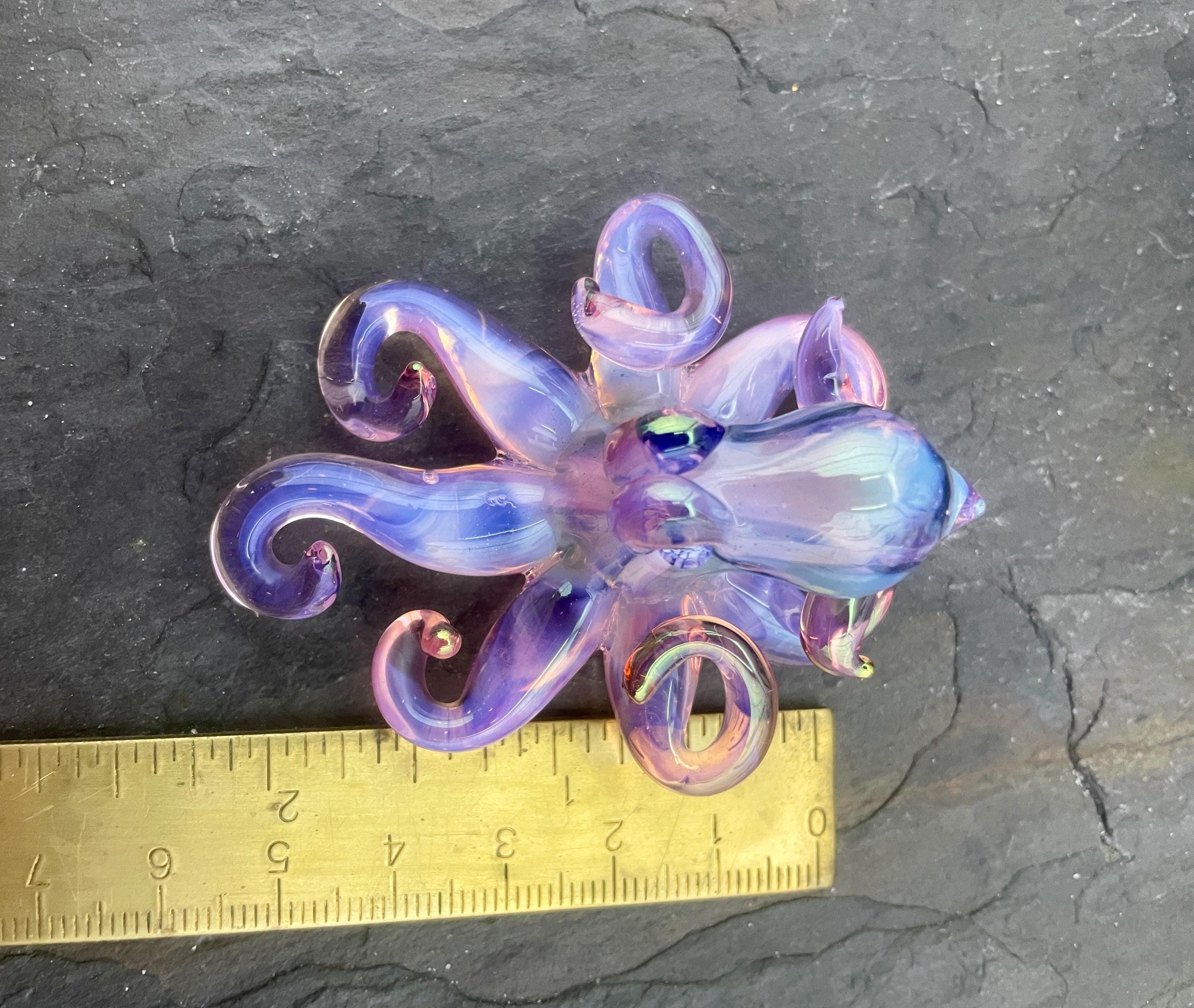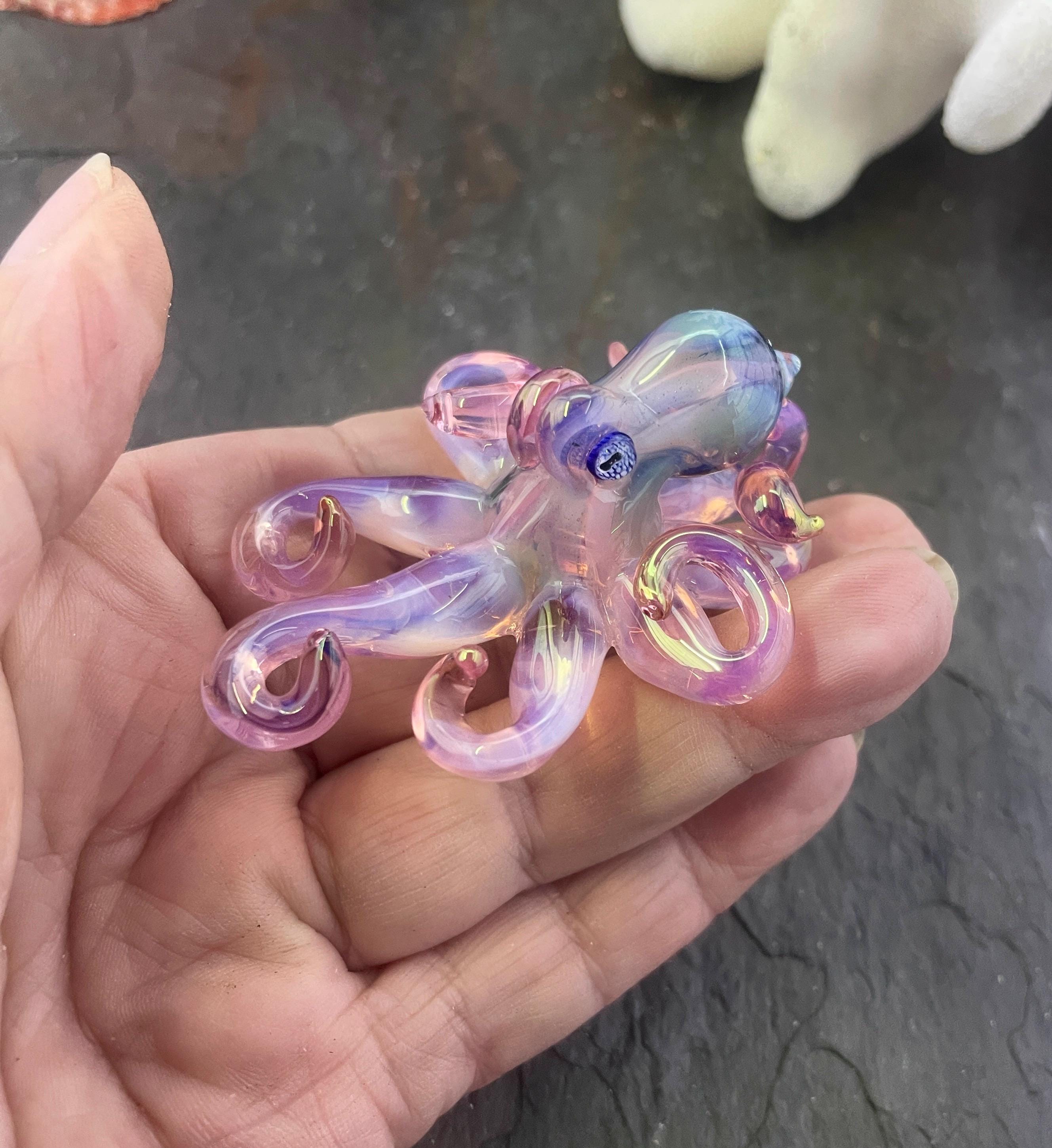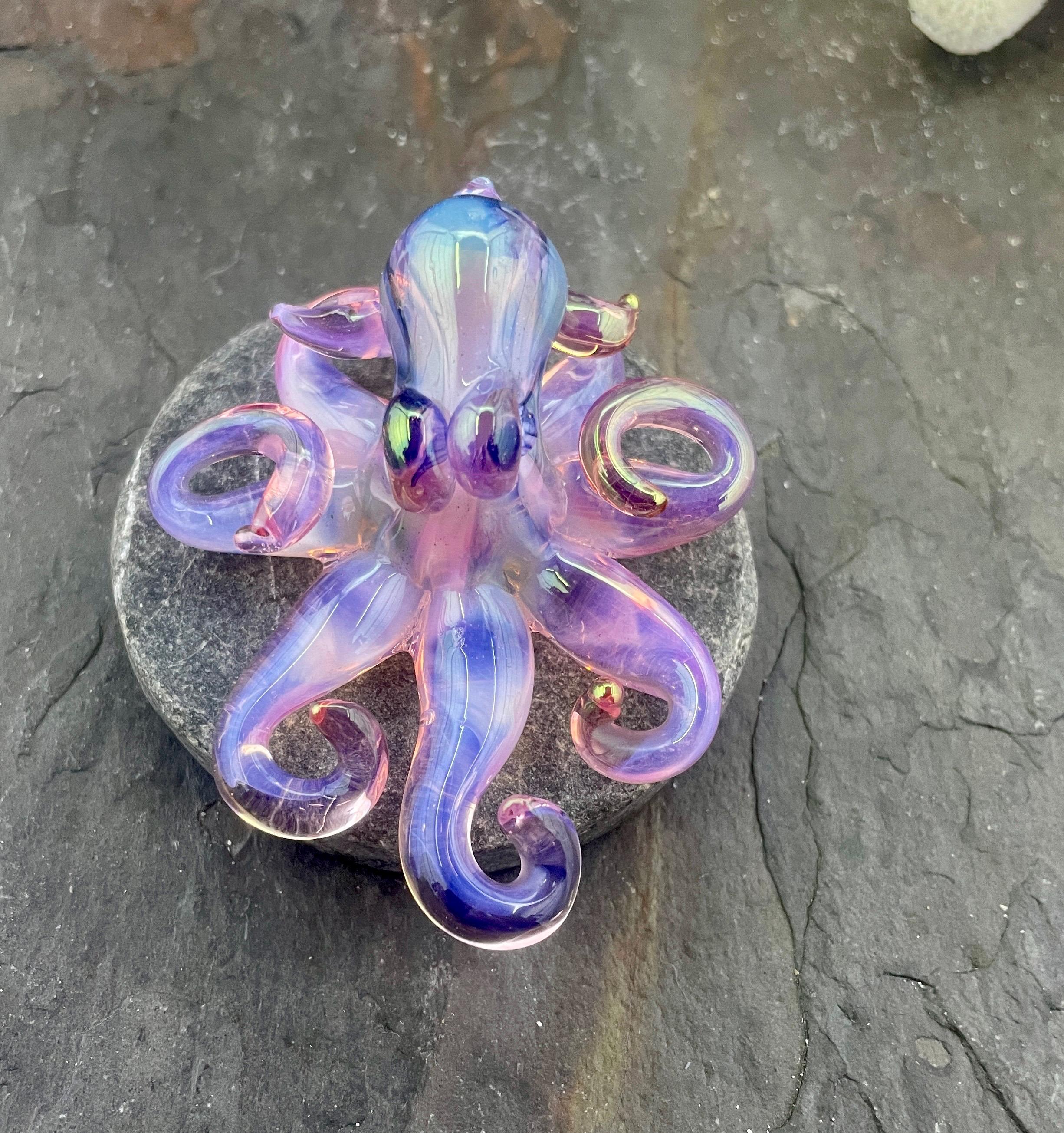The Golden Peach Octo....another fun pendant made with the beautiful Peach Opal from Lunar glass . The beautiful peach over moonstone body has a pink sheen that only comes from fumed real gold on the top layer. The Aquamania sparkle hood markings are the perfect finishing Approx 2" long, formed in the torch and properly annealed in a digital kiln for durability, this one arrives safely wrapped attached to a 2mm adjustable black silk cord. Handmade glass eye chip gives him such realistic eyes, you might want to keep him on his rope, just in case! Really fun and safe to wear, for a truly dramatic look!