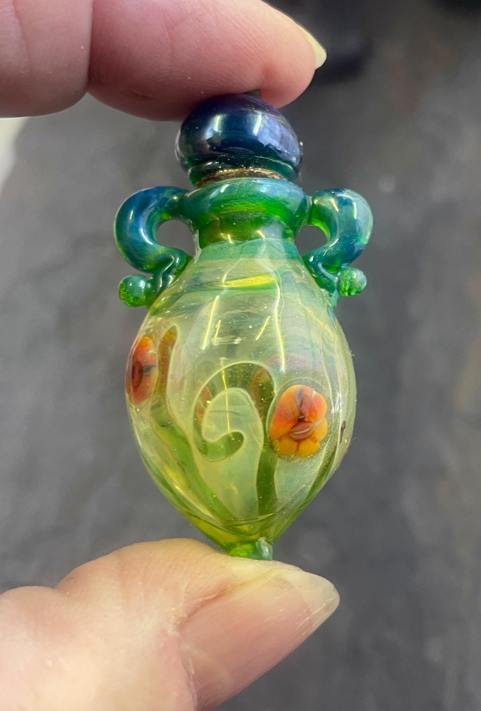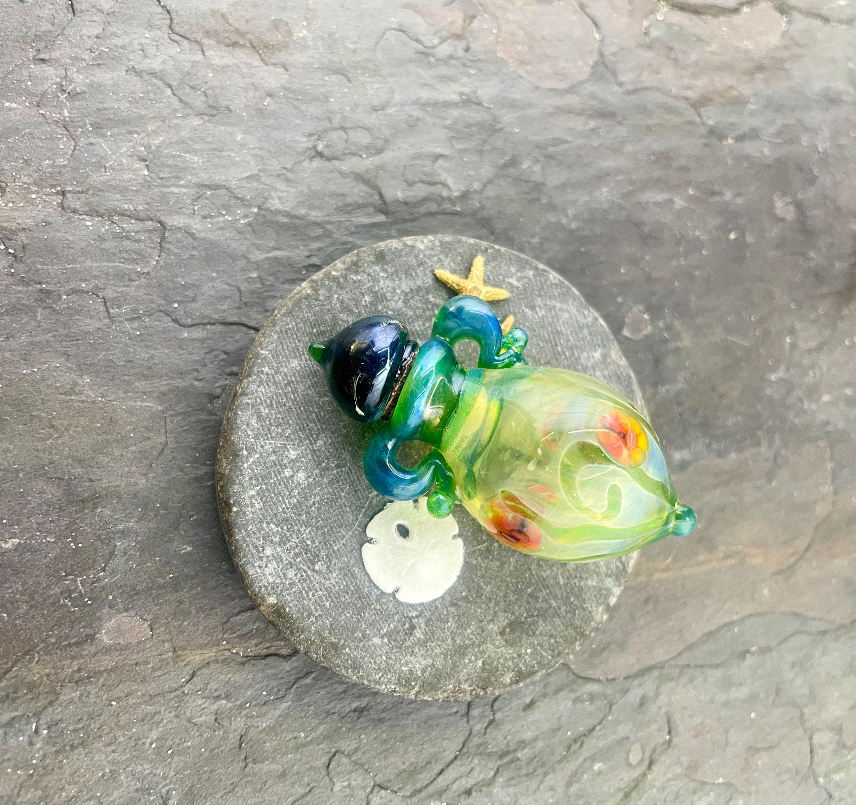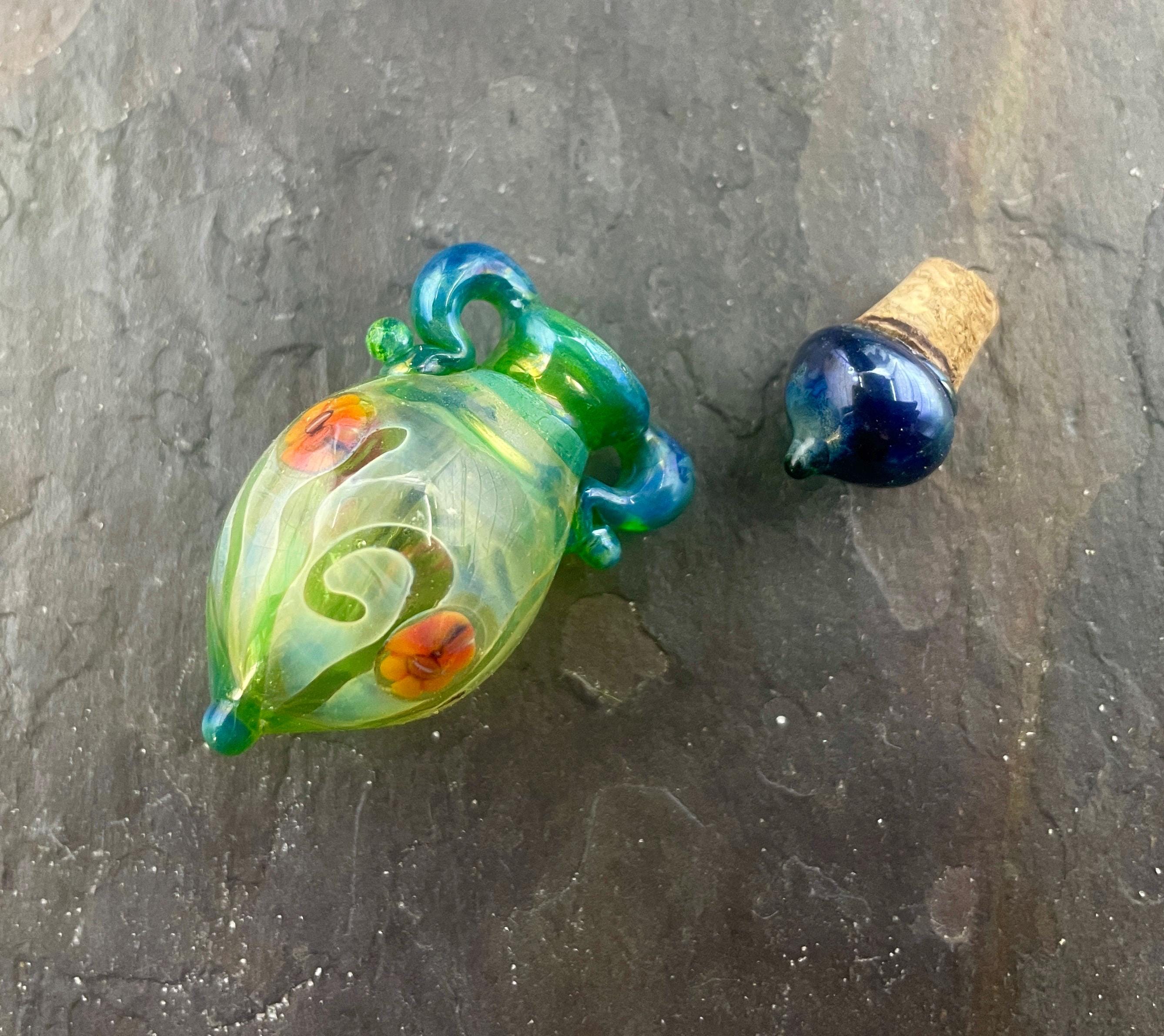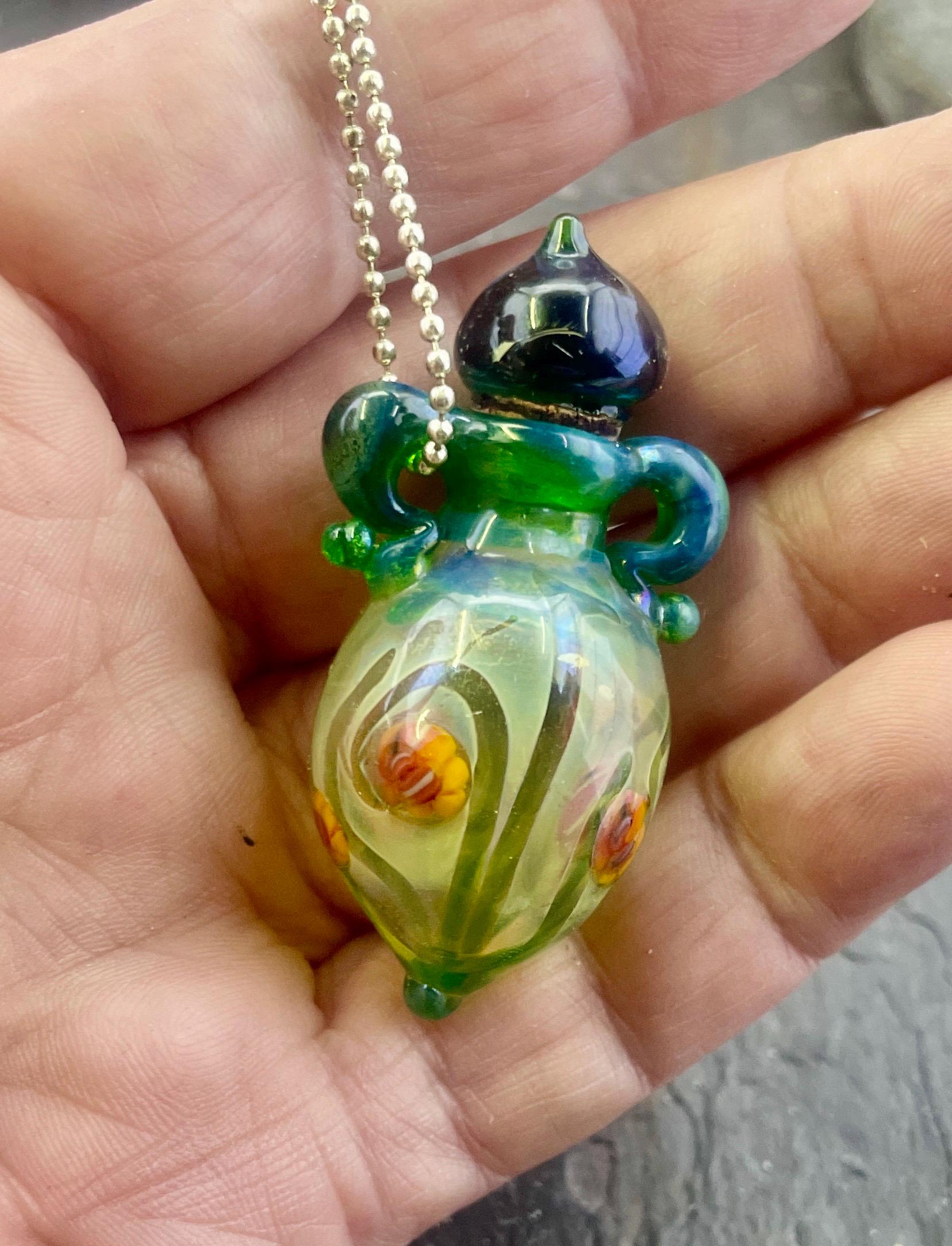 This is an Italian glass vessel bead made in the ancient way to safely store your Mermaid Tears. This one has beautiful abstract sea life swimming on the silver fumed glass vessel. And of course it has the extinct Gaia glass!Could also be used for essential oils or perfume, I guess. Comes on a 1.5mm 18” silver filled mini ball chain which is removable. Approximately 2” top to bottom. Gently twist the cork stopper in for a nice tight fit