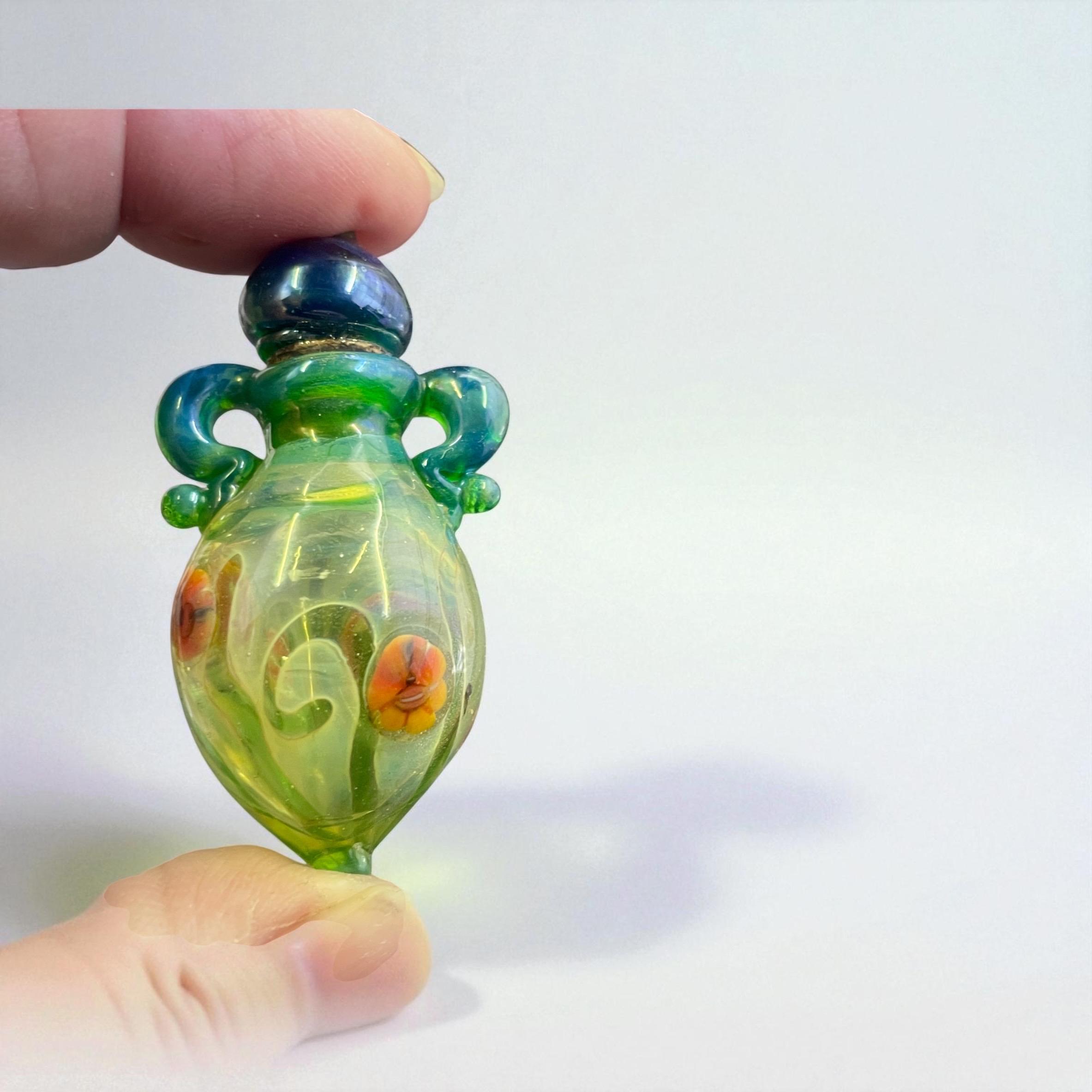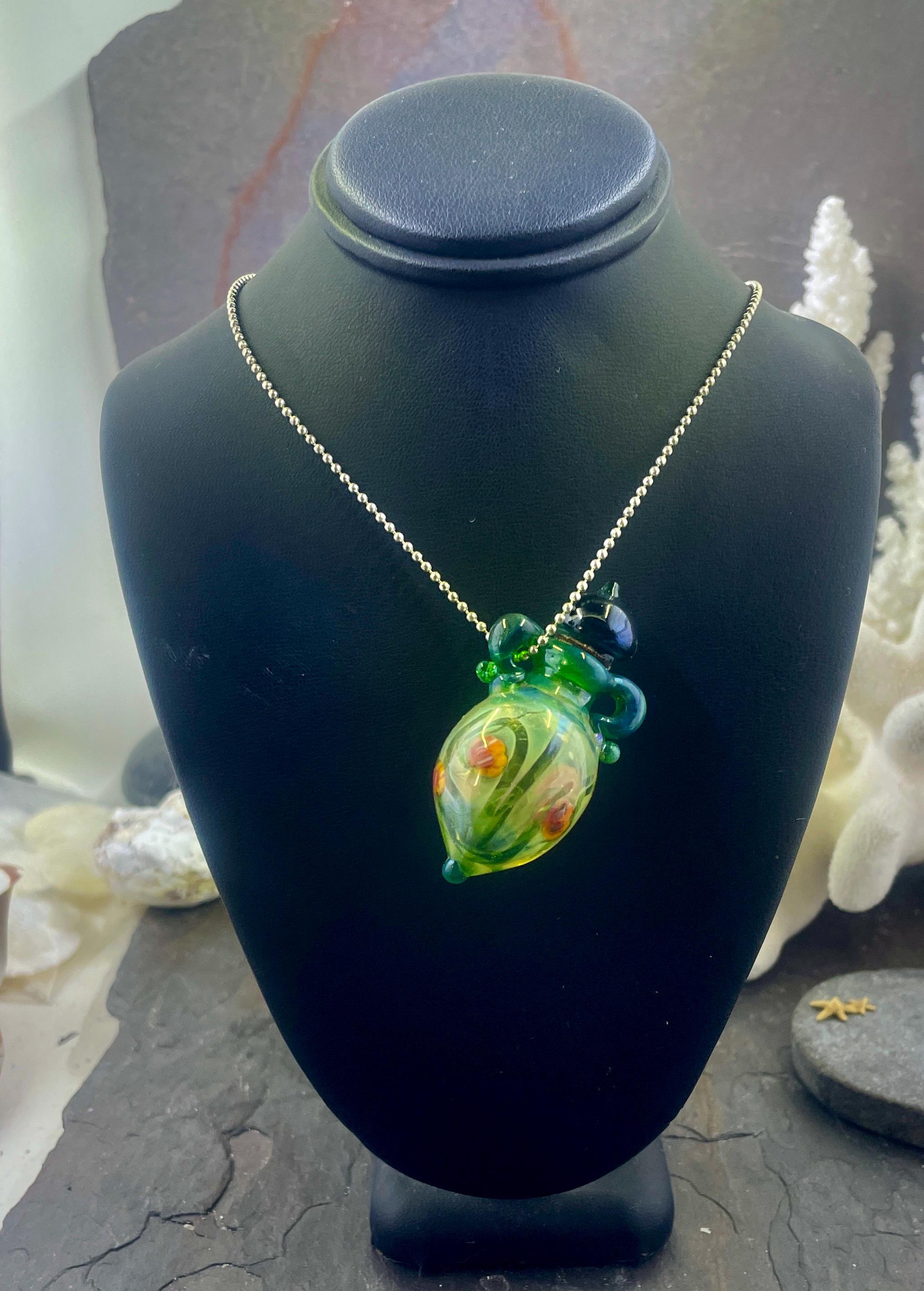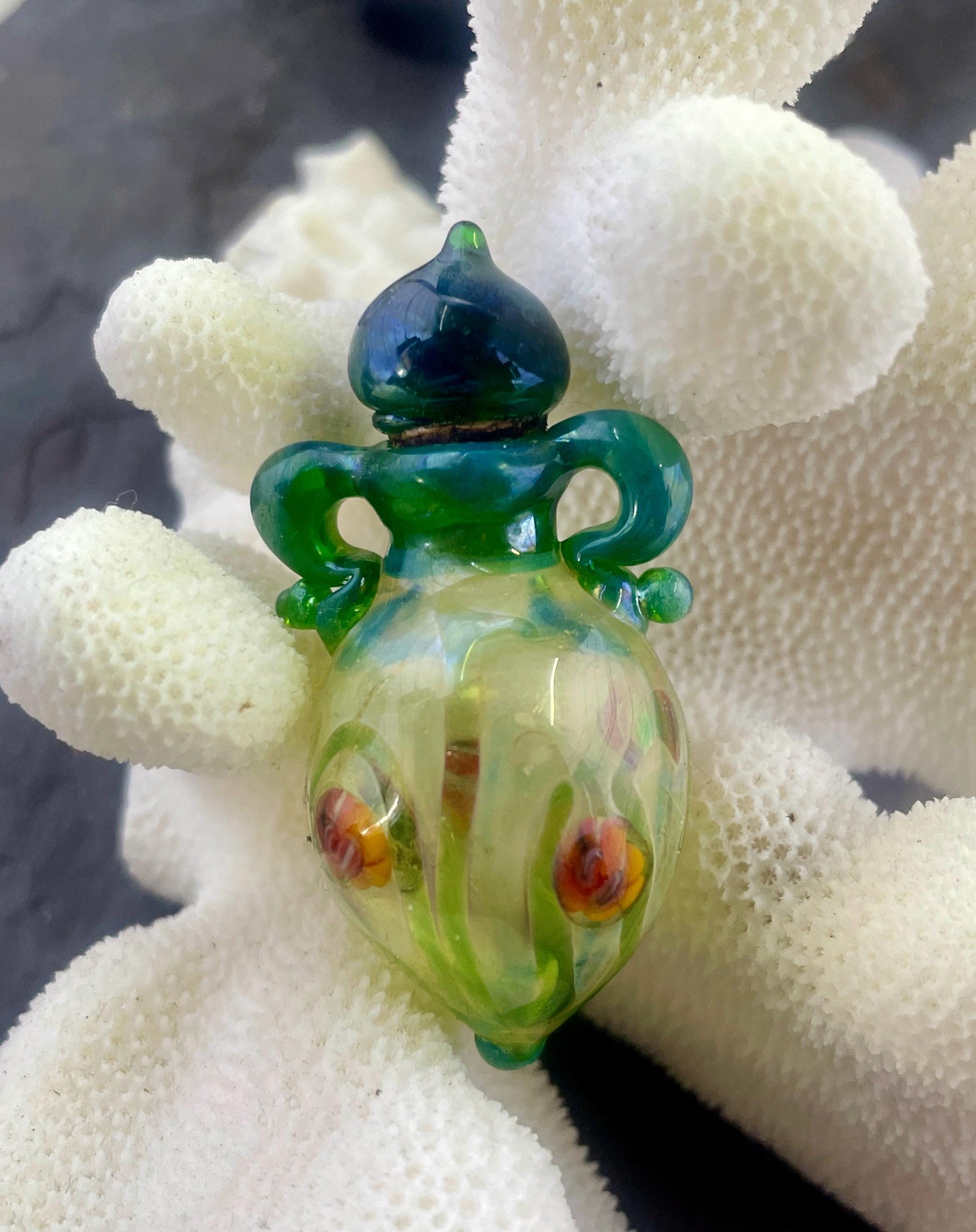 This is an Italian glass vessel bead made in the ancient way to safely store your Mermaid Tears. This one has beautiful abstract sea life swimming on the silver fumed glass vessel. And of course it has the extinct Gaia glass!Could also be used for essential oils or perfume, I guess. Comes on a 1.5mm 18” silver filled mini ball chain which is removable. Approximately 2” top to bottom. Gently twist the cork stopper in for a nice tight fit