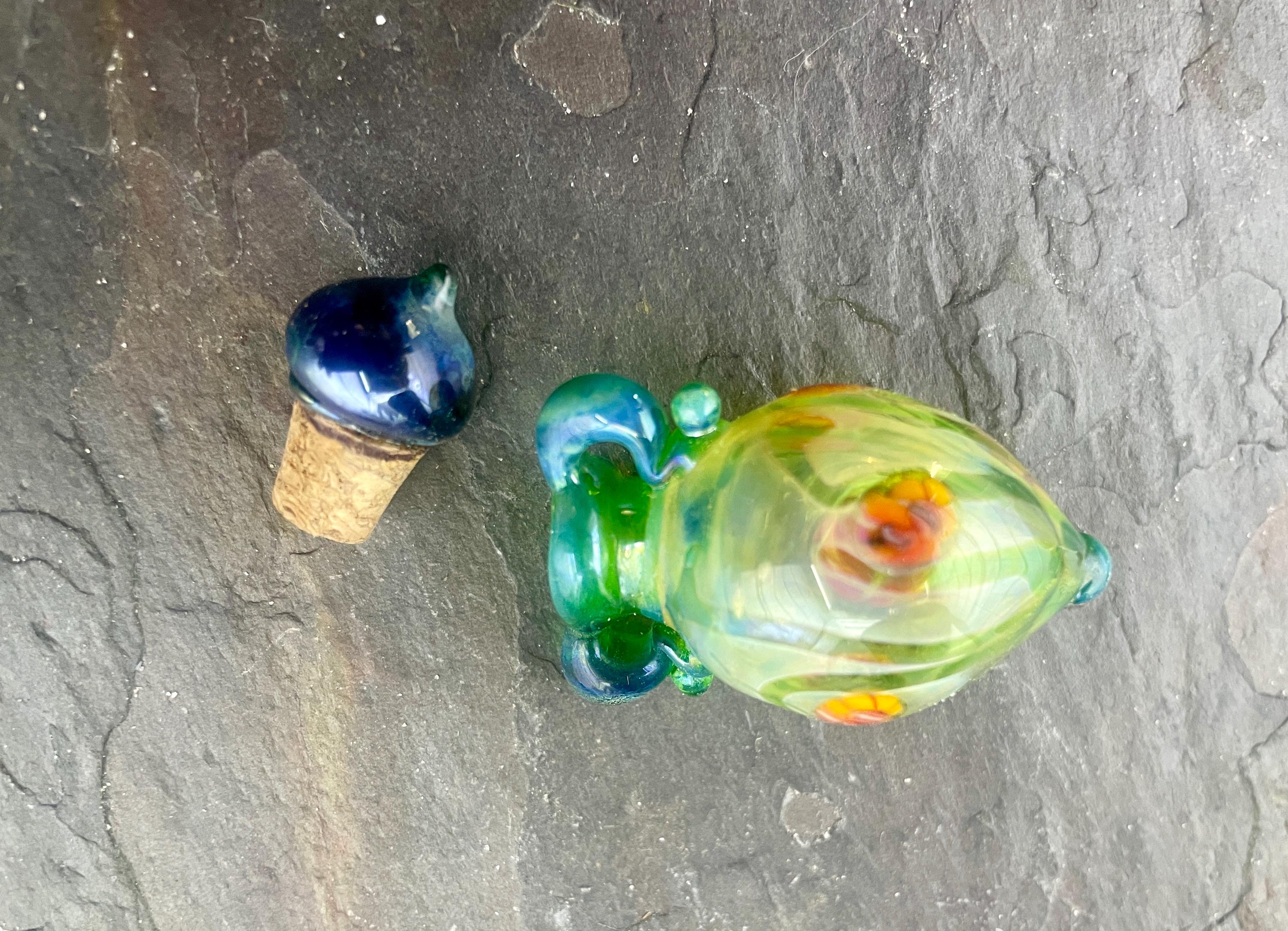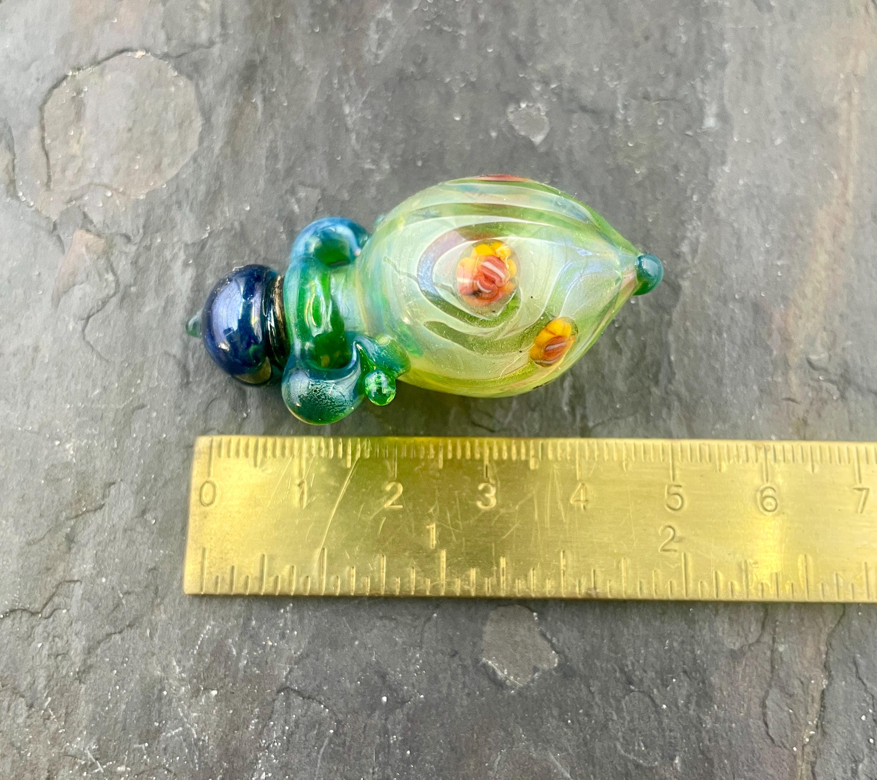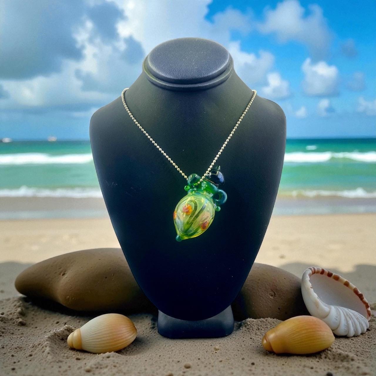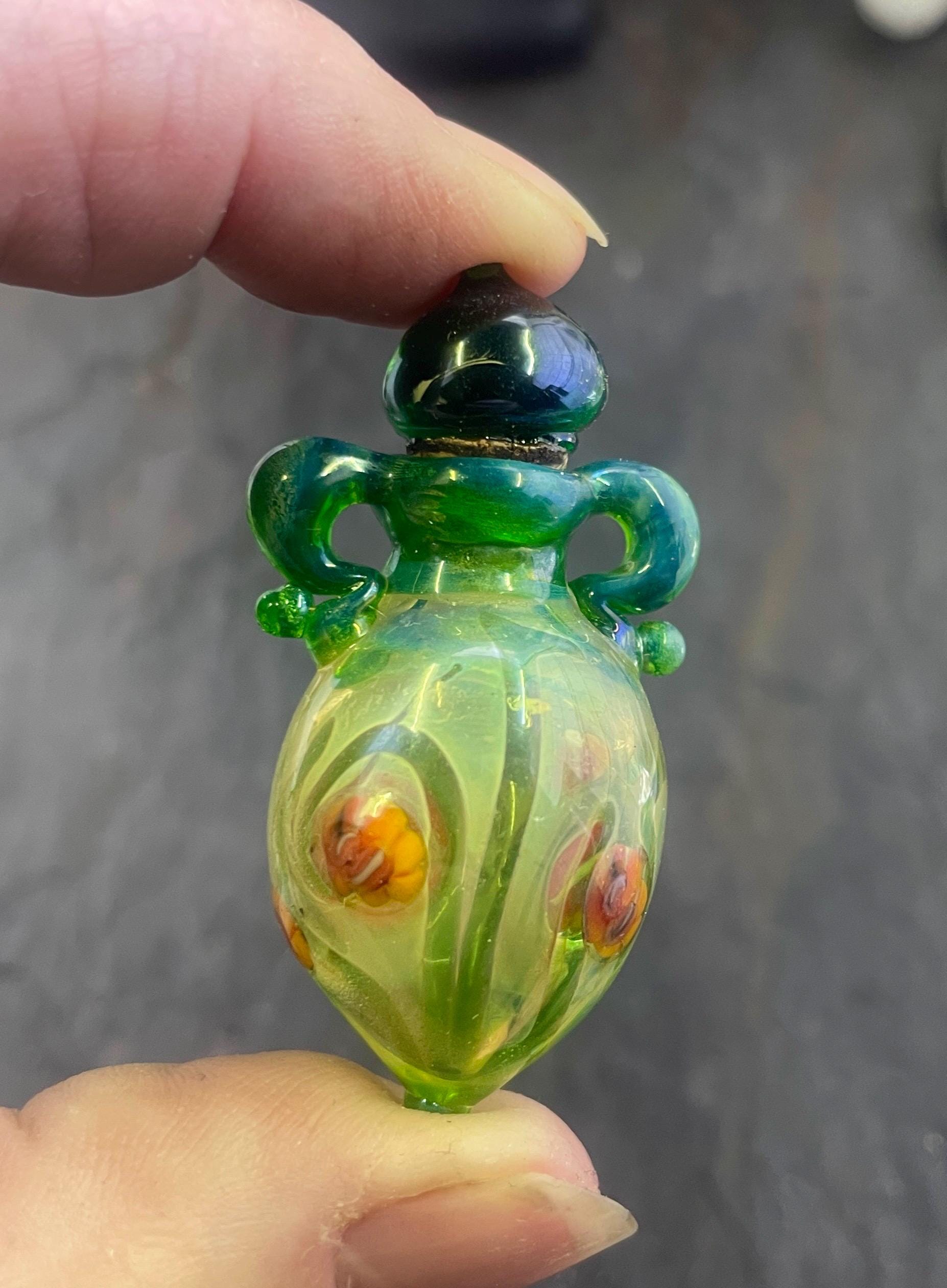 This is an Italian glass vessel bead made in the ancient way to safely store your Mermaid Tears. This one has beautiful abstract sea life swimming on the silver fumed glass vessel. And of course it has the extinct Gaia glass!Could also be used for essential oils or perfume, I guess. Comes on a 1.5mm 18” silver filled mini ball chain which is removable. Approximately 2” top to bottom. Gently twist the cork stopper in for a nice tight fit