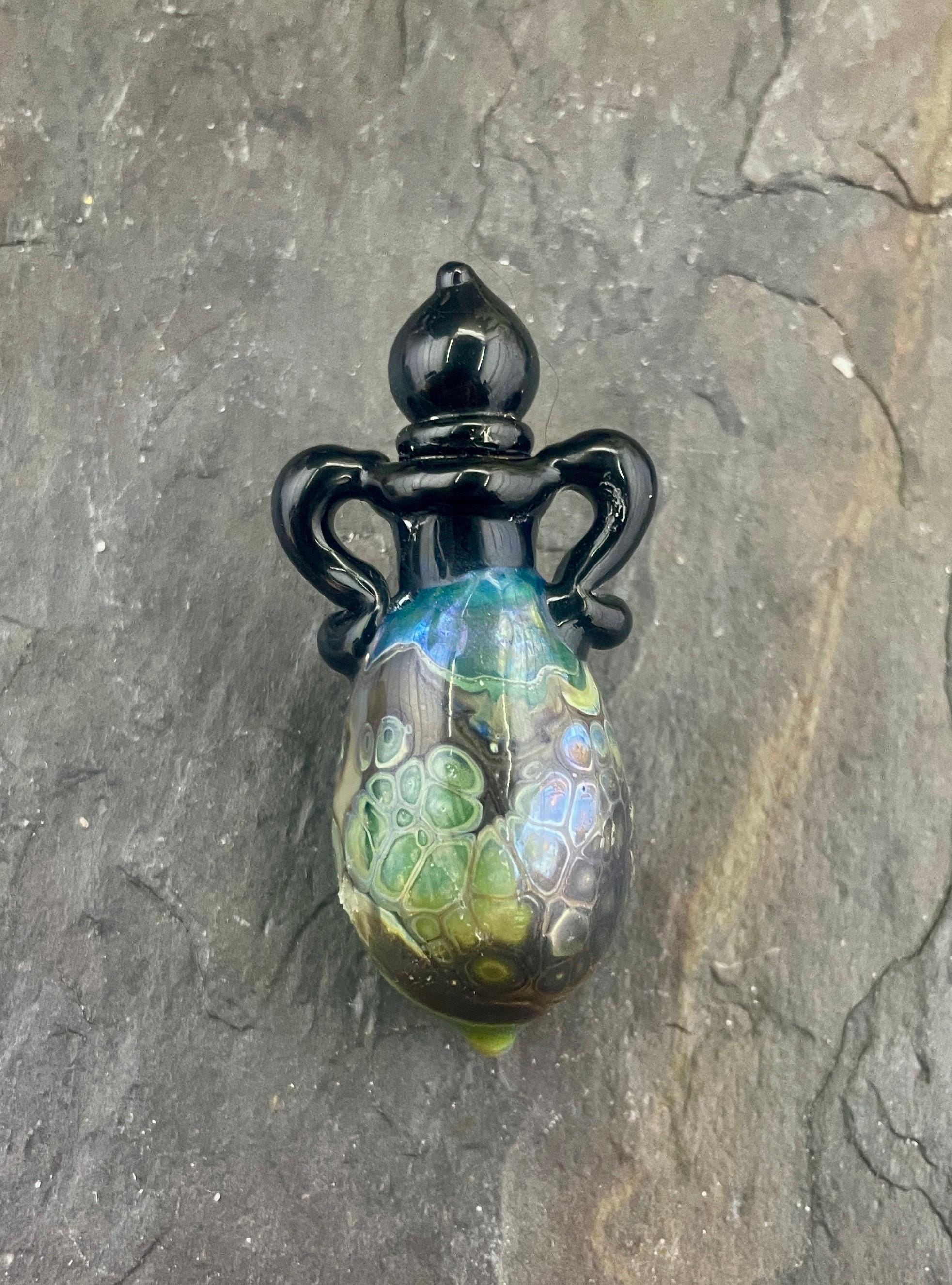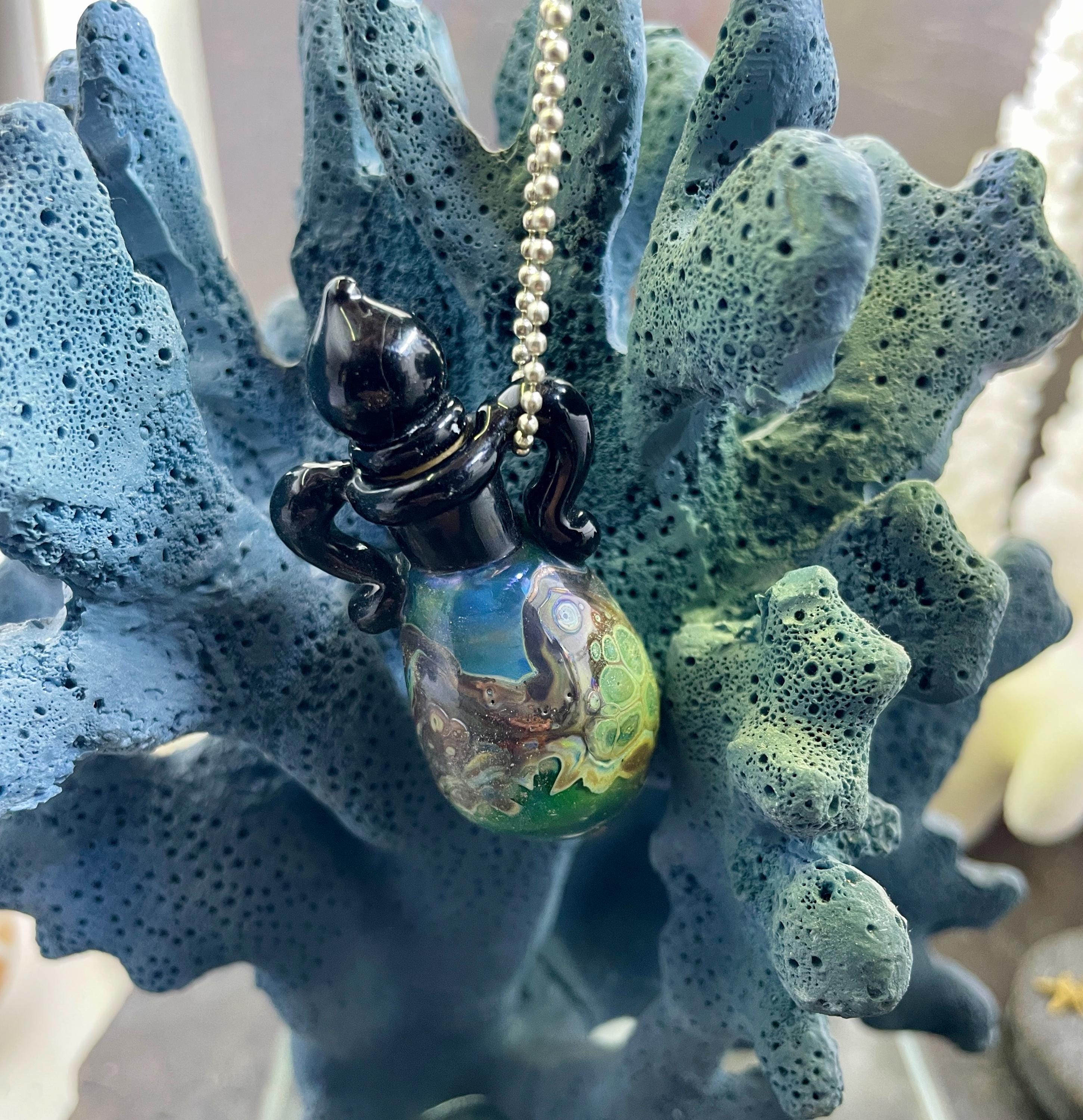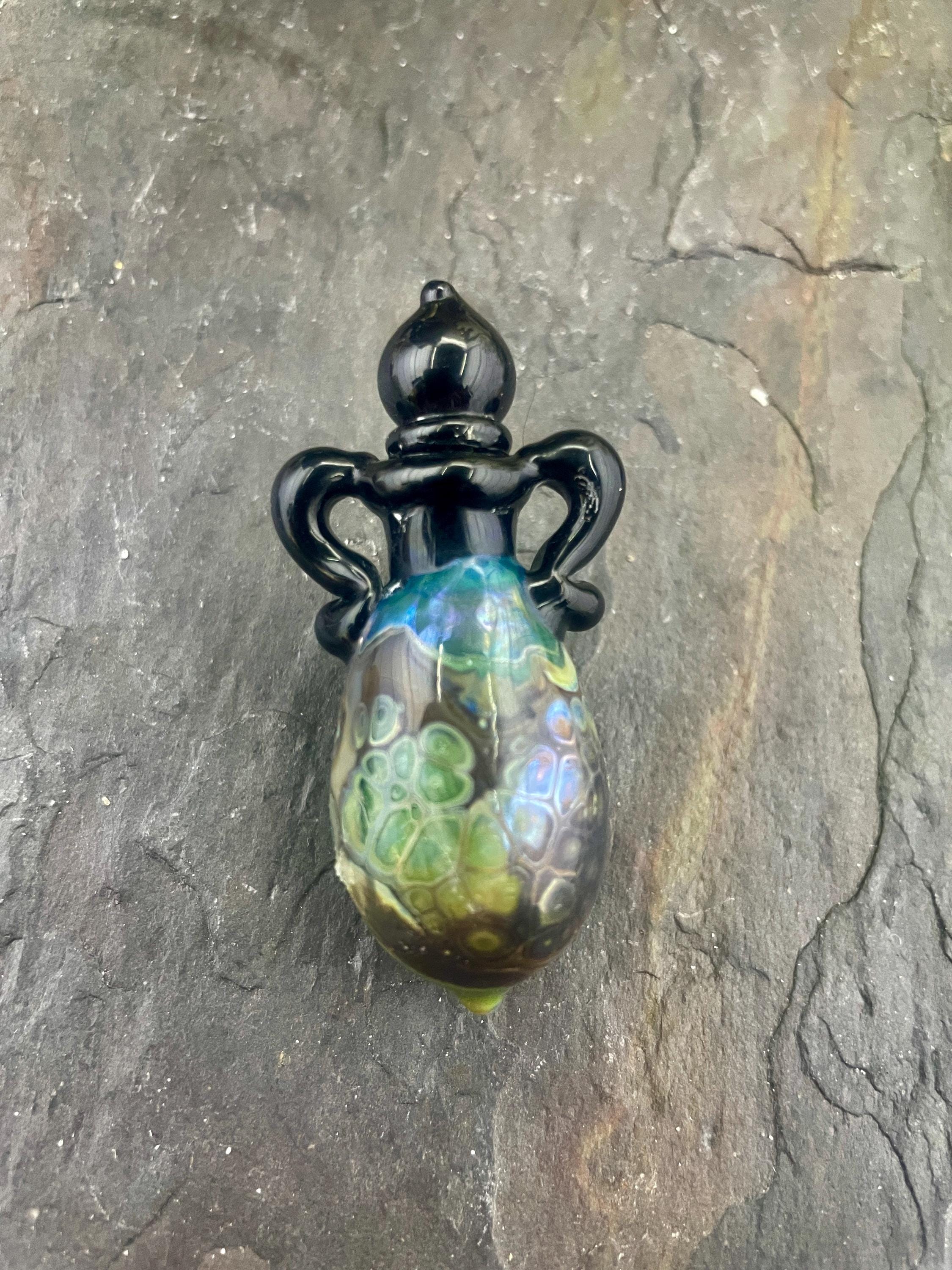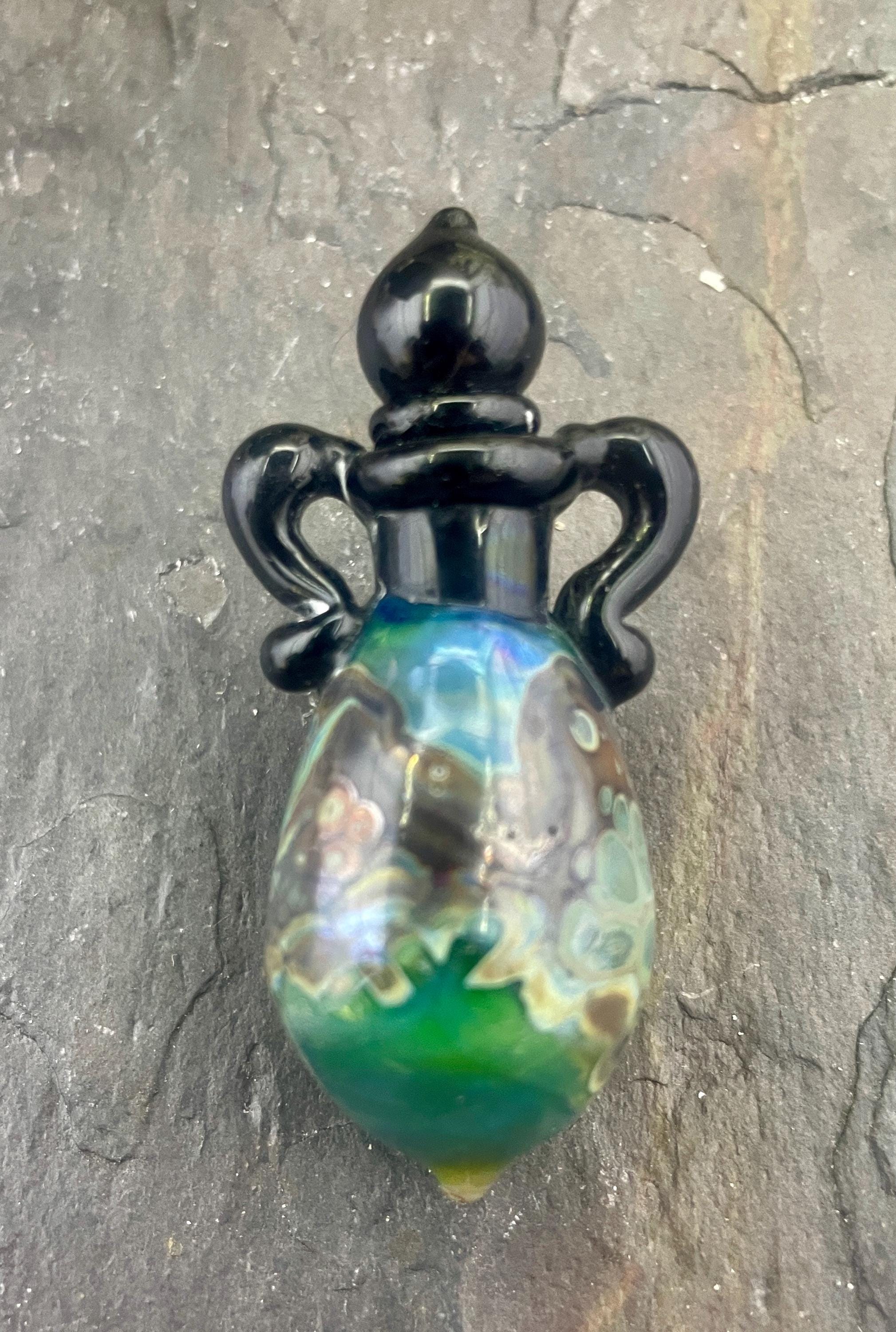 This is an Italian glass vessel bead made in the ancient way to safely store your Mermaid Tears. This one has beautiful explosion of shard colors on the glass vessel. The black top and topper really sets off the amazing shard colors. Could also be used for essential oils or perfume, I guess. Comes on a 1.5mm 18” silver filled mini ball chain which is removable. Approximately 2” top to bottom. Gently twist the cork stopper in for a nice tight fit