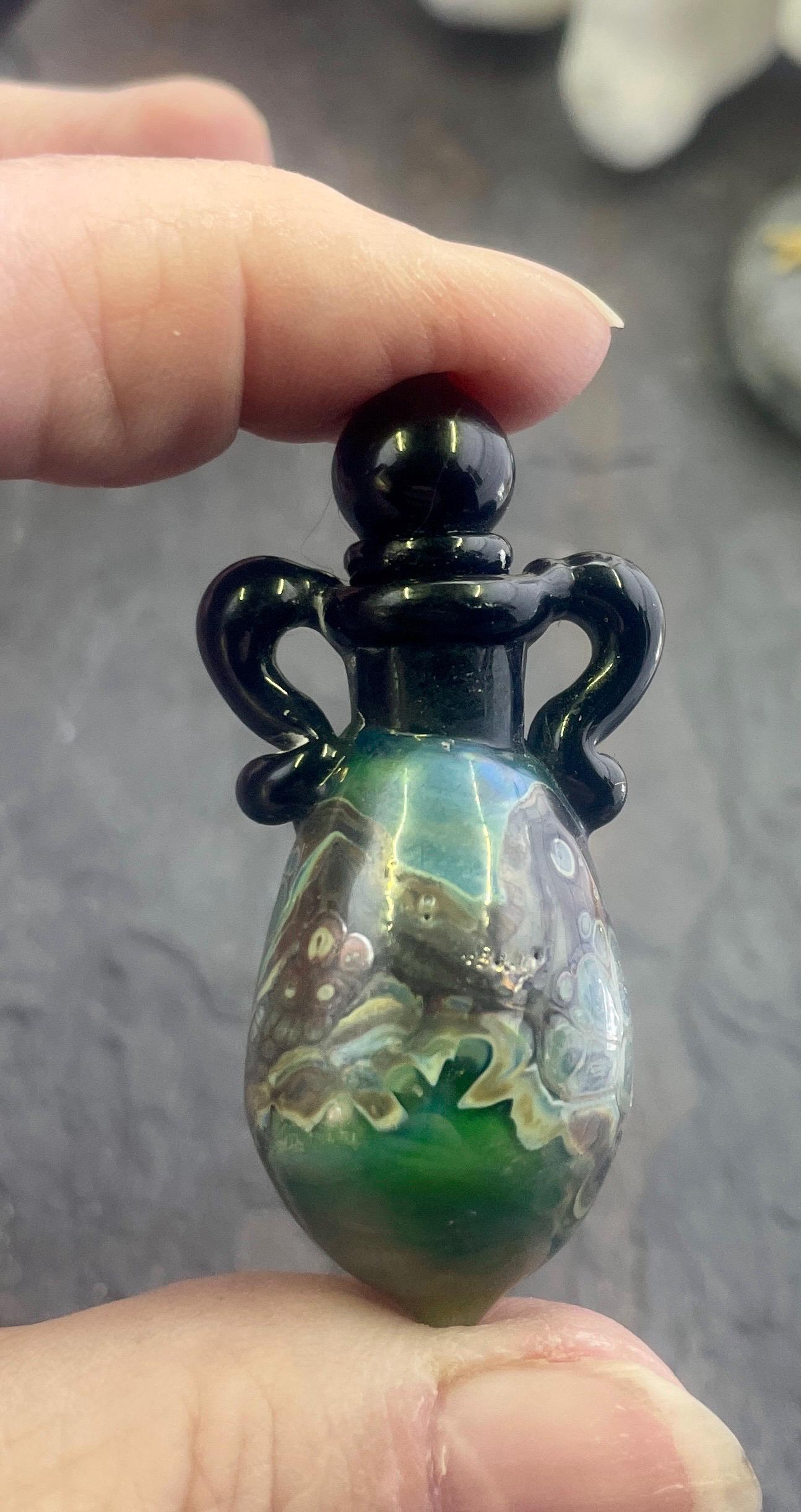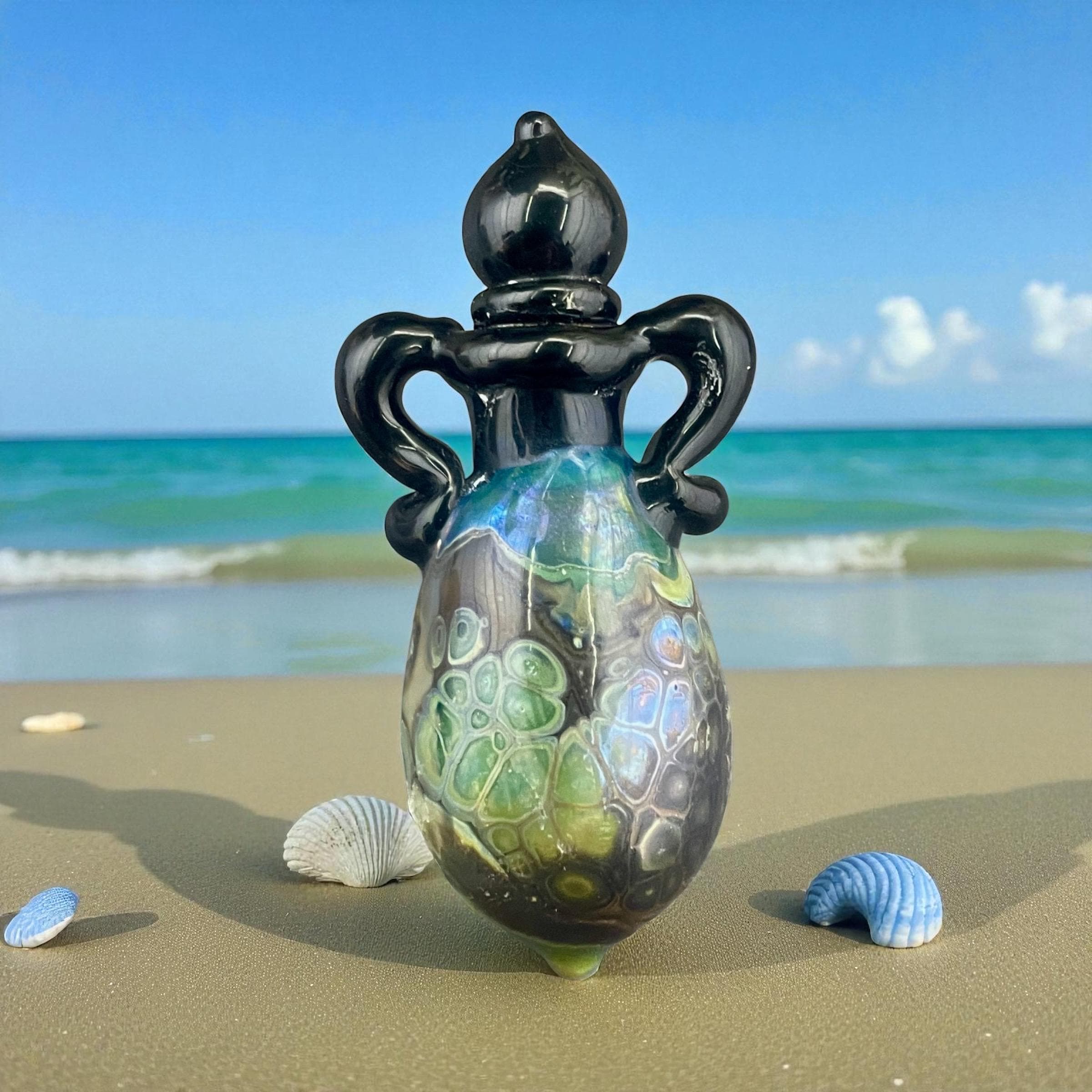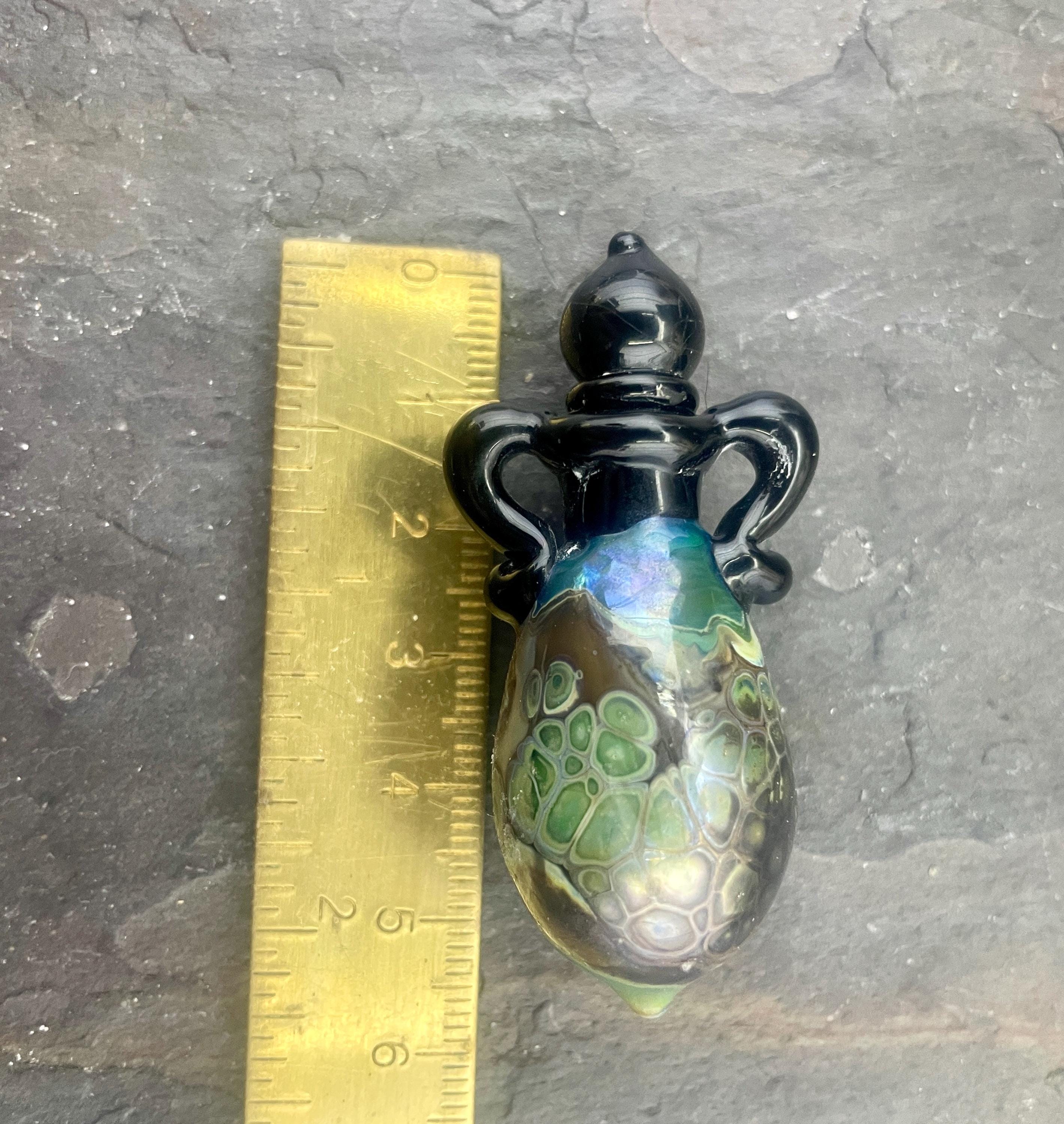 This is an Italian glass vessel bead made in the ancient way to safely store your Mermaid Tears. This one has beautiful explosion of shard colors on the glass vessel. The black top and topper really sets off the amazing shard colors. Could also be used for essential oils or perfume, I guess. Comes on a 1.5mm 18” silver filled mini ball chain which is removable. Approximately 2” top to bottom. Gently twist the cork stopper in for a nice tight fit