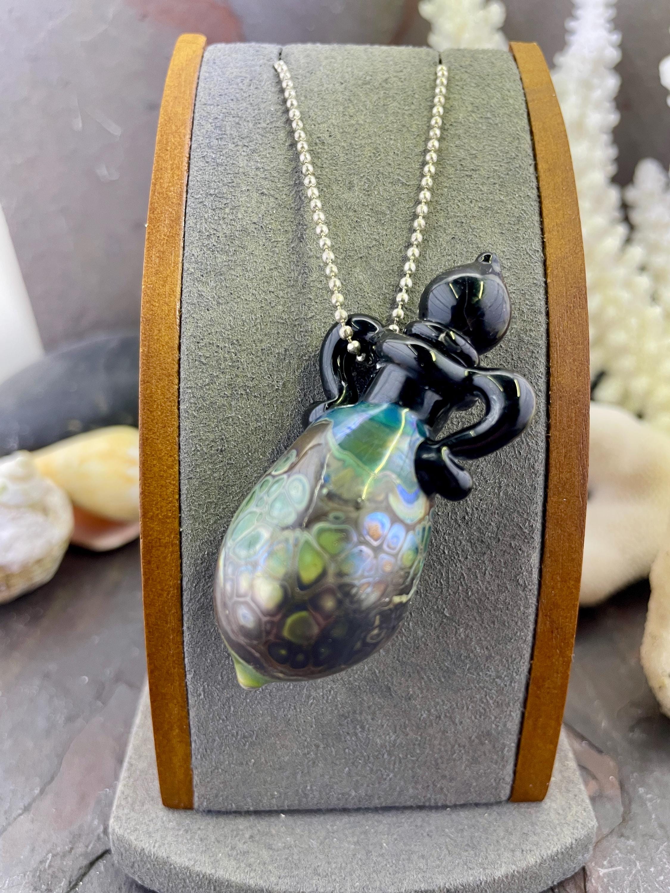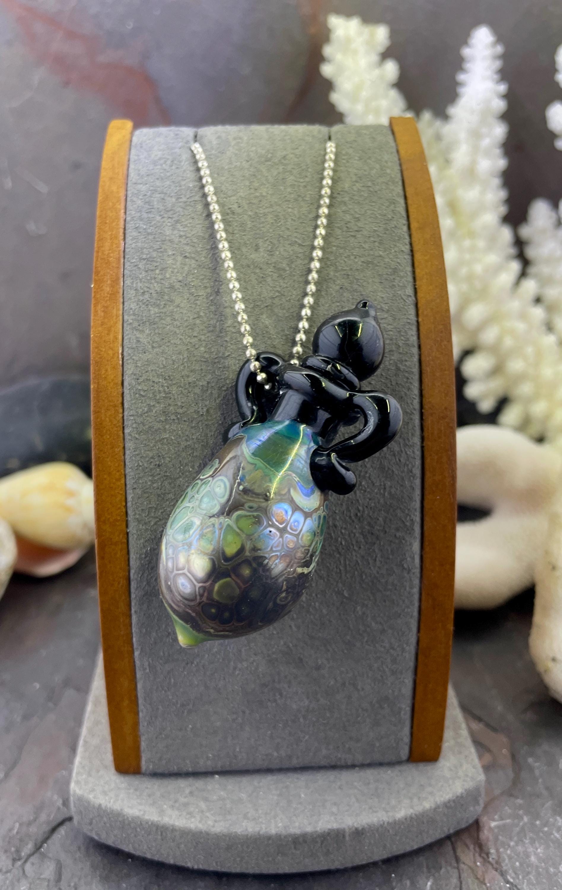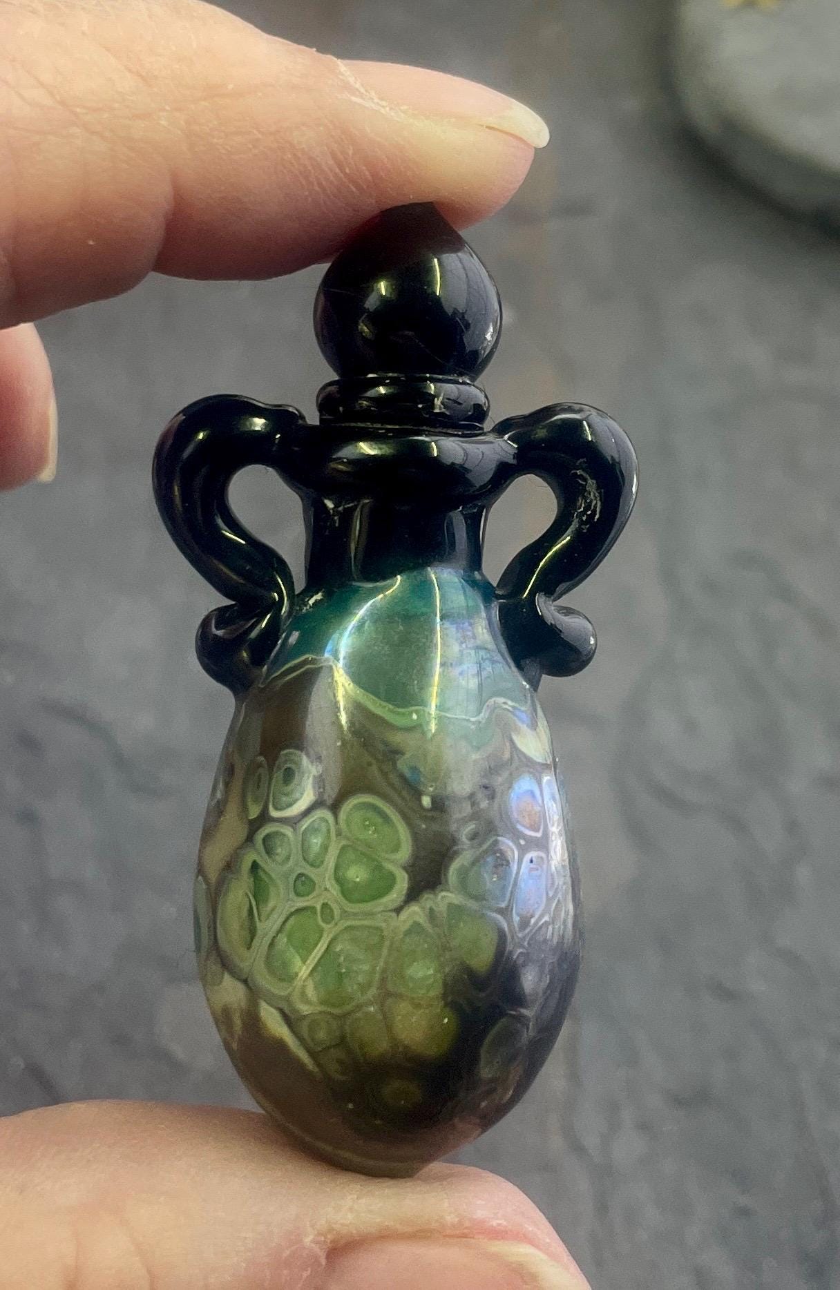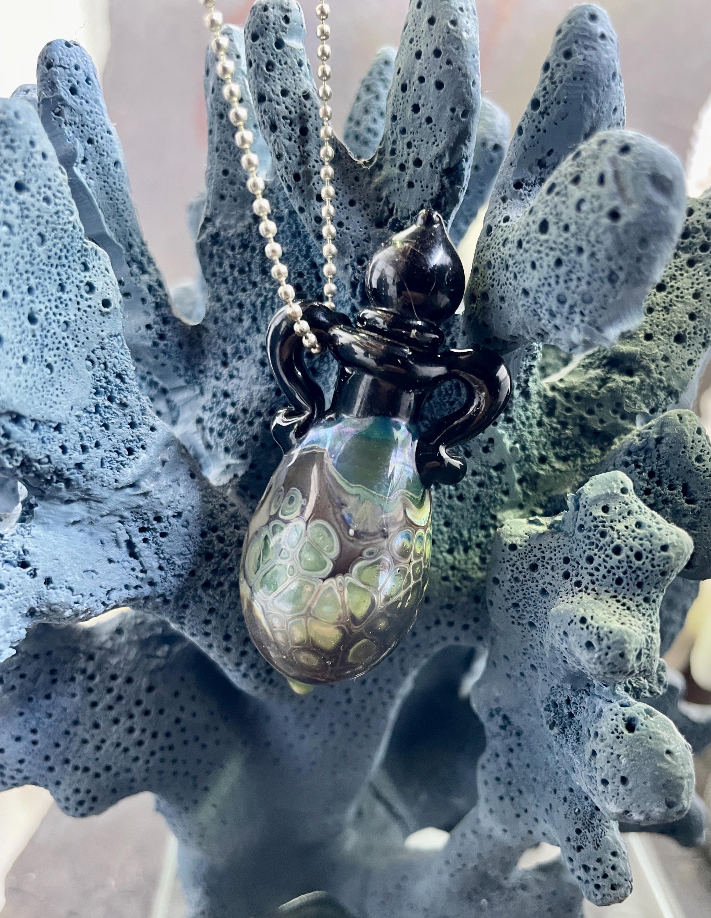 This is an Italian glass vessel bead made in the ancient way to safely store your Mermaid Tears. This one has beautiful explosion of shard colors on the glass vessel. The black top and topper really sets off the amazing shard colors. Could also be used for essential oils or perfume, I guess. Comes on a 1.5mm 18” silver filled mini ball chain which is removable. Approximately 2” top to bottom. Gently twist the cork stopper in for a nice tight fit