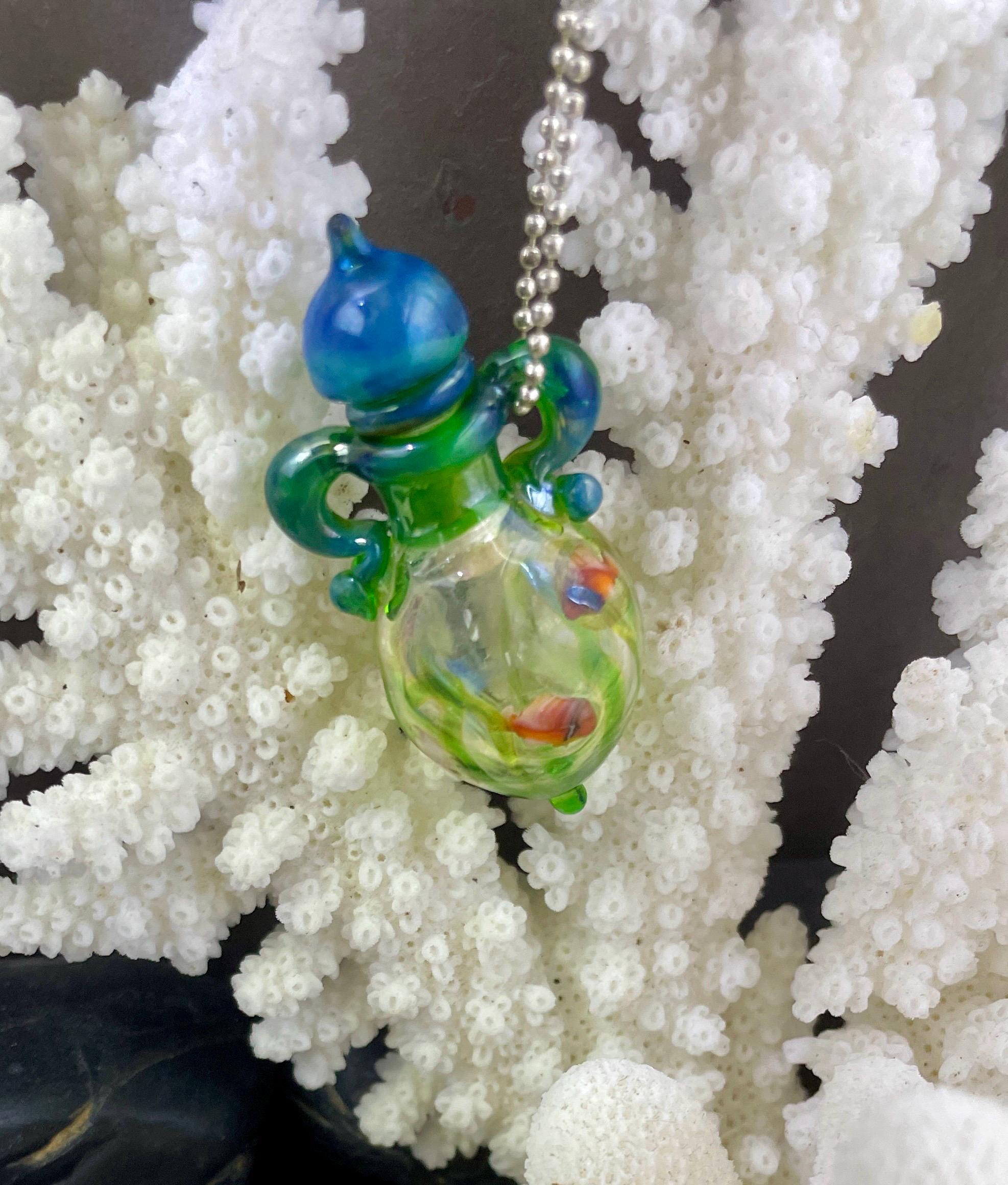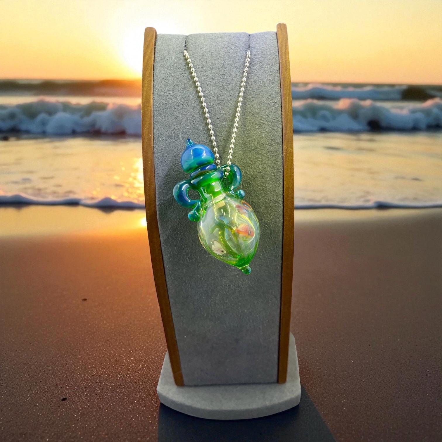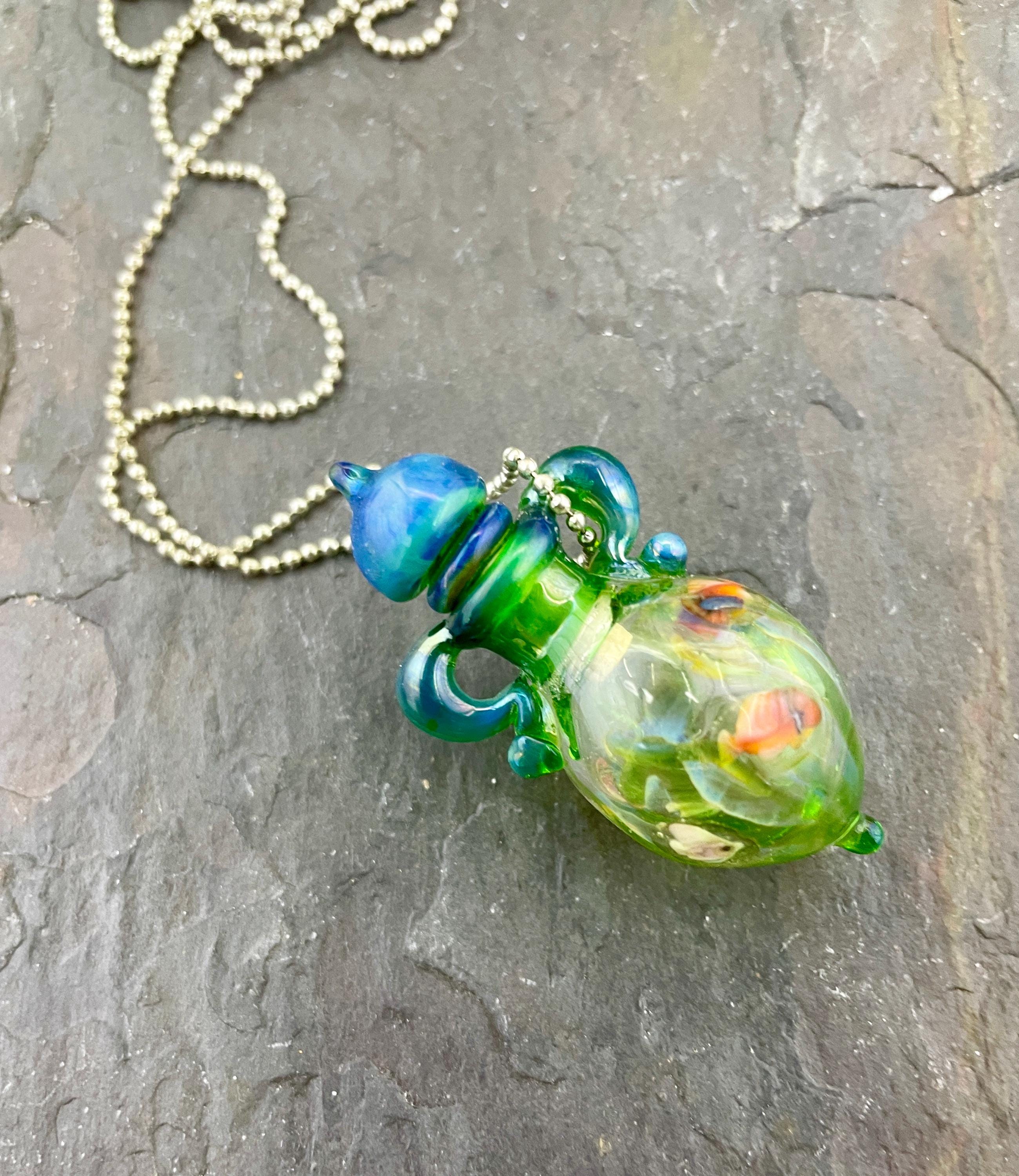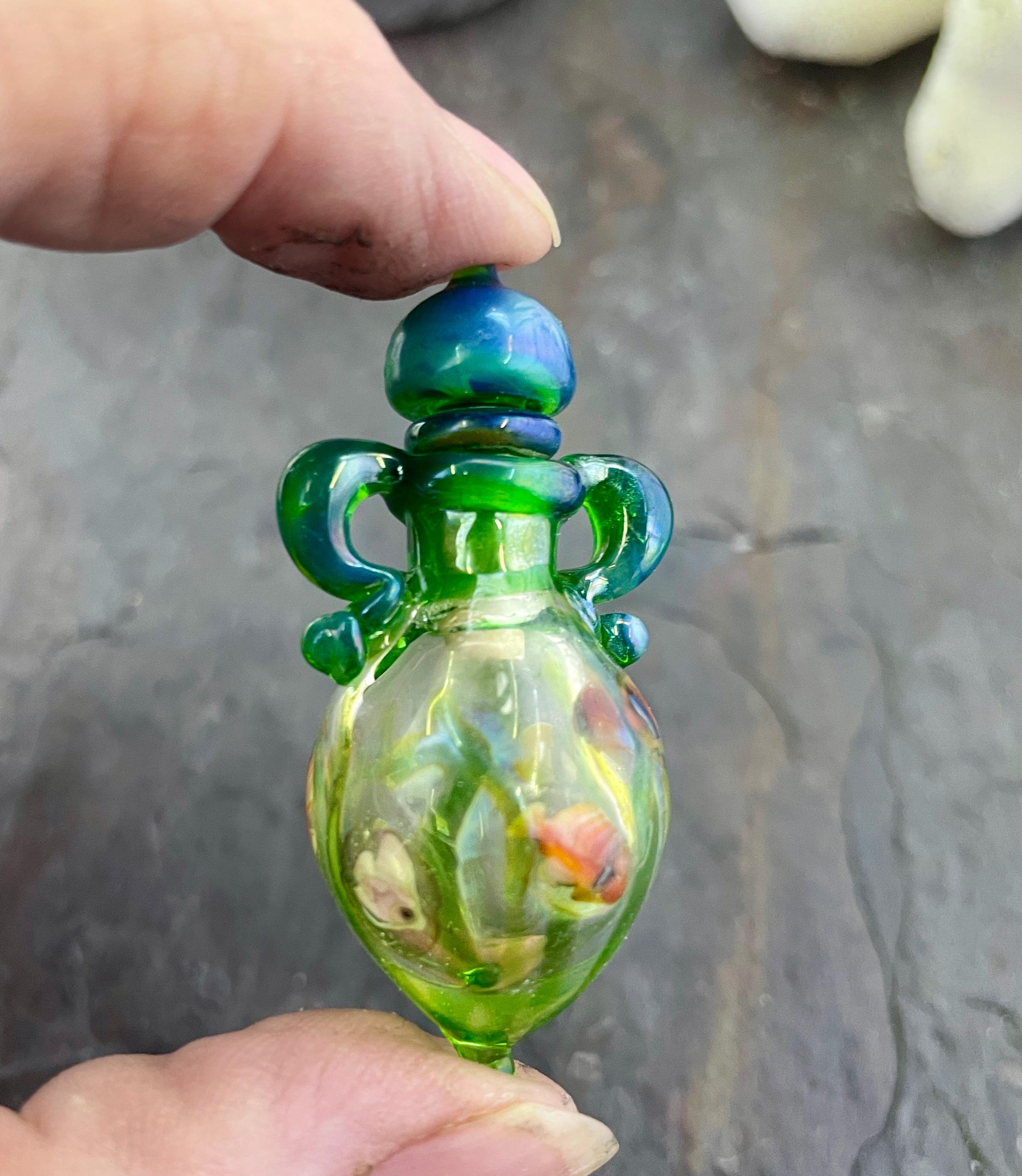 This is an Italian glass vessel bead made in the ancient way to safely store your Mermaid Tears. This one has beautiful sea life swimming on the grass green glass vessel. And of course it has the extinct Gaia glass which somehow photographed so well in these pics so you can really see the magic blue to green of Gaia! Could also be used for essential oils or perfume, I guess. Comes on a 1.5mm 18” silver filled mini ball chain which is removable. Approximately 2” top to bottom. Gently twist the cork stopper in for a nice tight fit