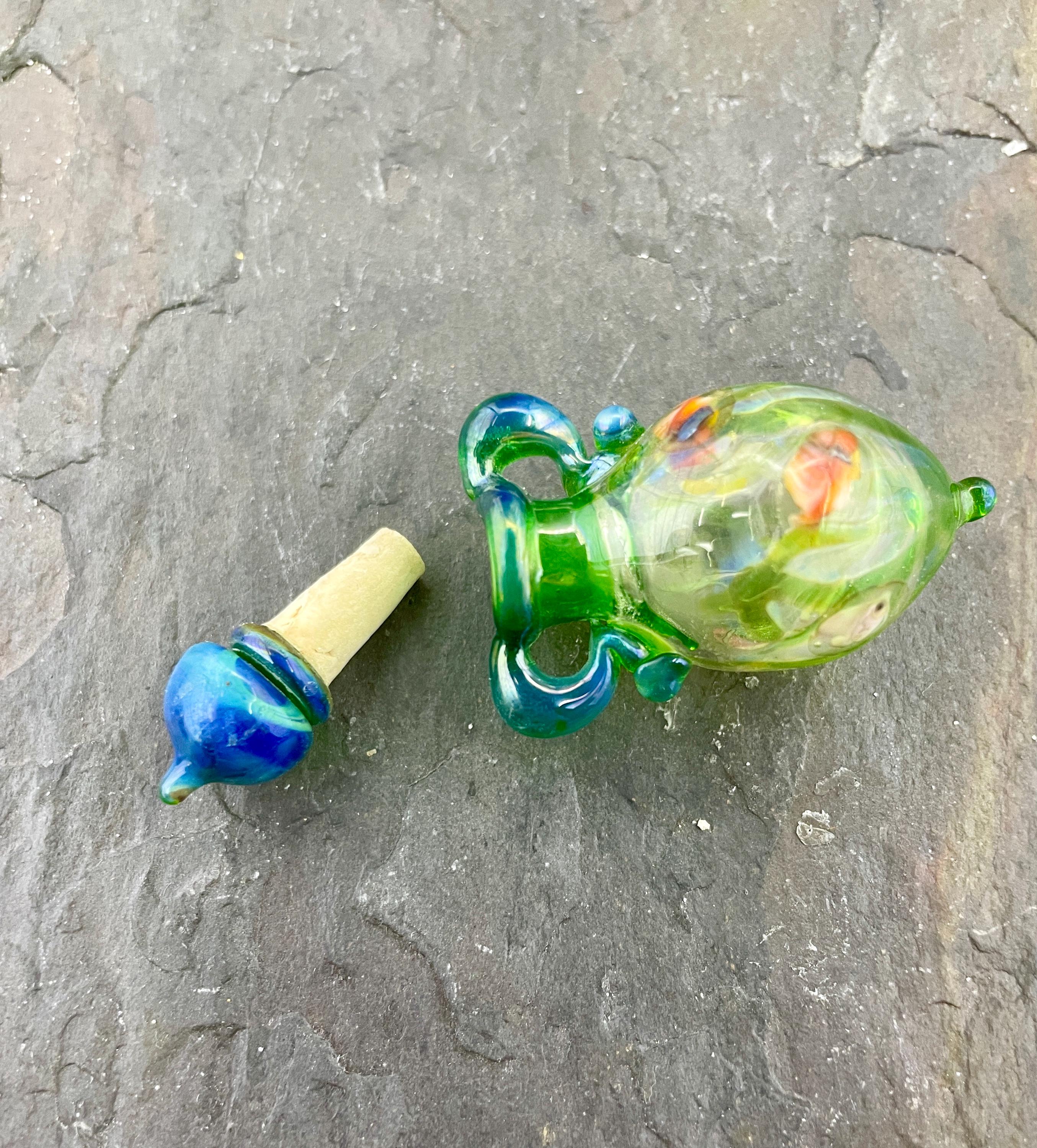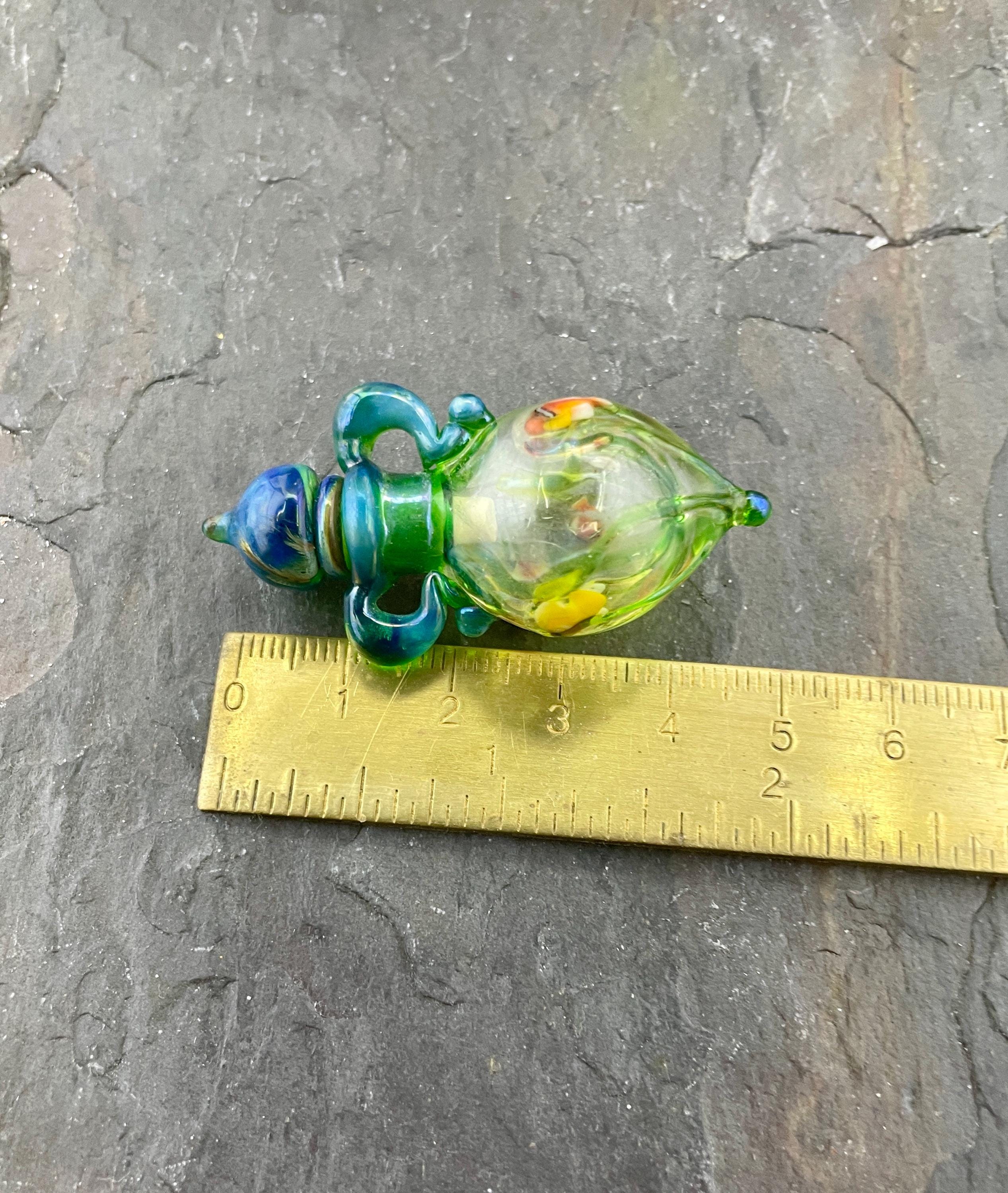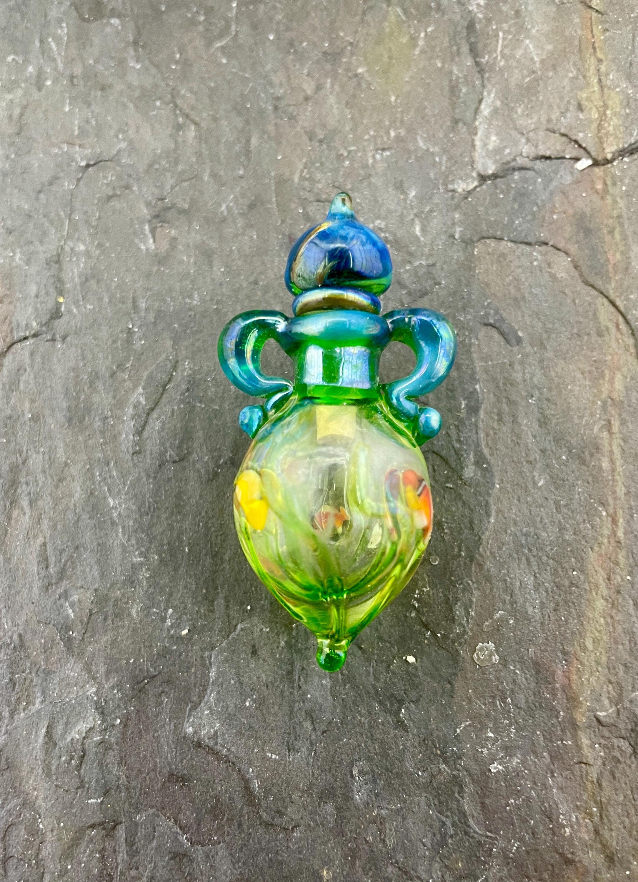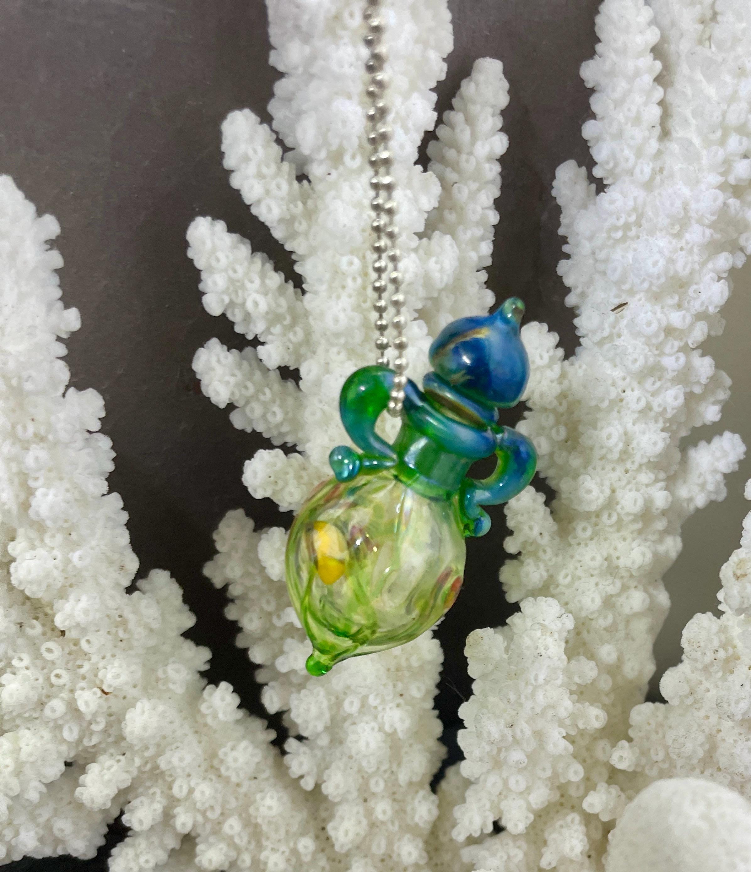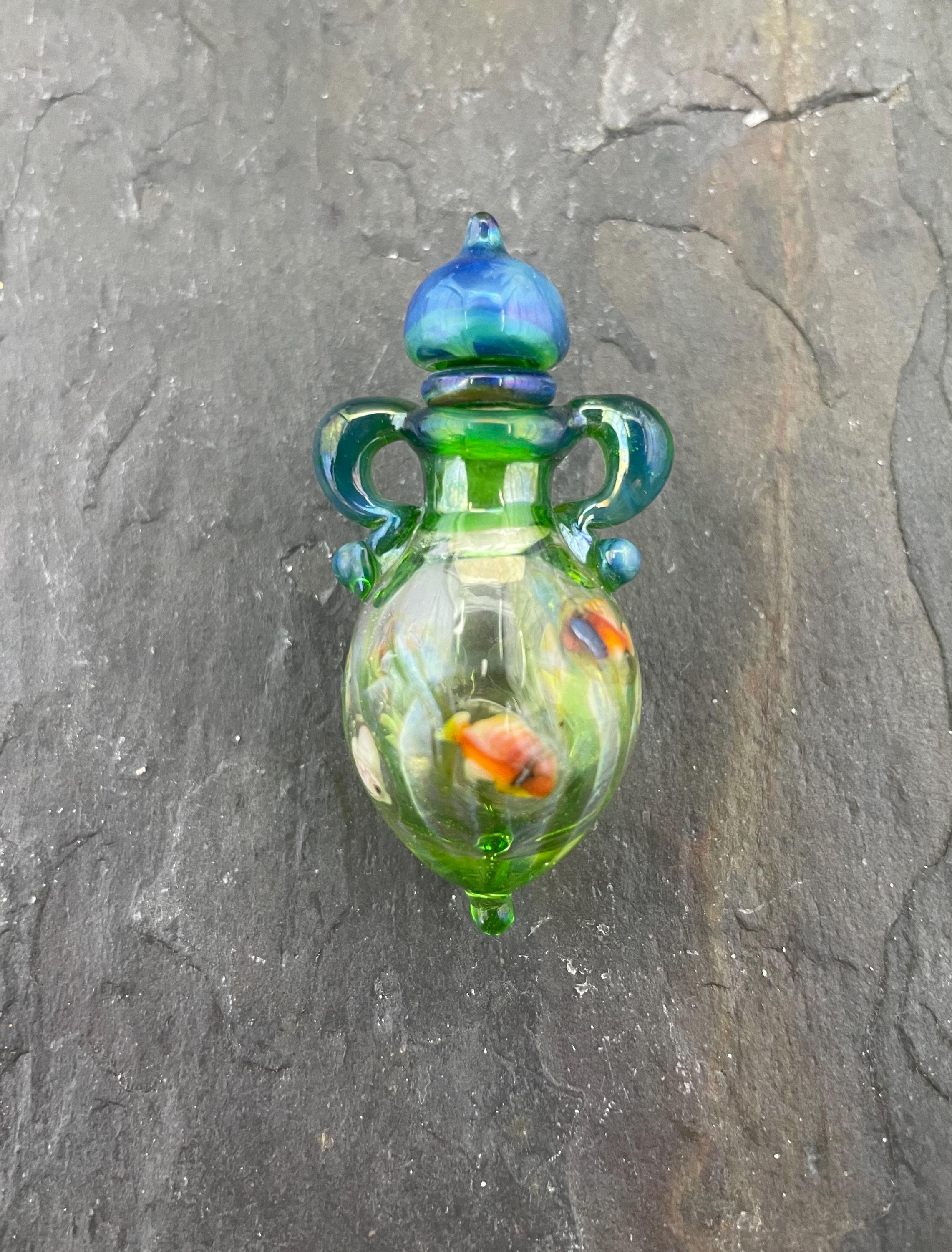 This is an Italian glass vessel bead made in the ancient way to safely store your Mermaid Tears. This one has beautiful sea life swimming on the grass green glass vessel. And of course it has the extinct Gaia glass which somehow photographed so well in these pics so you can really see the magic blue to green of Gaia! Could also be used for essential oils or perfume, I guess. Comes on a 1.5mm 18” silver filled mini ball chain which is removable. Approximately 2” top to bottom. Gently twist the cork stopper in for a nice tight fit