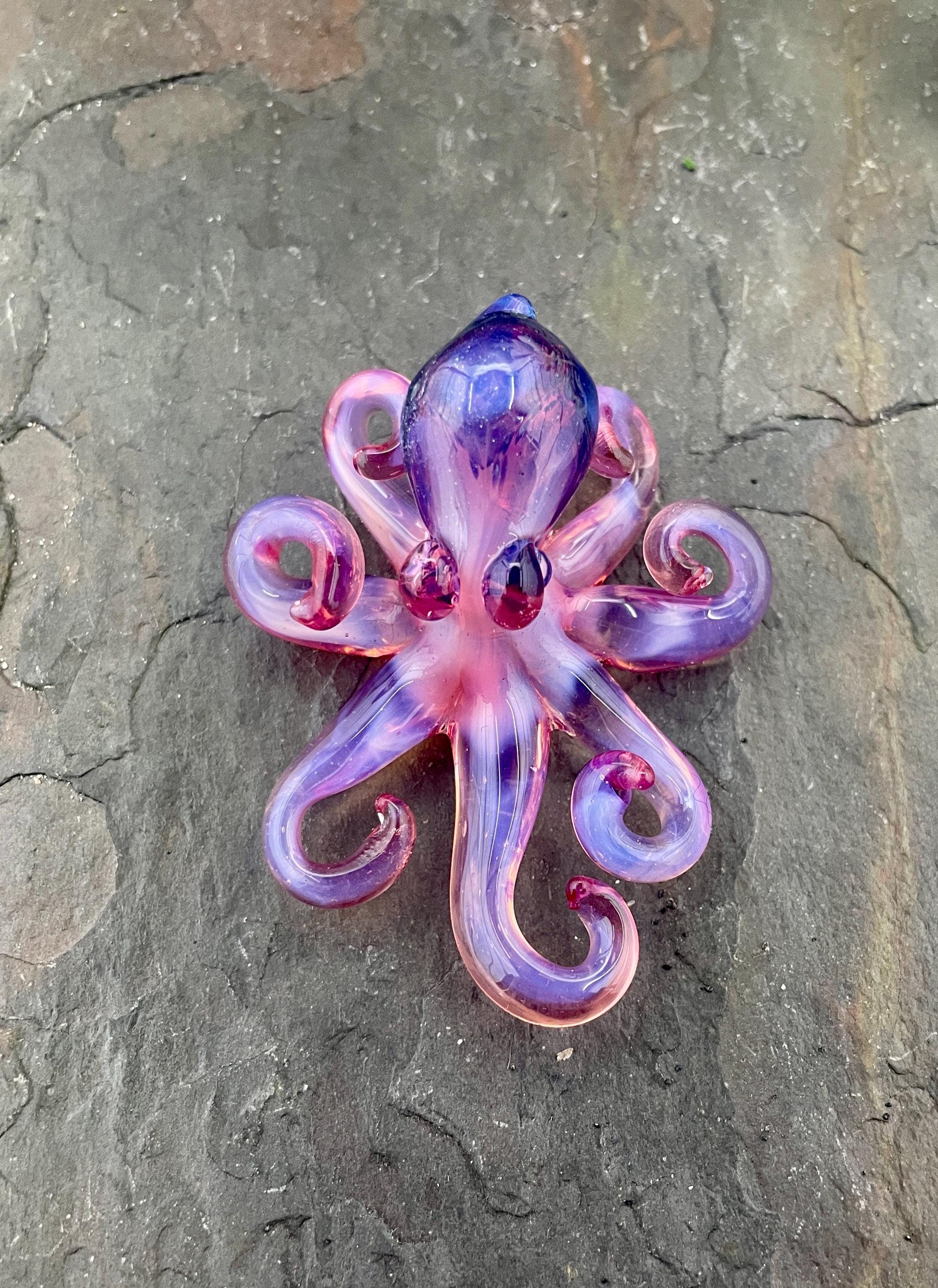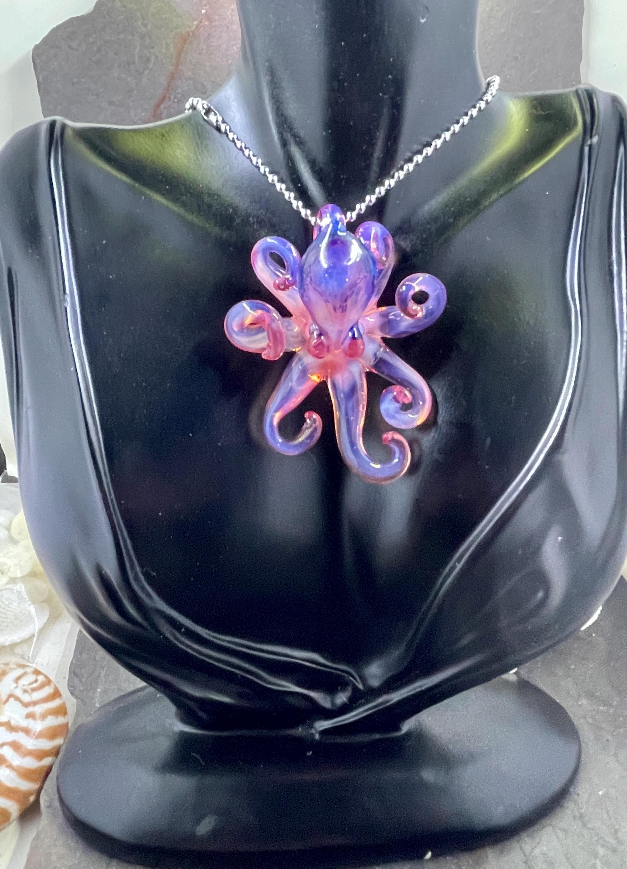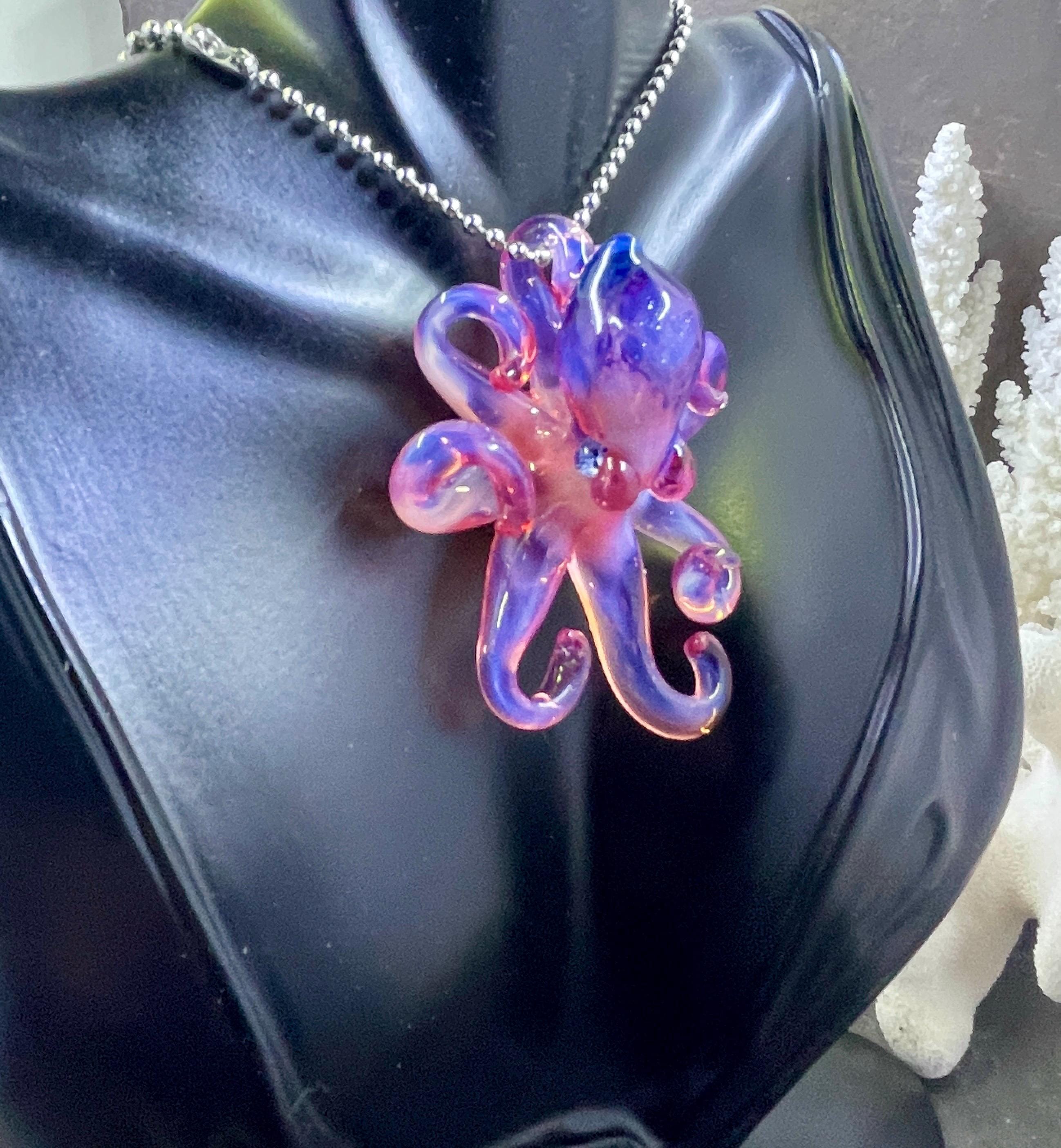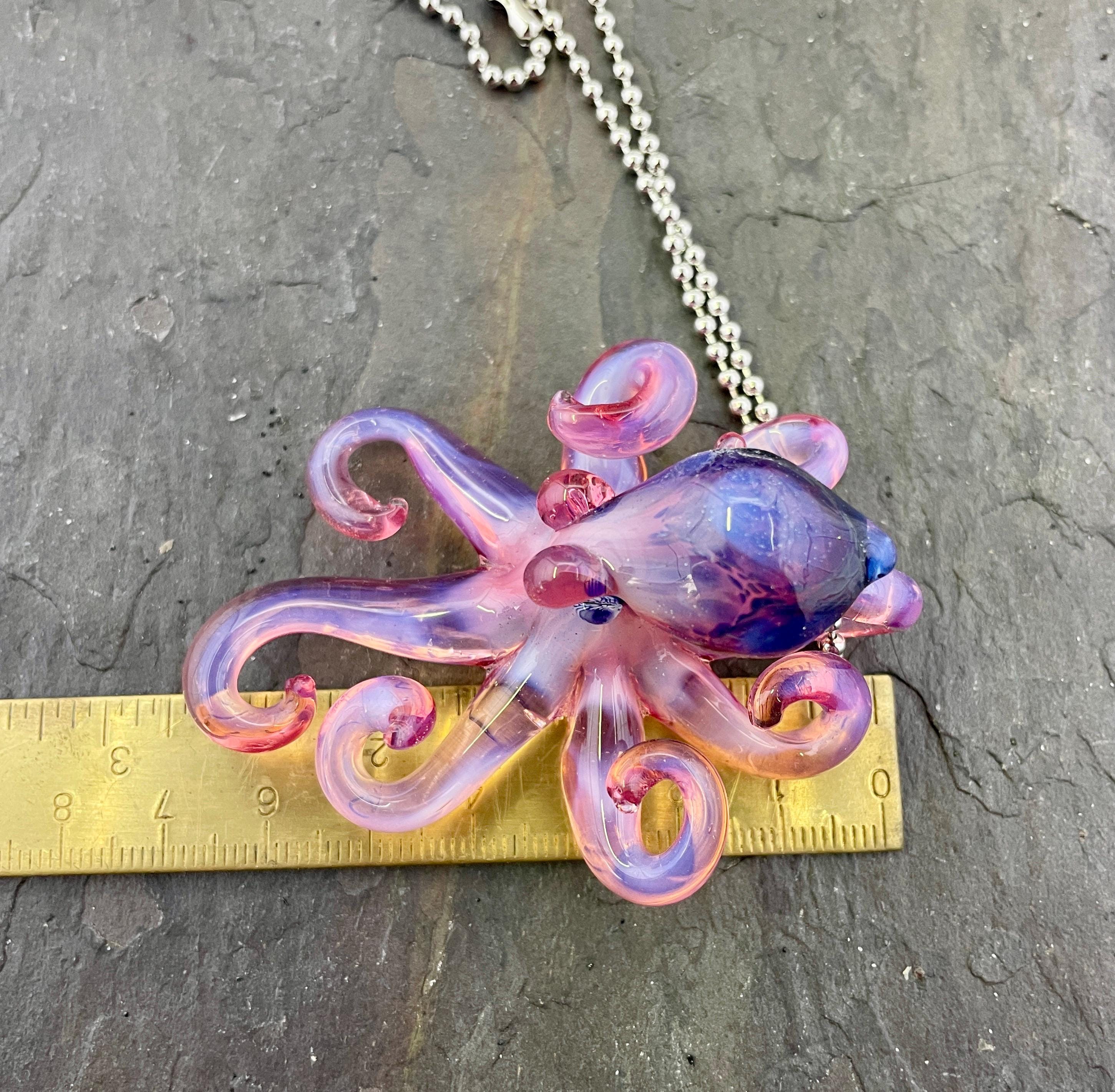Another boro octopus glass necklace, this is the Pink Hyacinth, a Telemagenta over moonstone with a layer of Hyacinth A nice size at 3" long, formed in the torch using no molds and properly annealed in a digital kiln for durability, this one arrives safely wrapped and attached to a stainless steel ball chain necklace. Handmade glass eye chip gives her such realistic eyes, you might want to keep her on her rope, just in case! Really fun and safe to wear, for a truly dramatic look! Marked on the bottom with the Maker's Mark "M" while still molten..