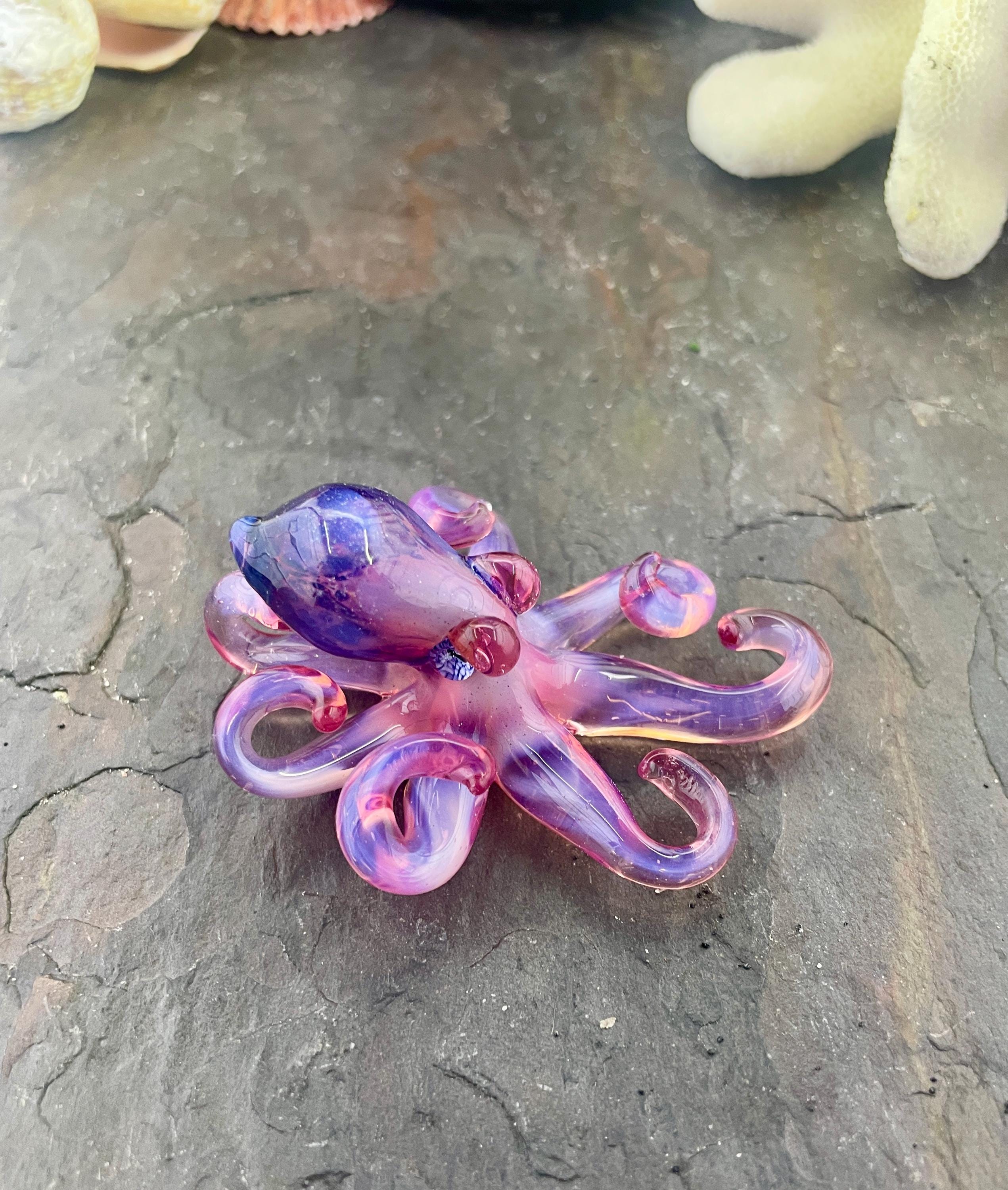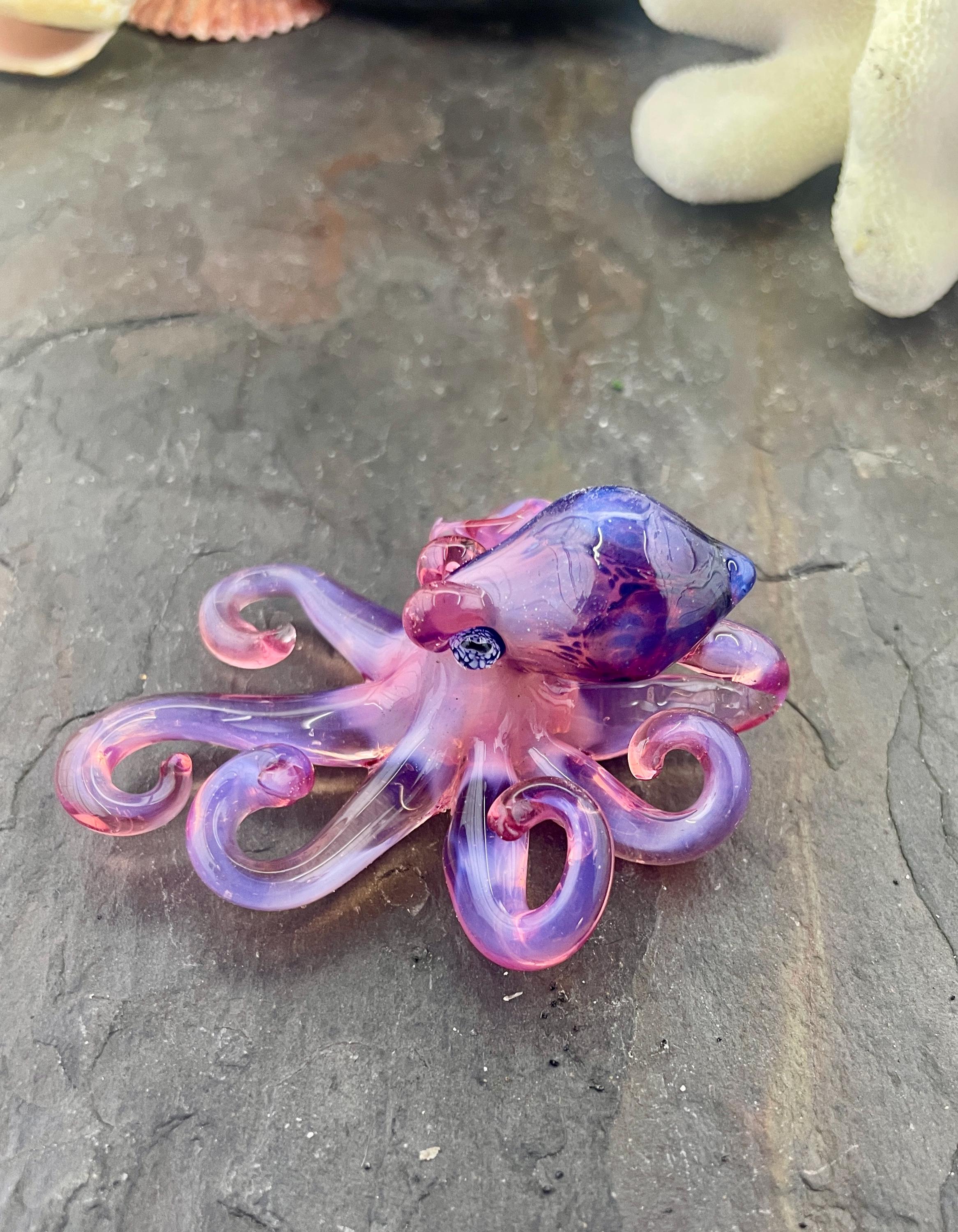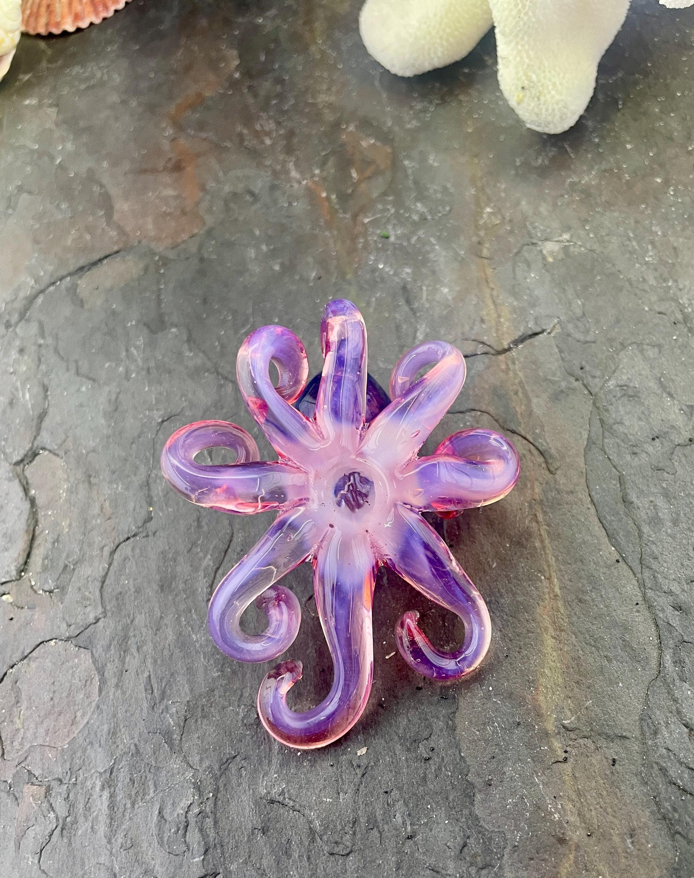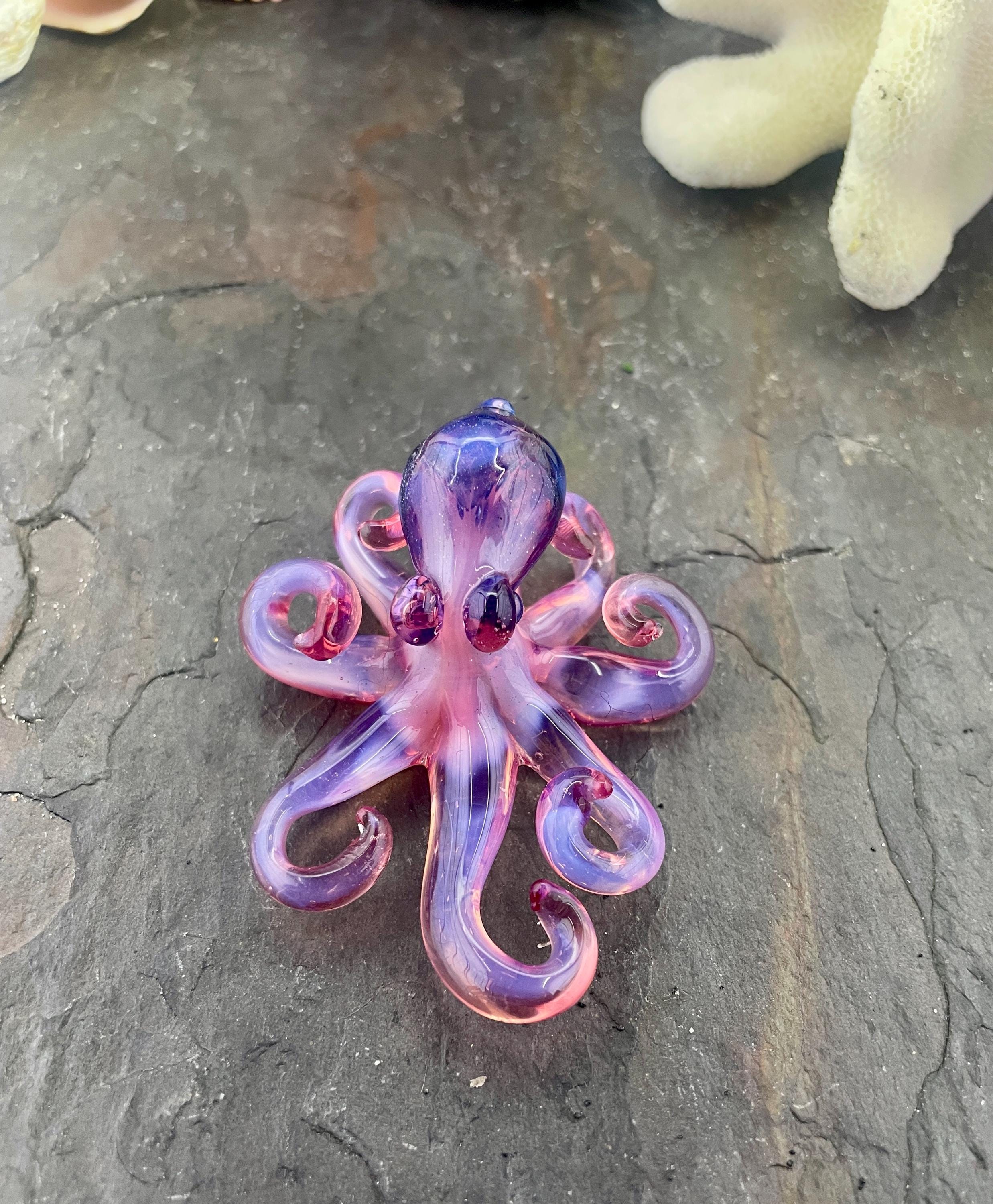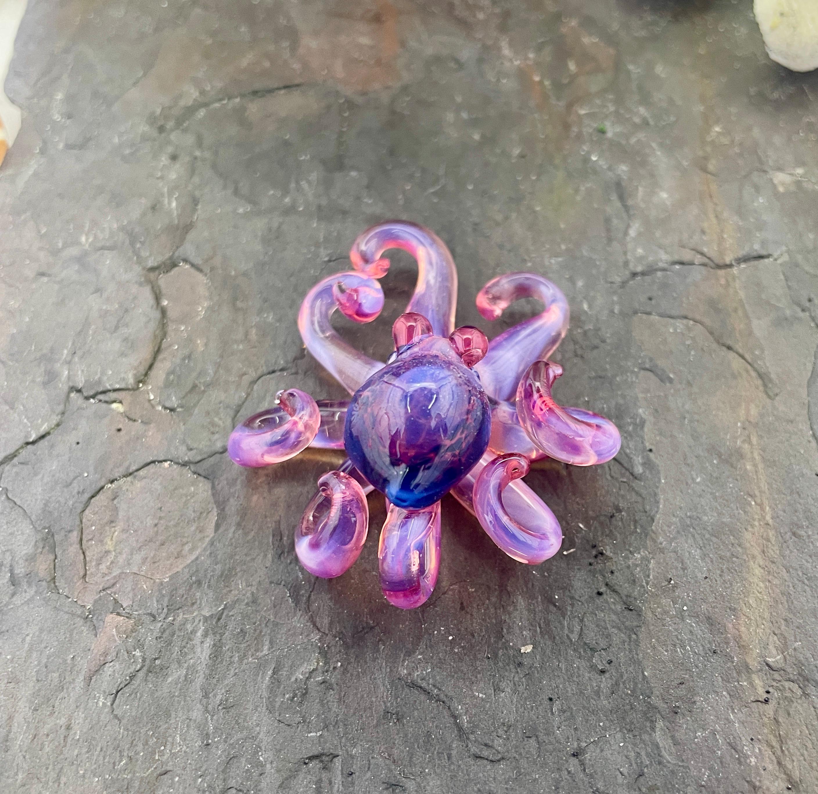 Another boro octopus glass necklace, this is the Pink Hyacinth, a Telemagenta over moonstone with a layer of Hyacinth A nice size at 3" long, formed in the torch using no molds and properly annealed in a digital kiln for durability, this one arrives safely wrapped and attached to a stainless steel ball chain necklace. Handmade glass eye chip gives her such realistic eyes, you might want to keep her on her rope, just in case! Really fun and safe to wear, for a truly dramatic look! Marked on the bottom with the Maker's Mark "M" while still molten..